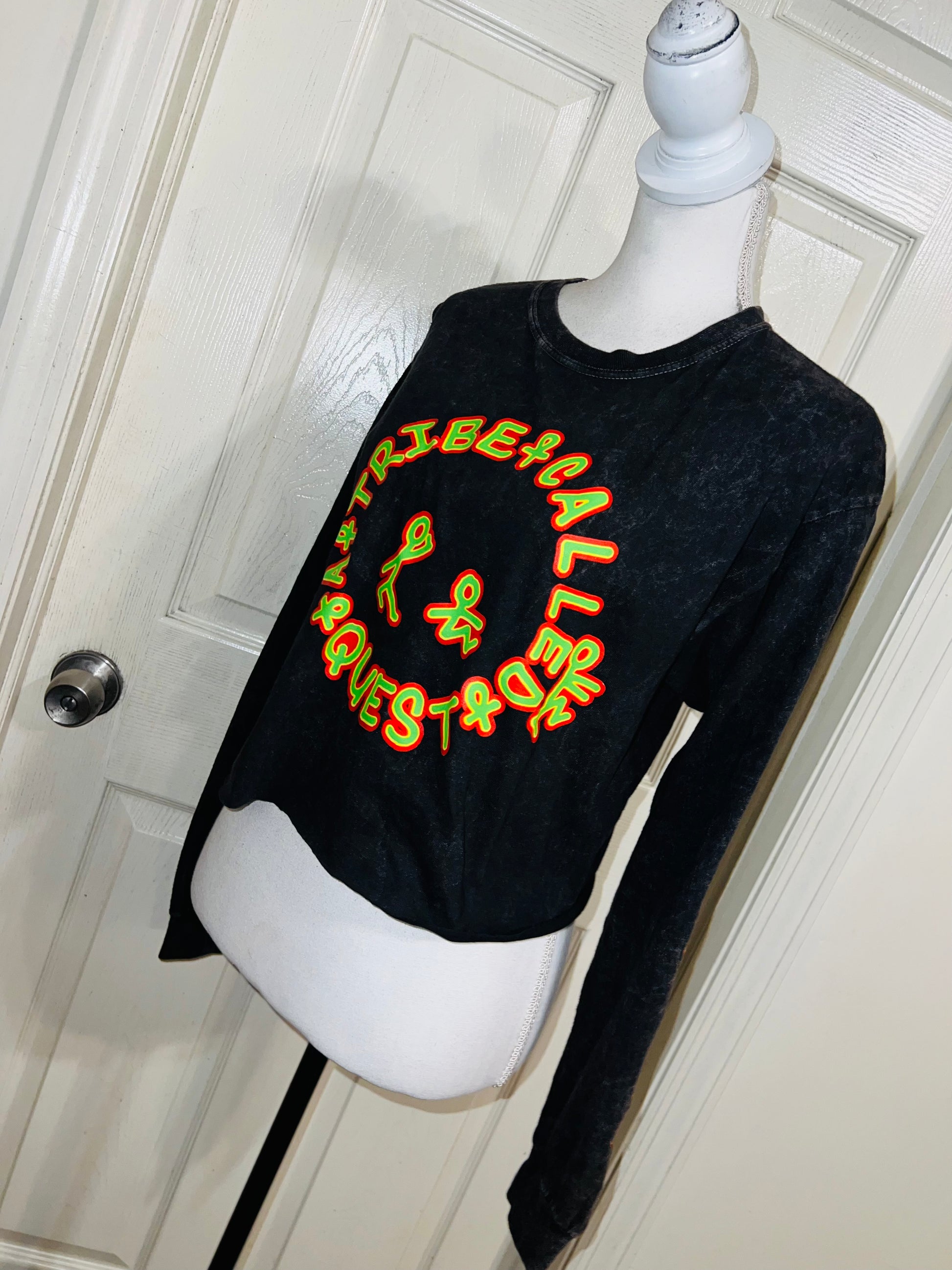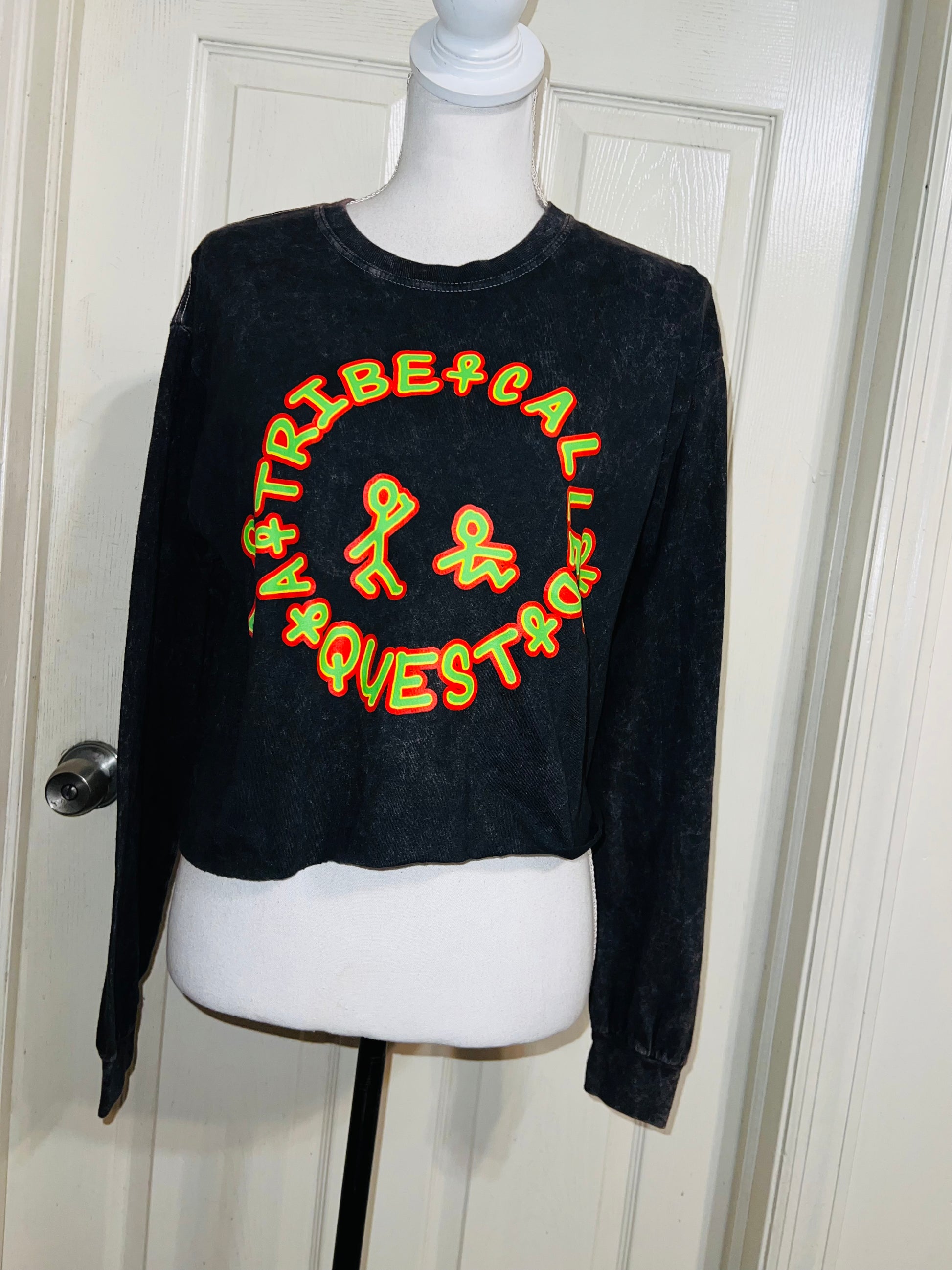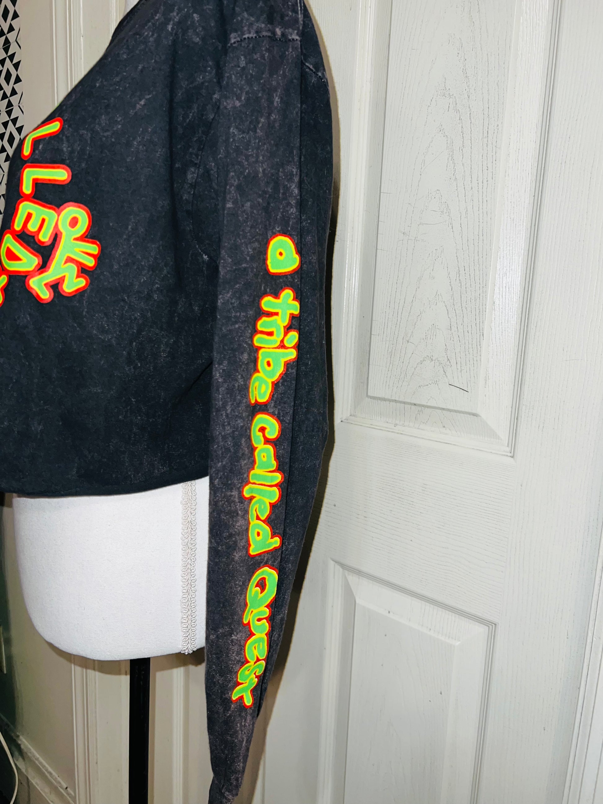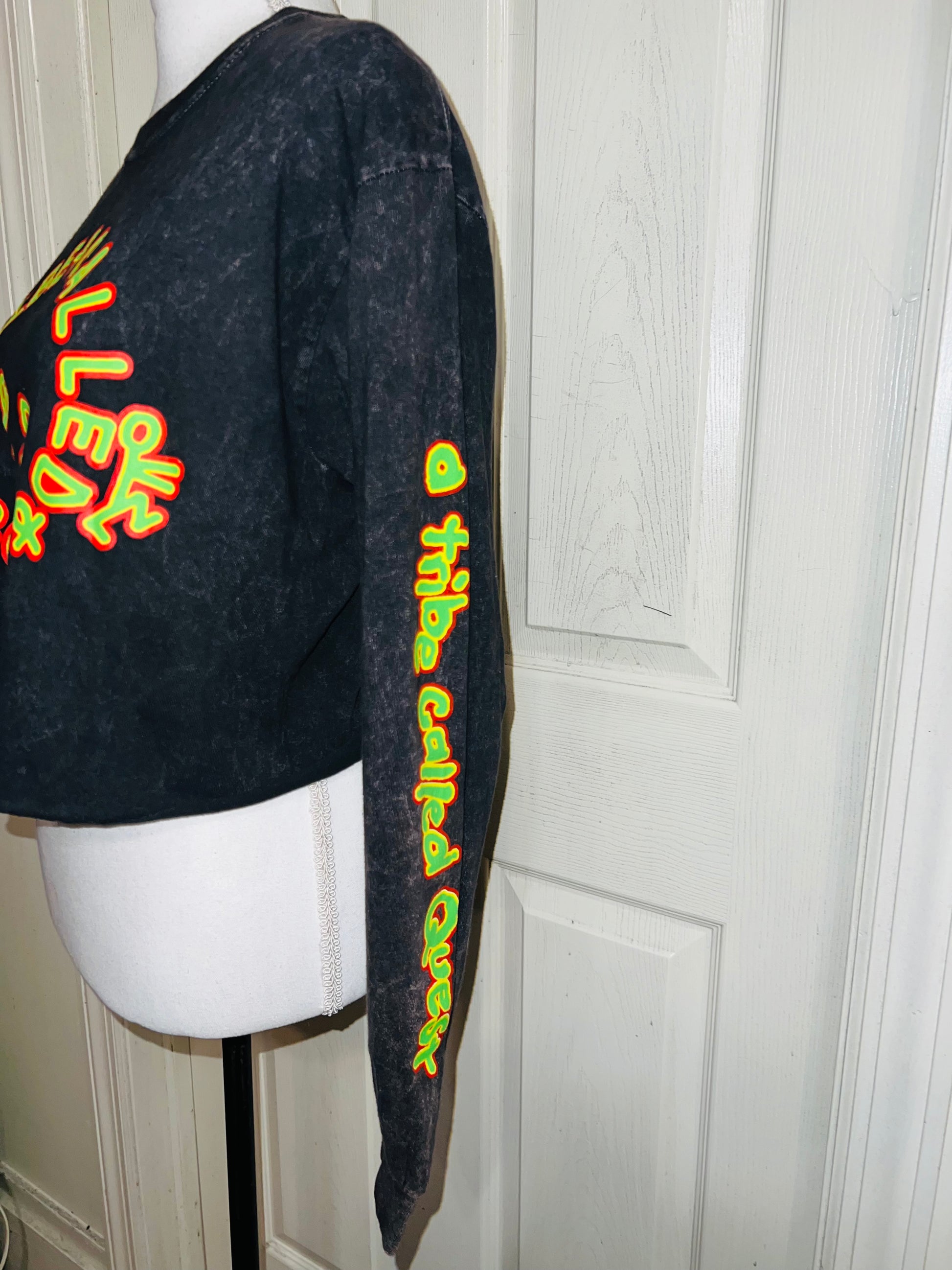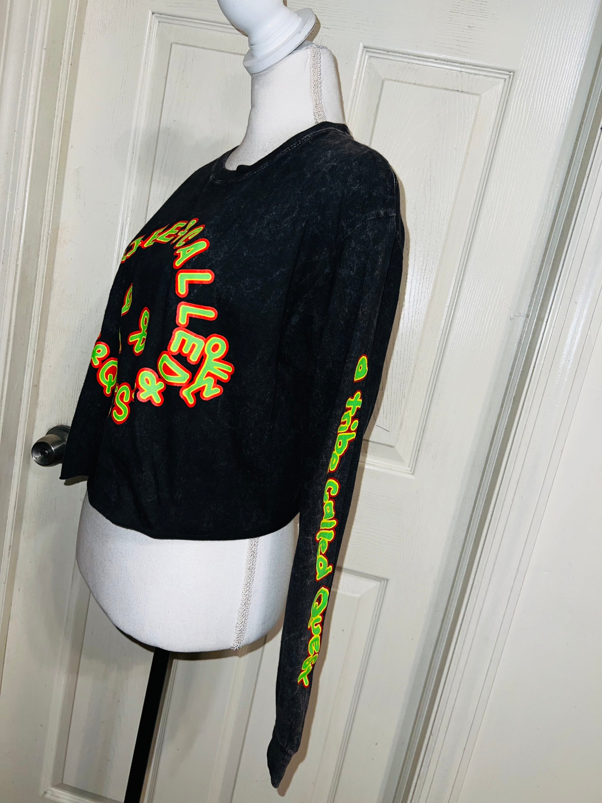A mineral washed long sleeve tee with A Tribe Called Quest on the front with the logo, and the name down the sleeve as well! I love this one. It’s shortened, but not super cropped. Unique!! Size S/M, oversized.