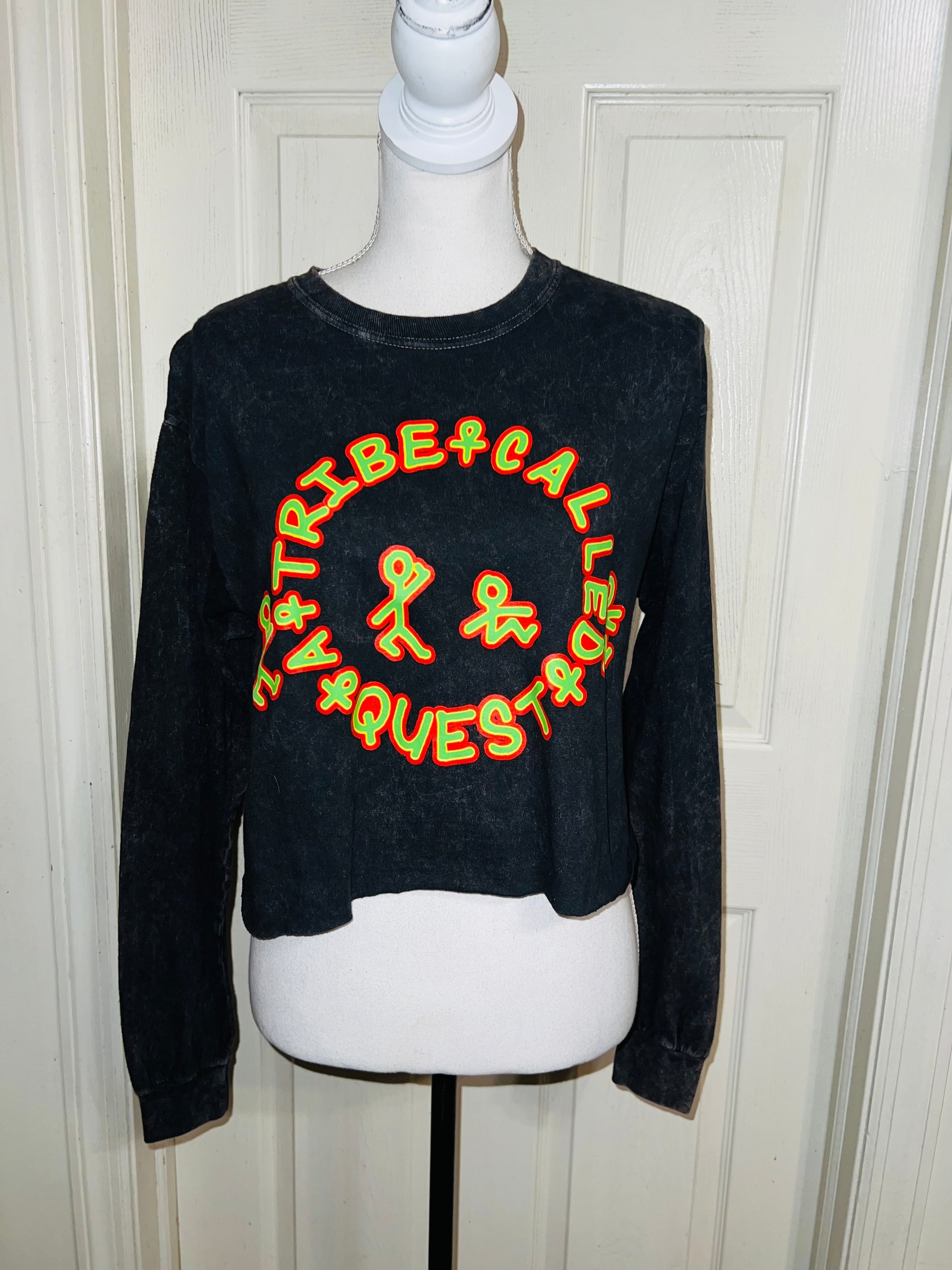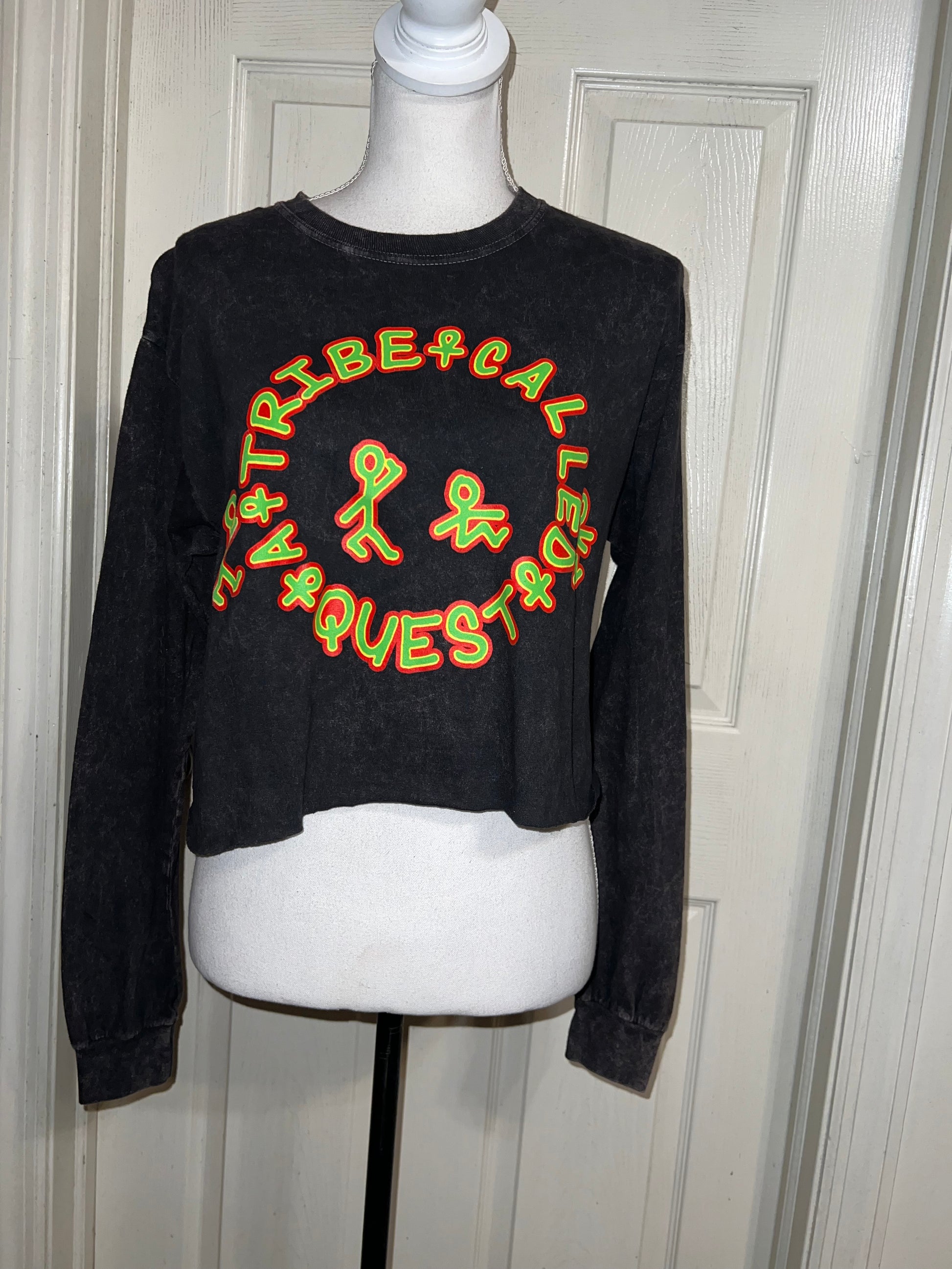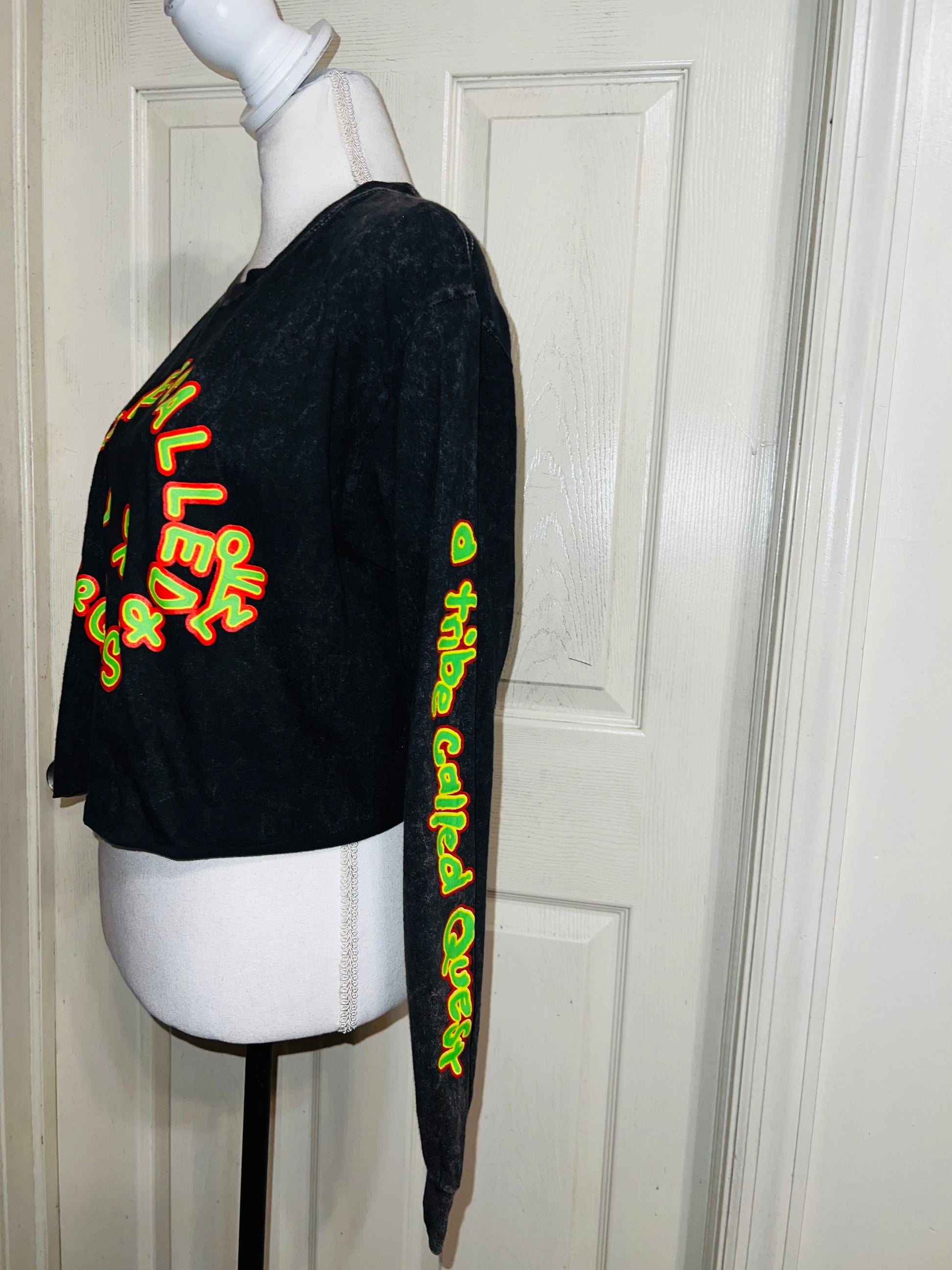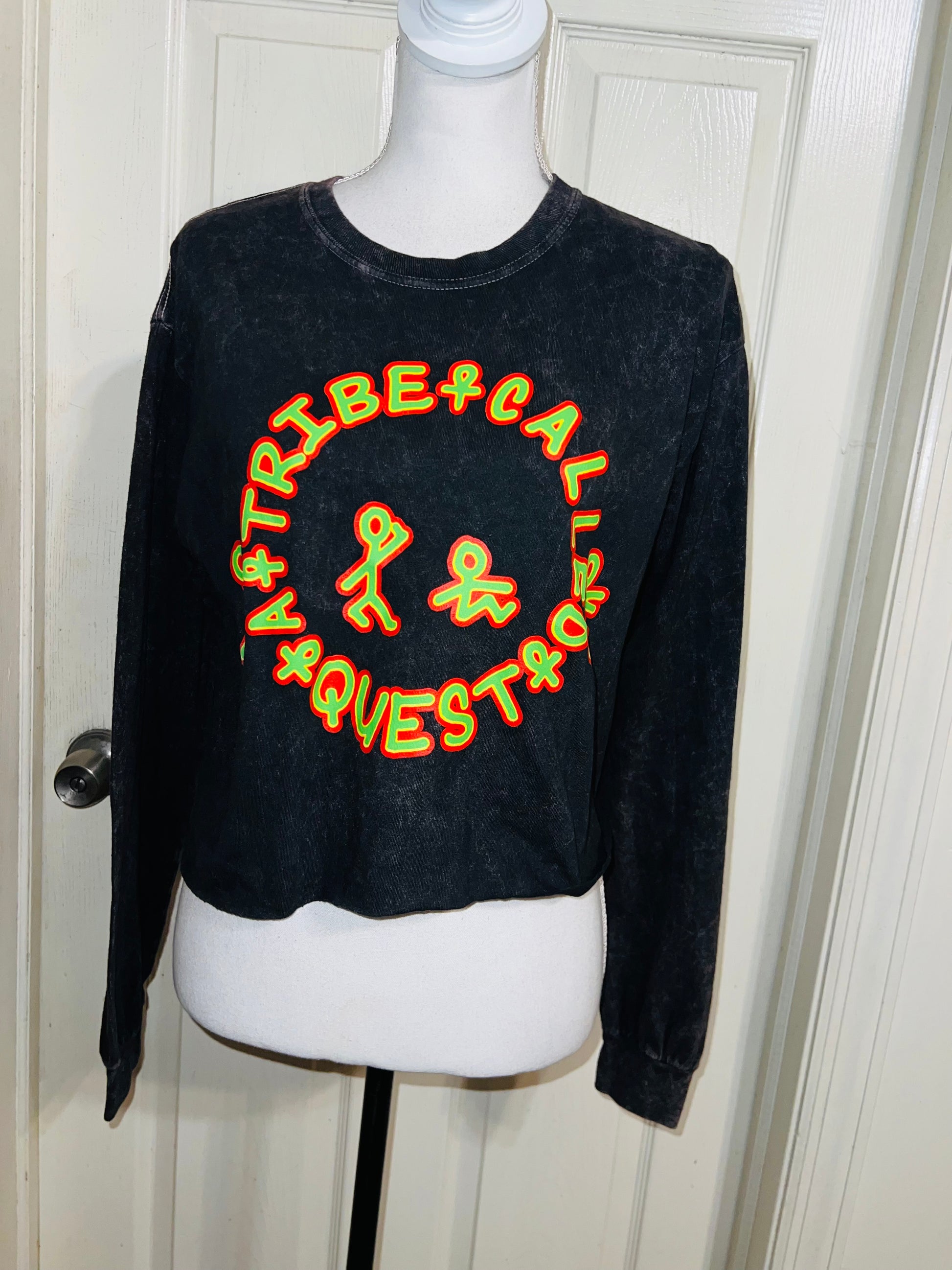 A mineral washed long sleeve tee with A Tribe Called Quest on the front with the logo, and the name down the sleeve as well! I love this one. It’s shortened, but not super cropped. Unique!! Size S/M, oversized.