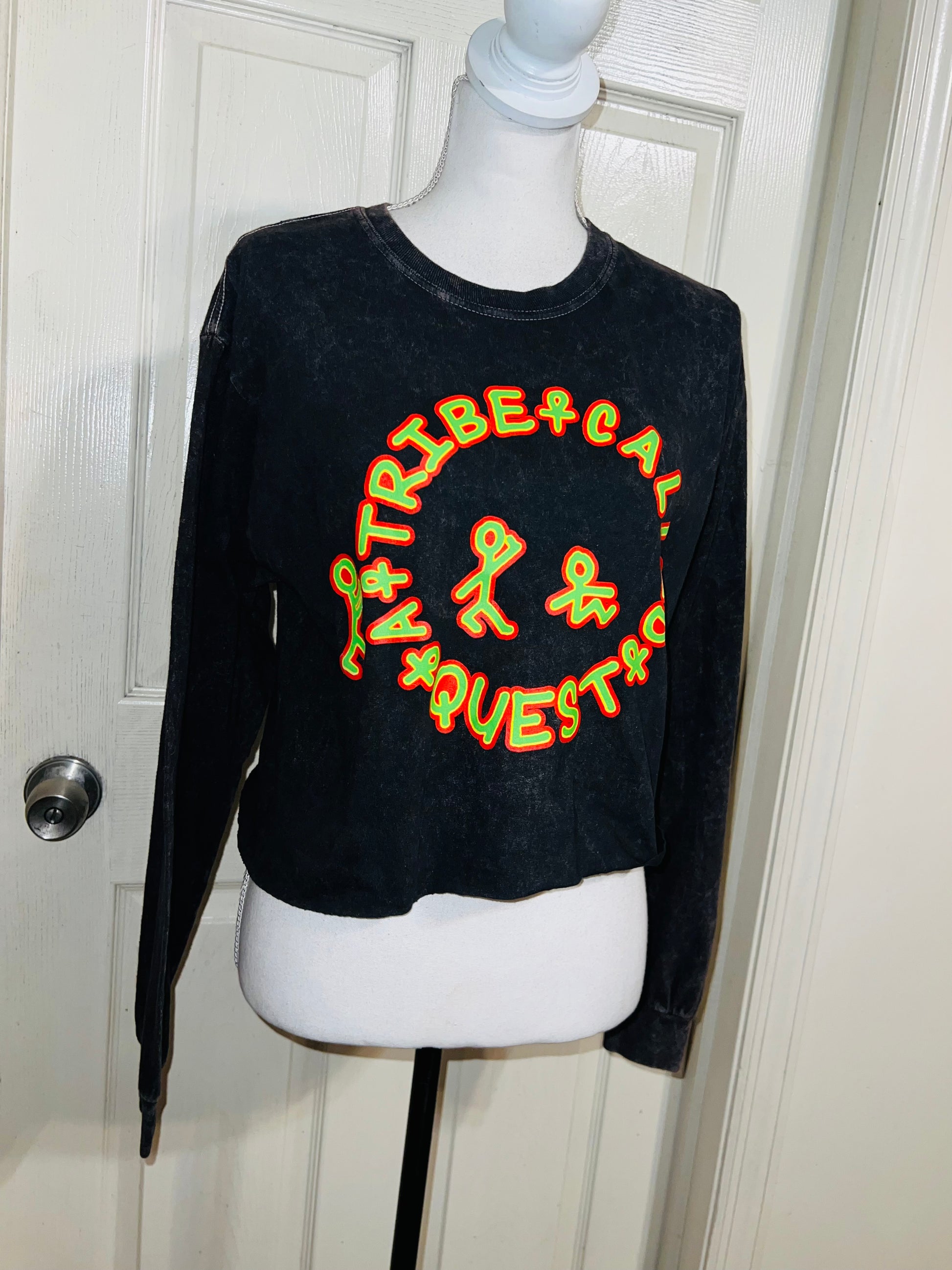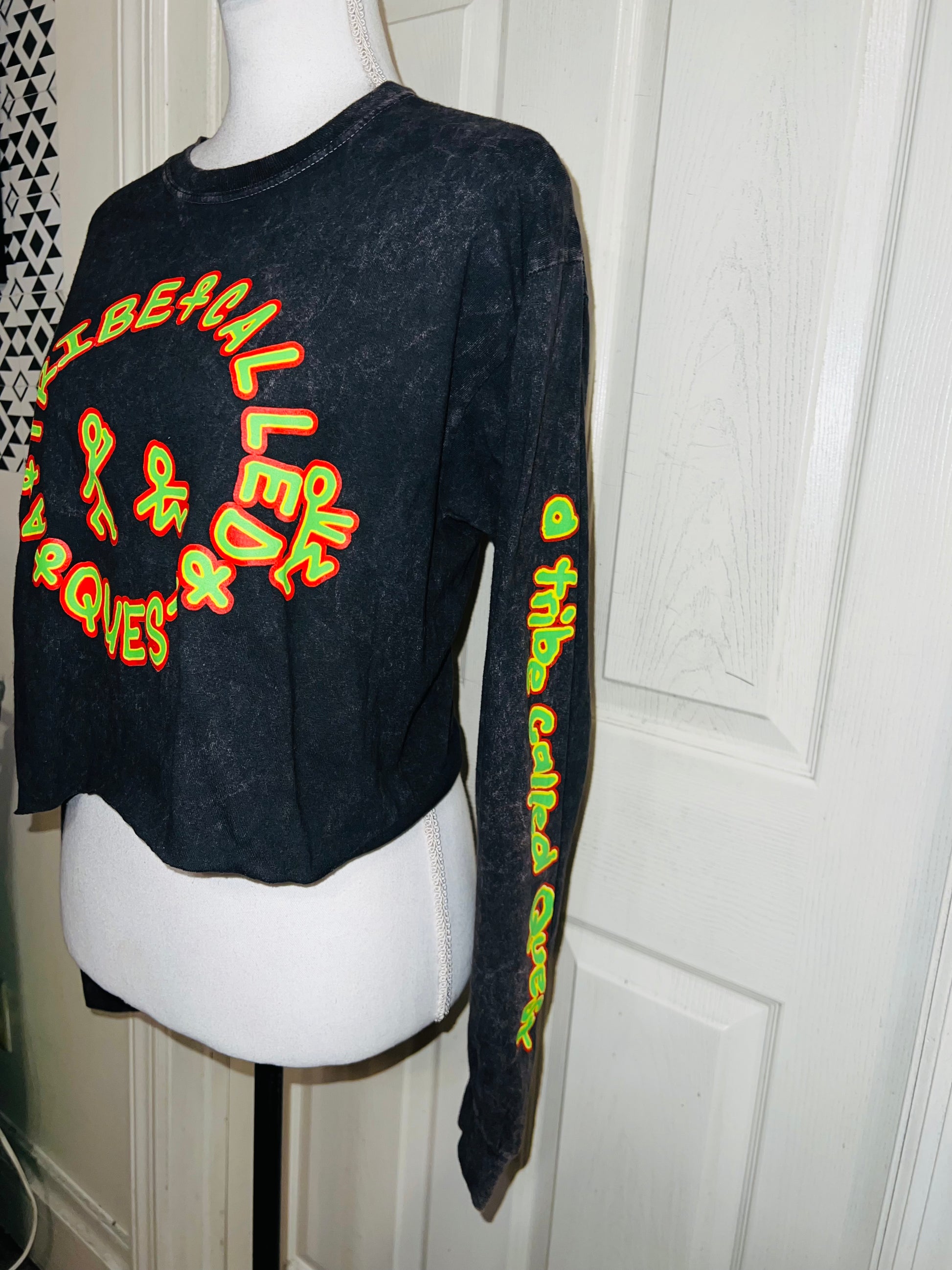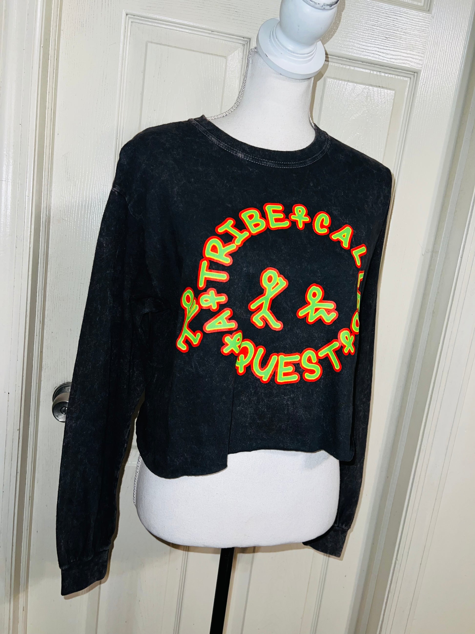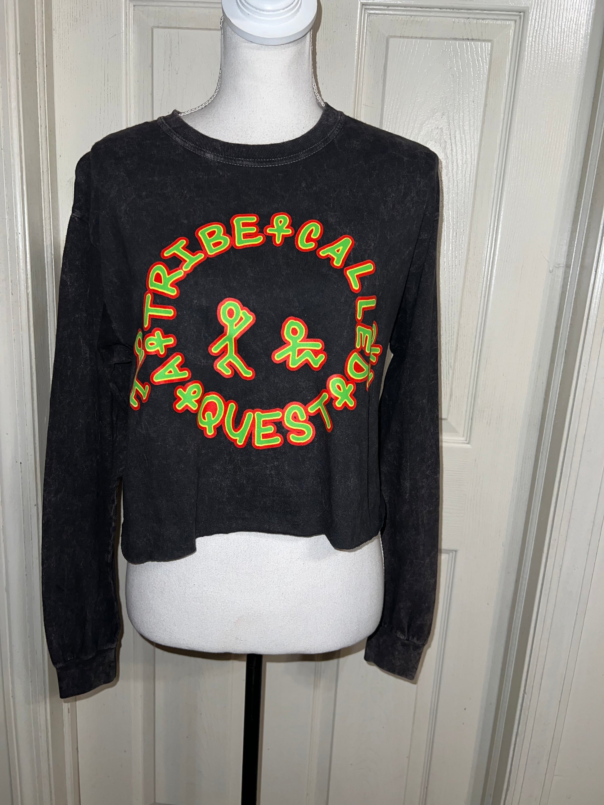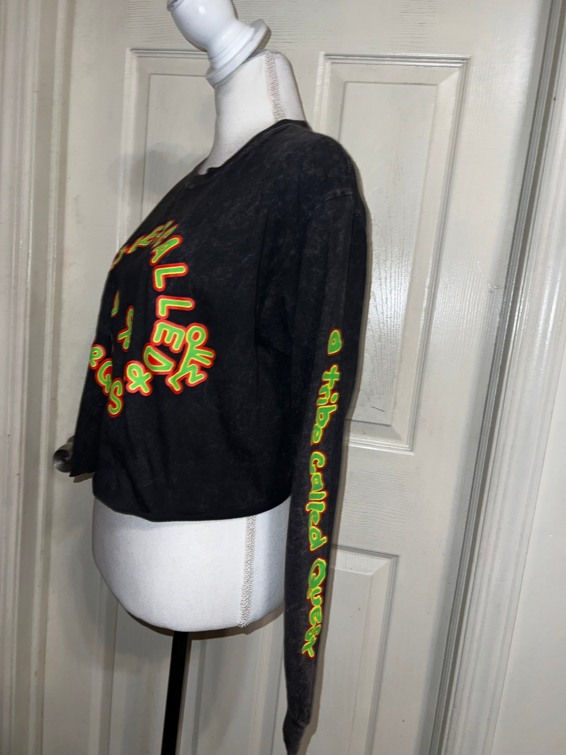 A mineral washed long sleeve tee with A Tribe Called Quest on the front with the logo, and the name down the sleeve as well! I love this one. It’s shortened, but not super cropped. Unique!! Size S/M, oversized.