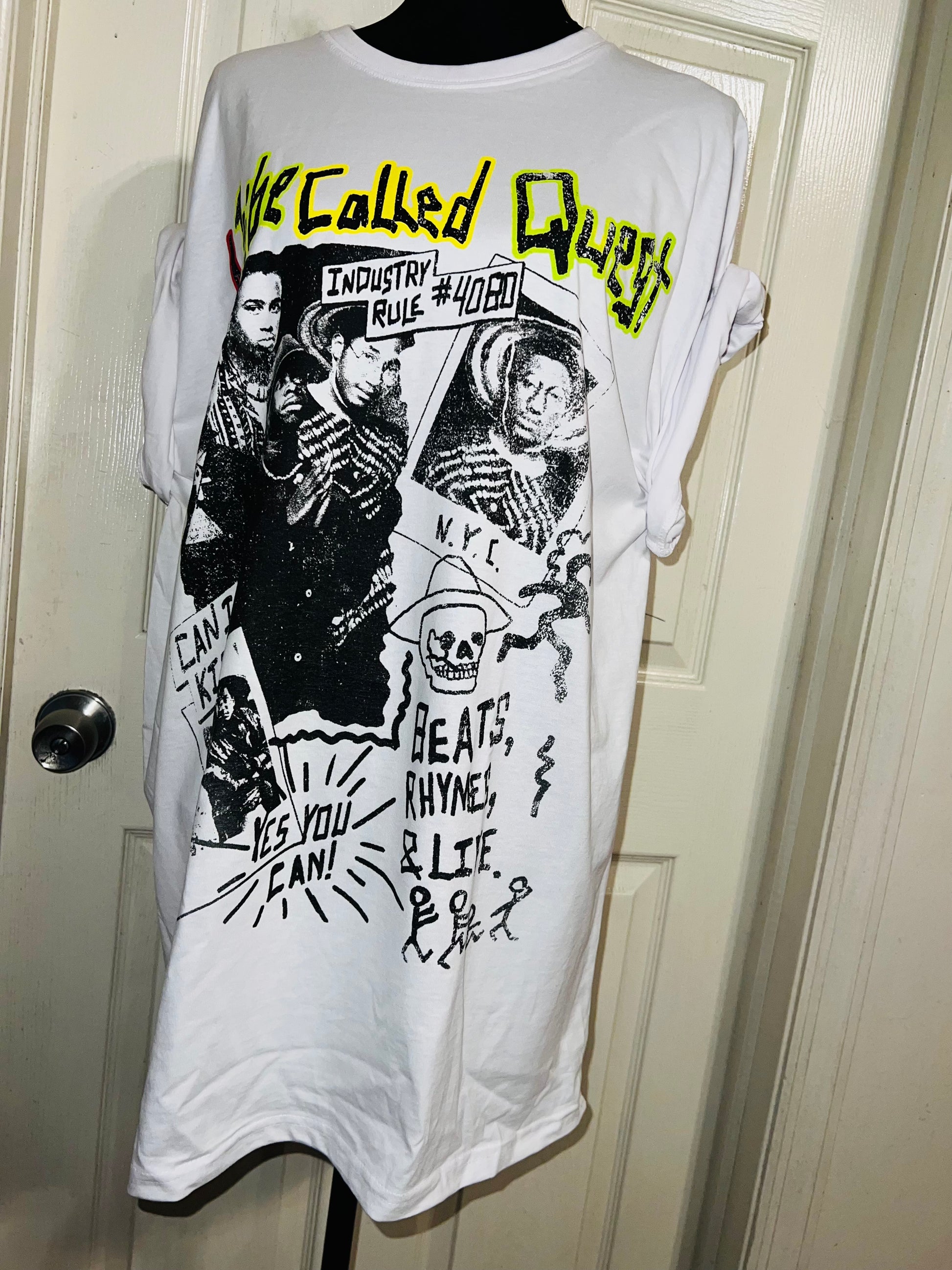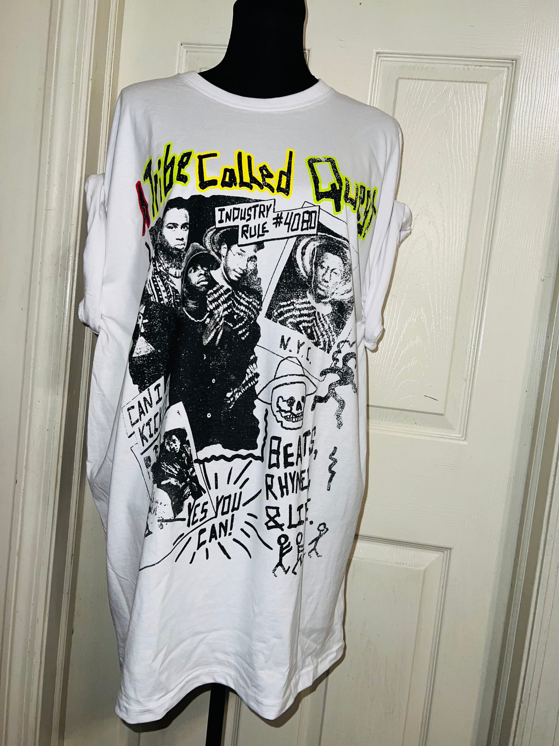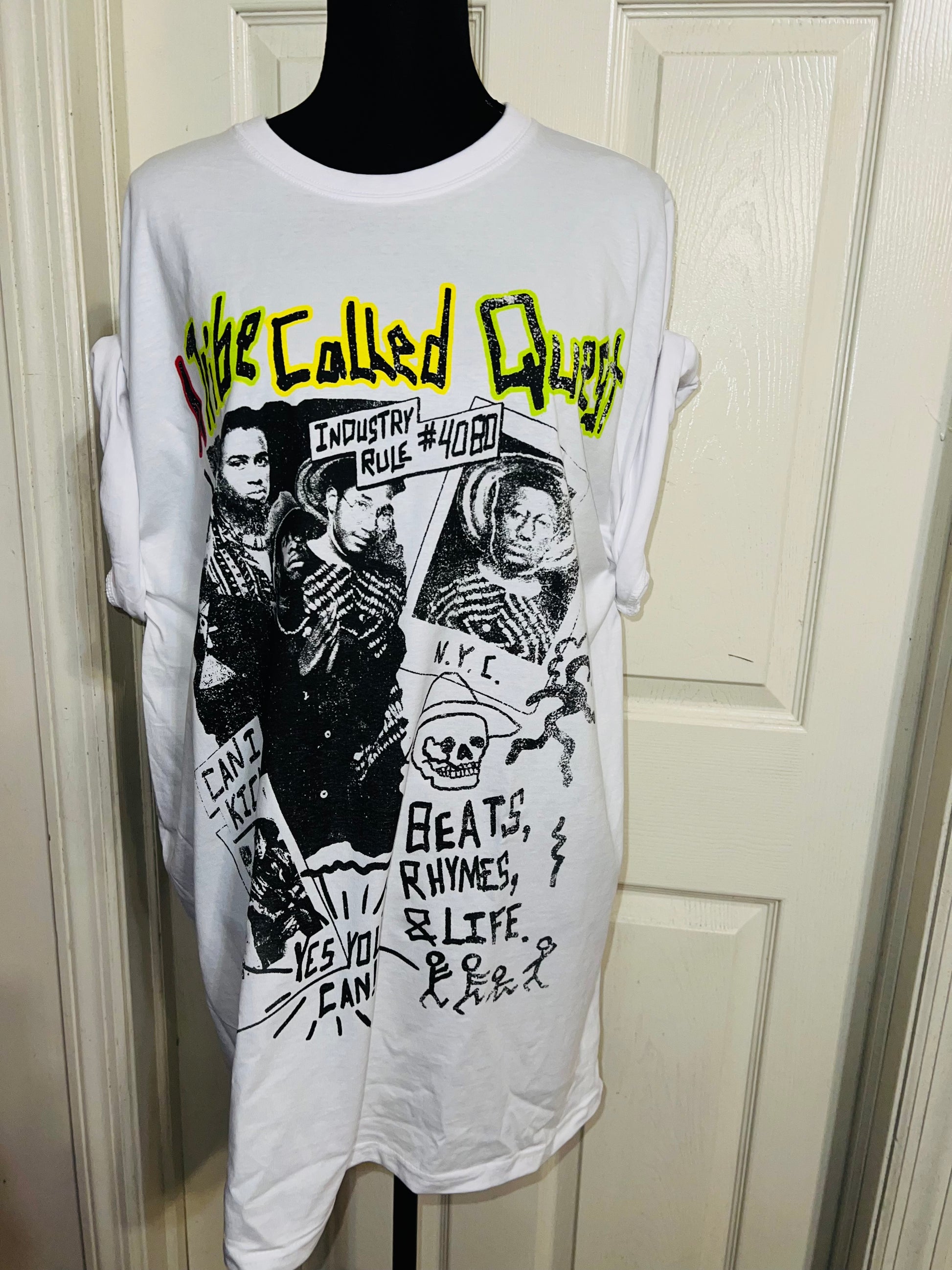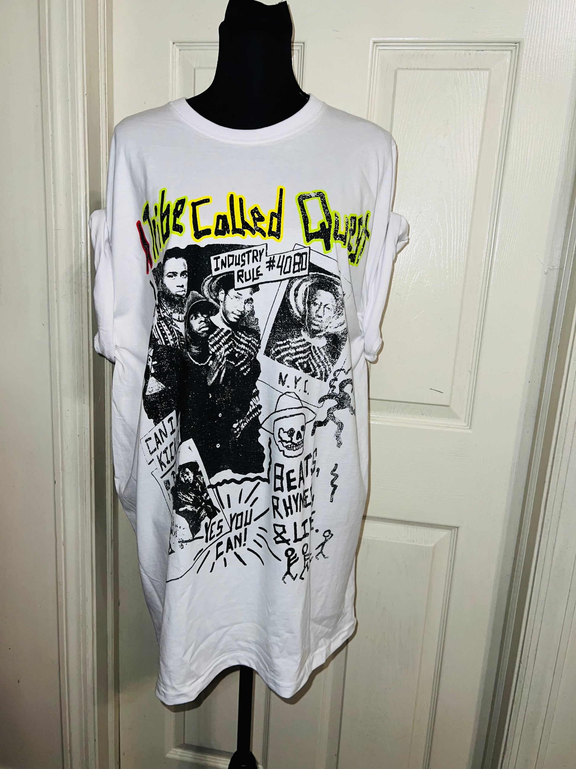 This is now a preorder. A white A Tribe Called Quest tee with all their taglines and lyrics on a cool pop set type tee. Size L/XL, oversized
