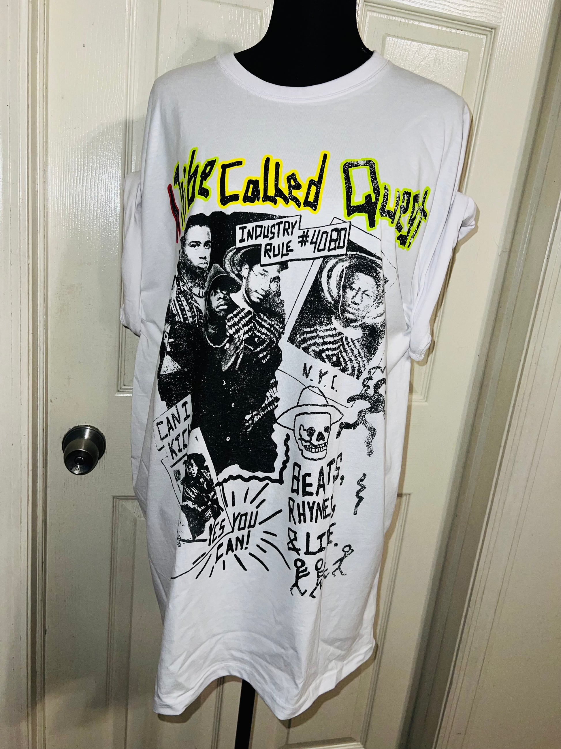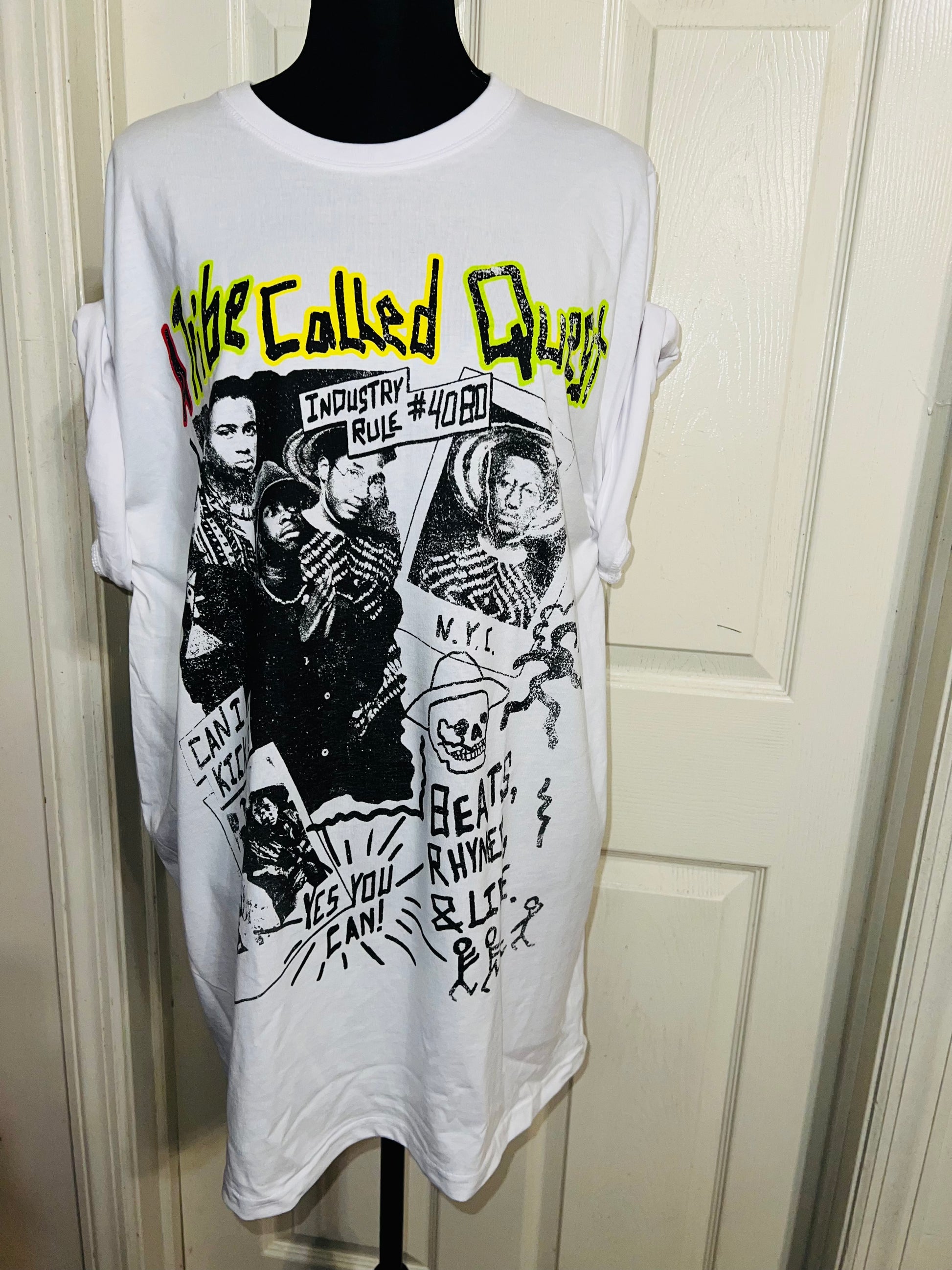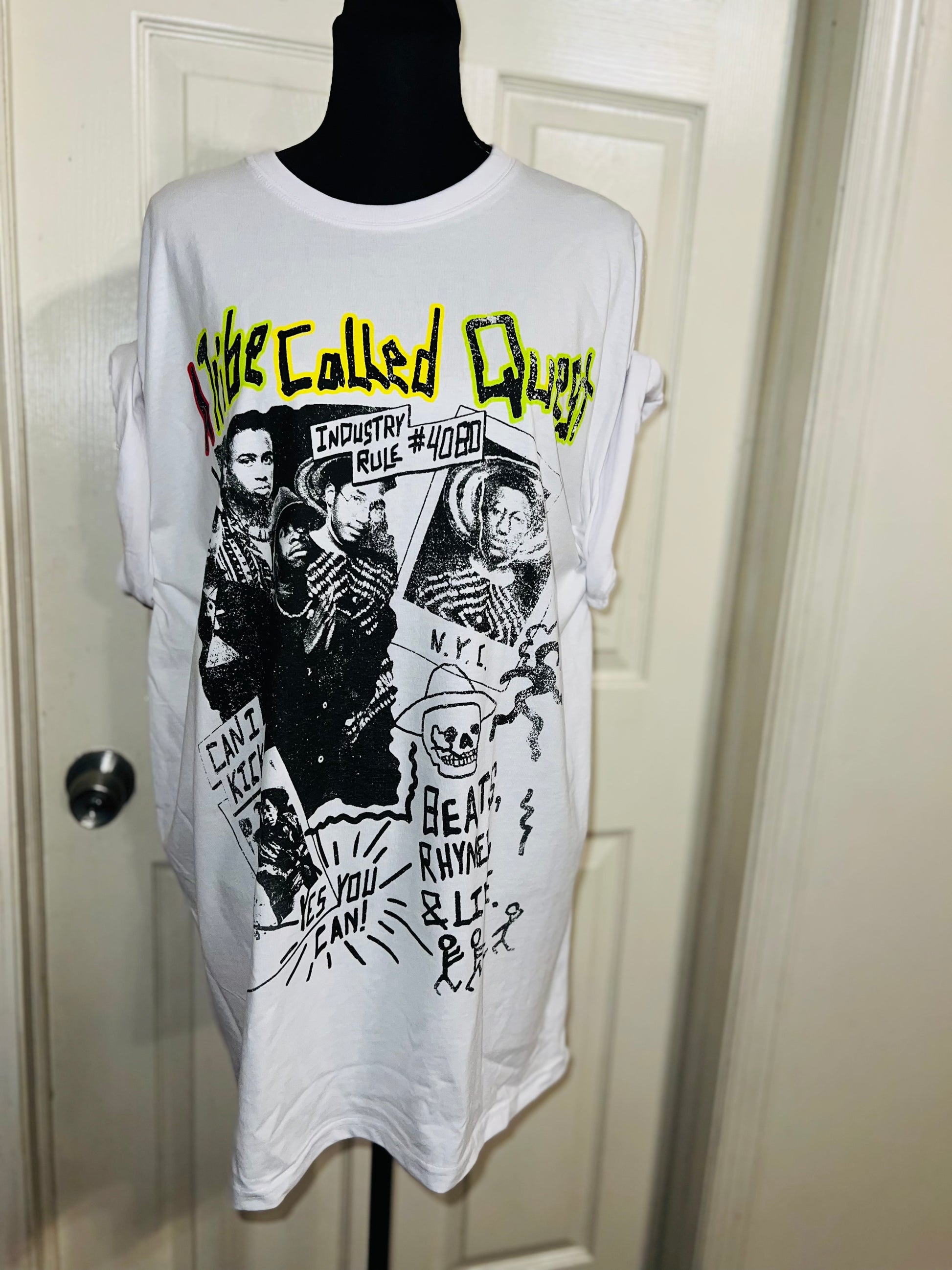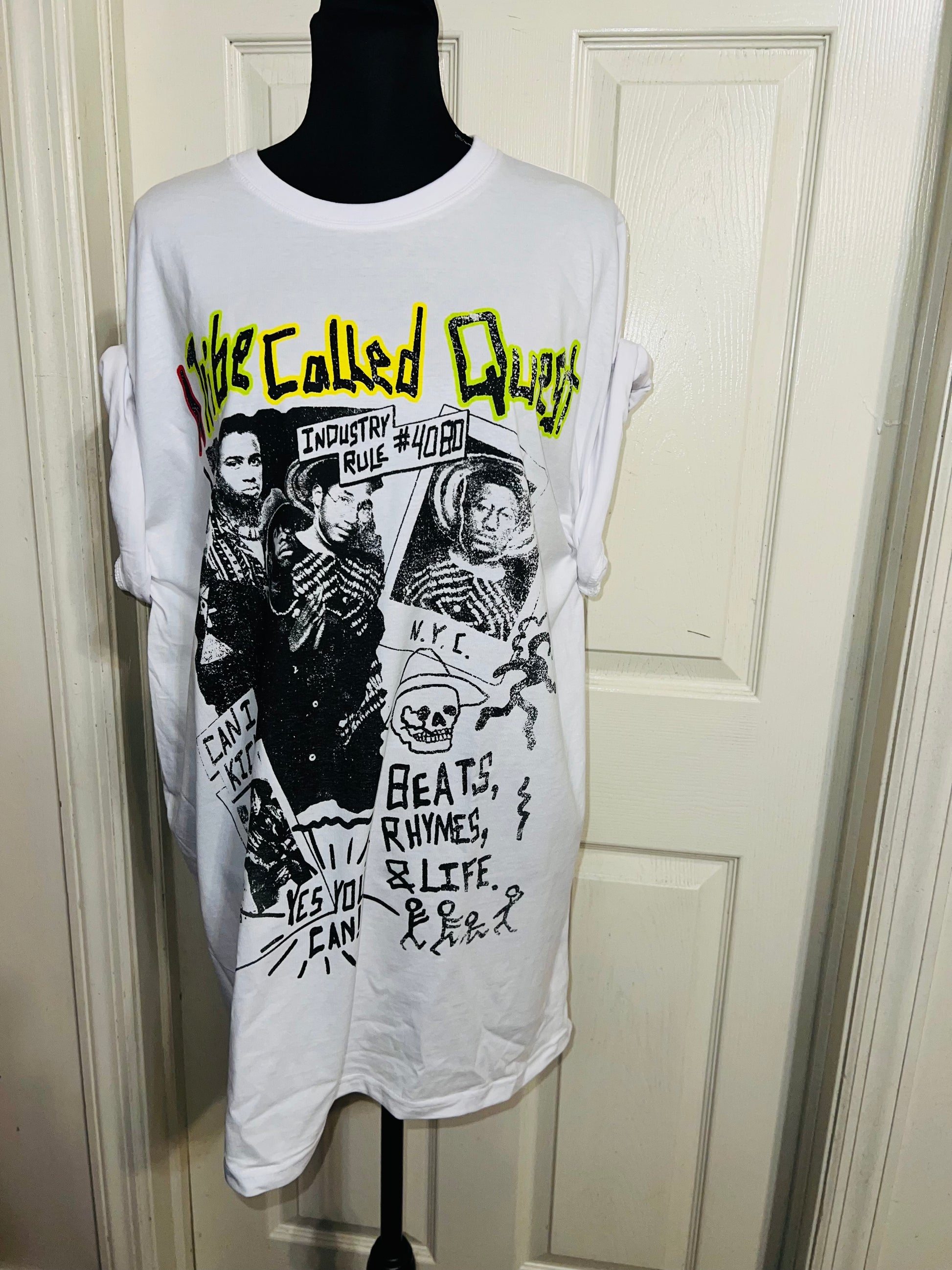 This is now a preorder. A white A Tribe Called Quest tee with all their taglines and lyrics on a cool pop set type tee. Size L/XL, oversized