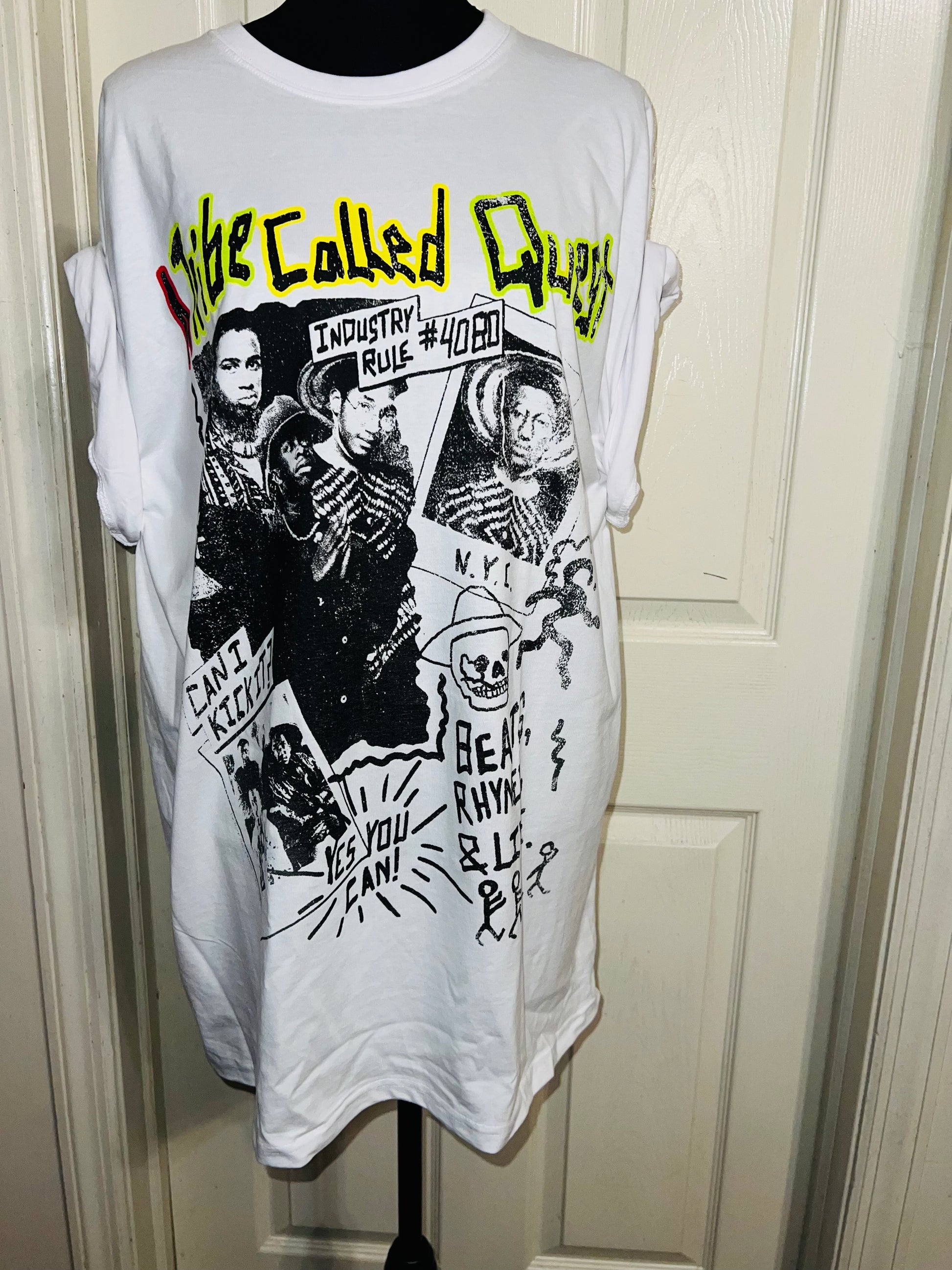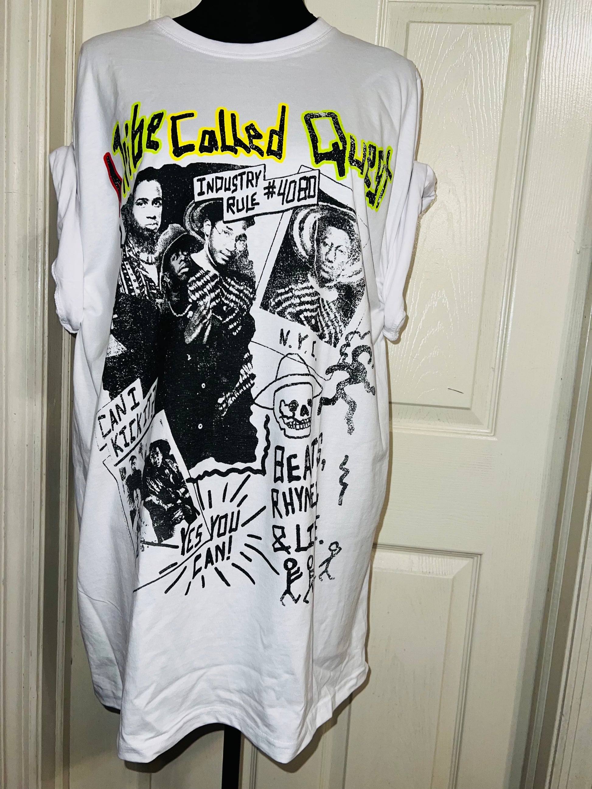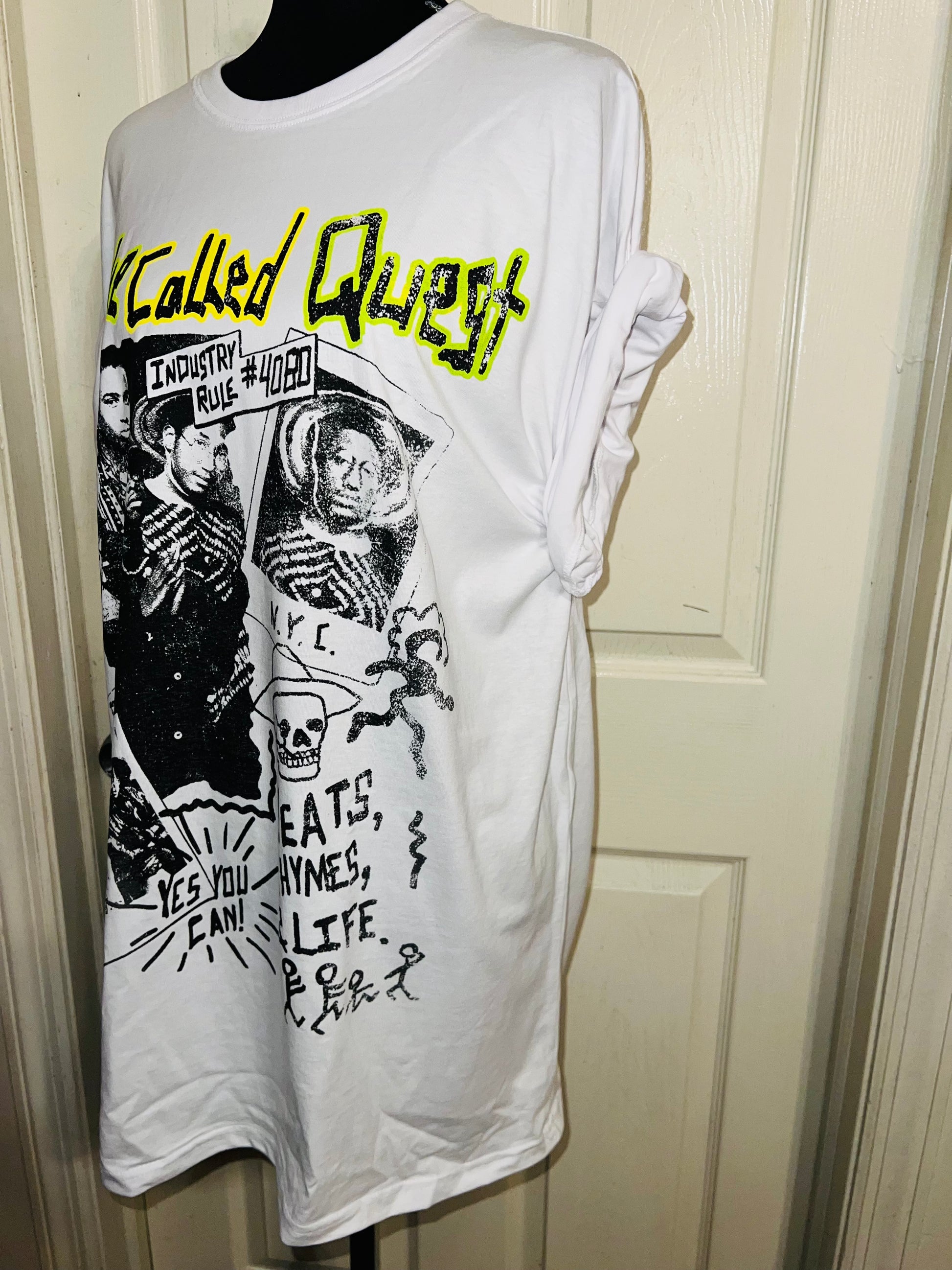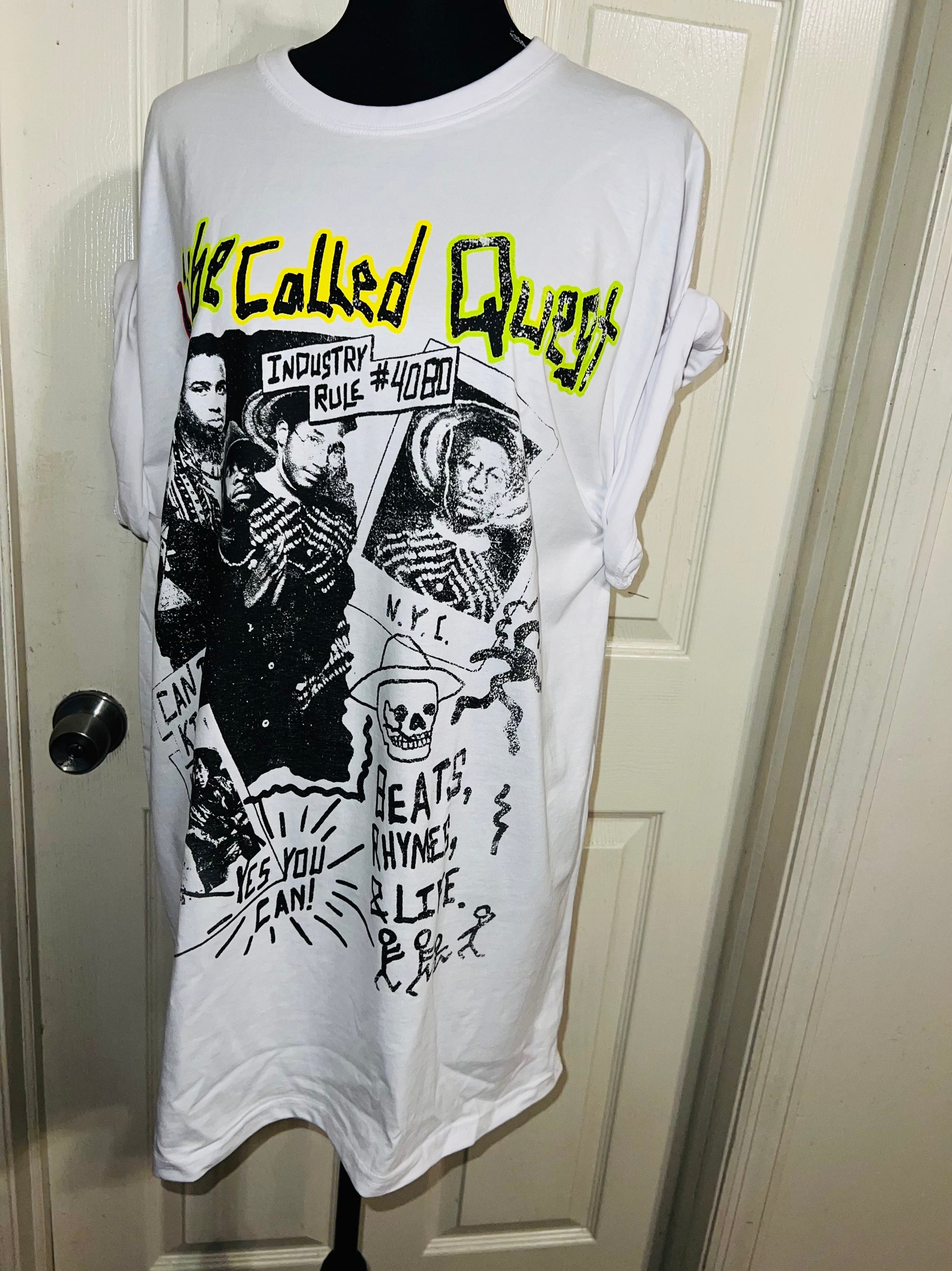 This is now a preorder. A white A Tribe Called Quest tee with all their taglines and lyrics on a cool pop set type tee. Size L/XL, oversized