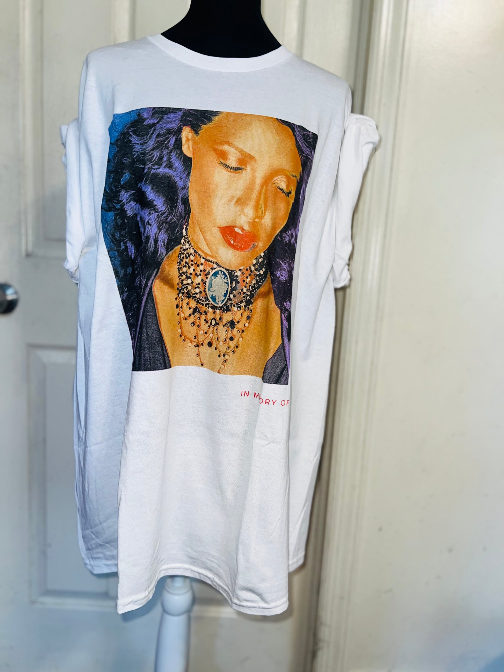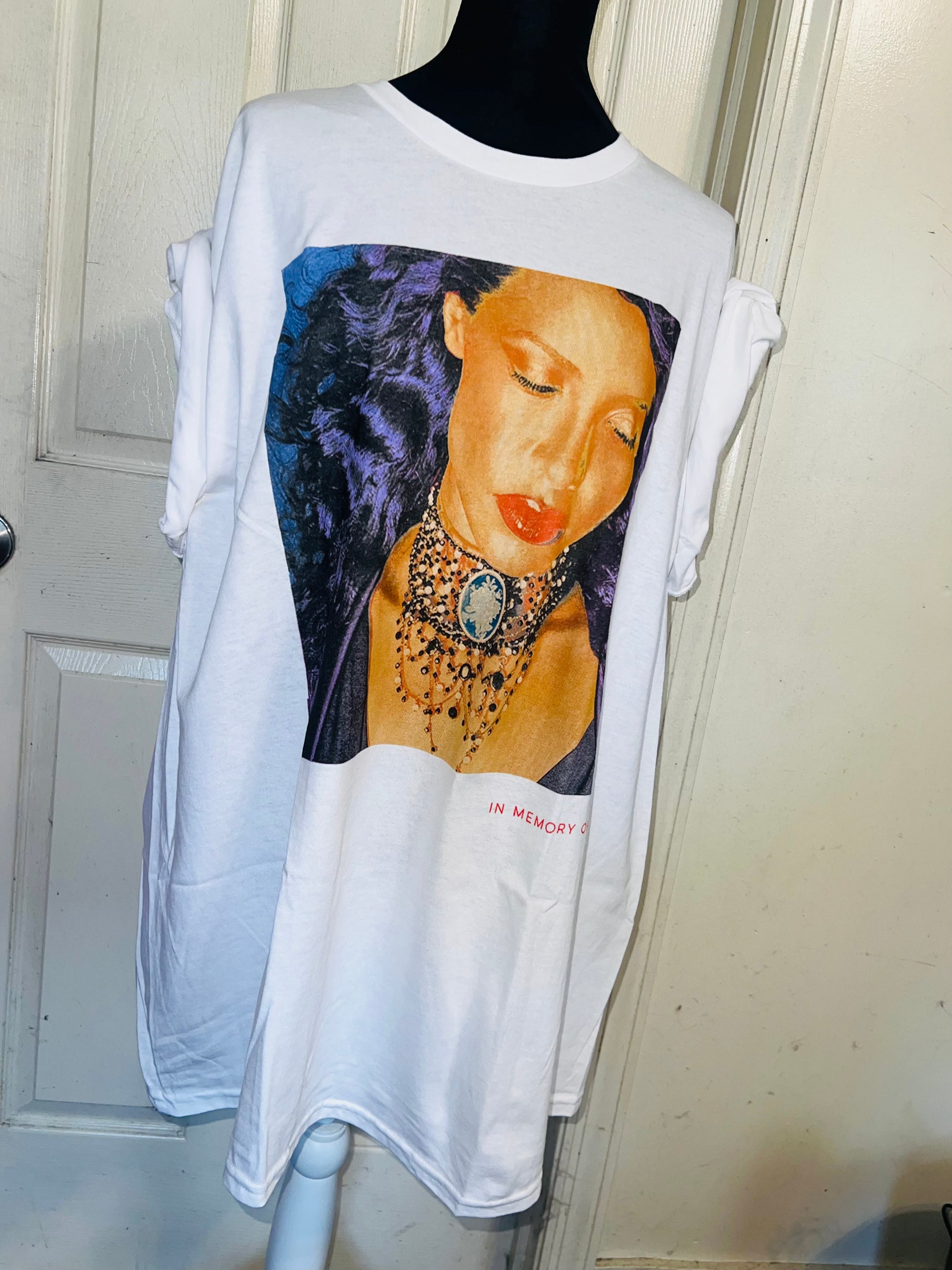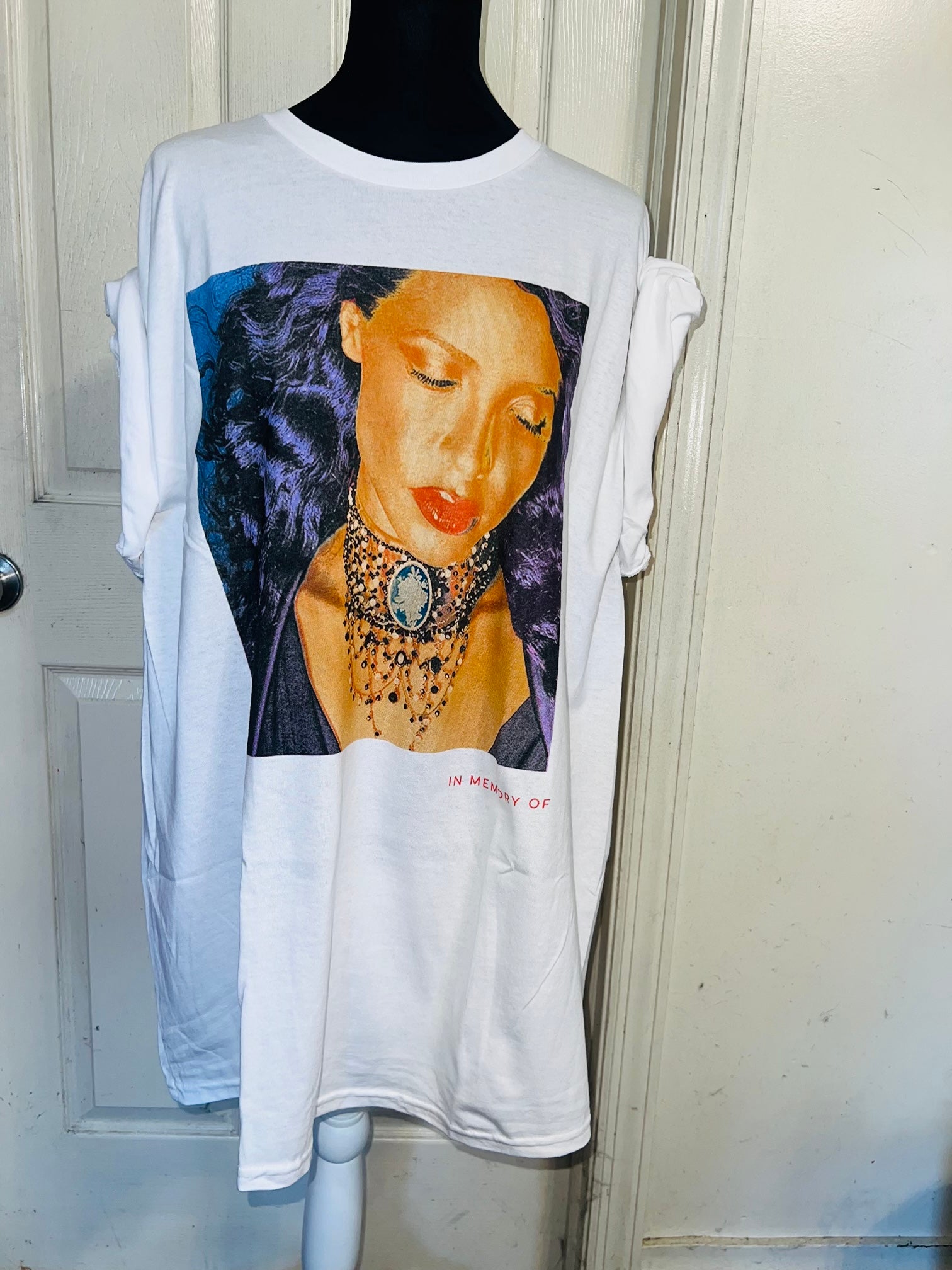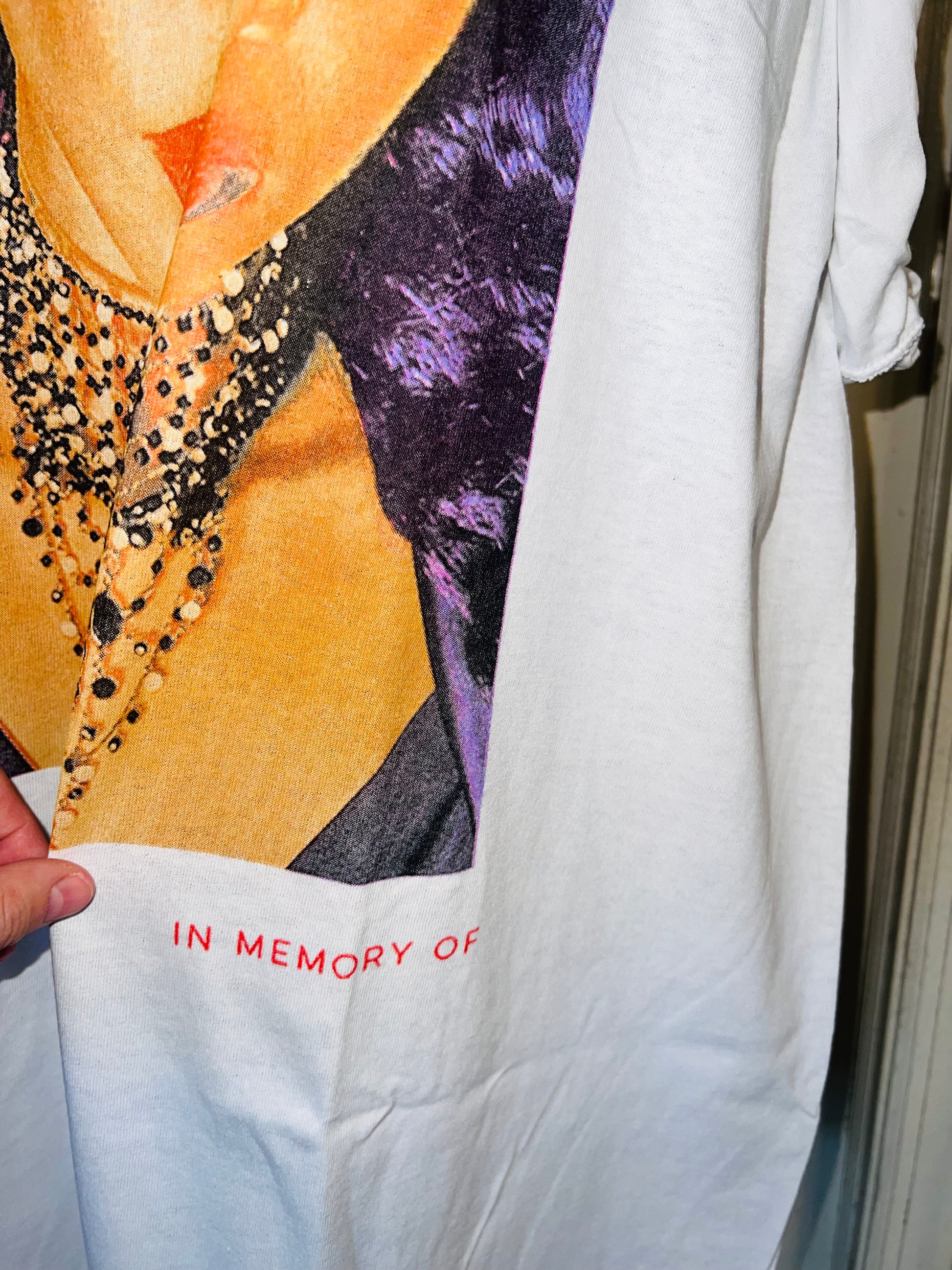 A white Aaliyah tee with “in memory of” at the bottom and a beautiful picture of her on the front! Oversized, size L/XL.