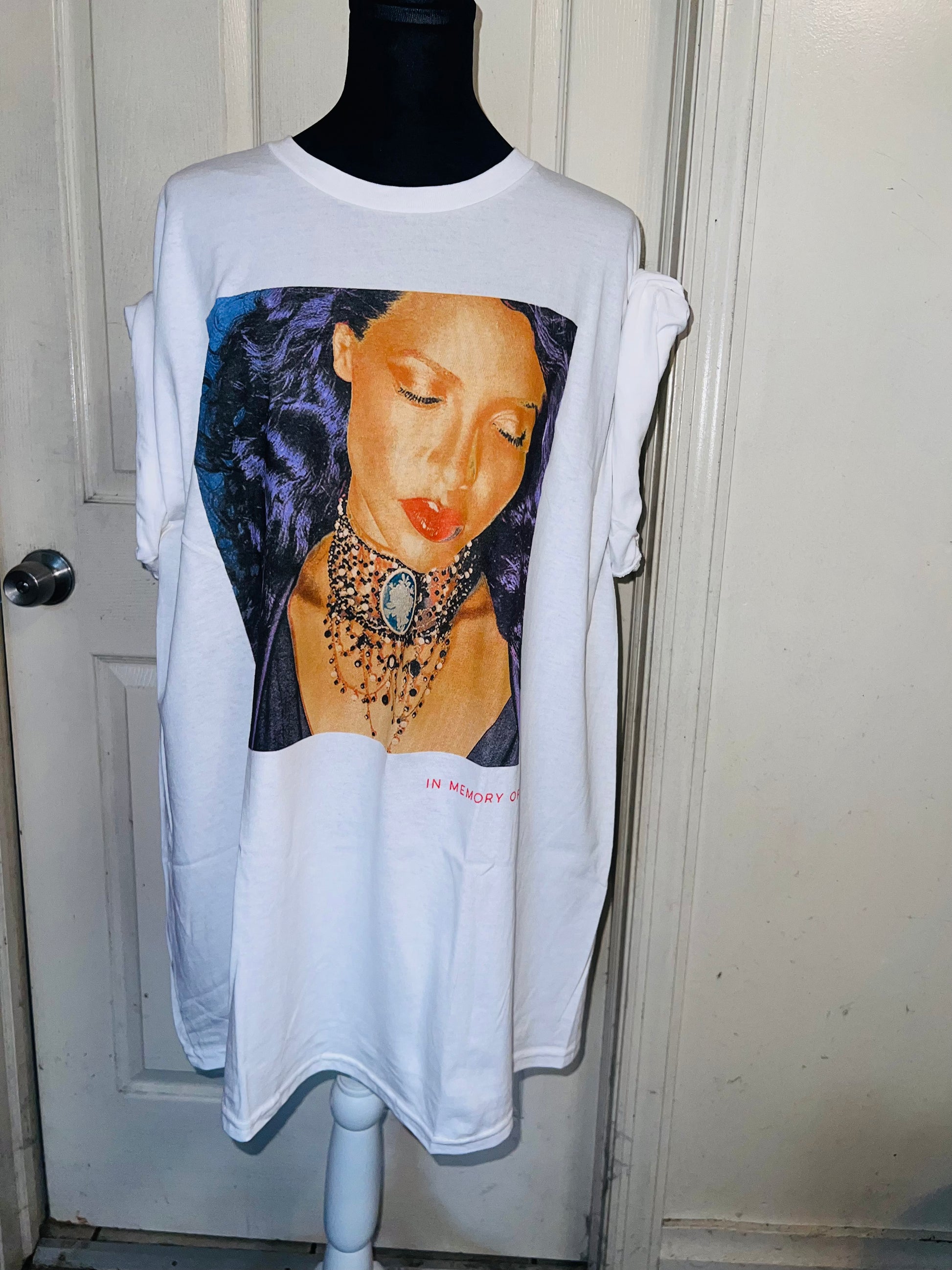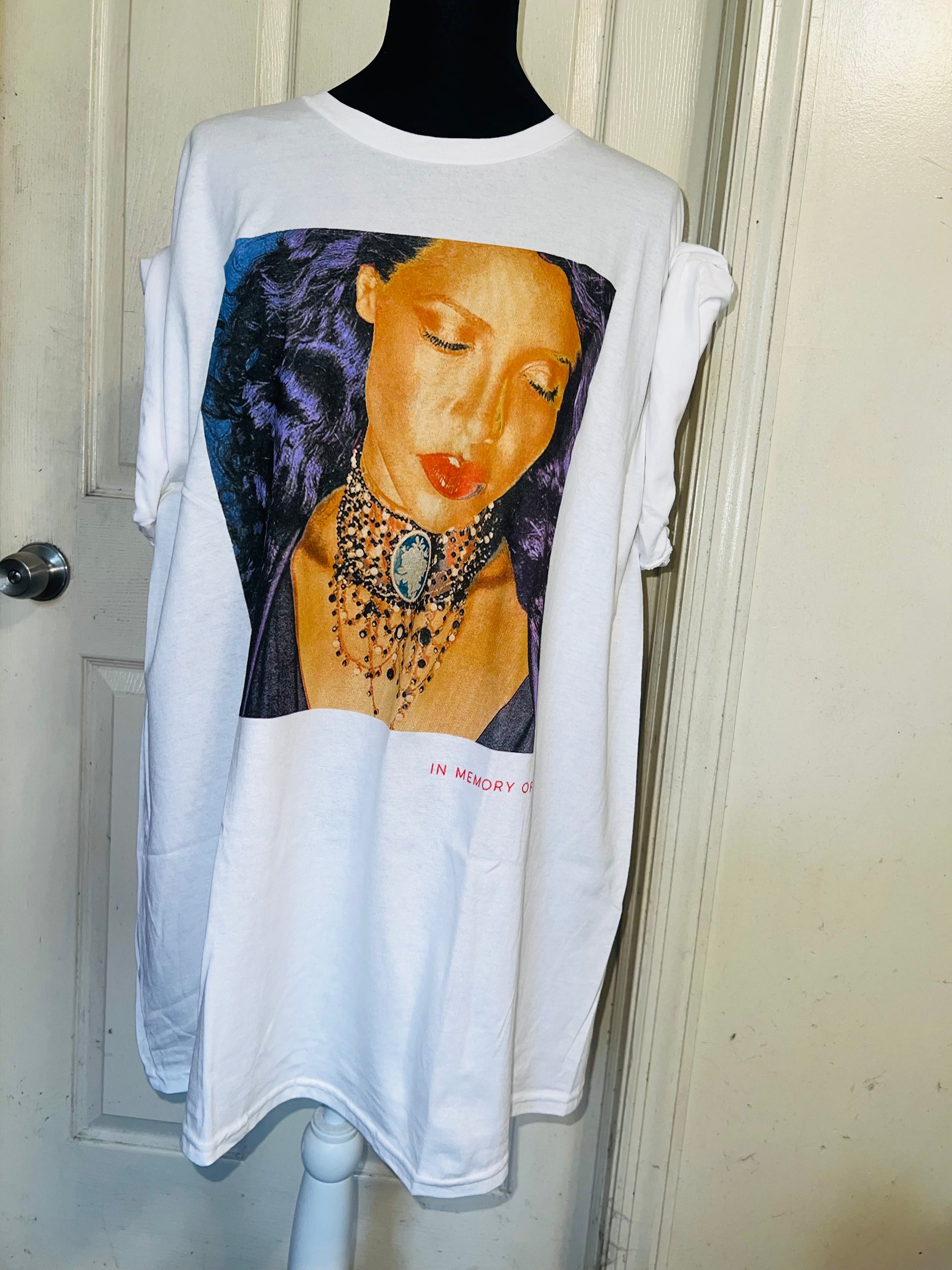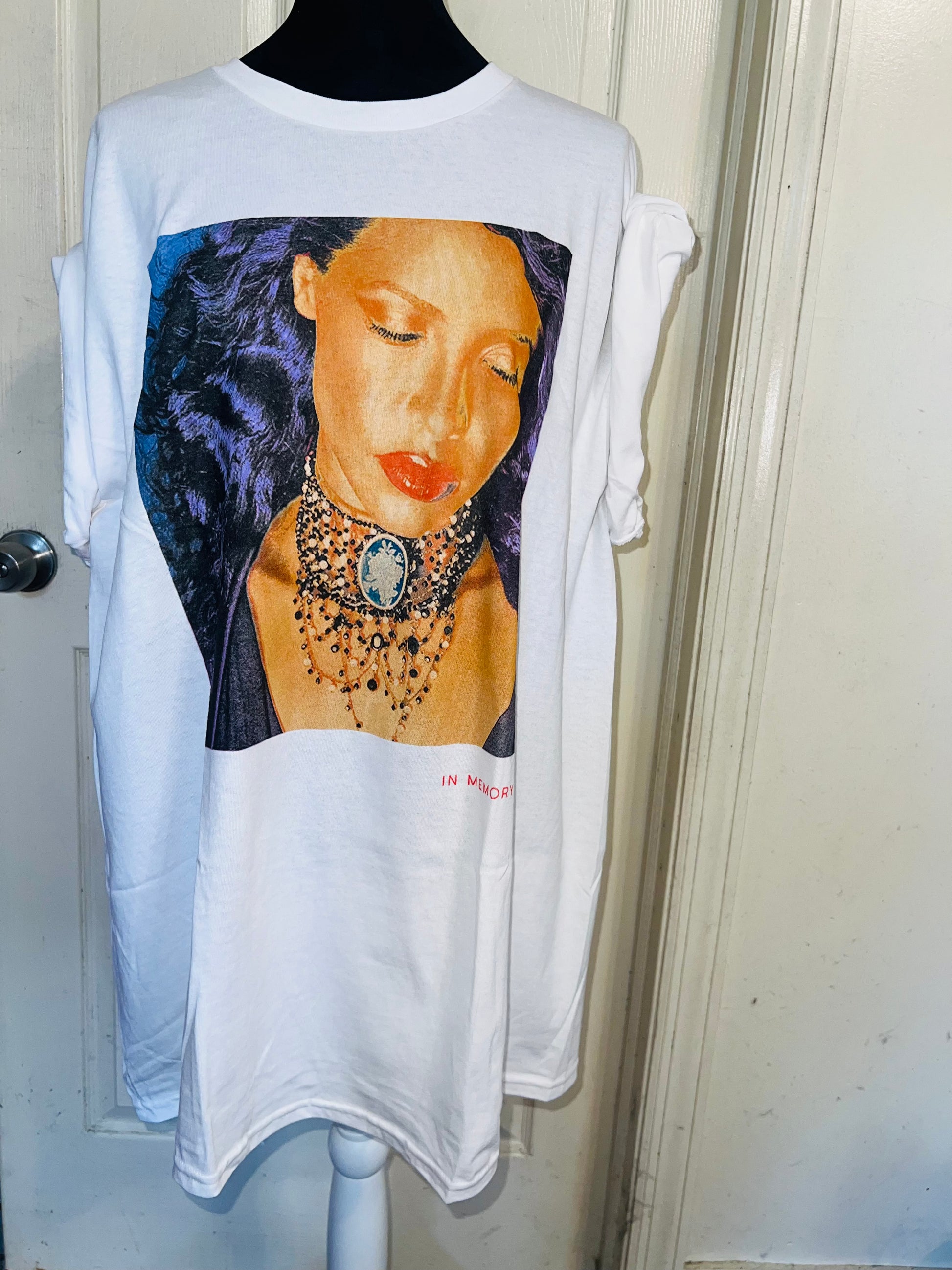 A white Aaliyah tee with “in memory of” at the bottom and a beautiful picture of her on the front! Oversized, size L/XL.