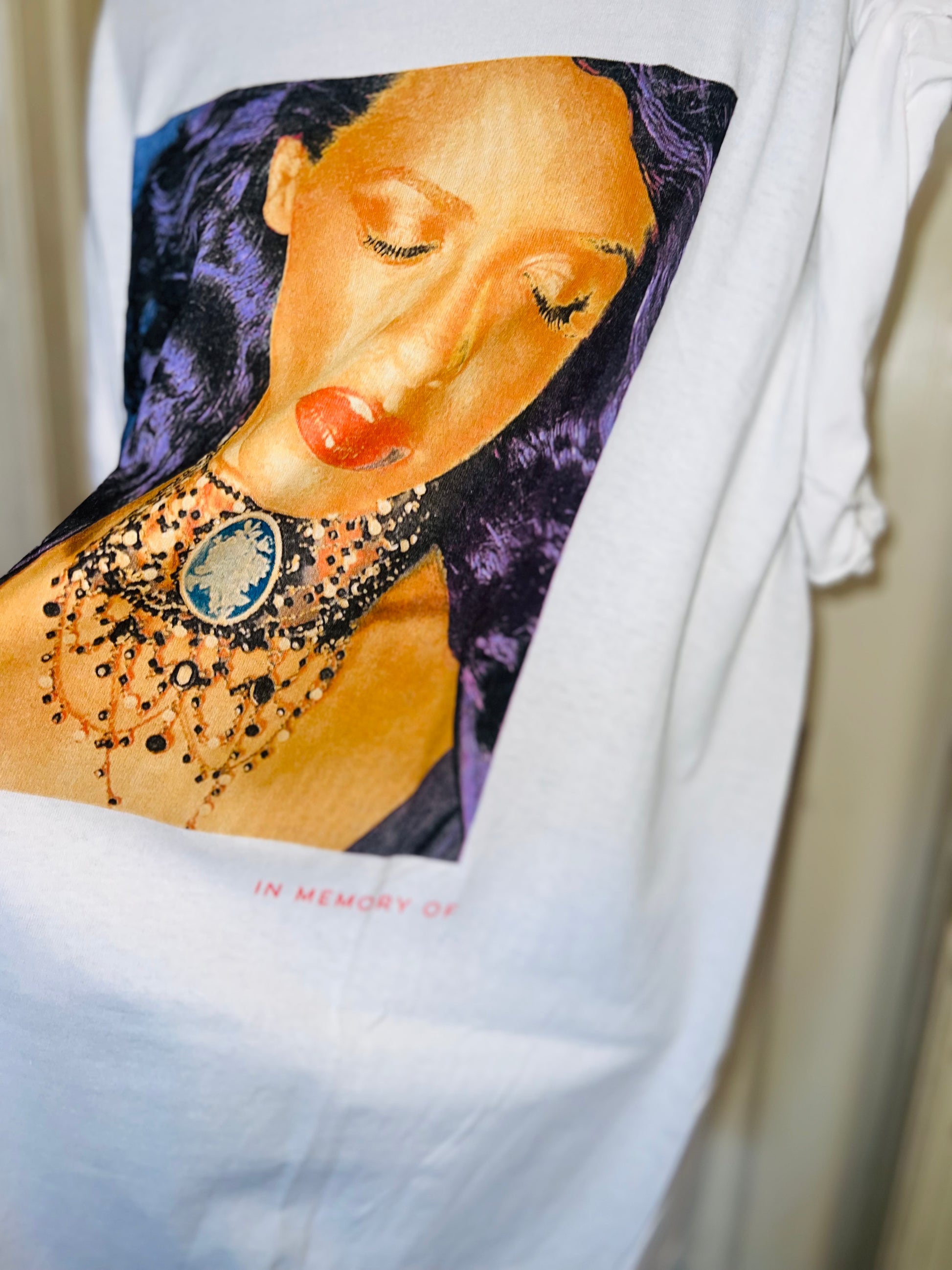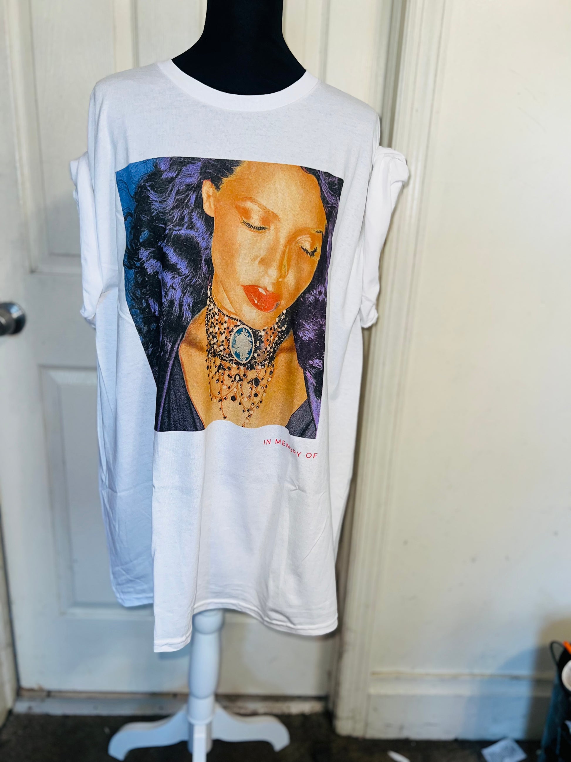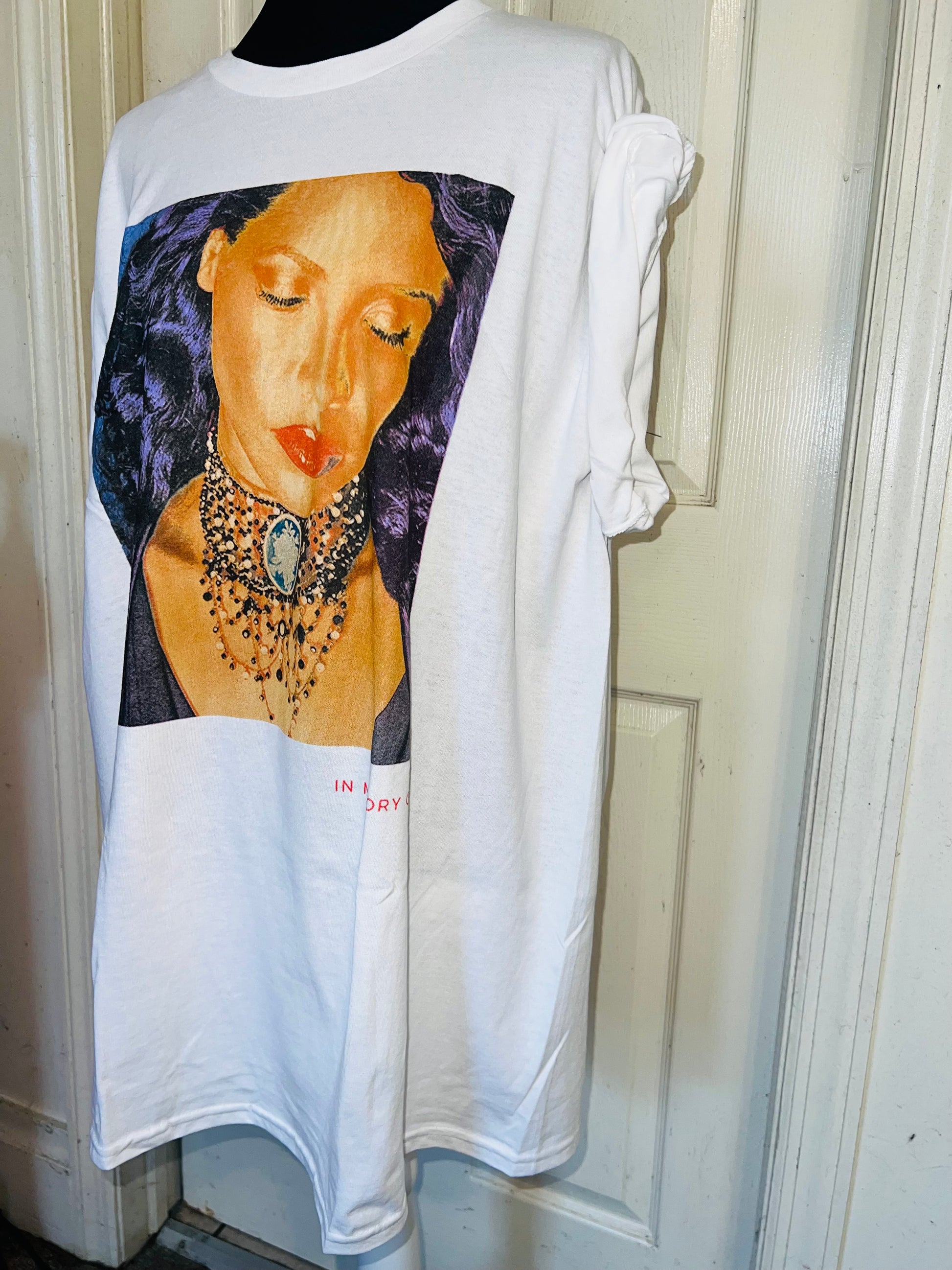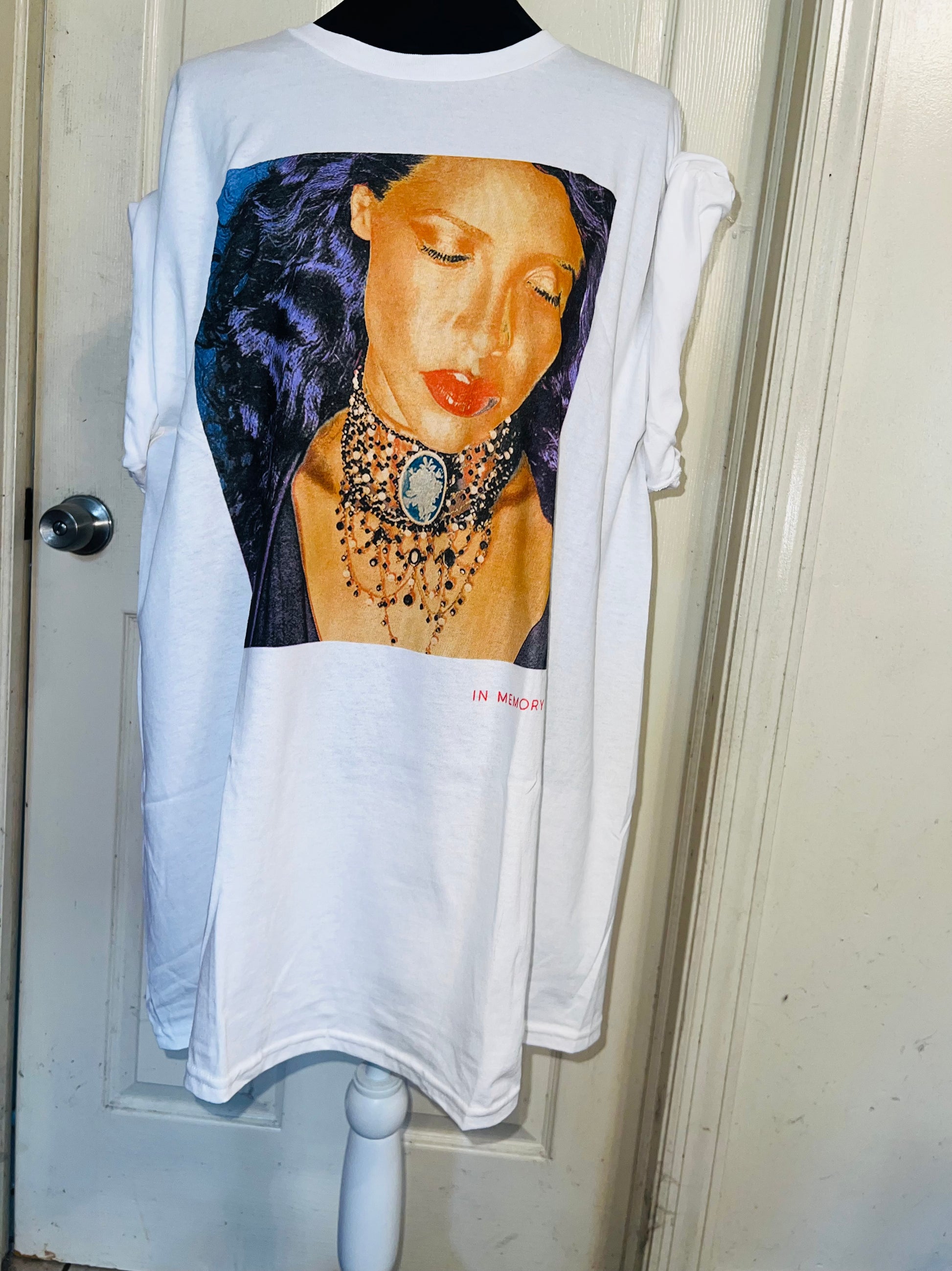 A white Aaliyah tee with “in memory of” at the bottom and a beautiful picture of her on the front! Oversized, size L/XL.