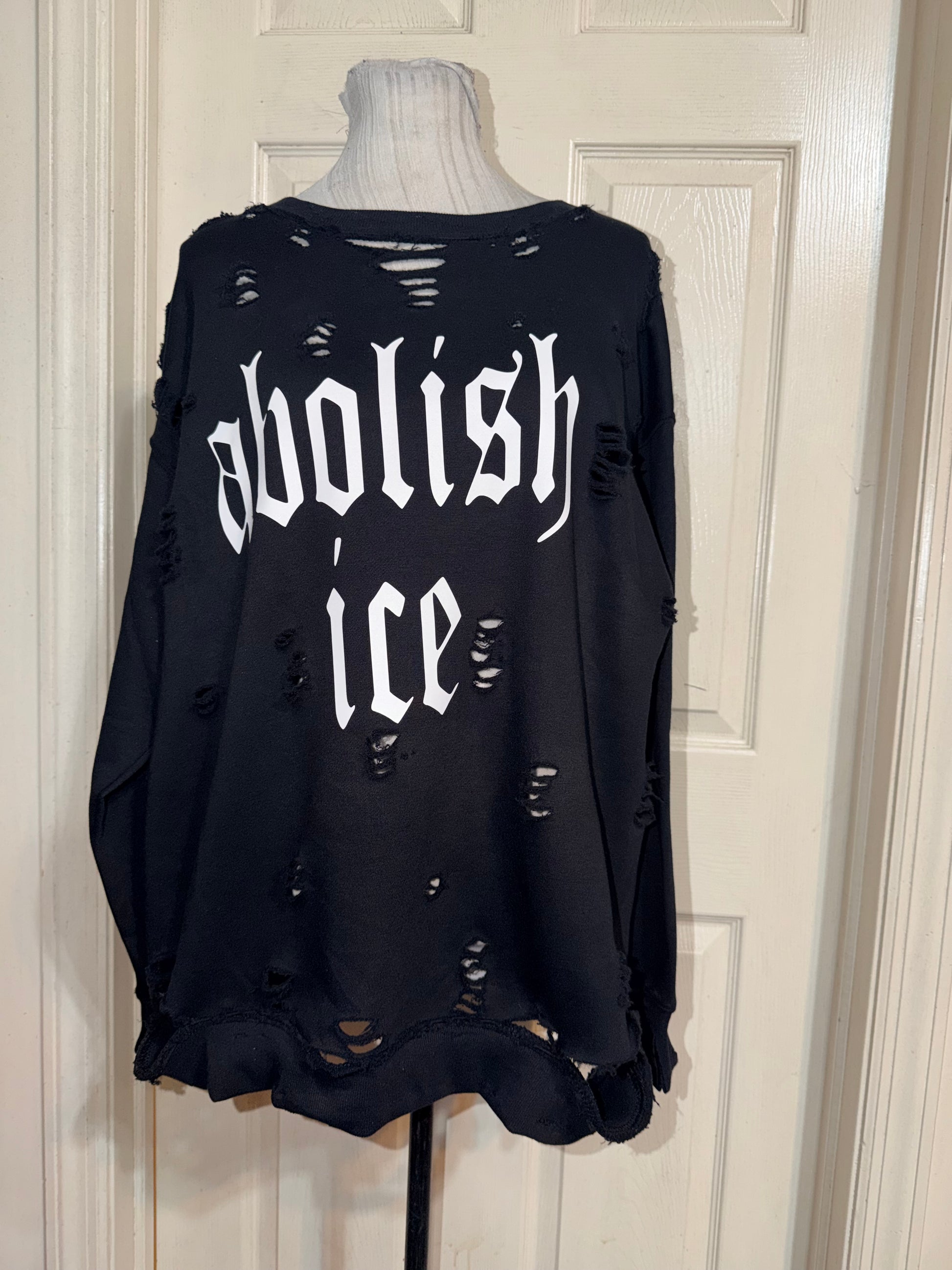 With a choice of black or white colors, choose a tee or a sweatshirt with Abolish Ice on the front. Choice of white, black, or red writing. Choice of distressing as well. The dark spots are wrinkle spray! These are preorders as I custom purchase upon purchase. Please allow time to order & create. Details for proceeds to come.