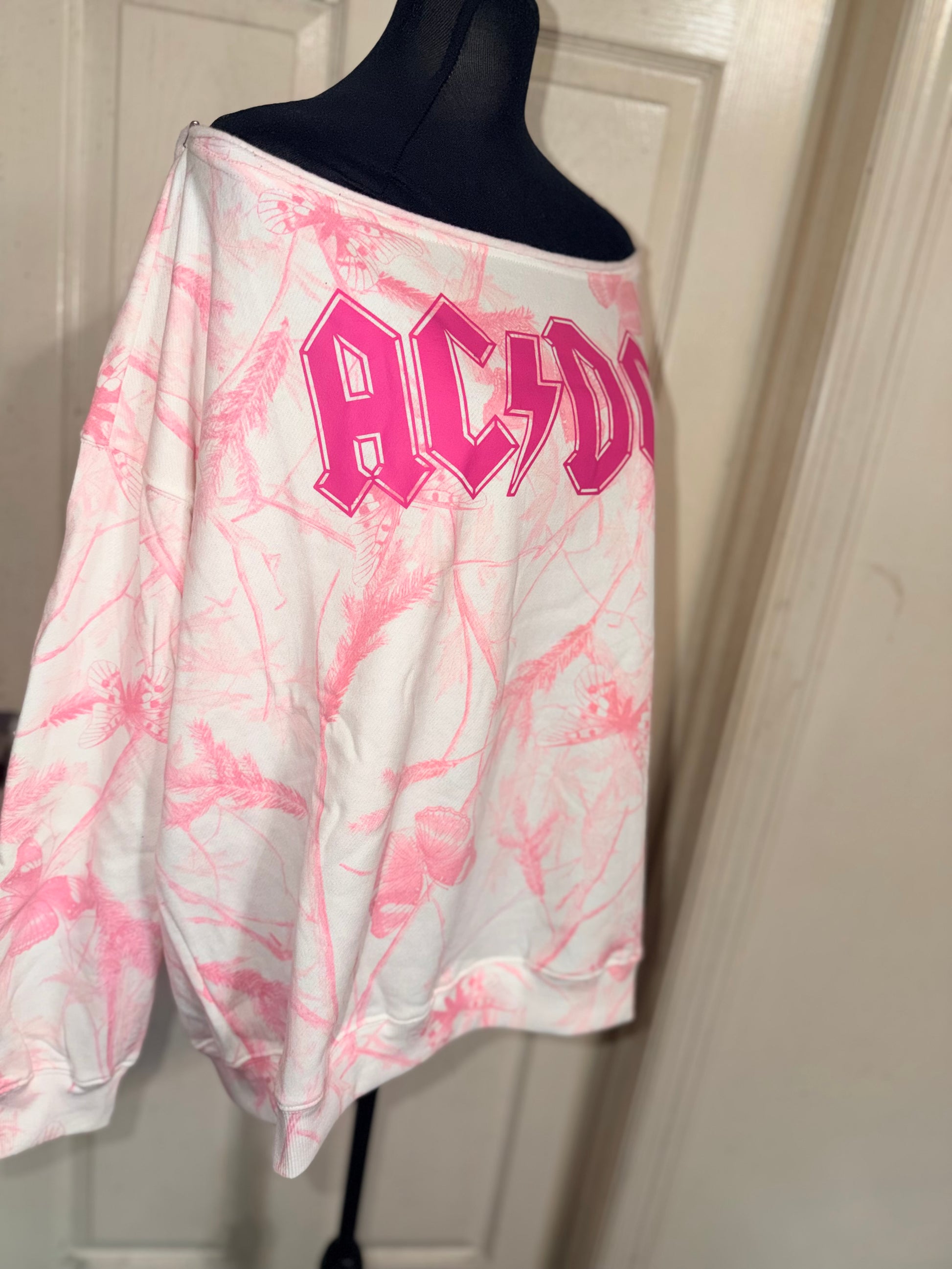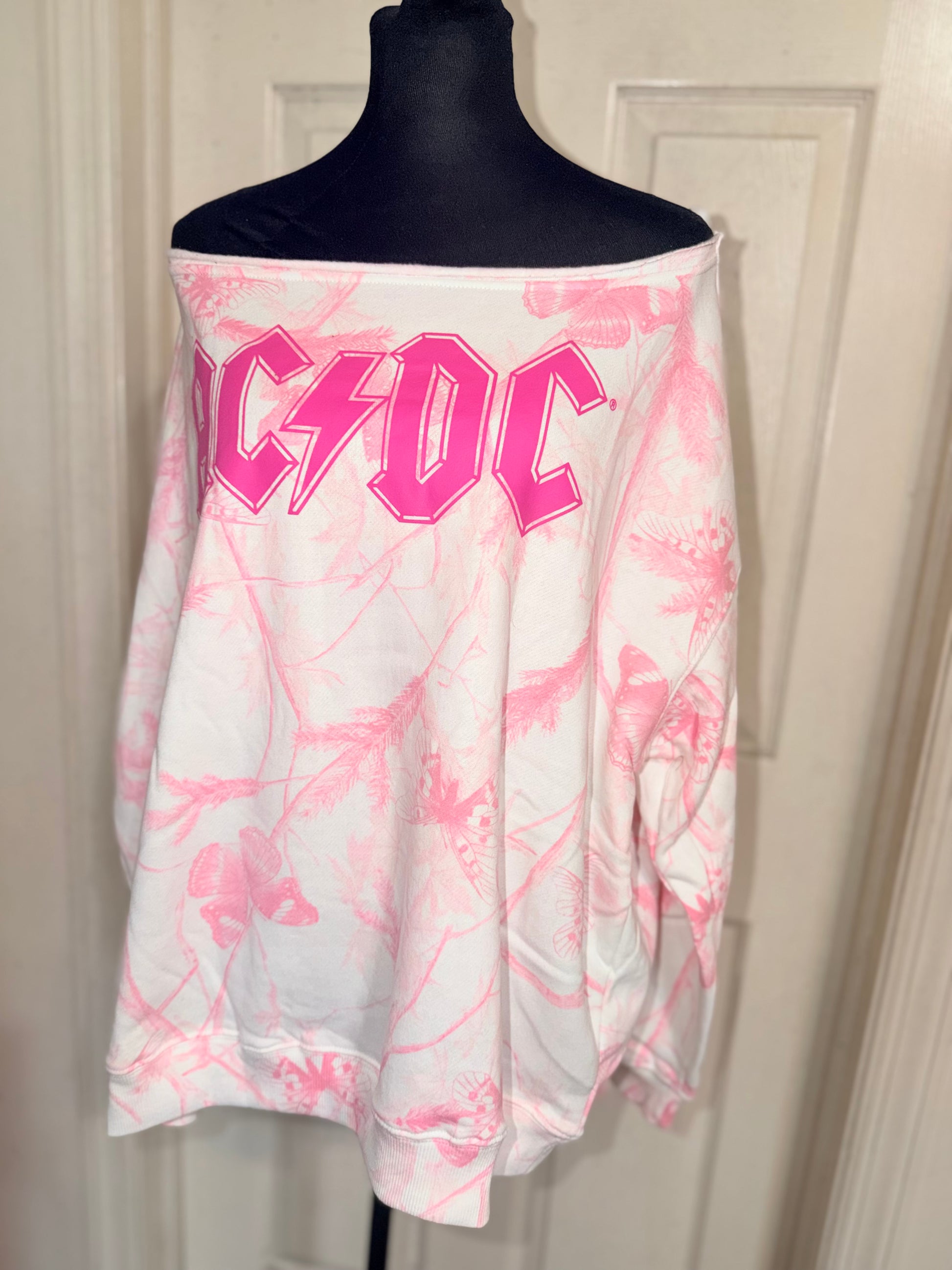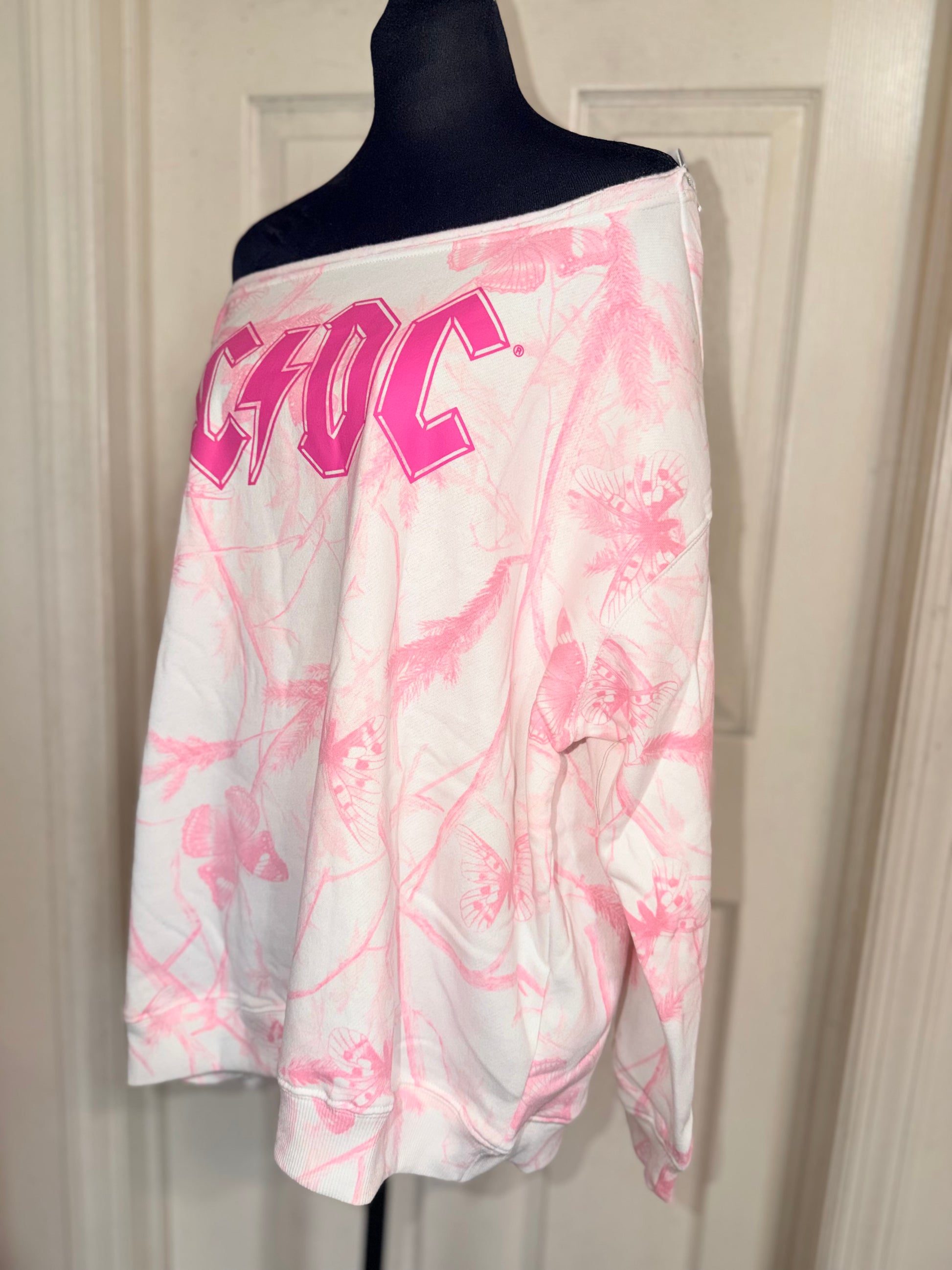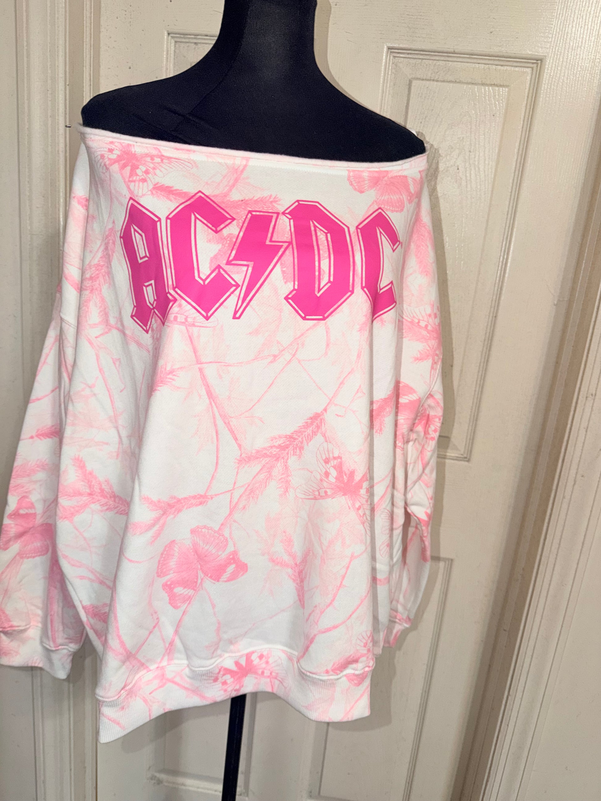 A pink camouflage AC/DC oversized off the shoulder sweatshirt.