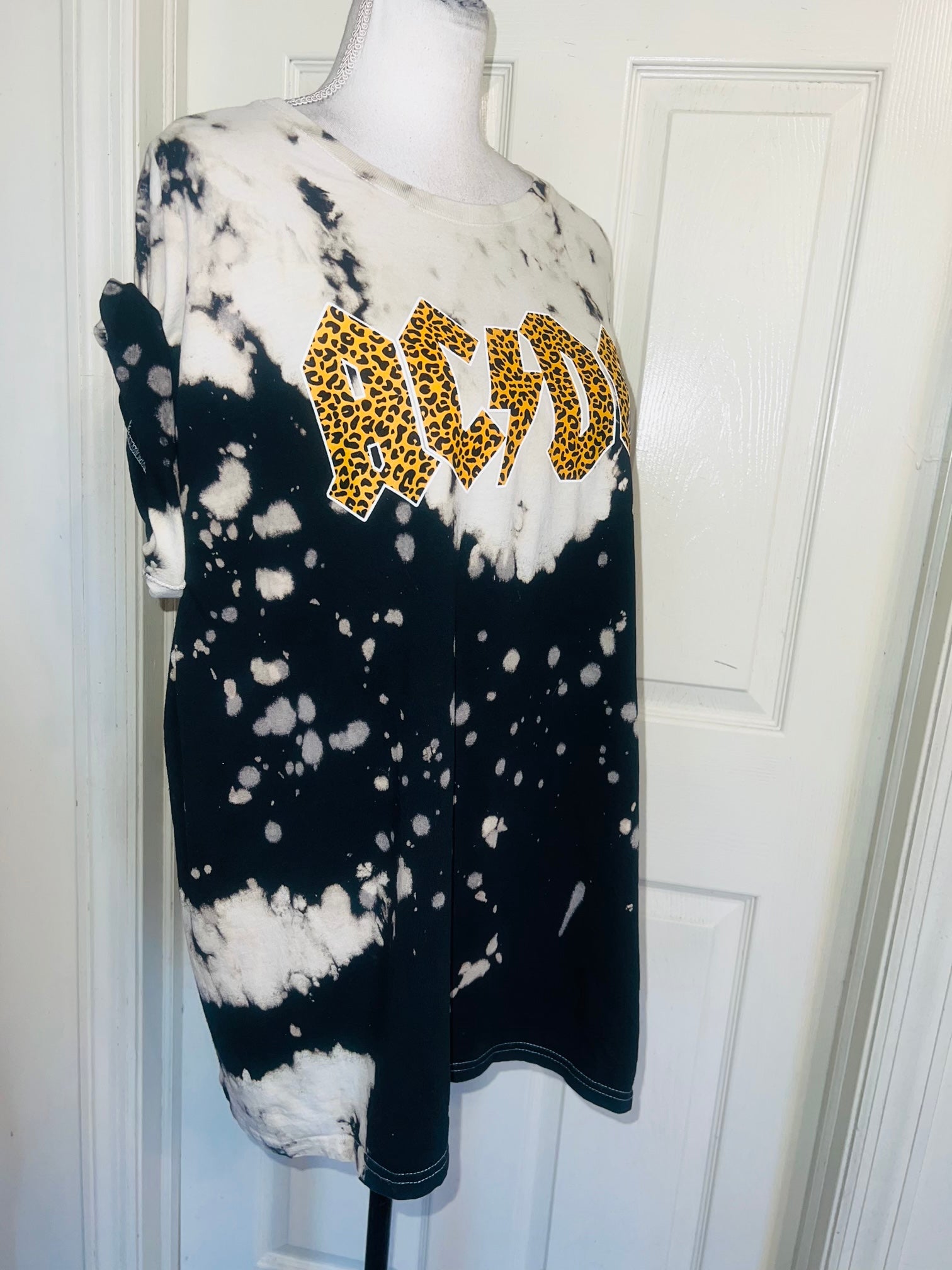This is now a preorder. A black and white tie dye / bleach splattered AC/DC tee with cheetah print. Size L/XL, oversized.