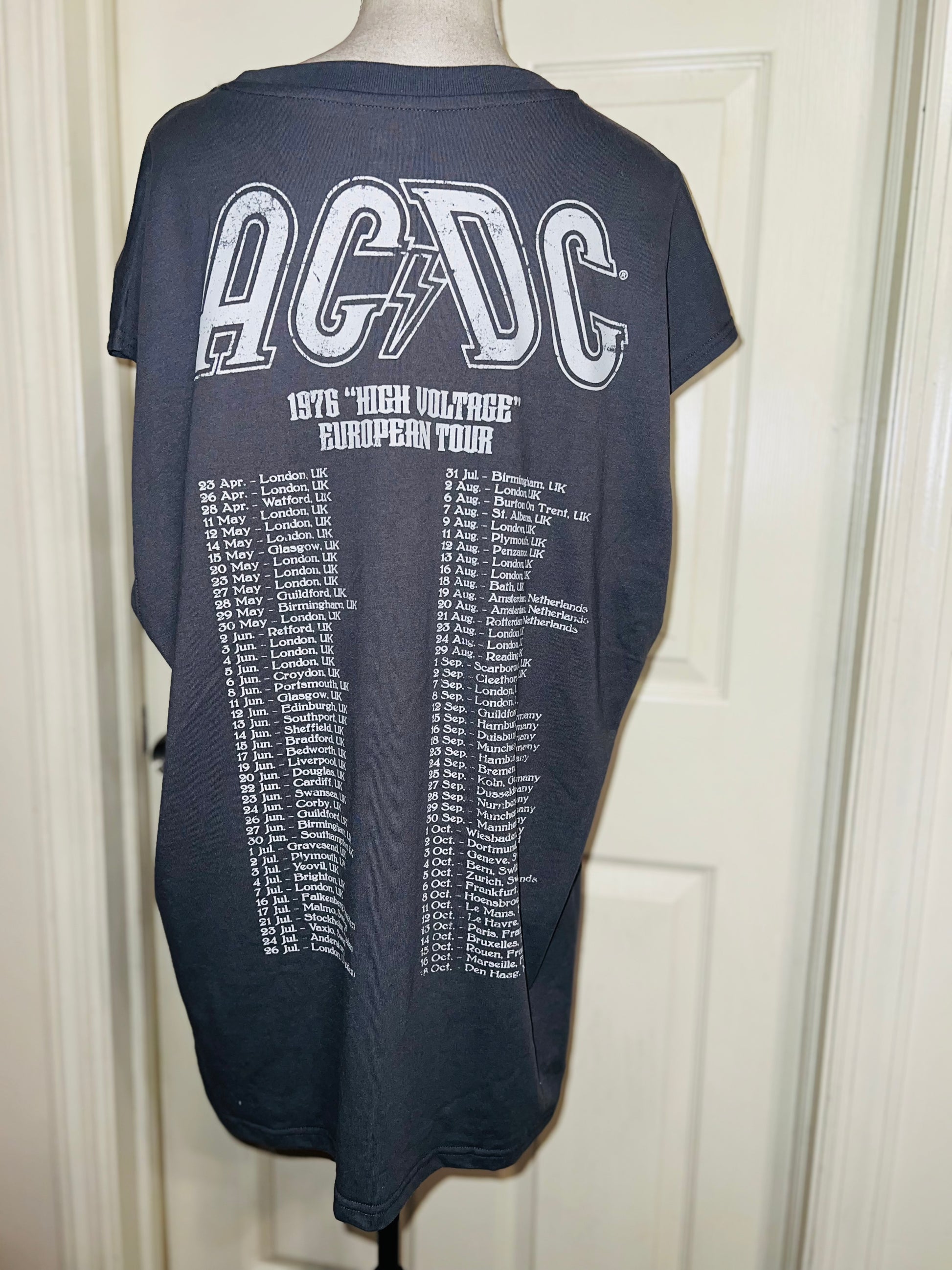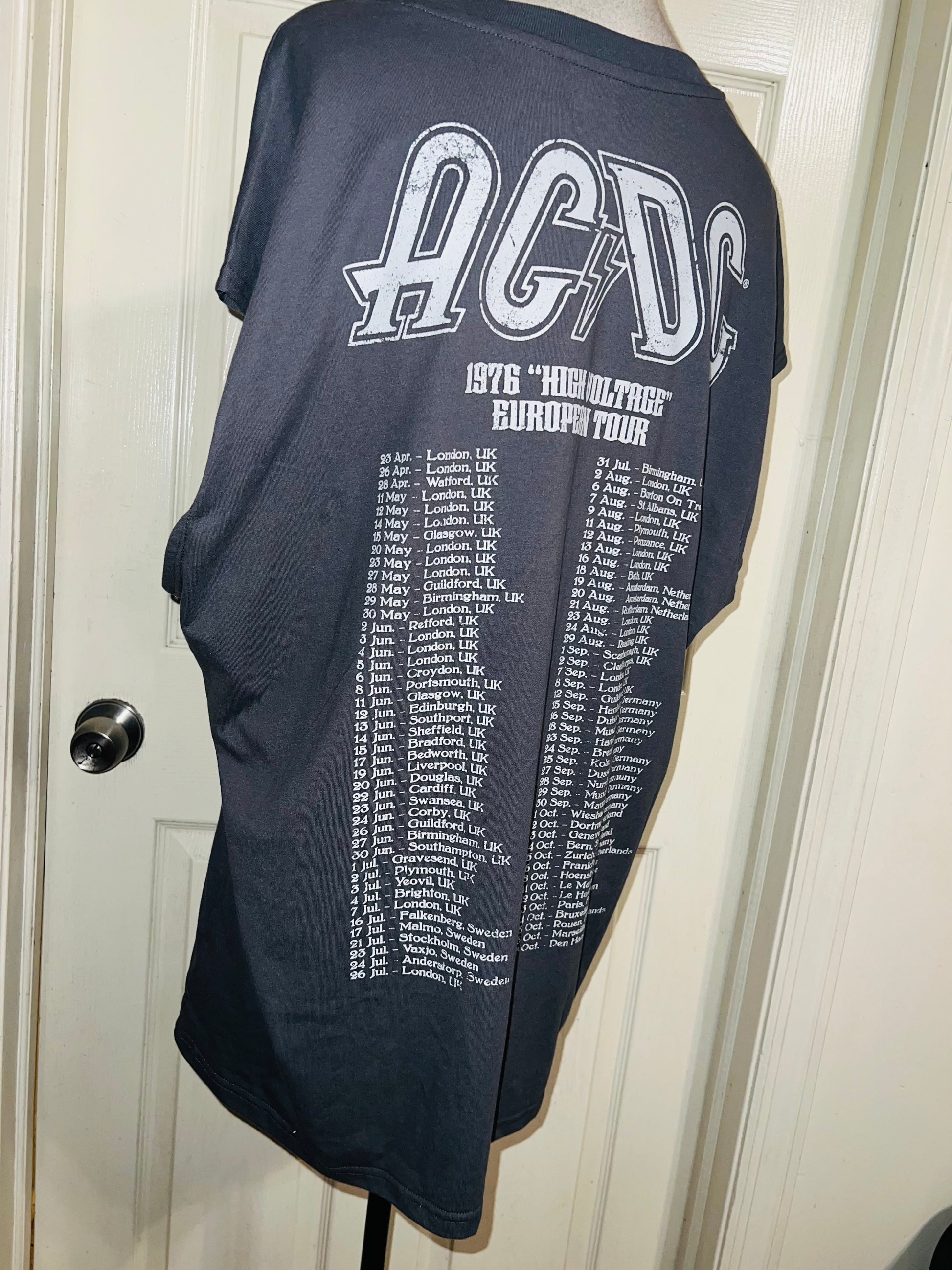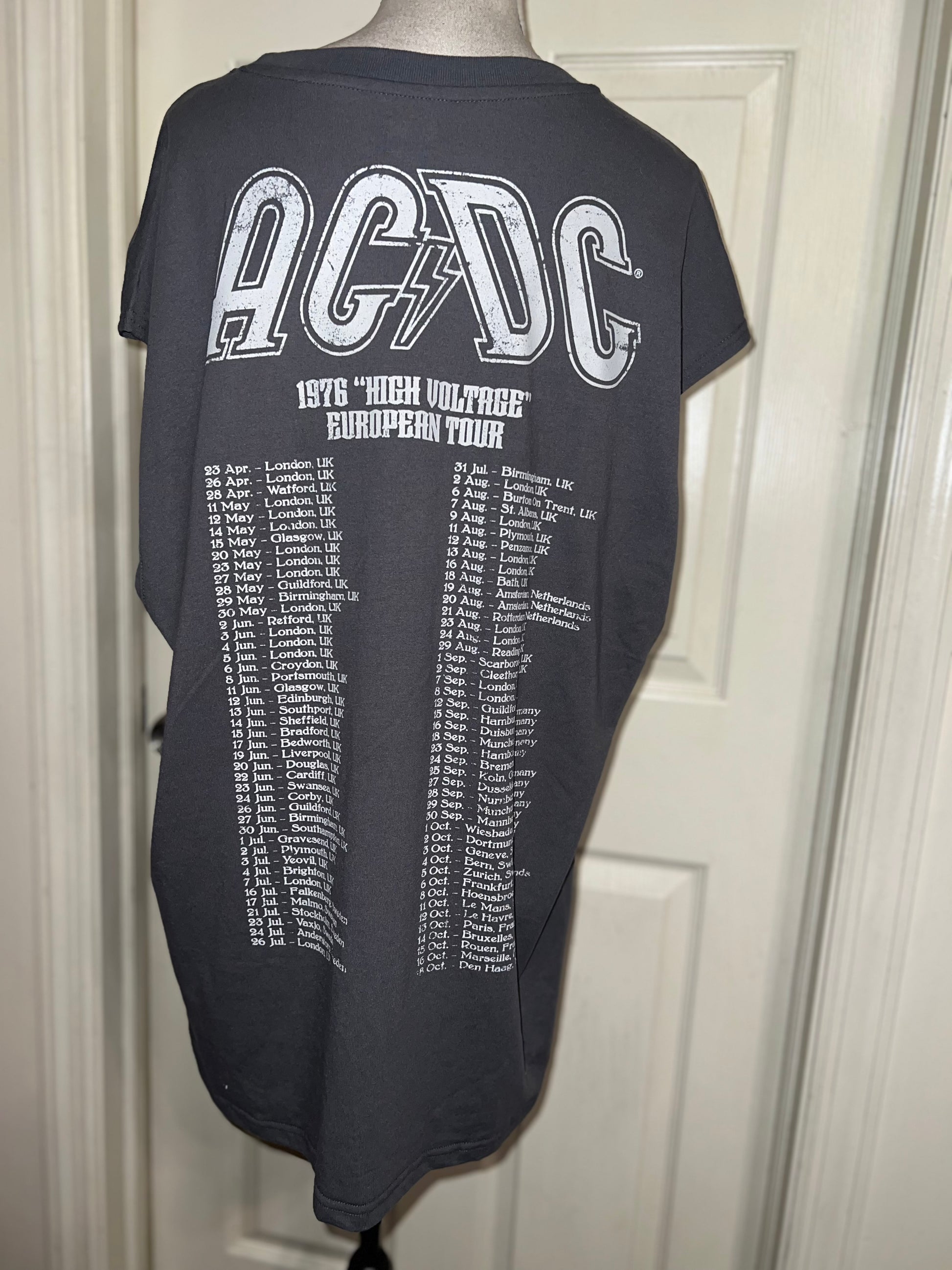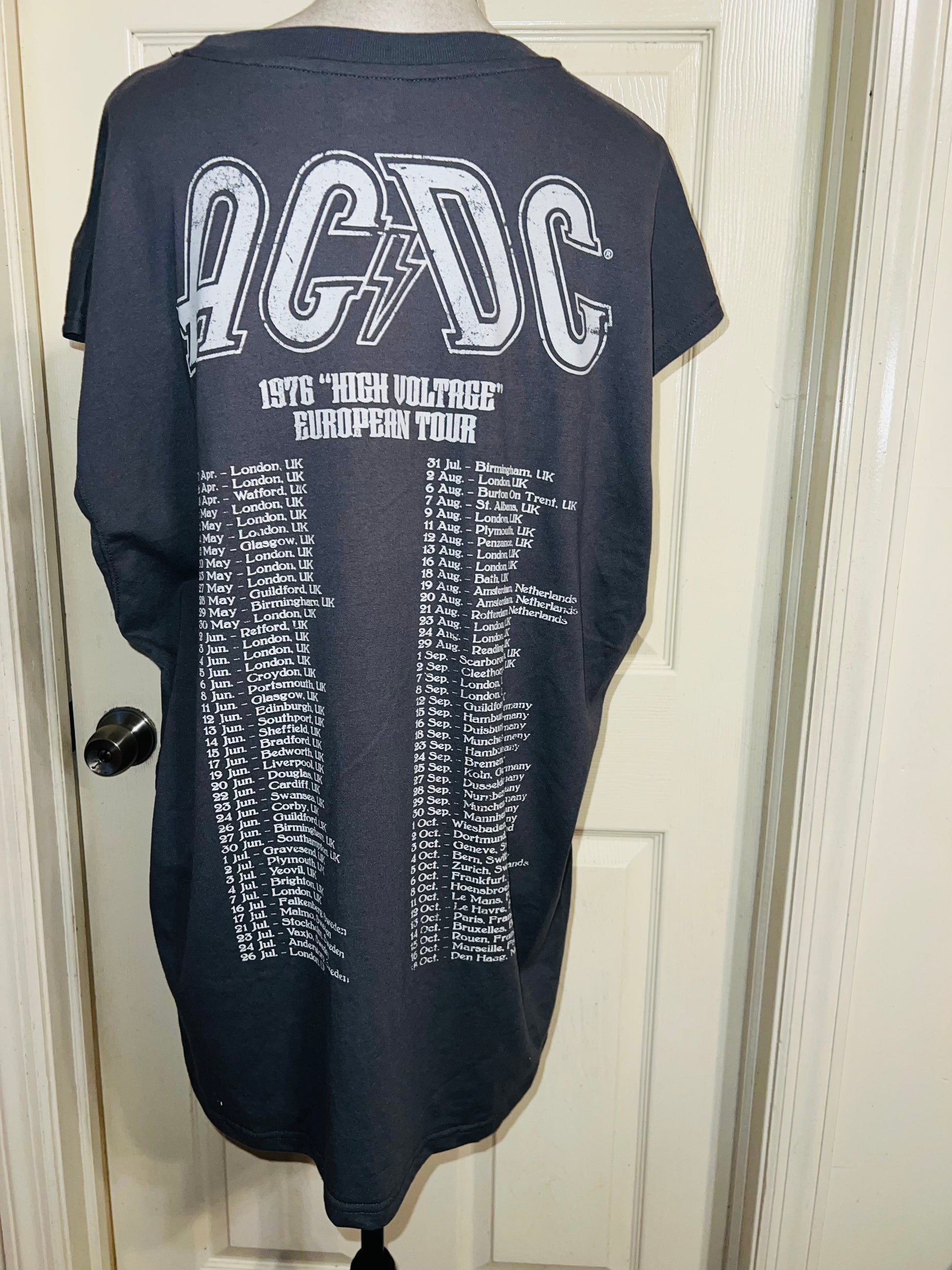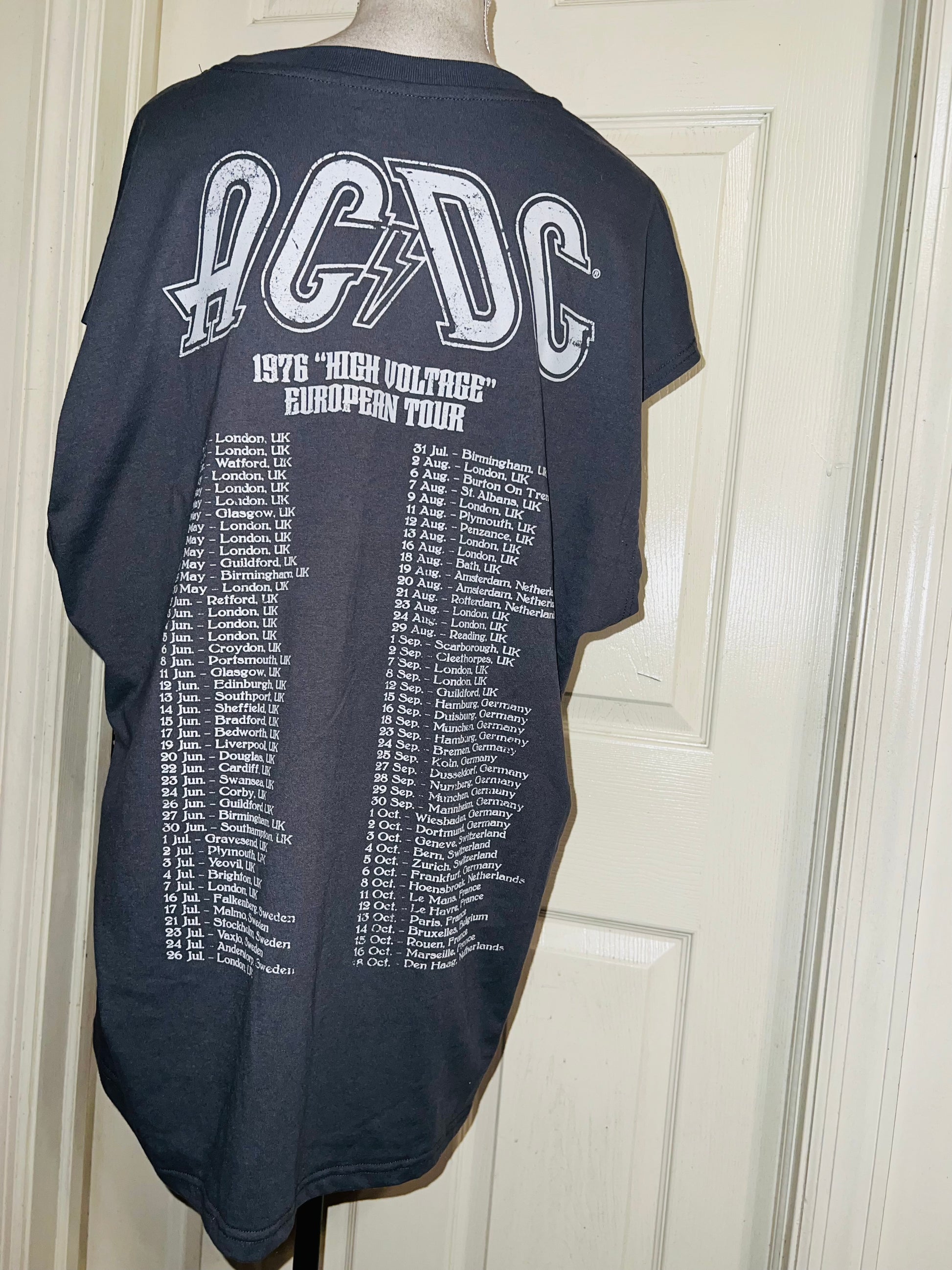 A grey AC/DC High Voltage European 1976 Tour double sided tank. The cities and tour dates on the back. Size XL, oversized.