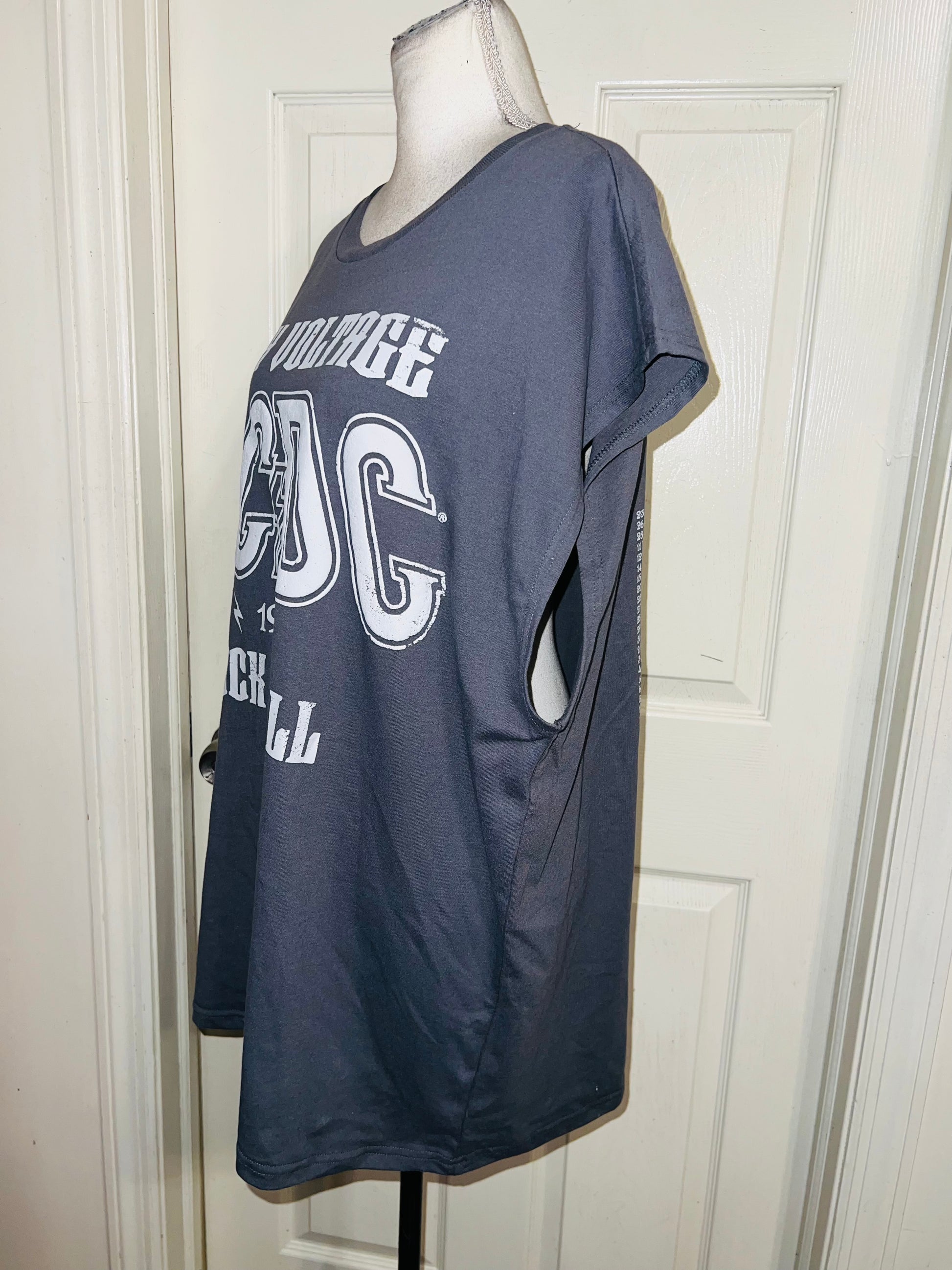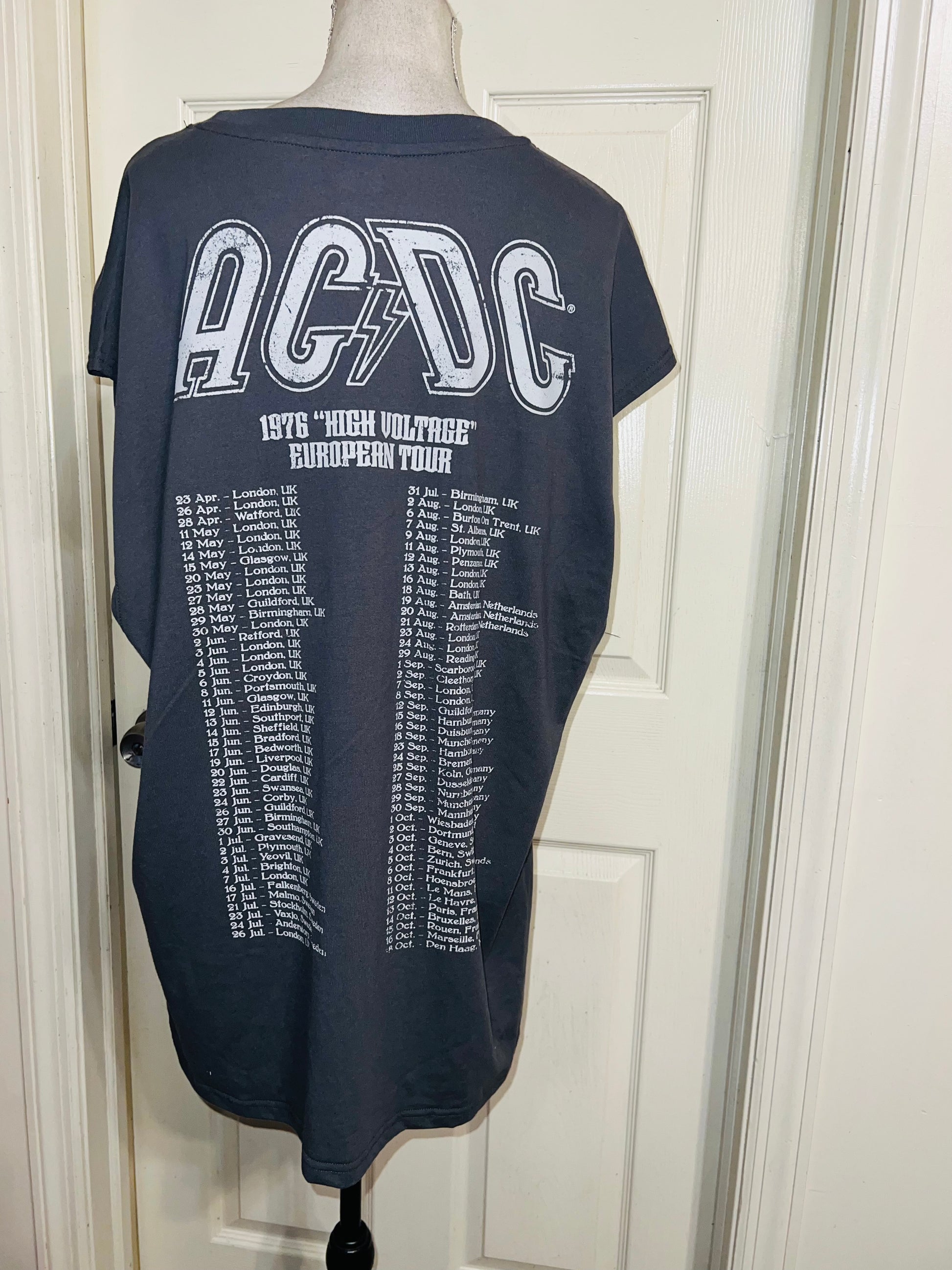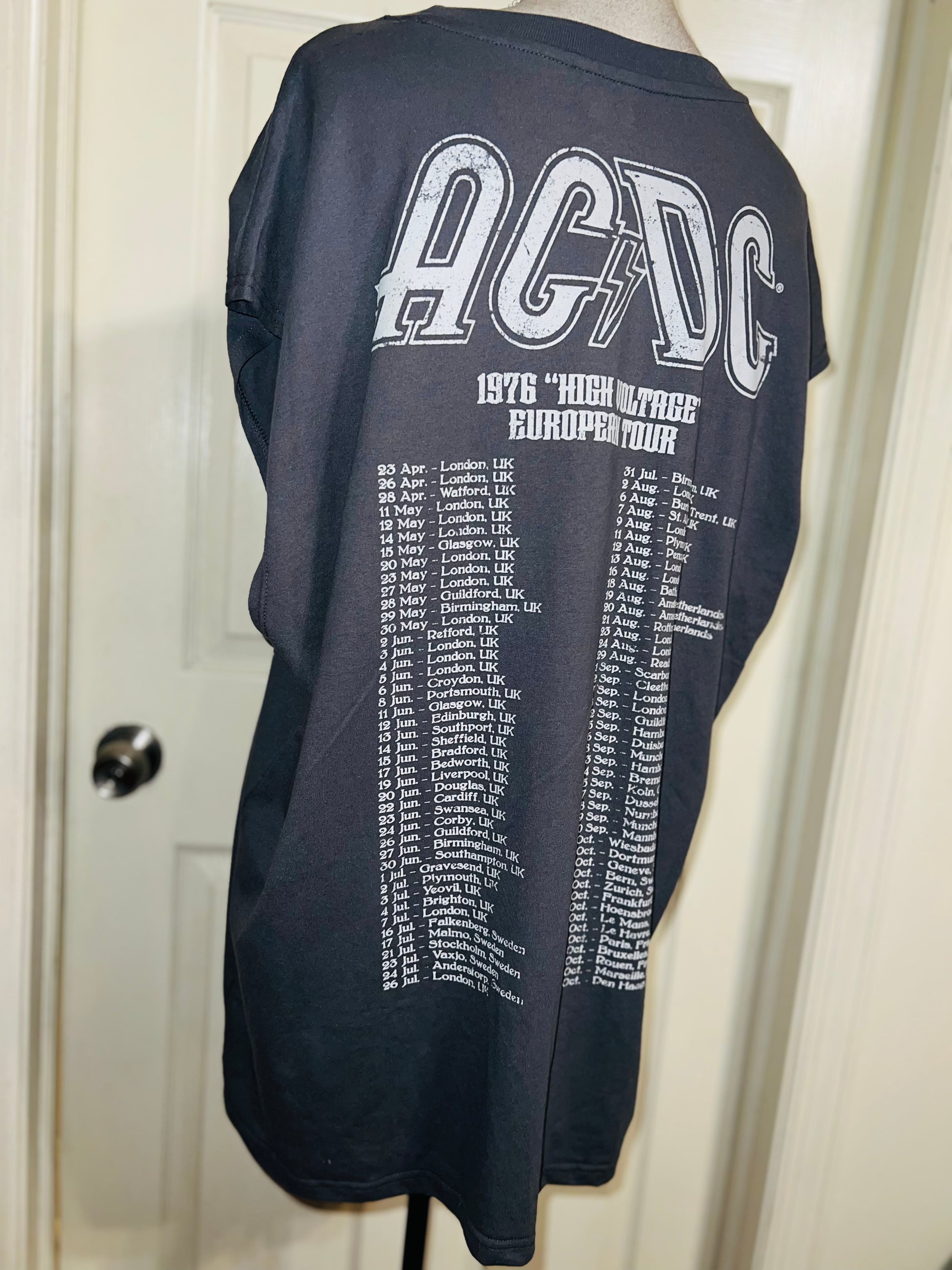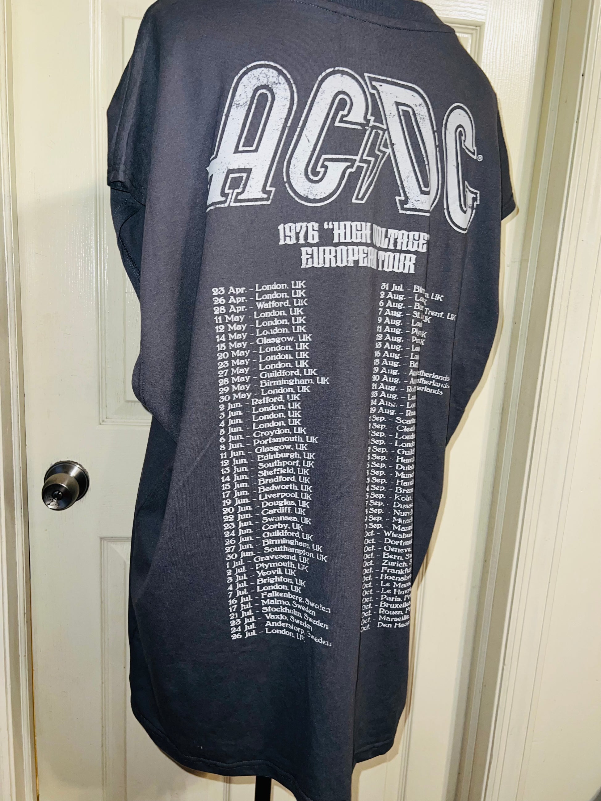 A grey AC/DC High Voltage European 1976 Tour double sided tank. The cities and tour dates on the back. Size XL, oversized.