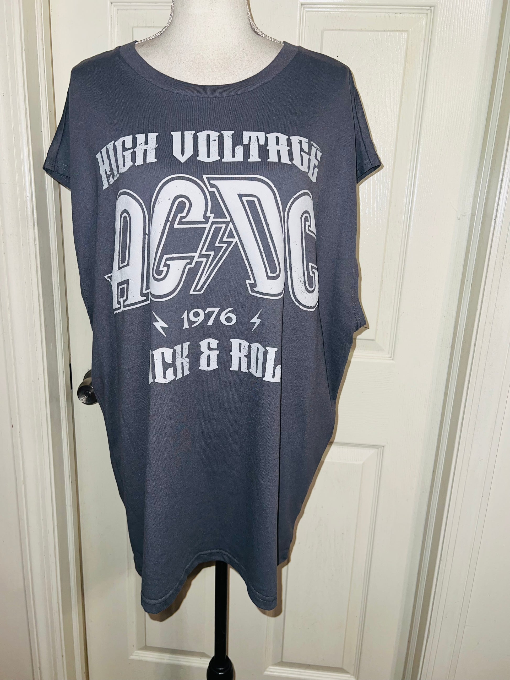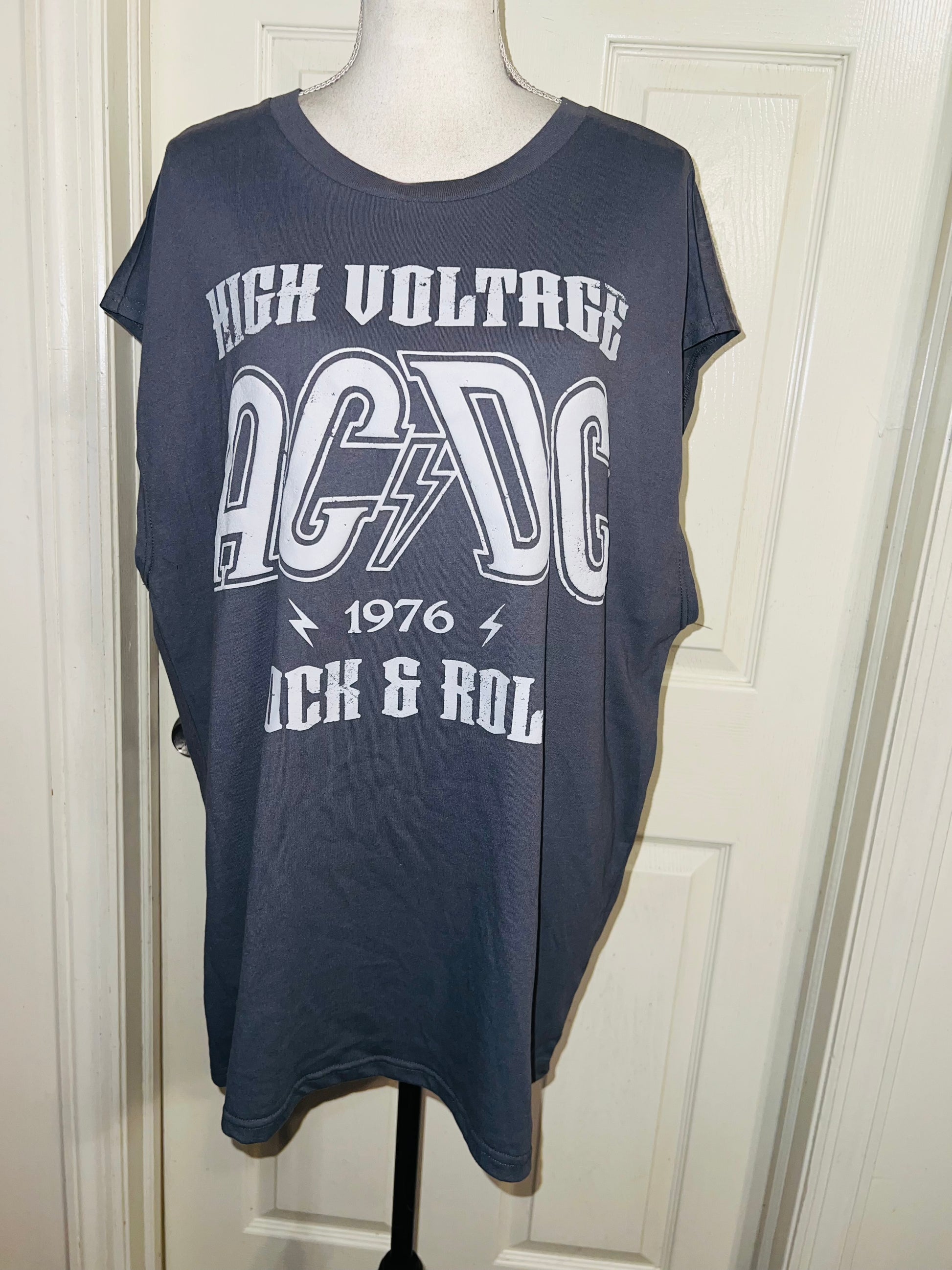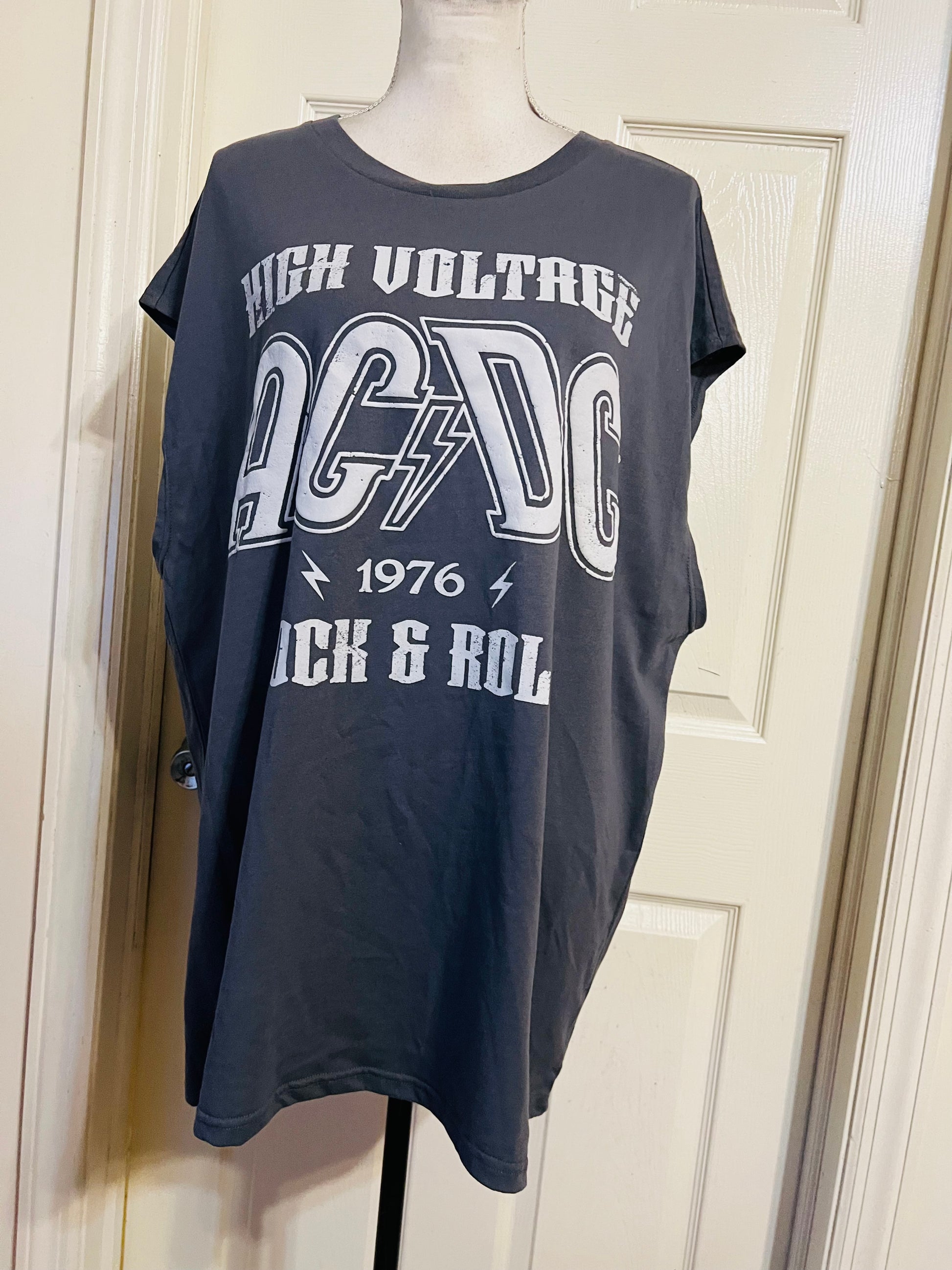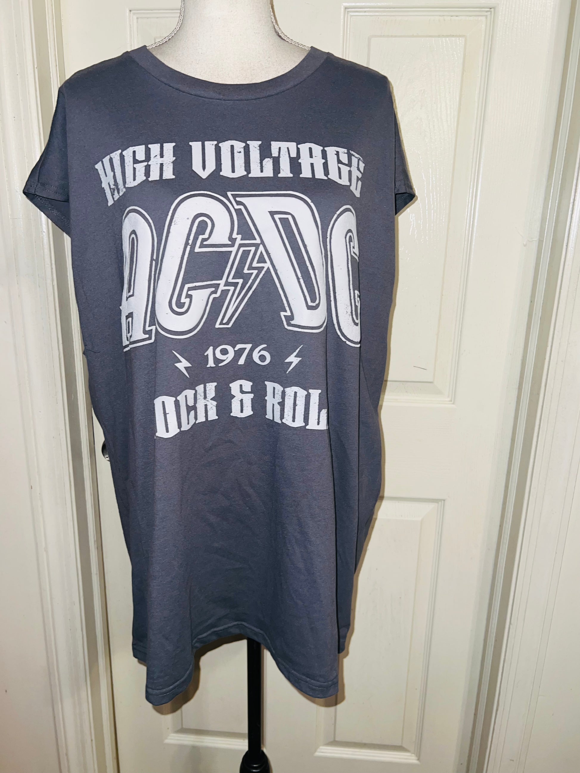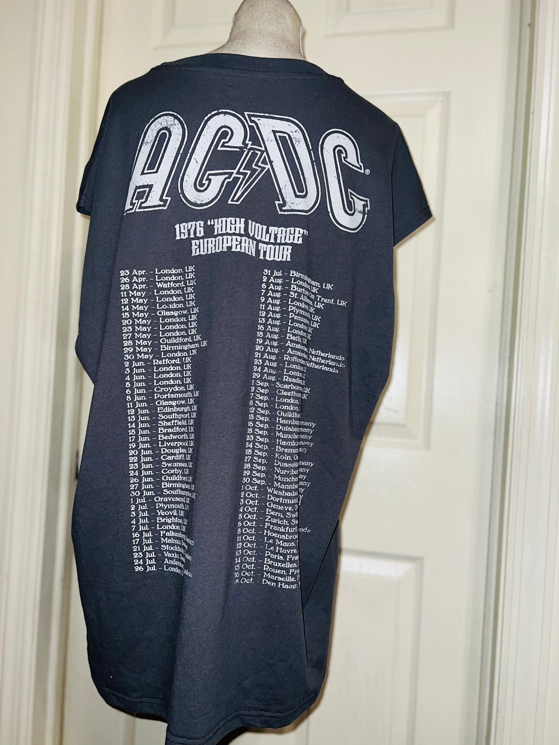 A grey AC/DC High Voltage European 1976 Tour double sided tank. The cities and tour dates on the back. Size XL, oversized.