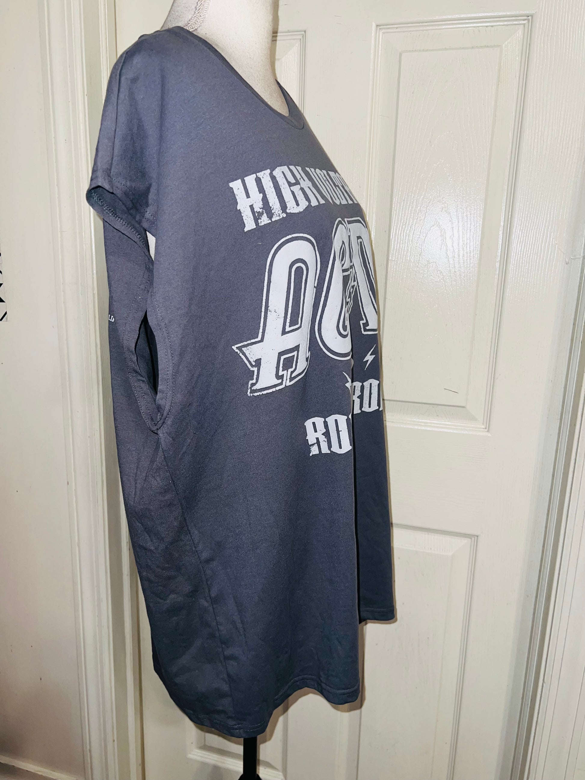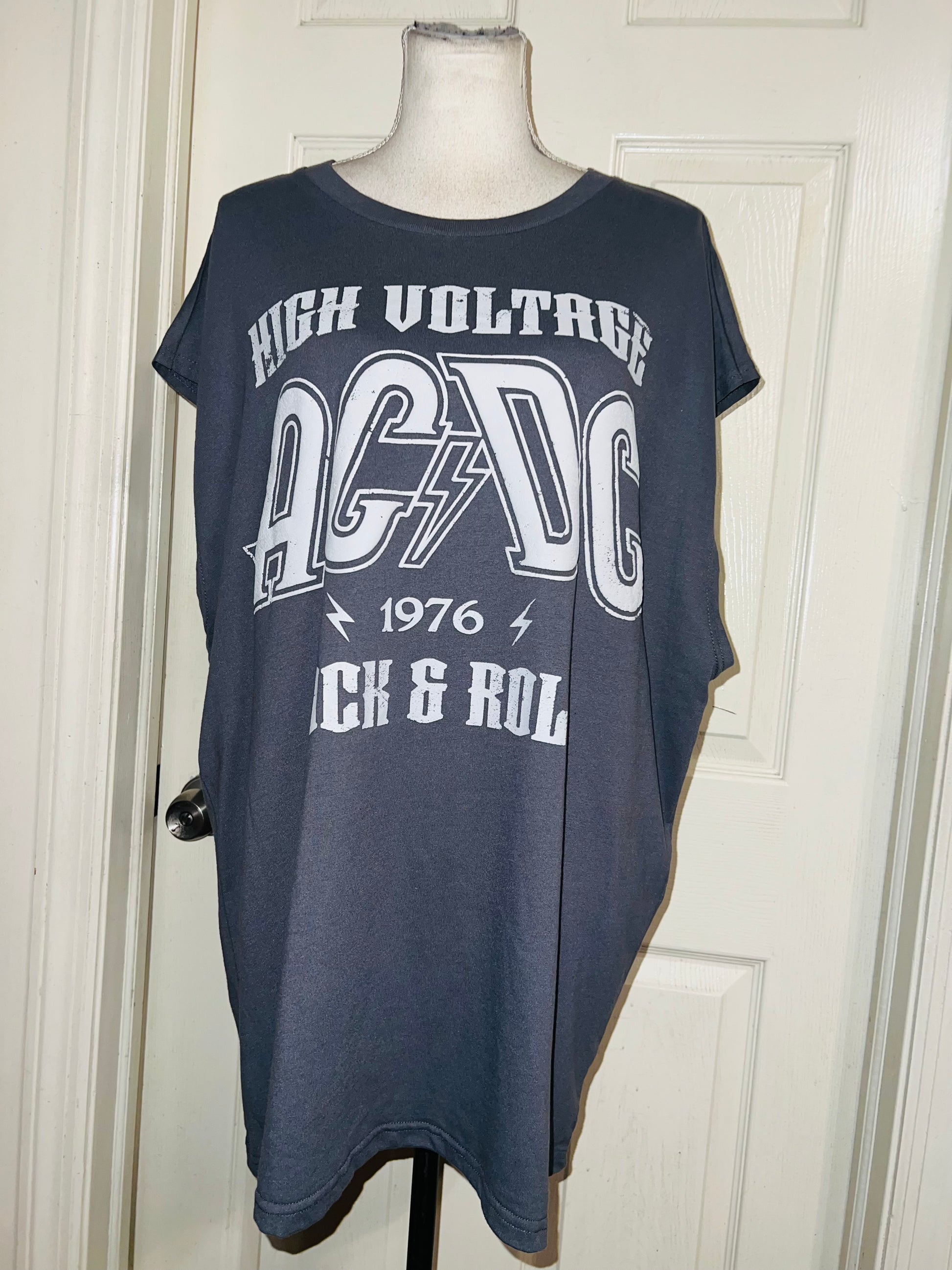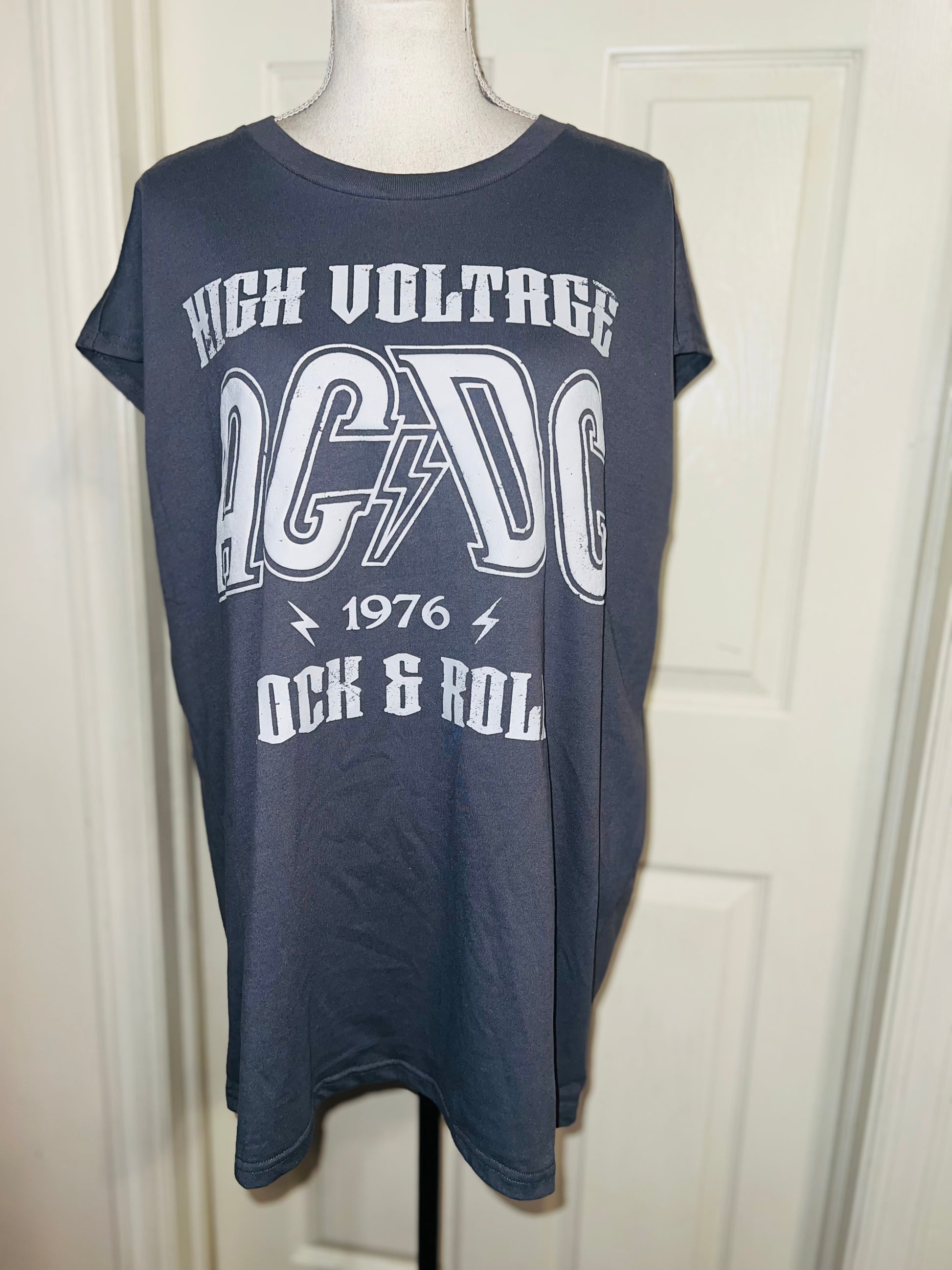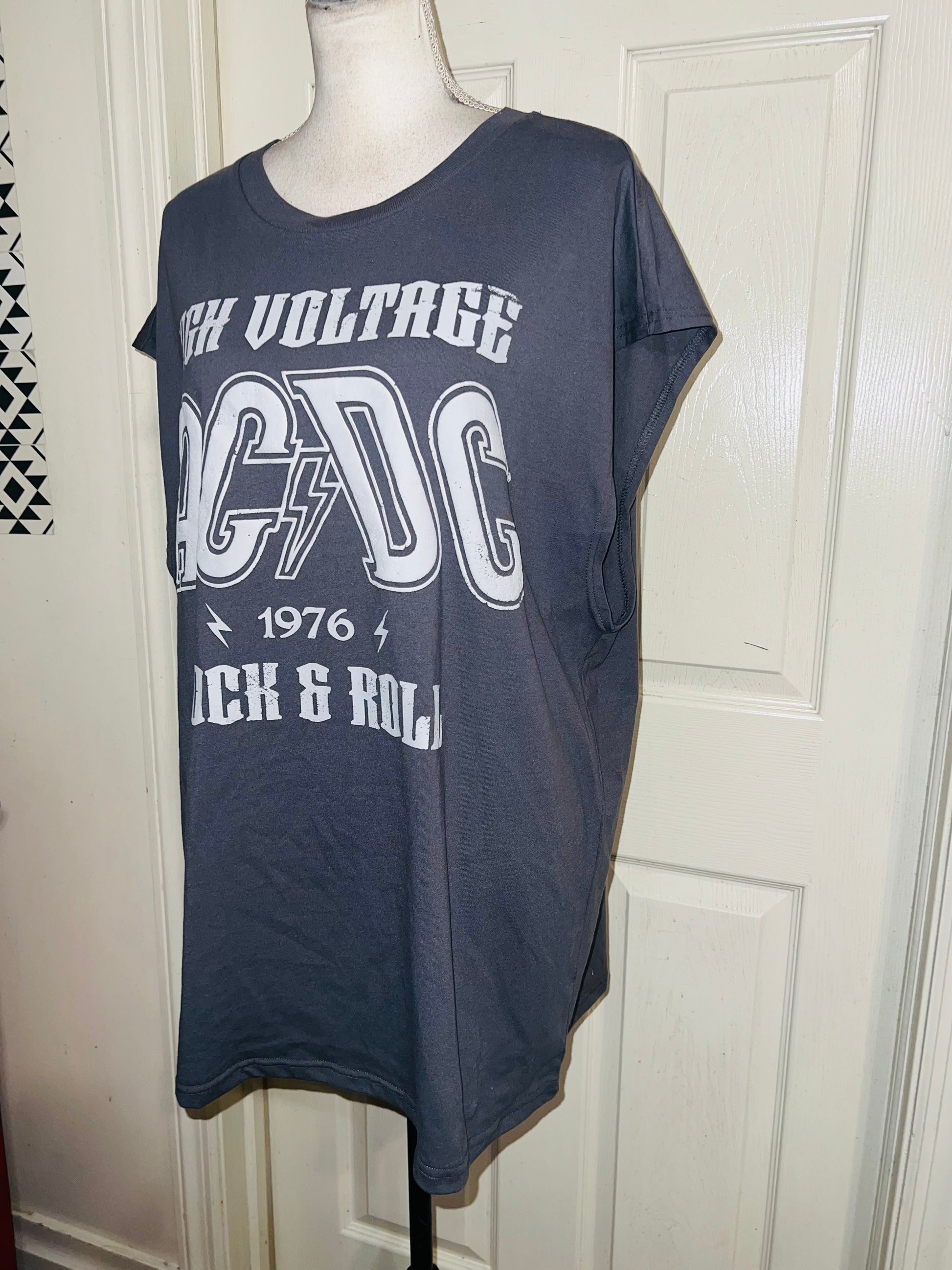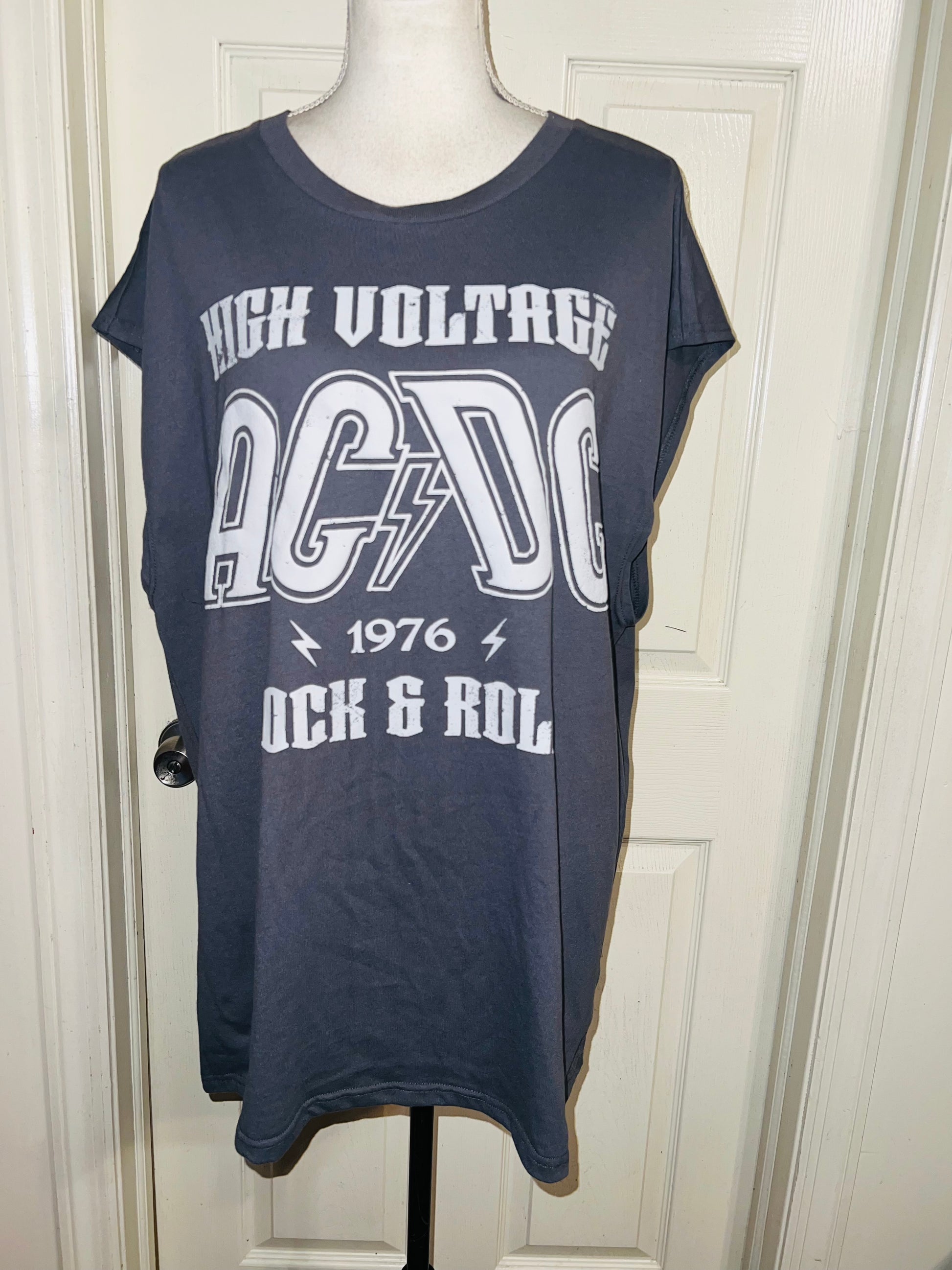 A grey AC/DC High Voltage European 1976 Tour double sided tank. The cities and tour dates on the back. Size XL, oversized.