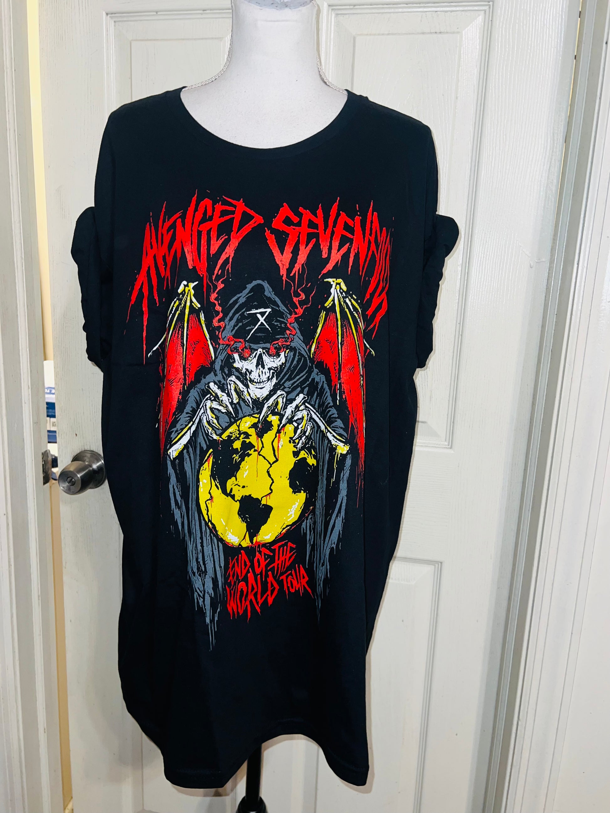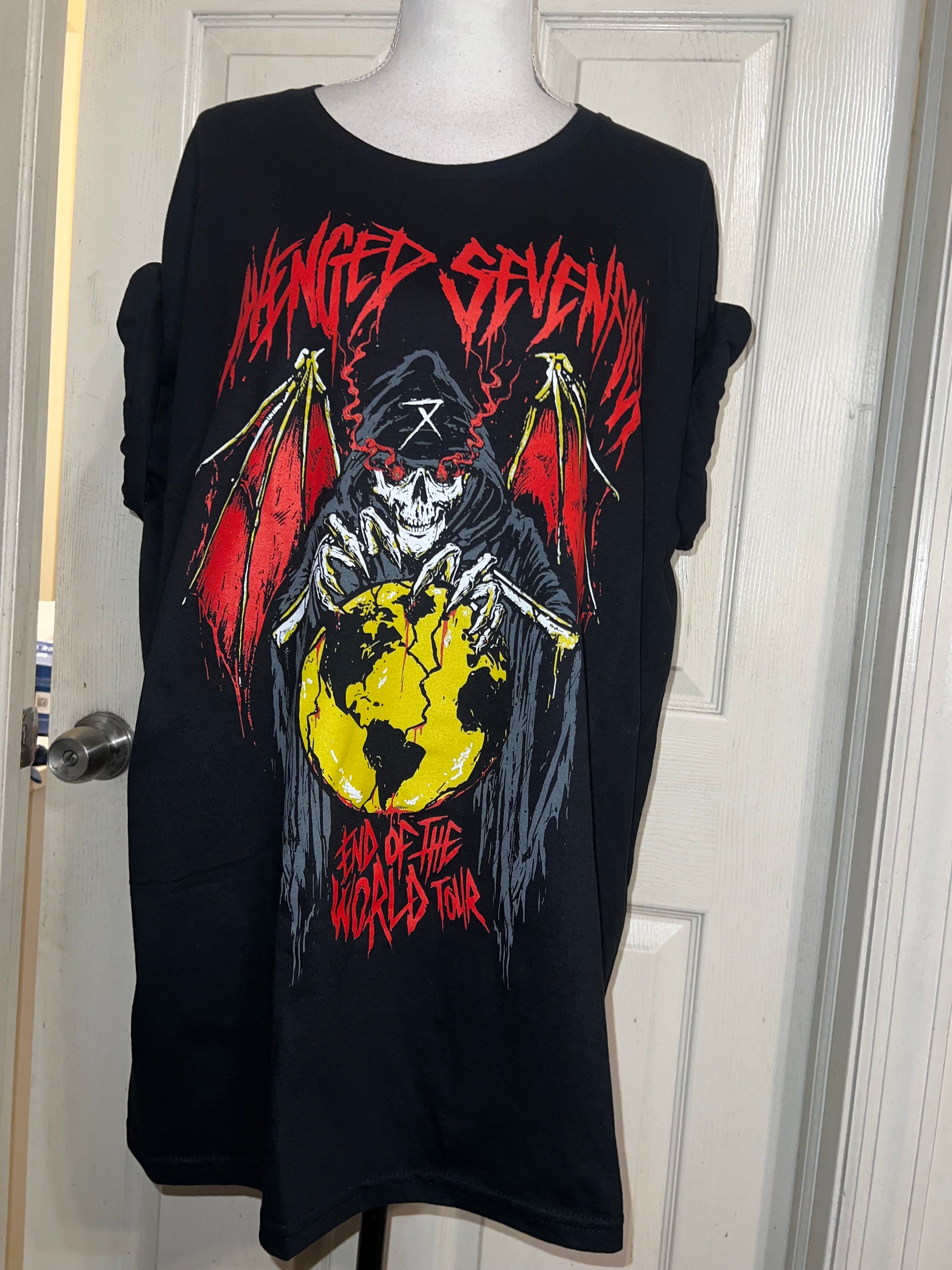 A black Avenged Sevenfold “End of the World Tour” tee with a cool graphic as usual for them! Size L, fits like an XL, oversized.