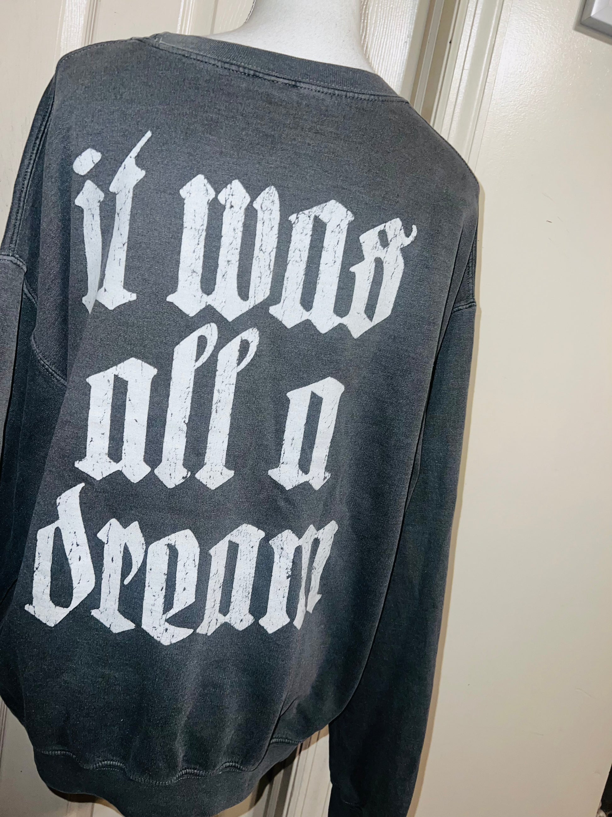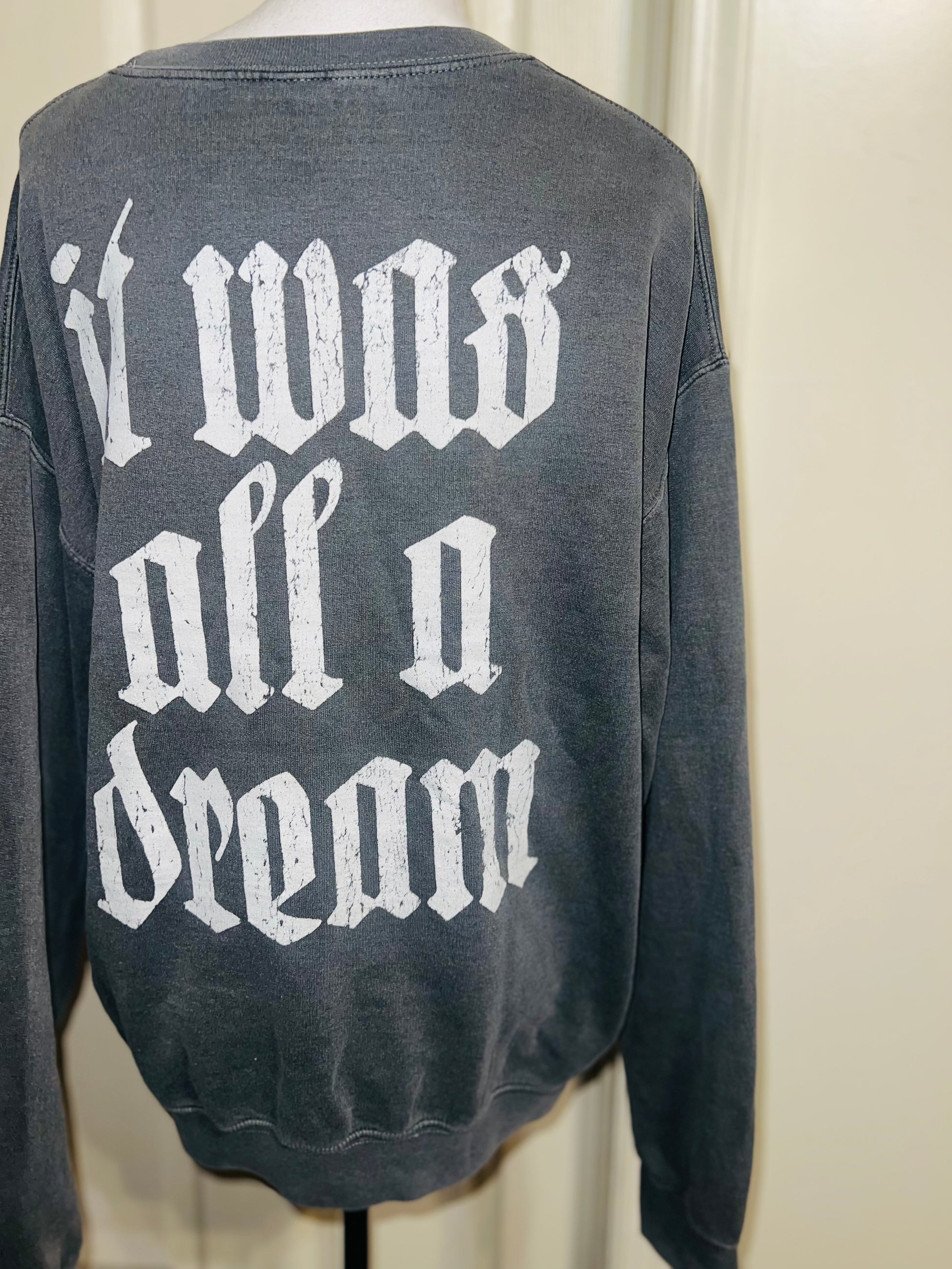 This is a preorder. A charcoal grey Notorious BIG double sided sweatshirt. It was all a dream on the back. Size medium, oversized like a M/L.