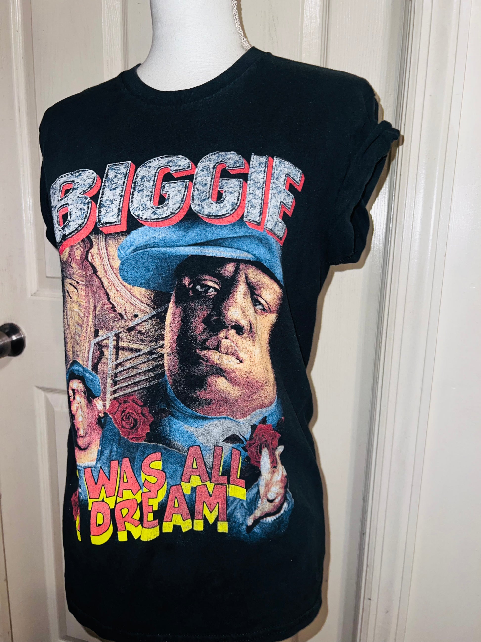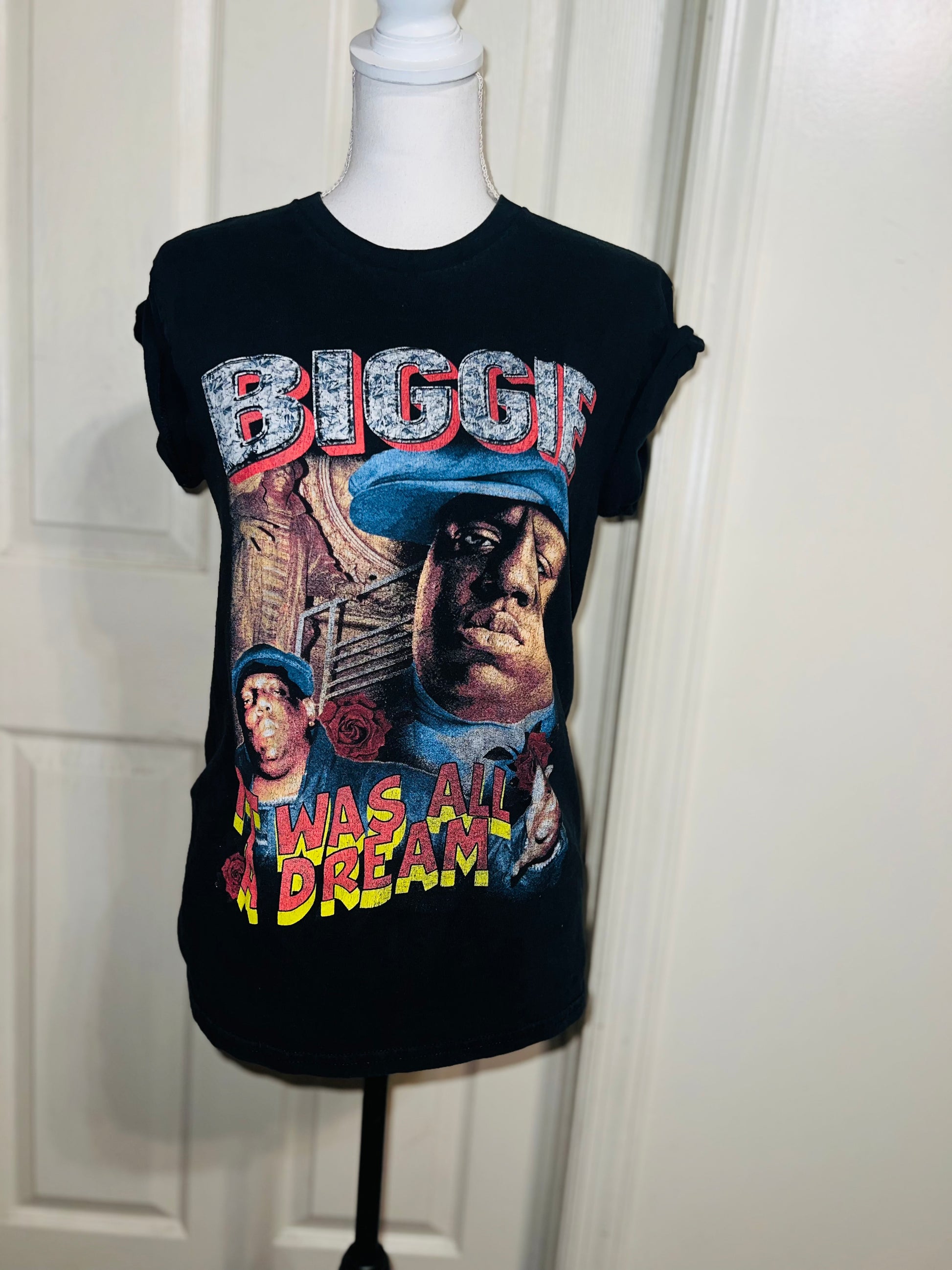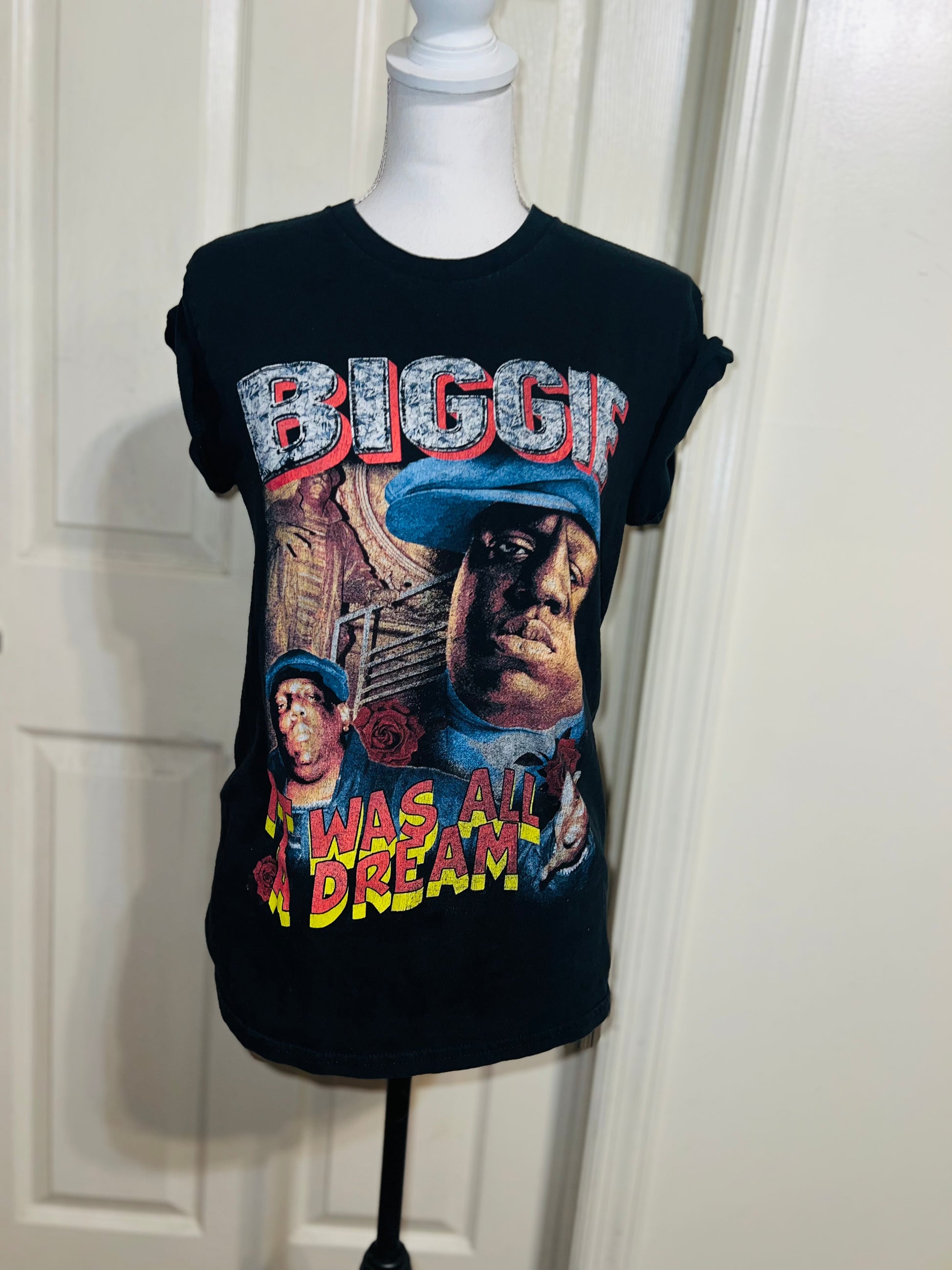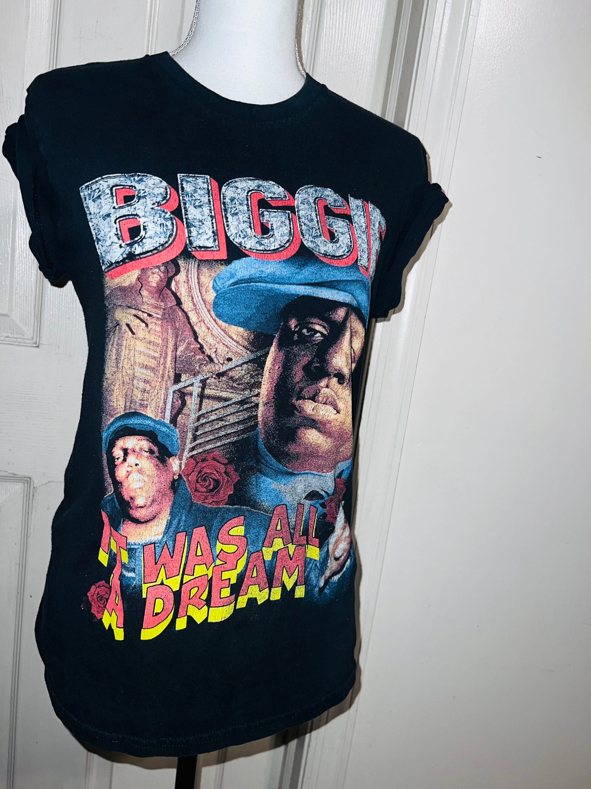 A black Biggie tee with “it was all a dream” on the front. Doesn’t have a size marked since it was from a vintage store, but I’d say it was a :’al.