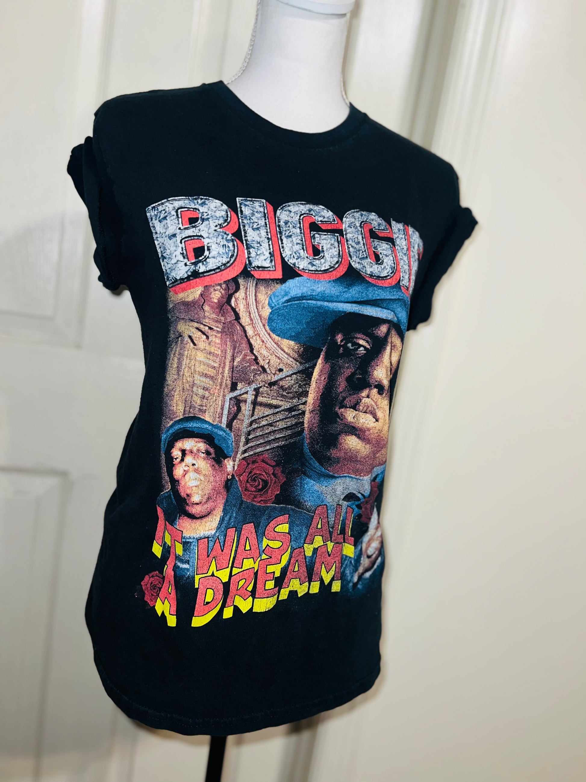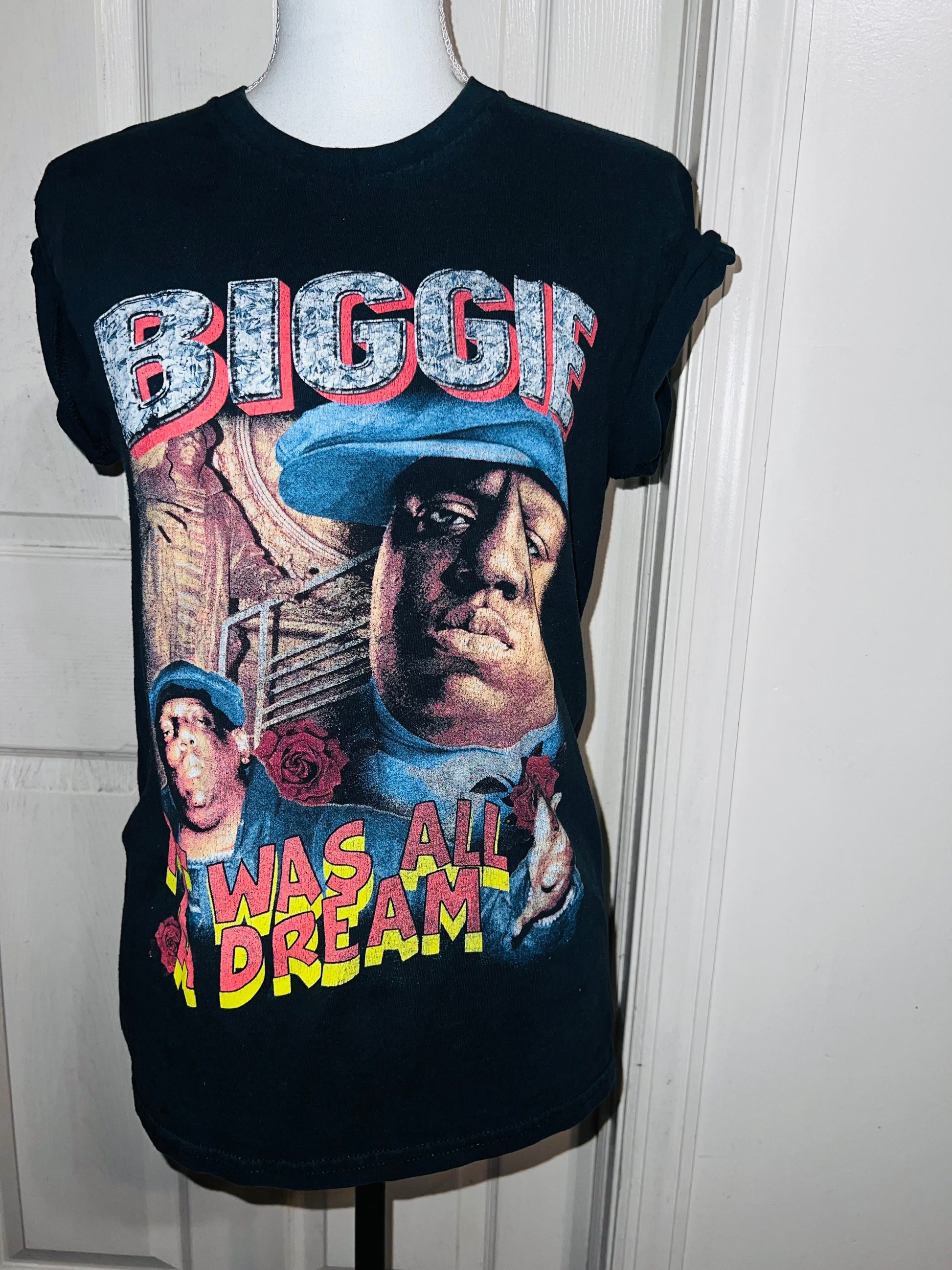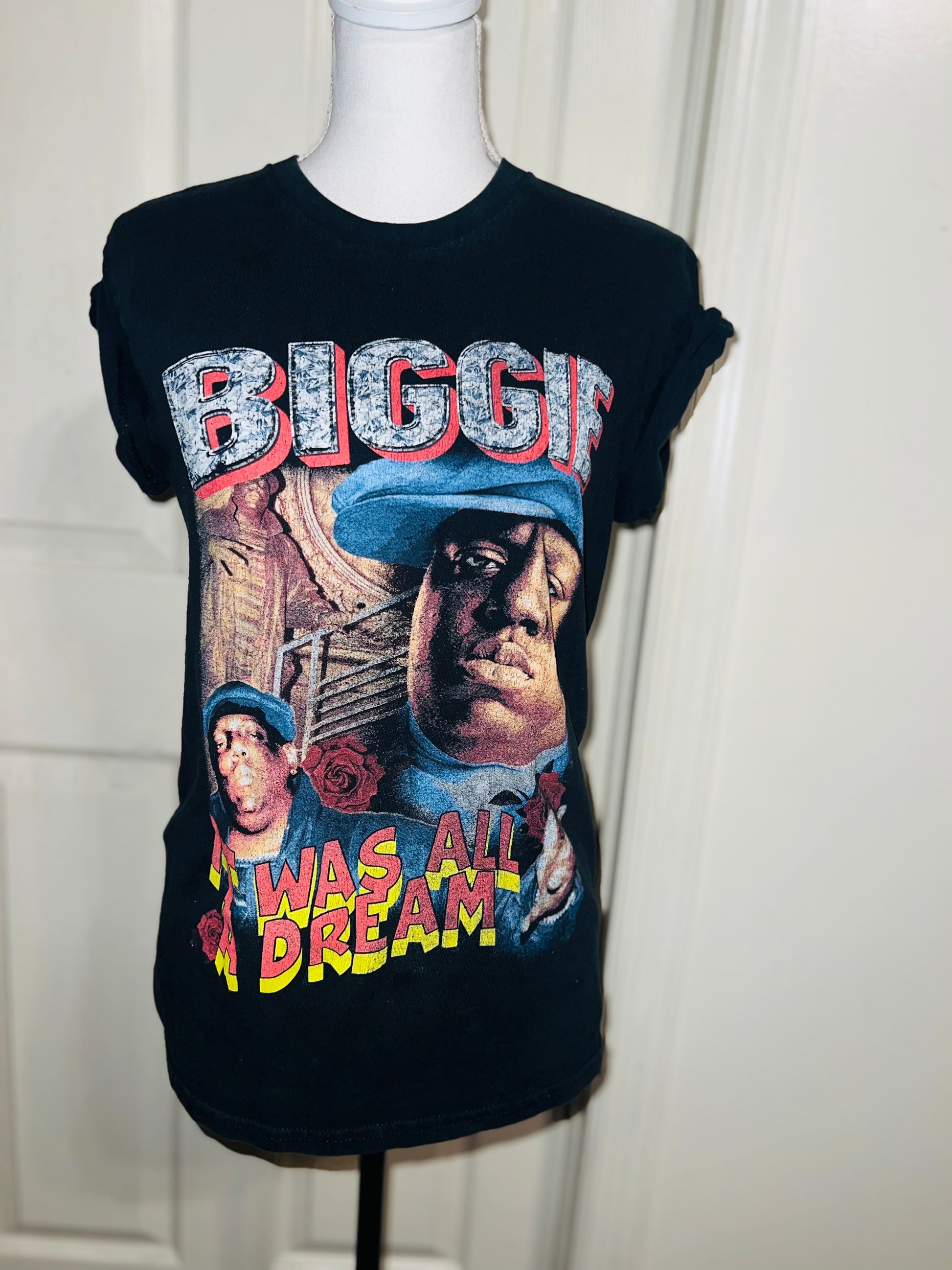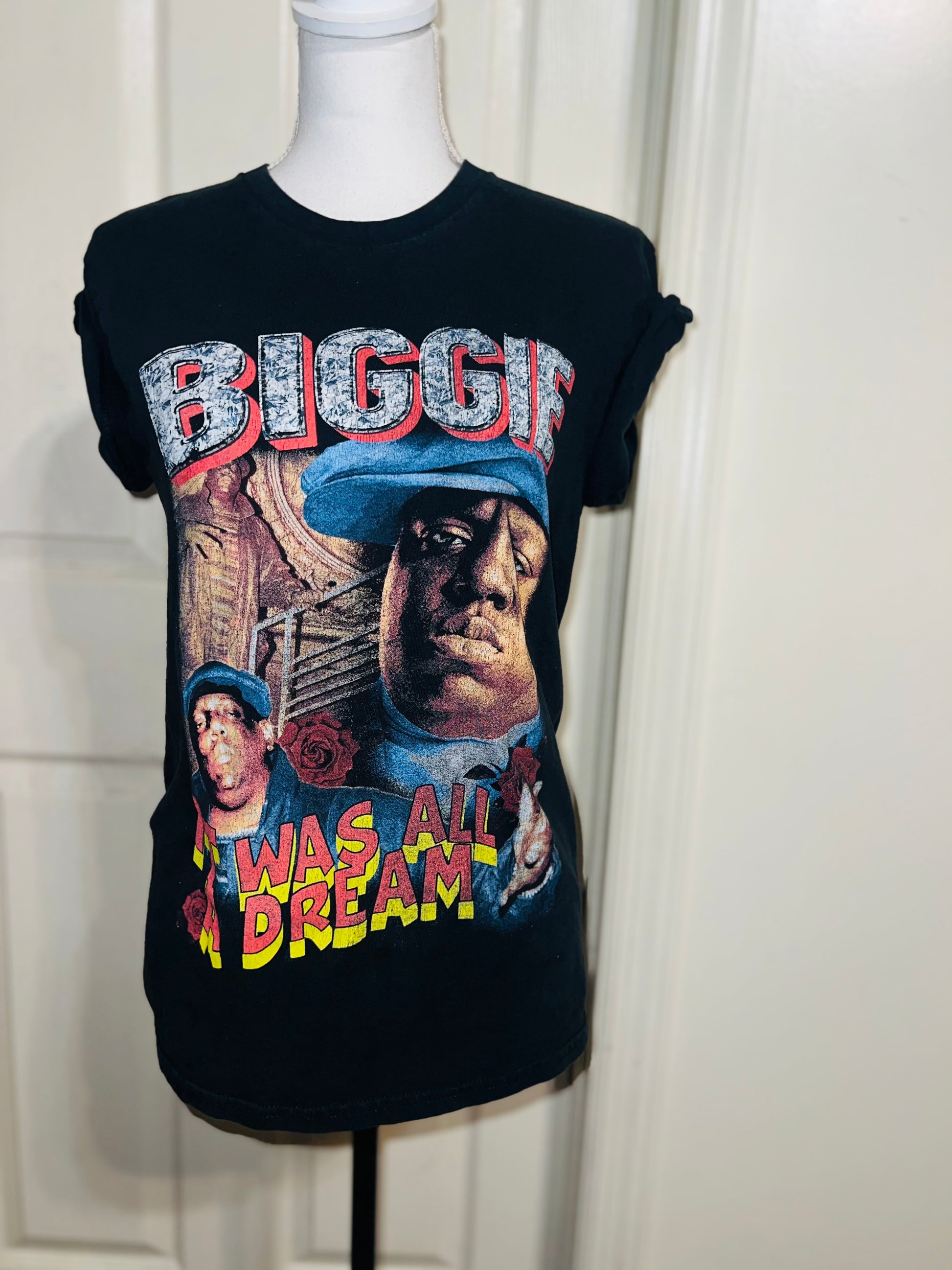 A black Biggie tee with “it was all a dream” on the front. Doesn’t have a size marked since it was from a vintage store, but I’d say it was a :’al.