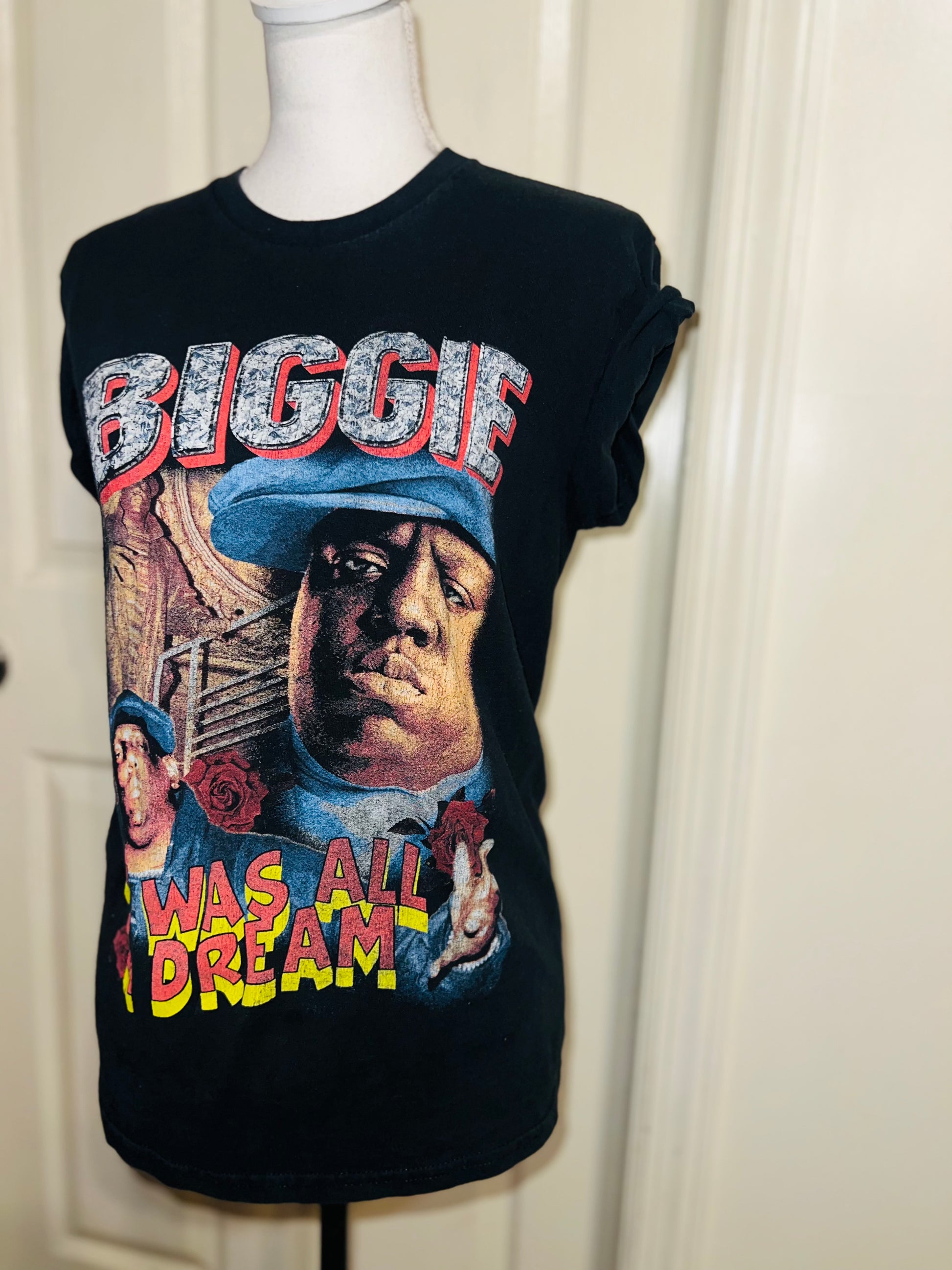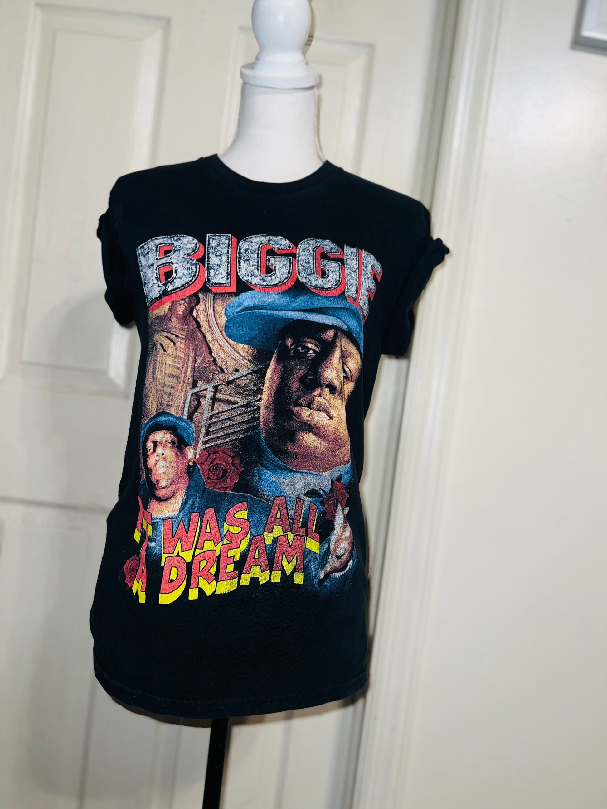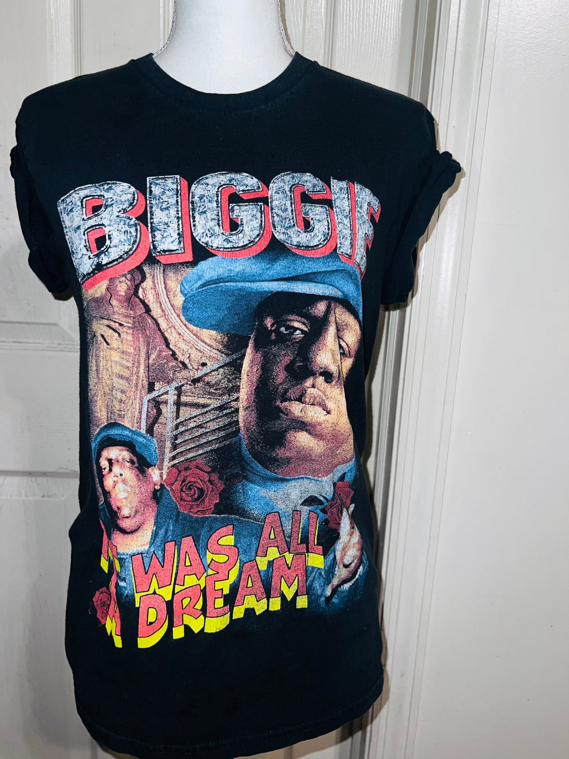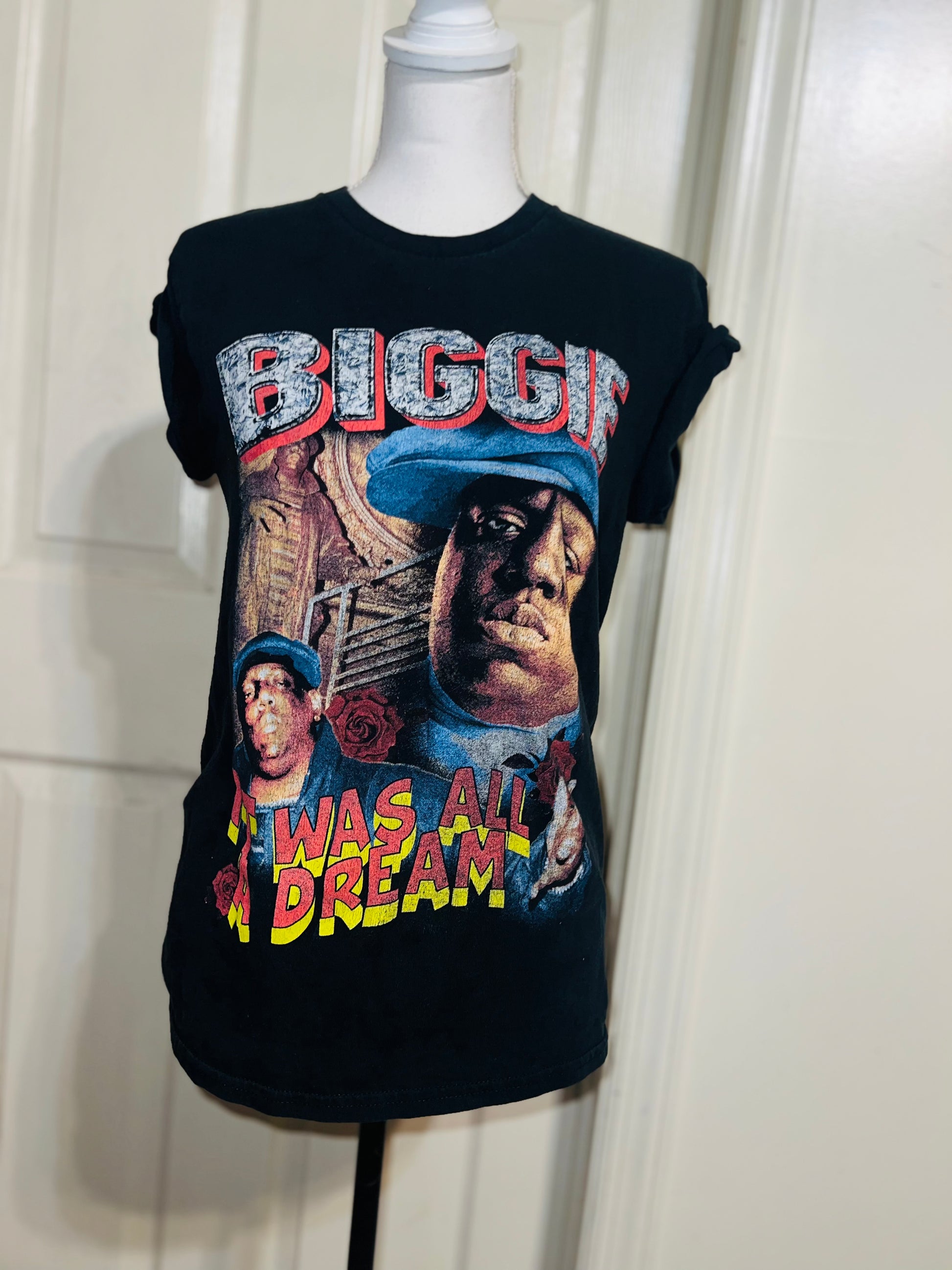 A black Biggie tee with “it was all a dream” on the front. Doesn’t have a size marked since it was from a vintage store, but I’d say it was a :’al.