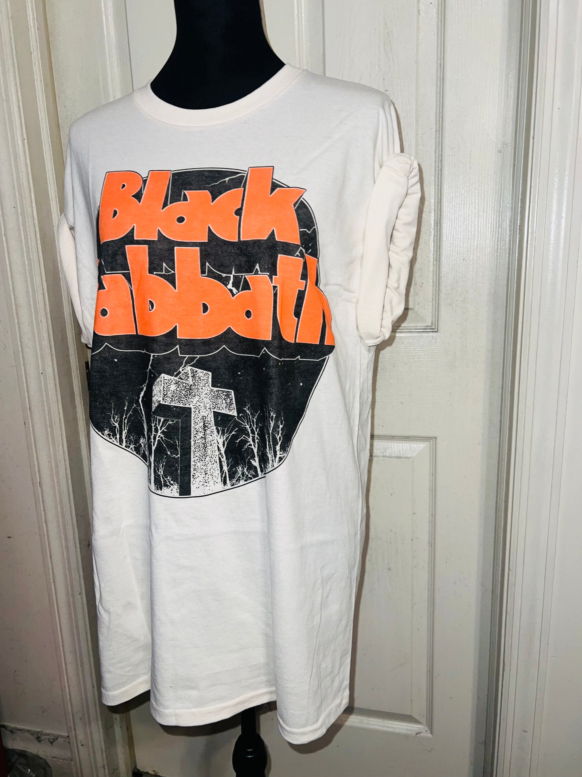 This is now a preorder. Please allow extra processing time. A white Black Sabbath tee with orange writing with a cool graphic and a cross in the woods. I love this one- my style! Size L/XL, oversized.