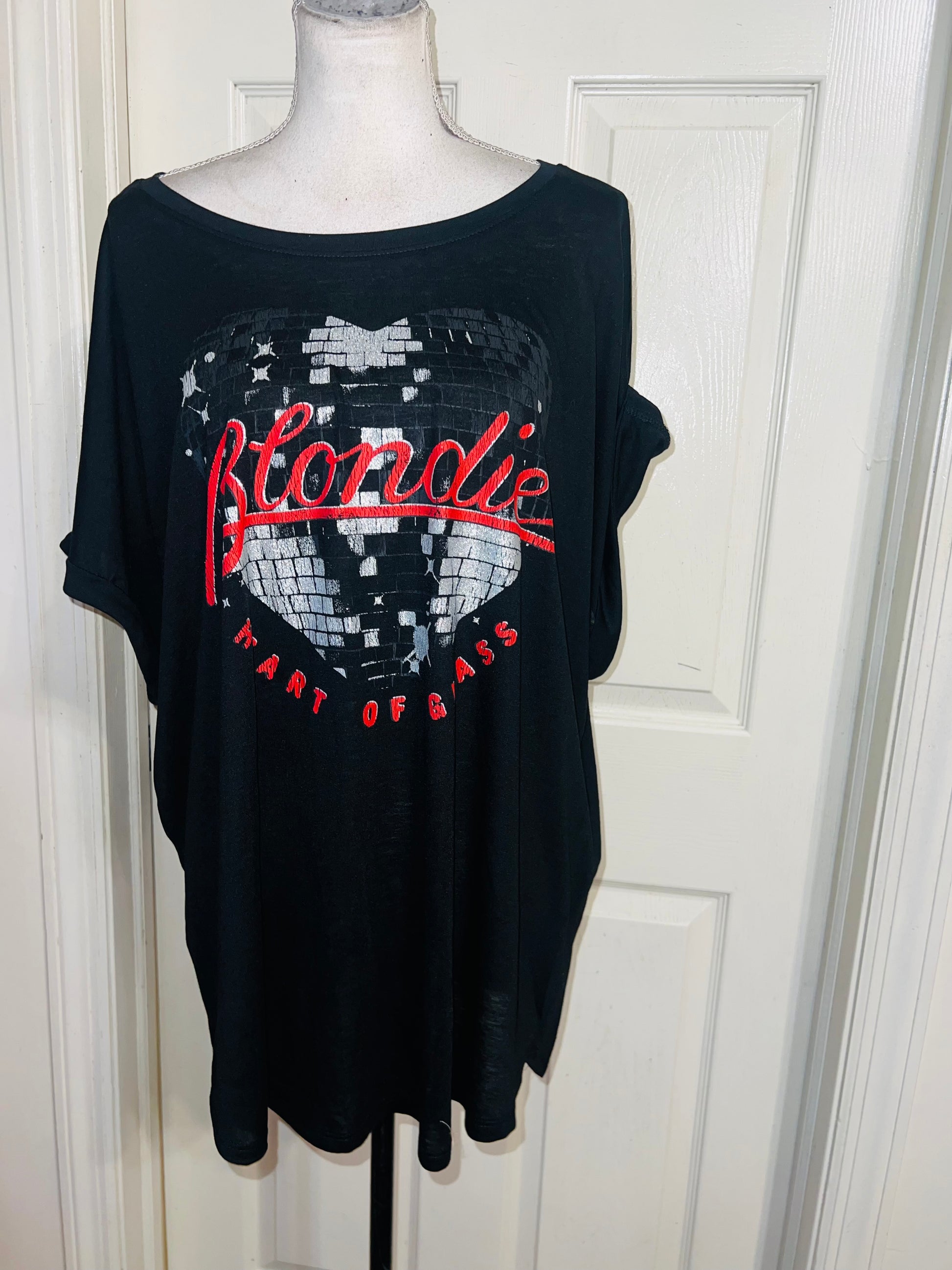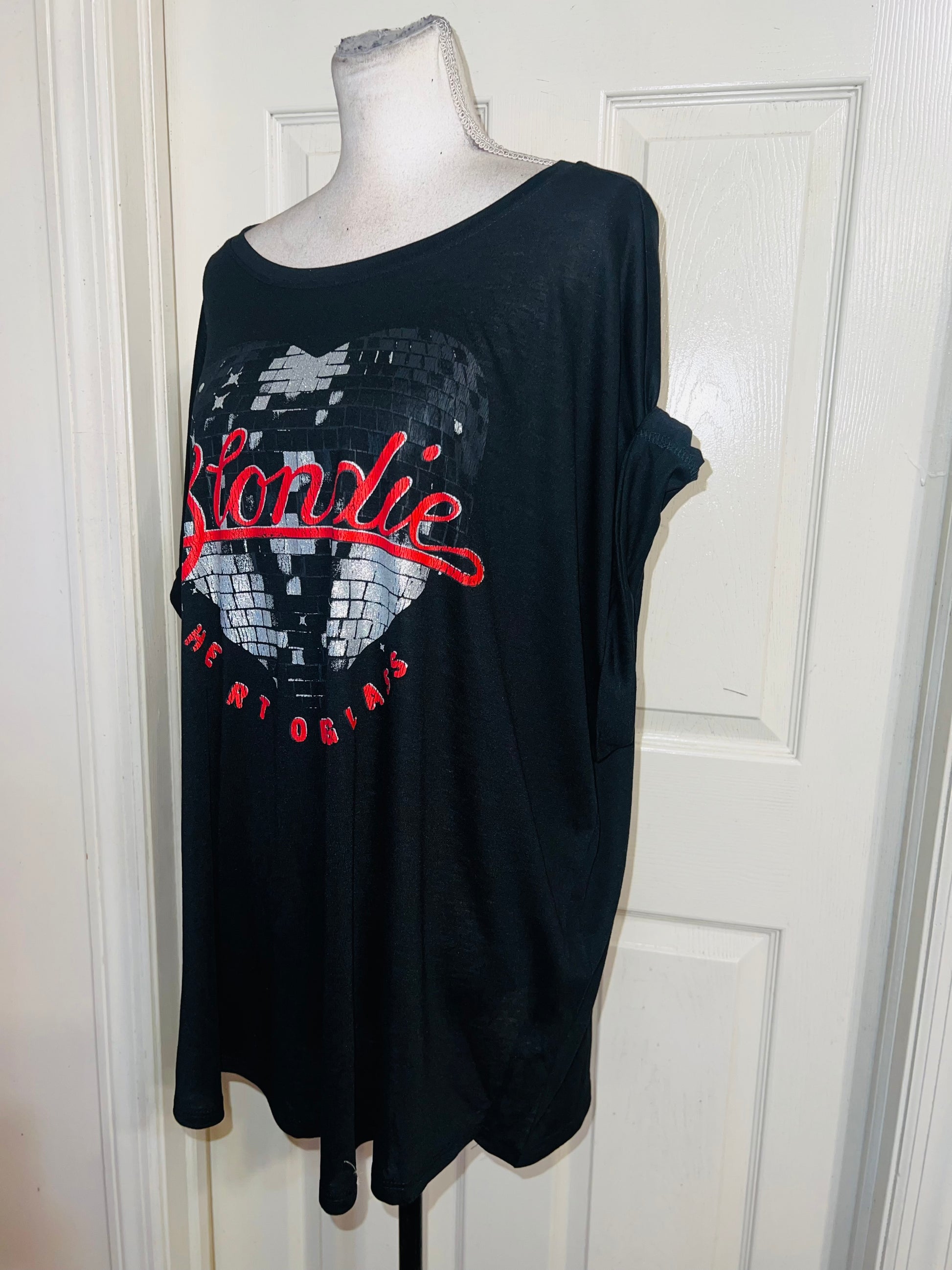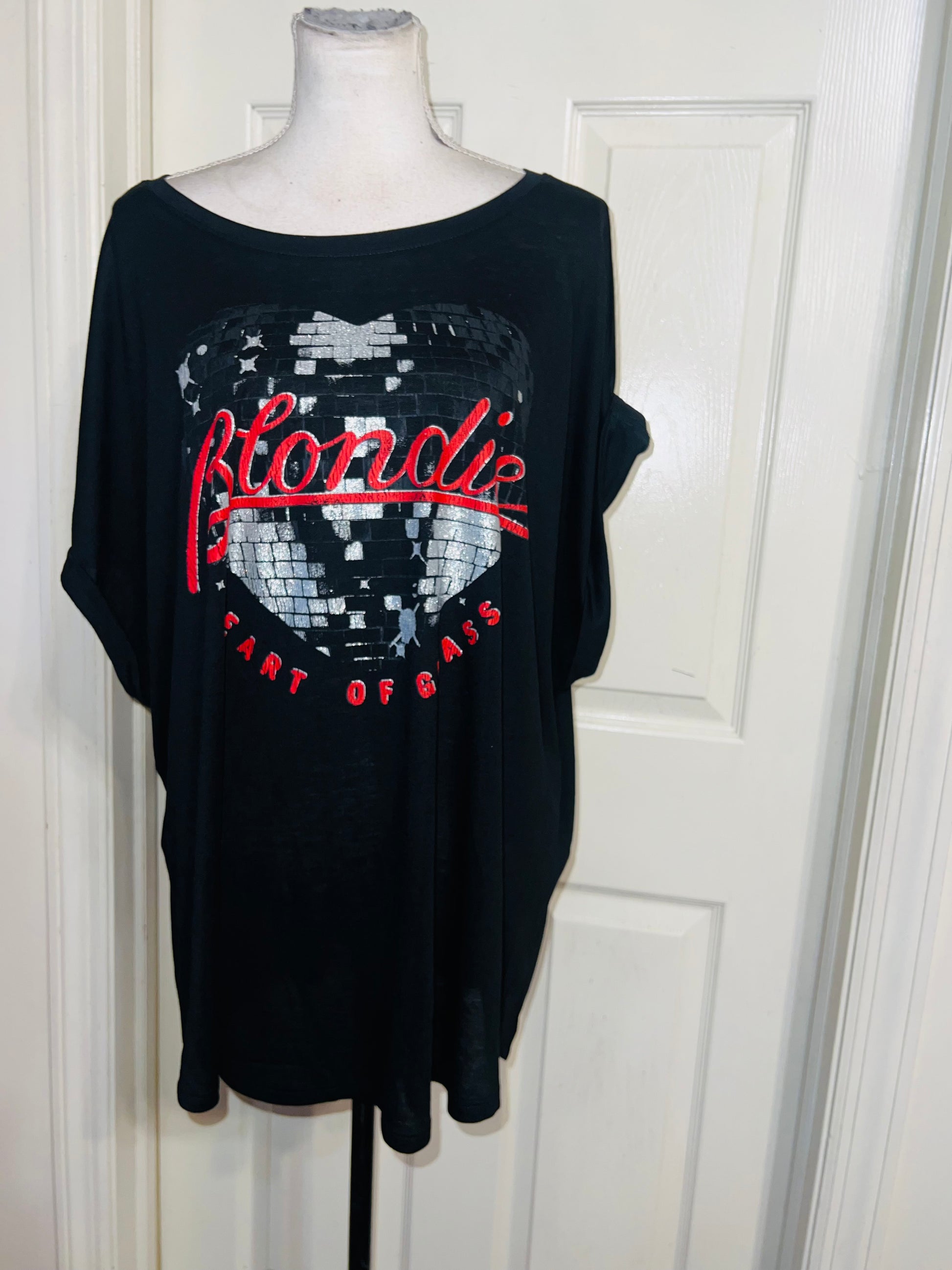 A black Blondie “Heart of Glass” tee with a sparkly detail on the graphic. Size XXL, fits like an XL, but still an oversized fir.