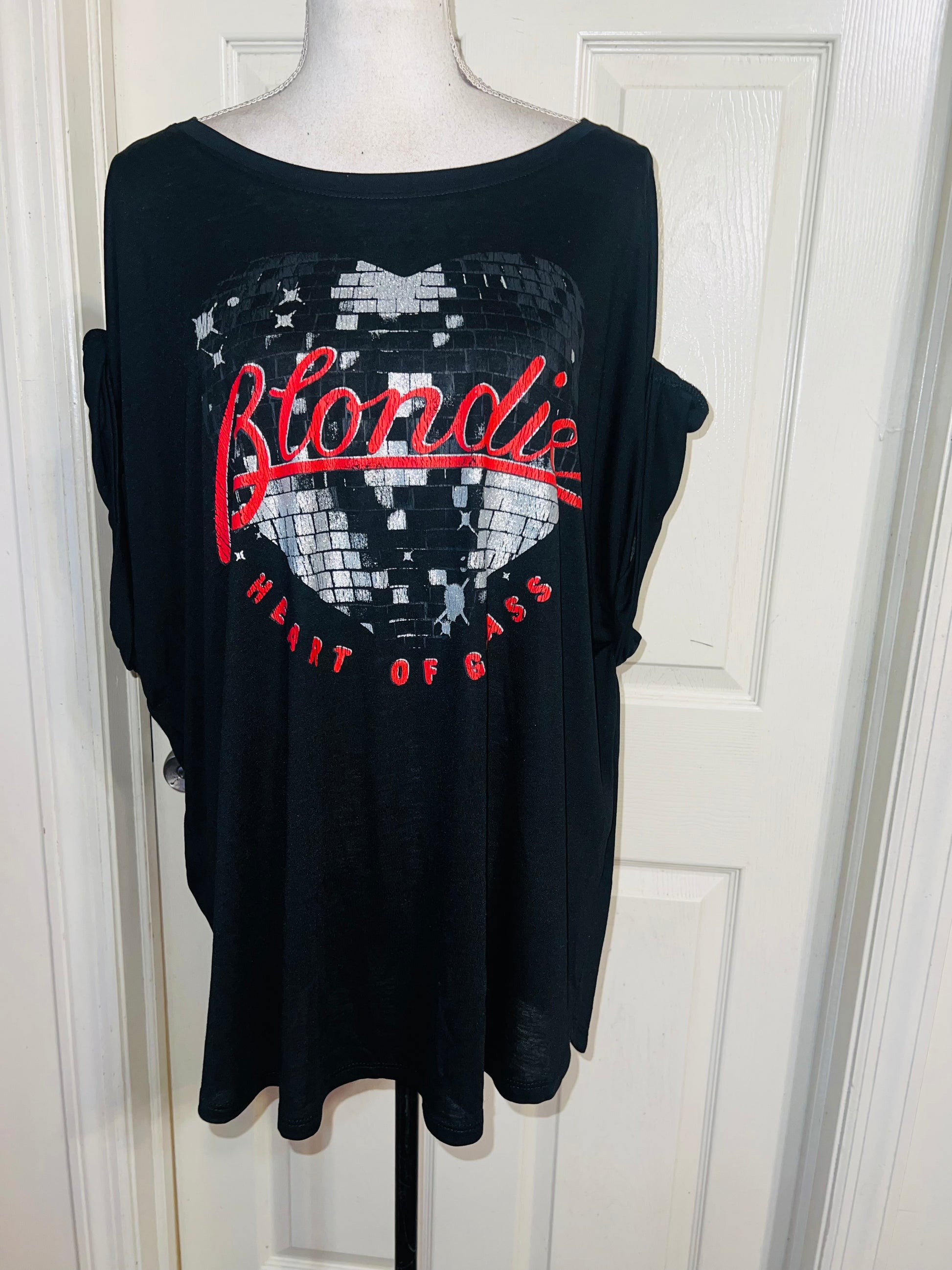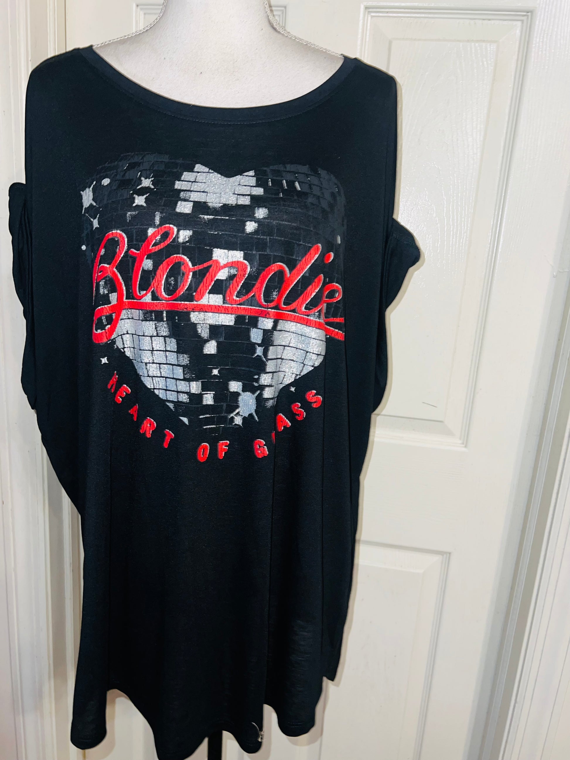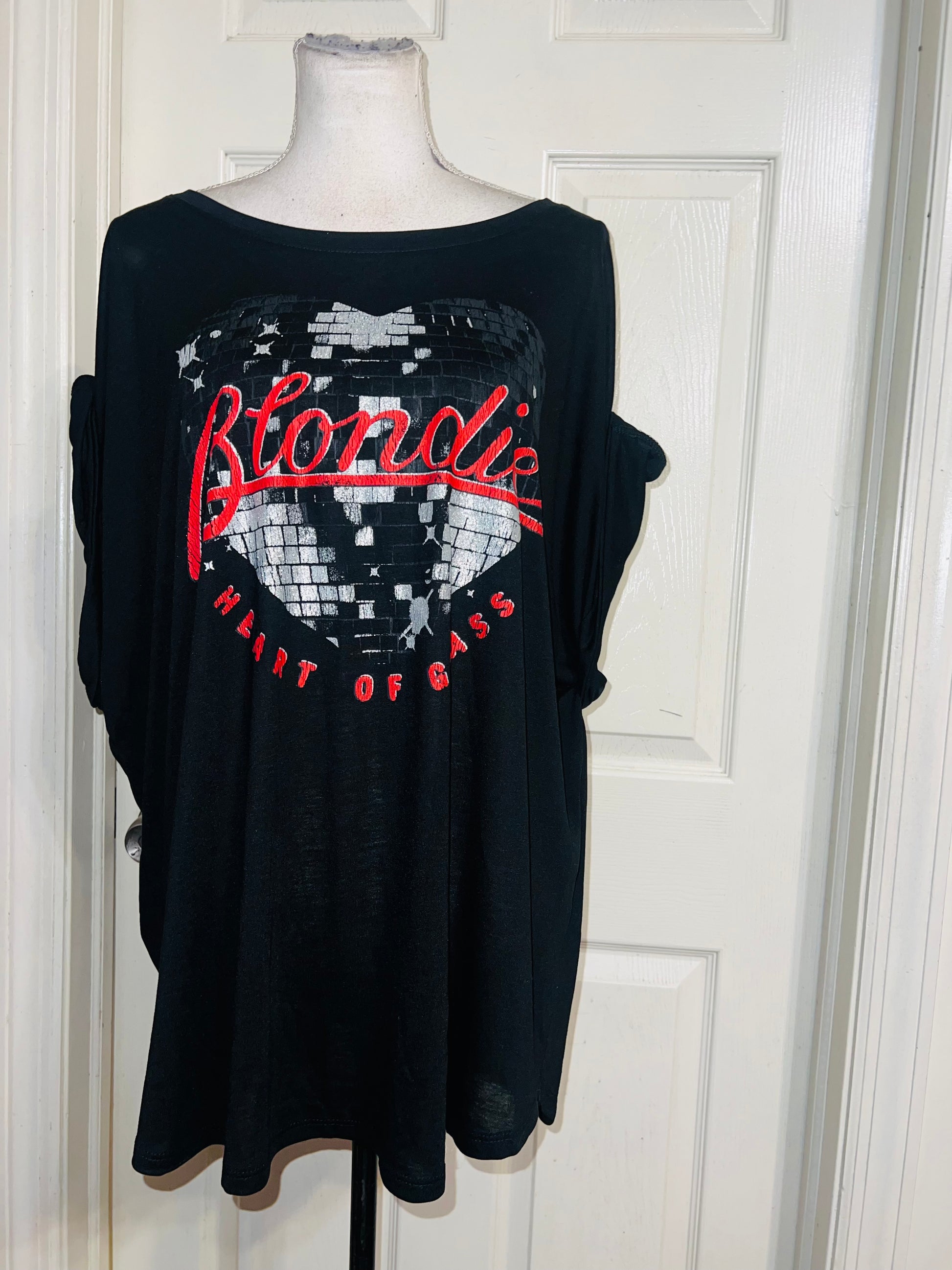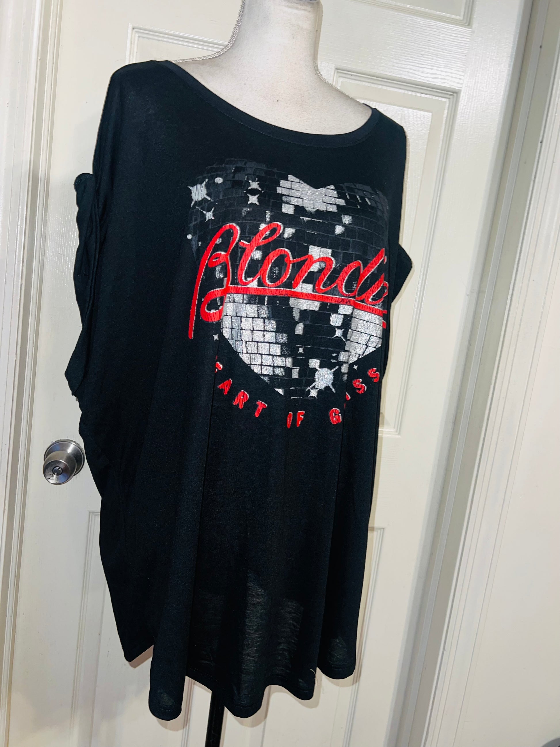 A black Blondie “Heart of Glass” tee with a sparkly detail on the graphic. Size XXL, fits like an XL, but still an oversized fir.