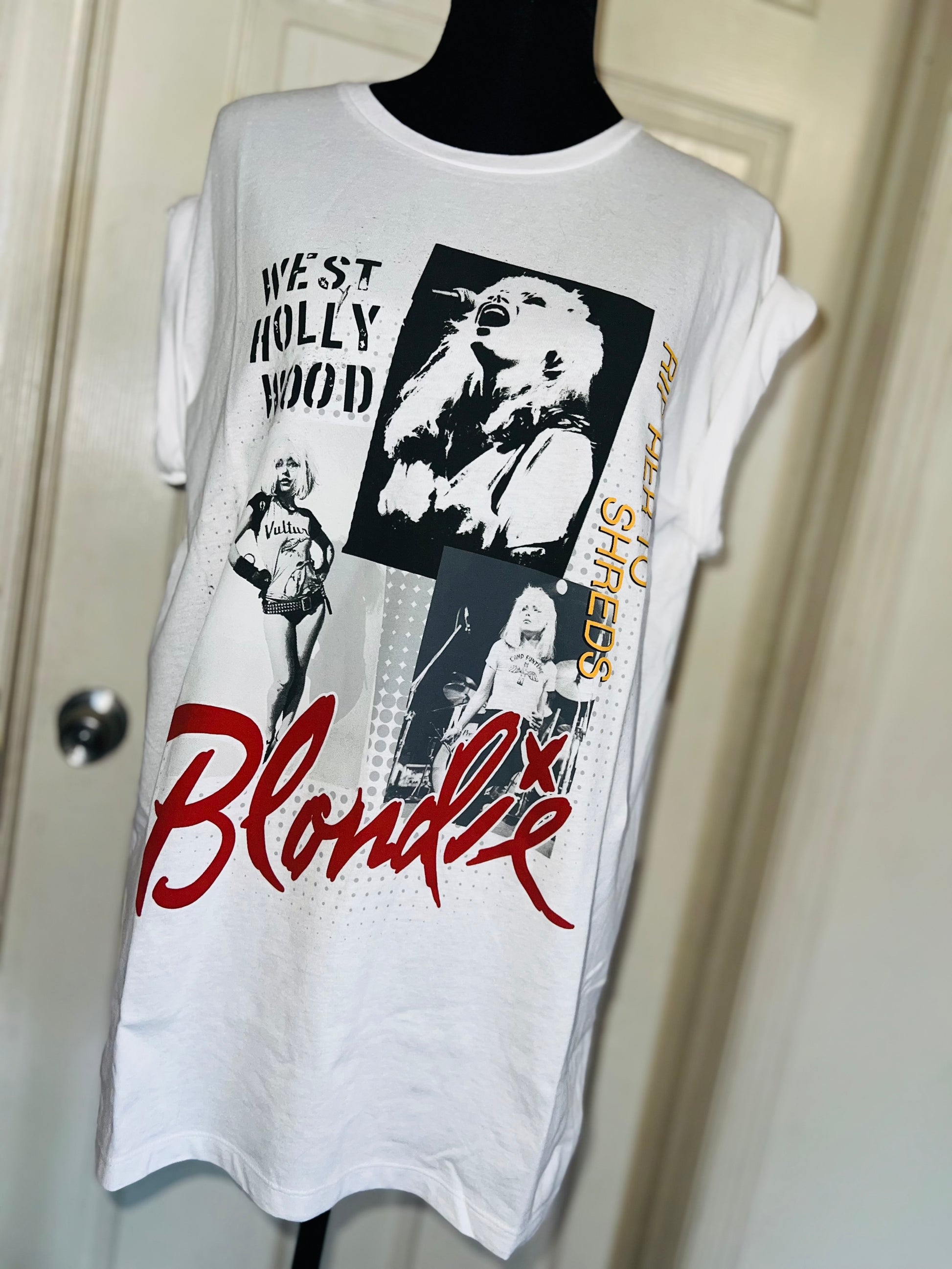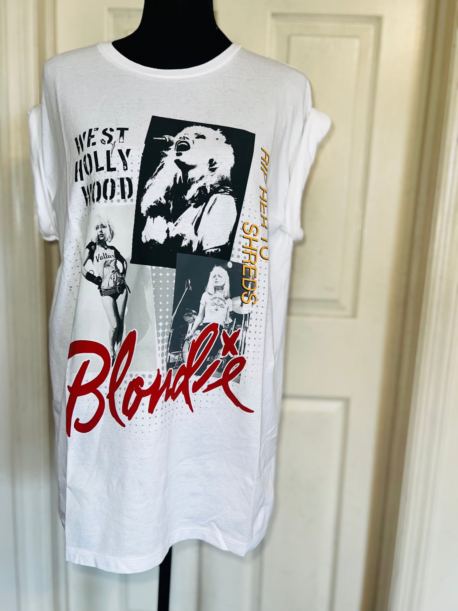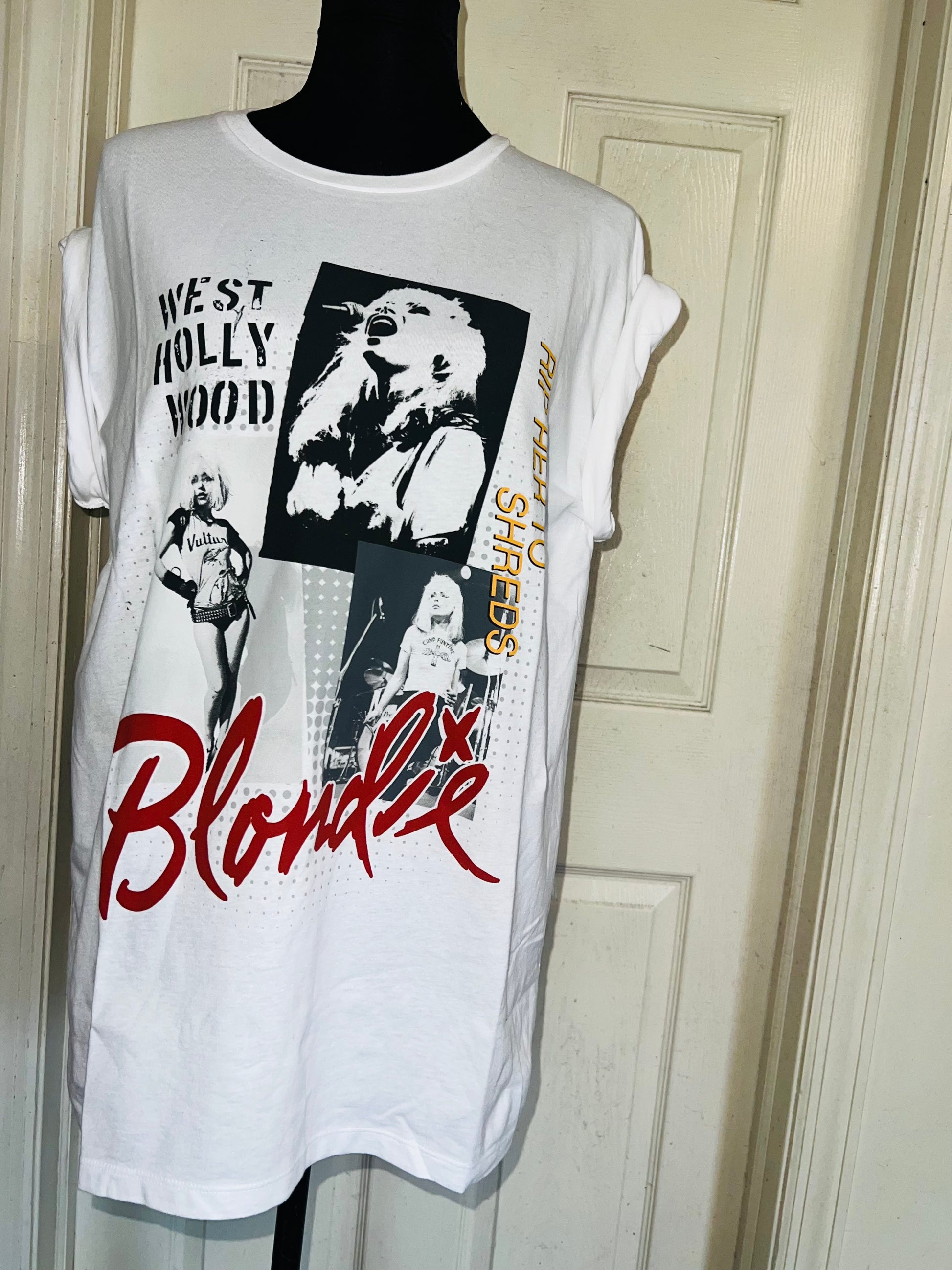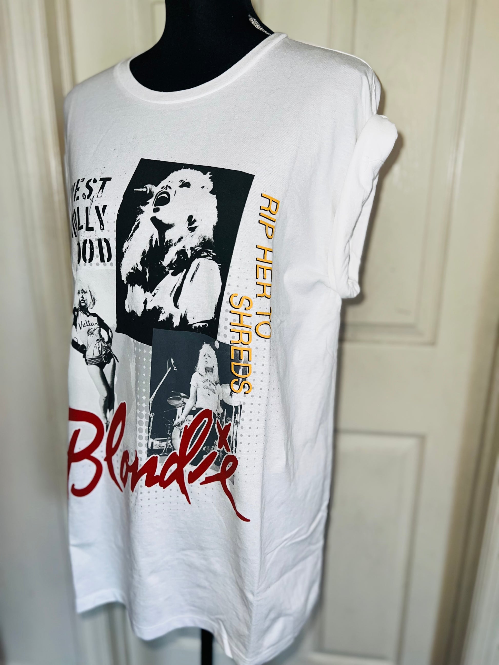 This is now a preorder. A white Blondie West Hollywood tee with “Rip Her To Shreds” on the graphic. Size XL, oversized.