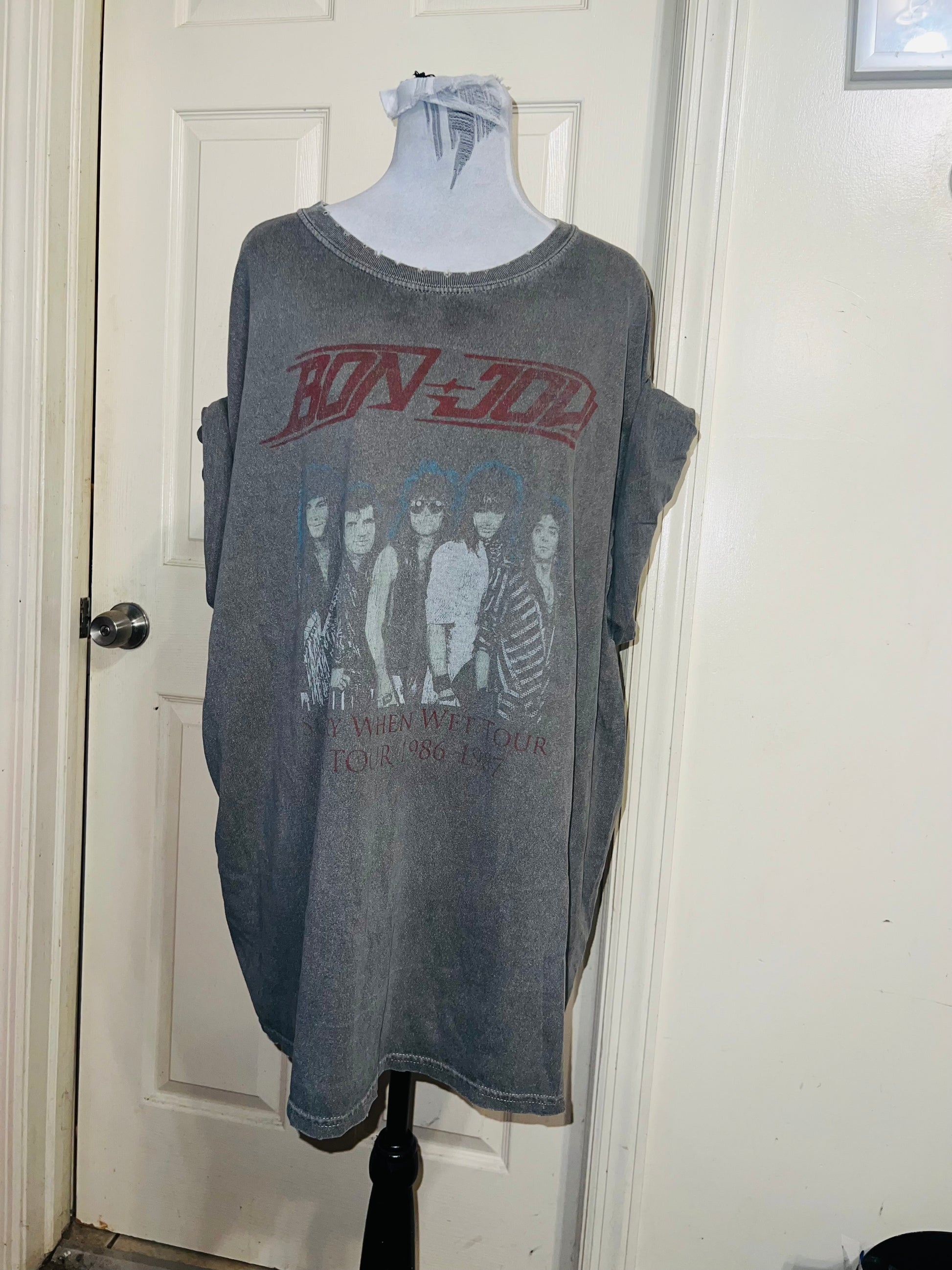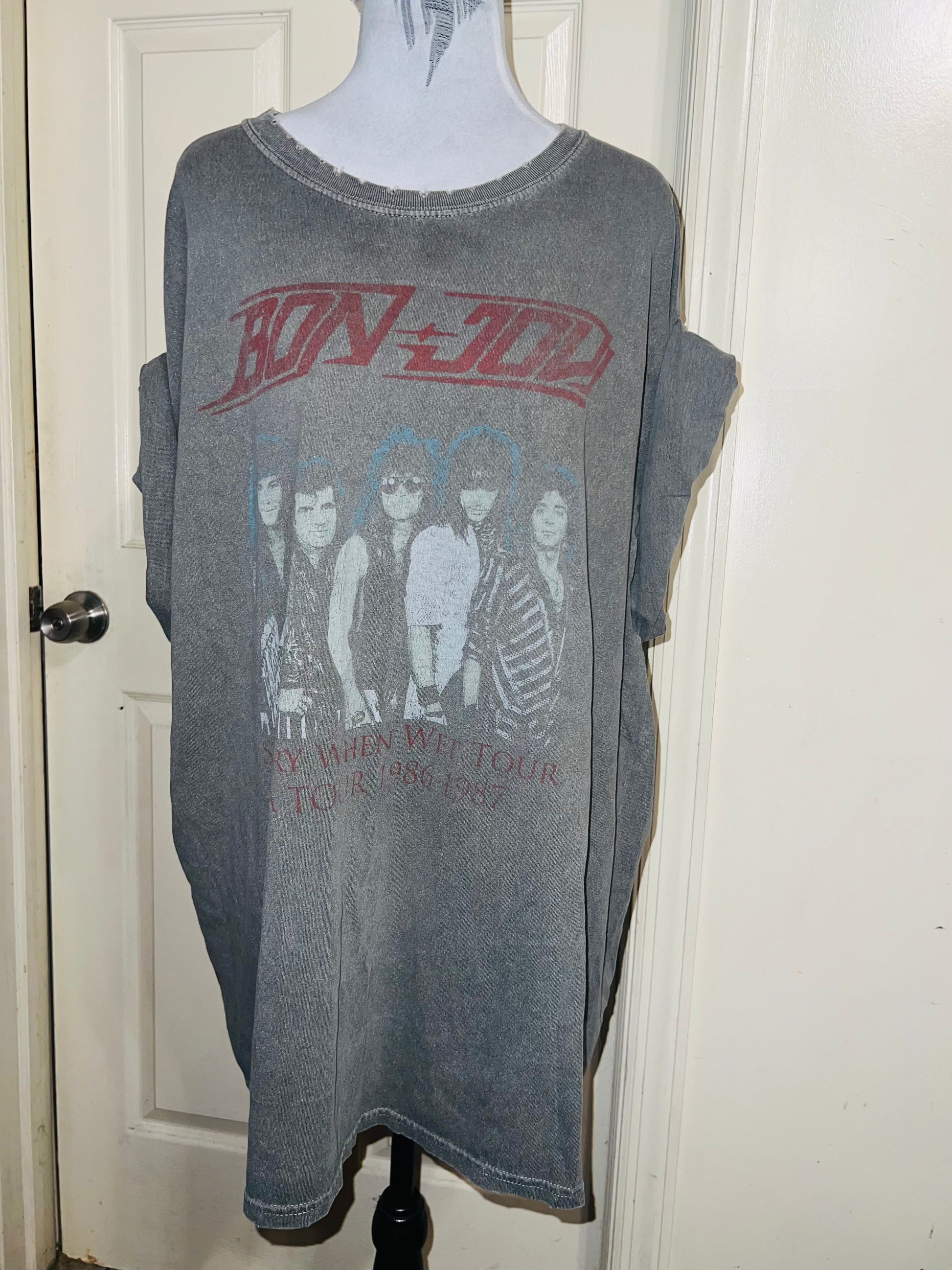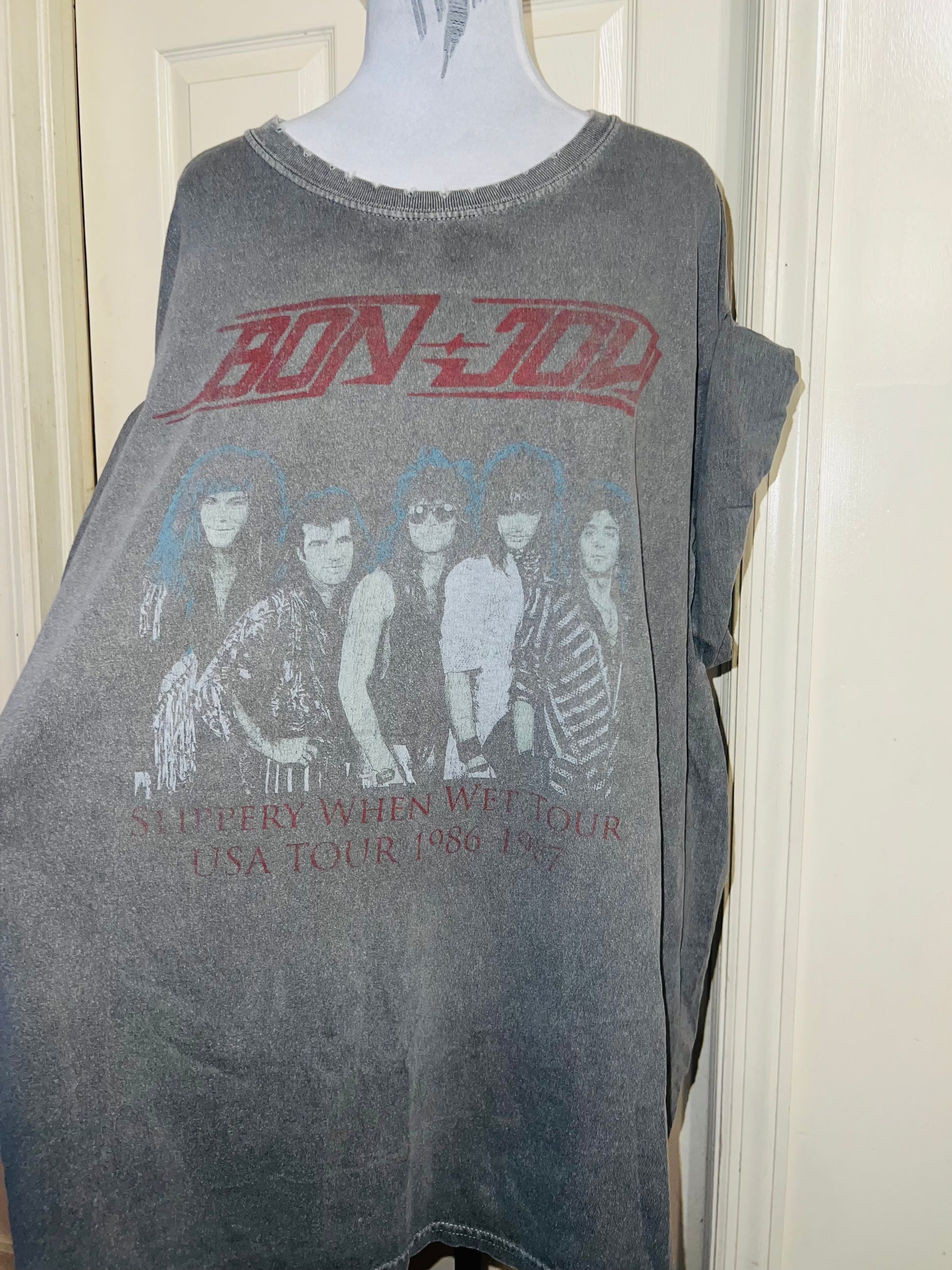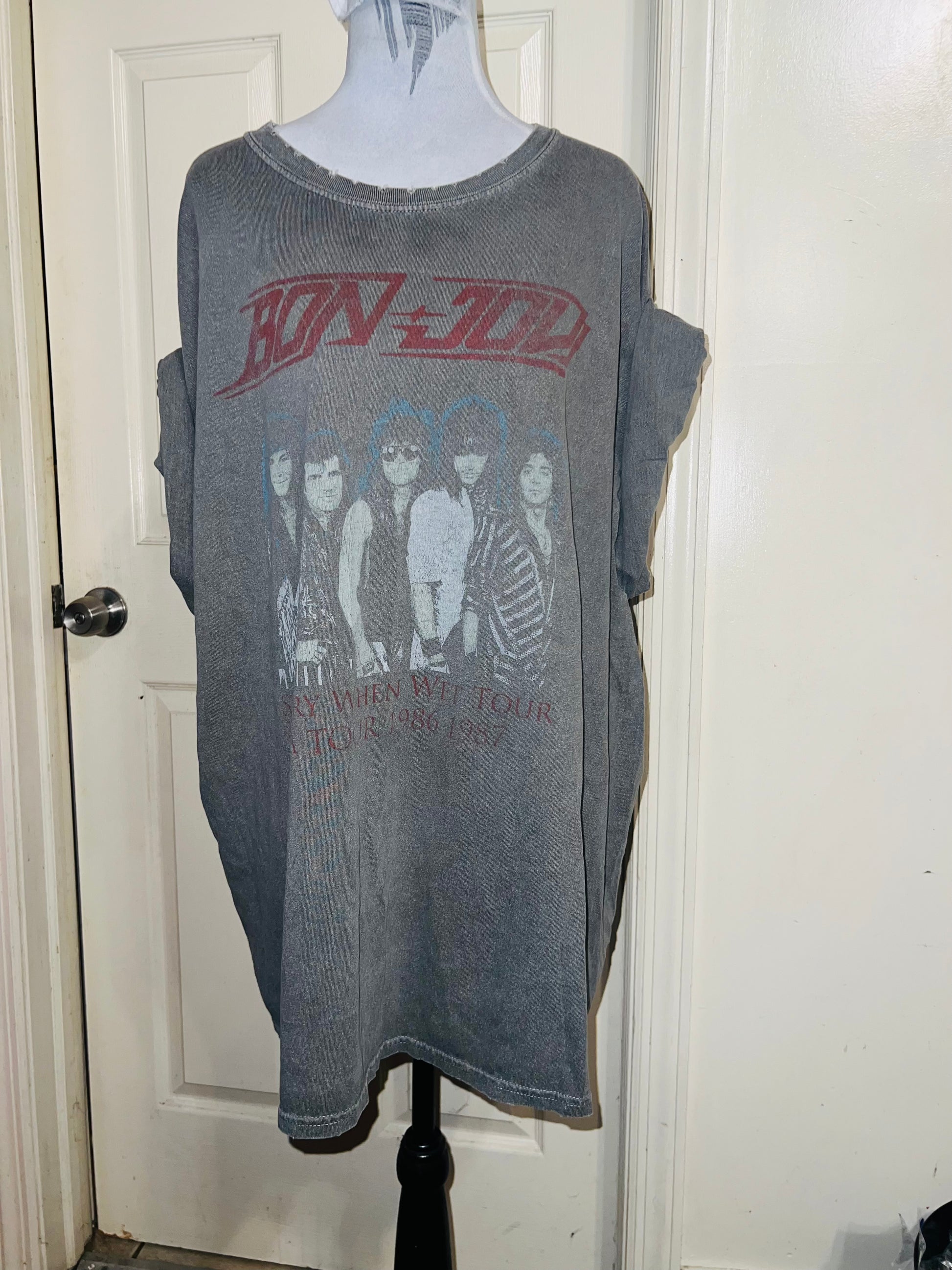 A washed grey Bon Jovi “Dry When Wet Tour” 1986-87 tee. Distressed around the corners already. Washed and worn look, oversized. Love the look of this one. Oversized, size XL>