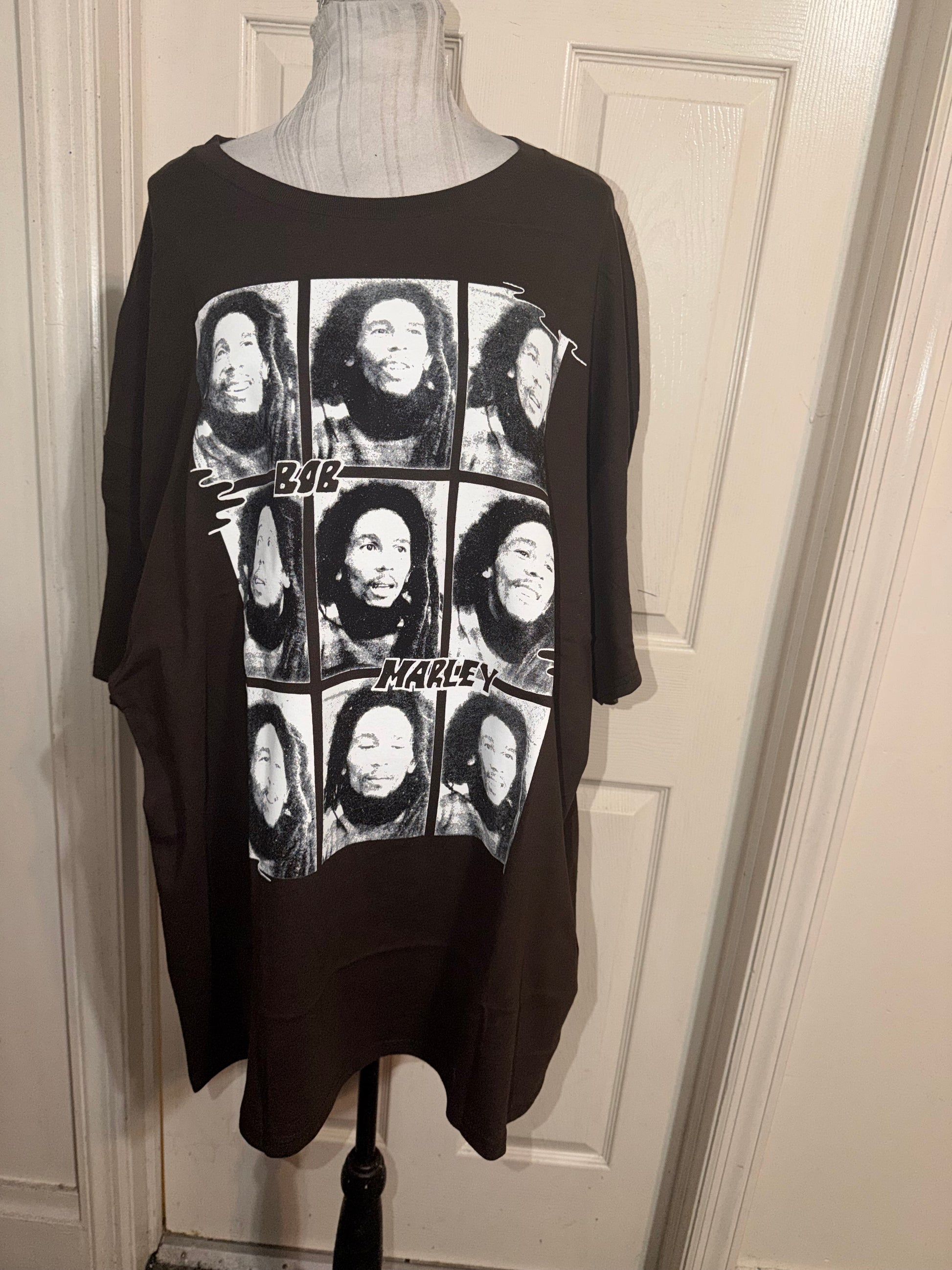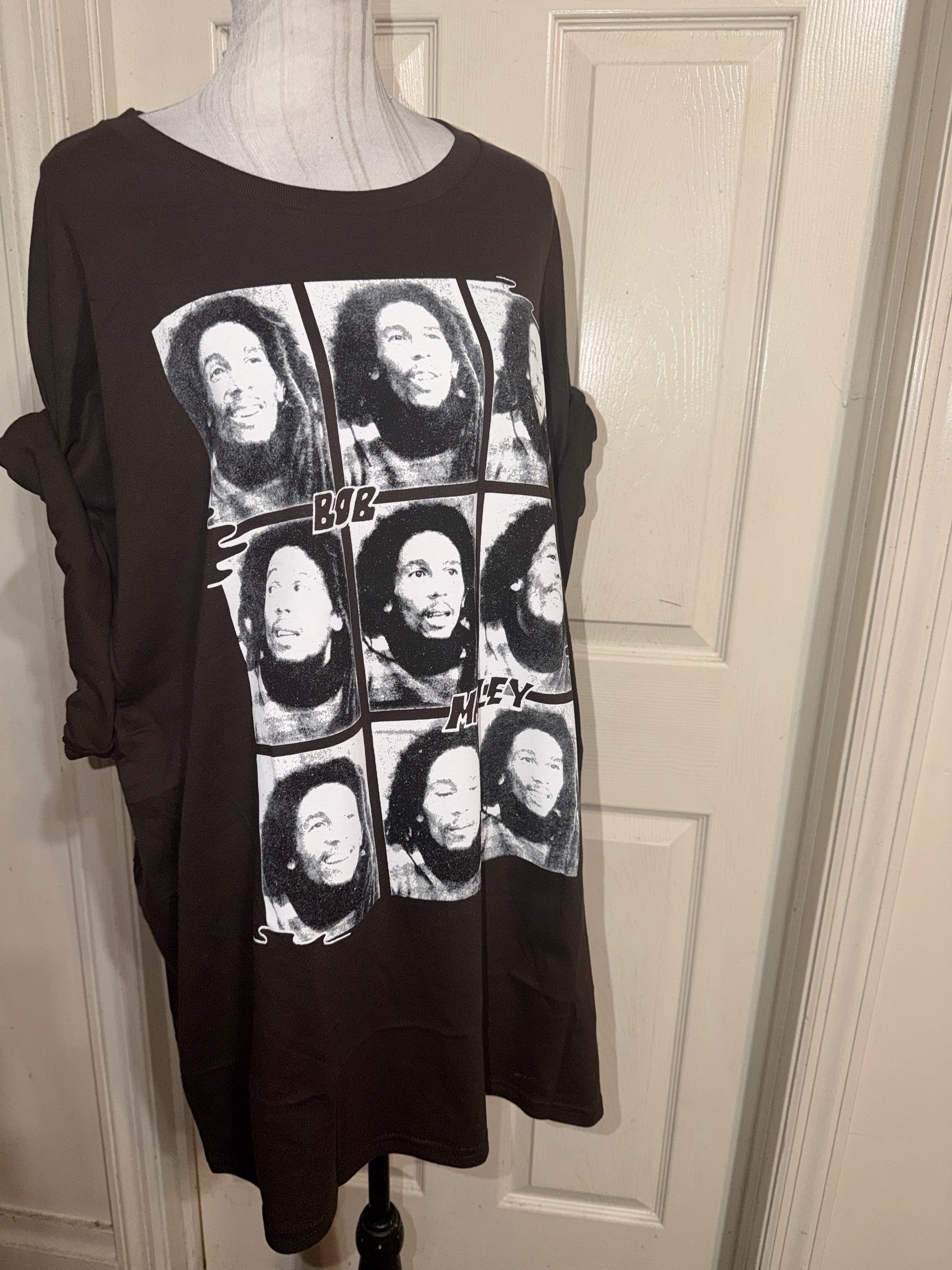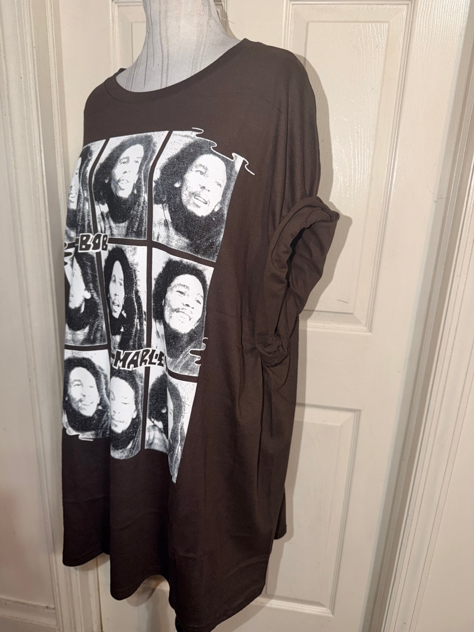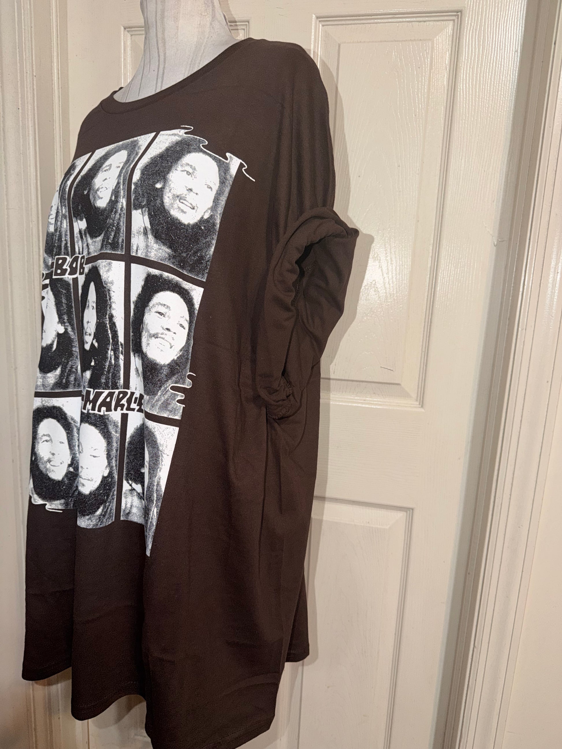 A chocolate brown Bob Marley tee with different portraits. Oversized.