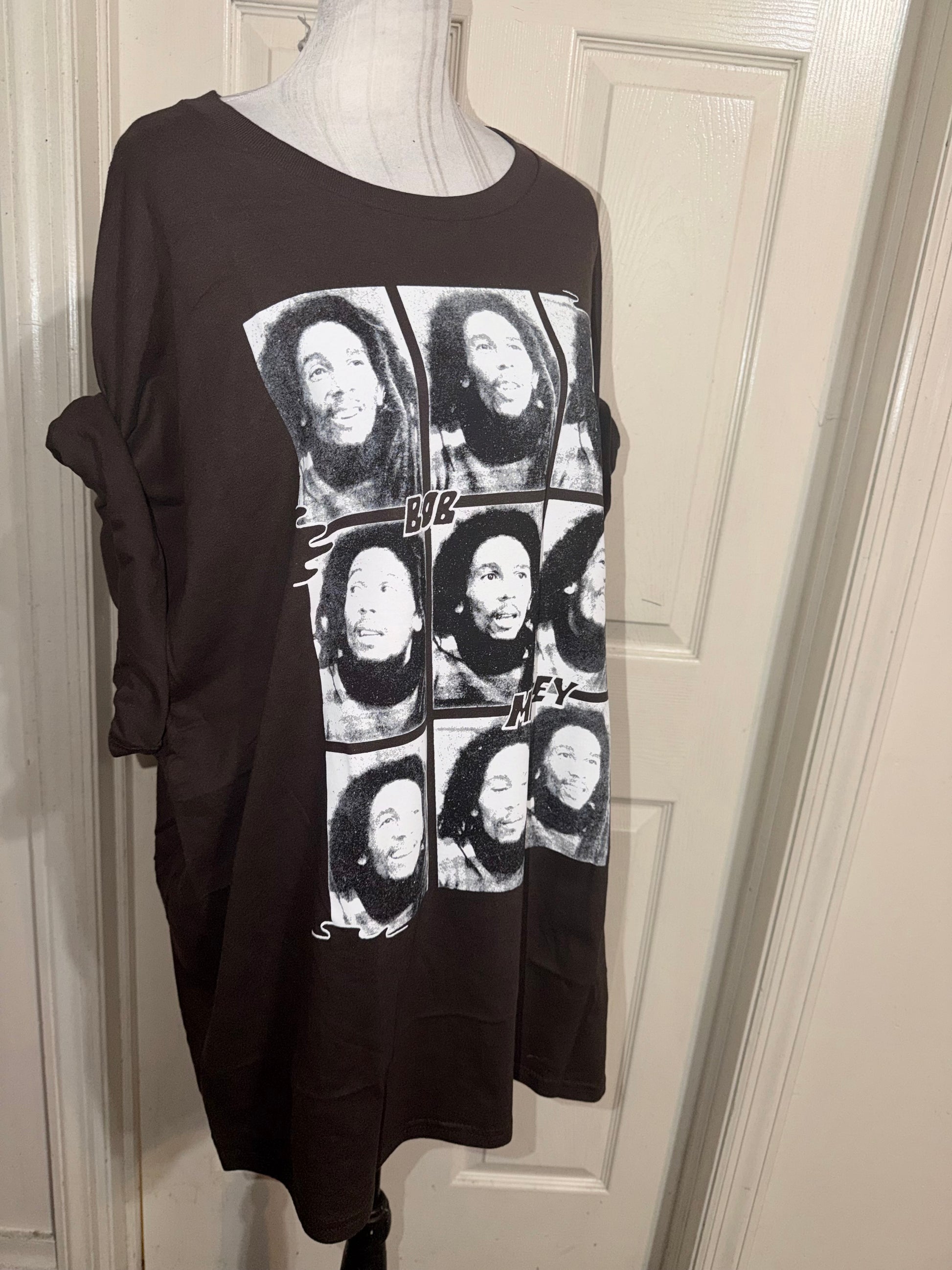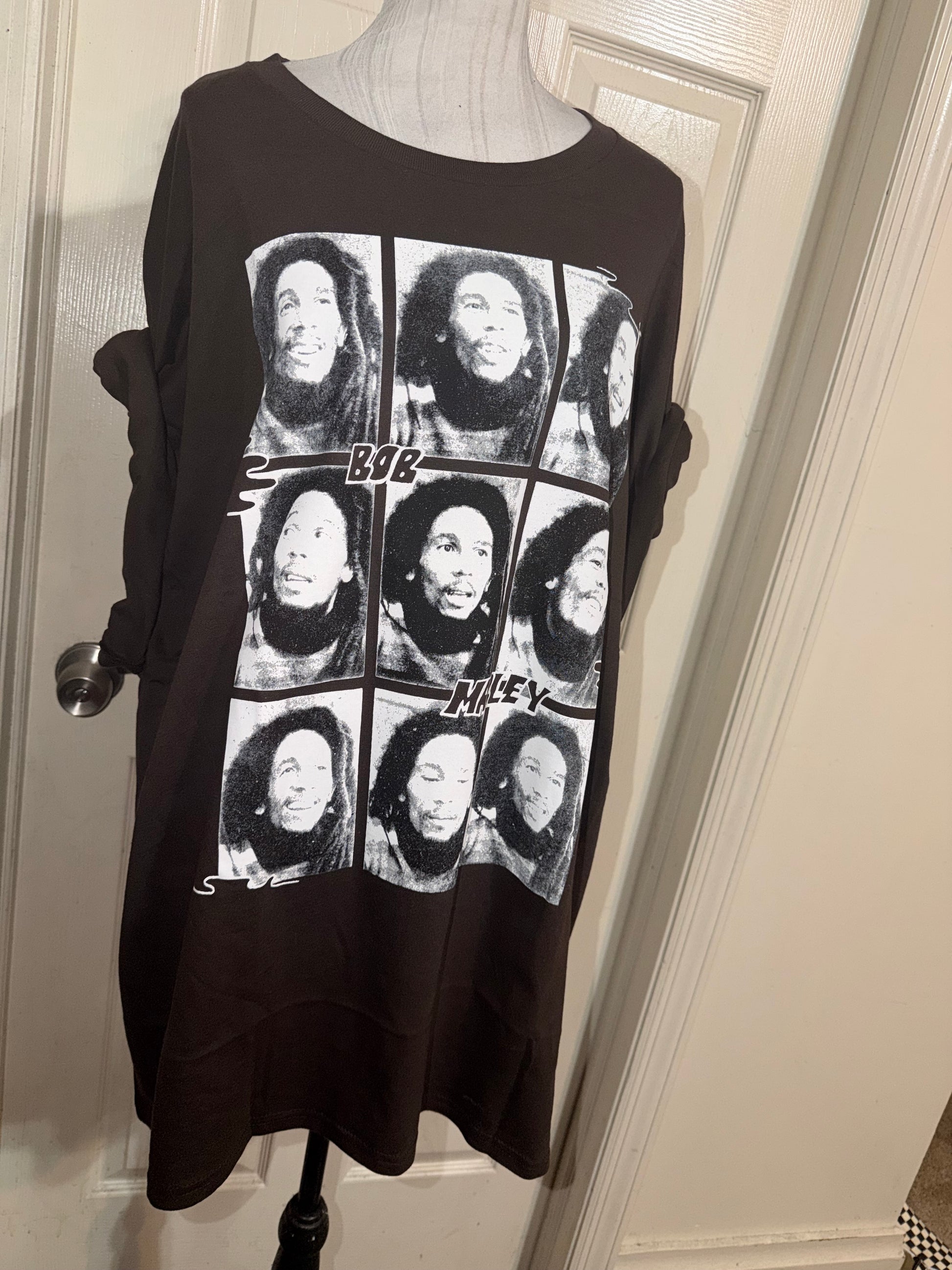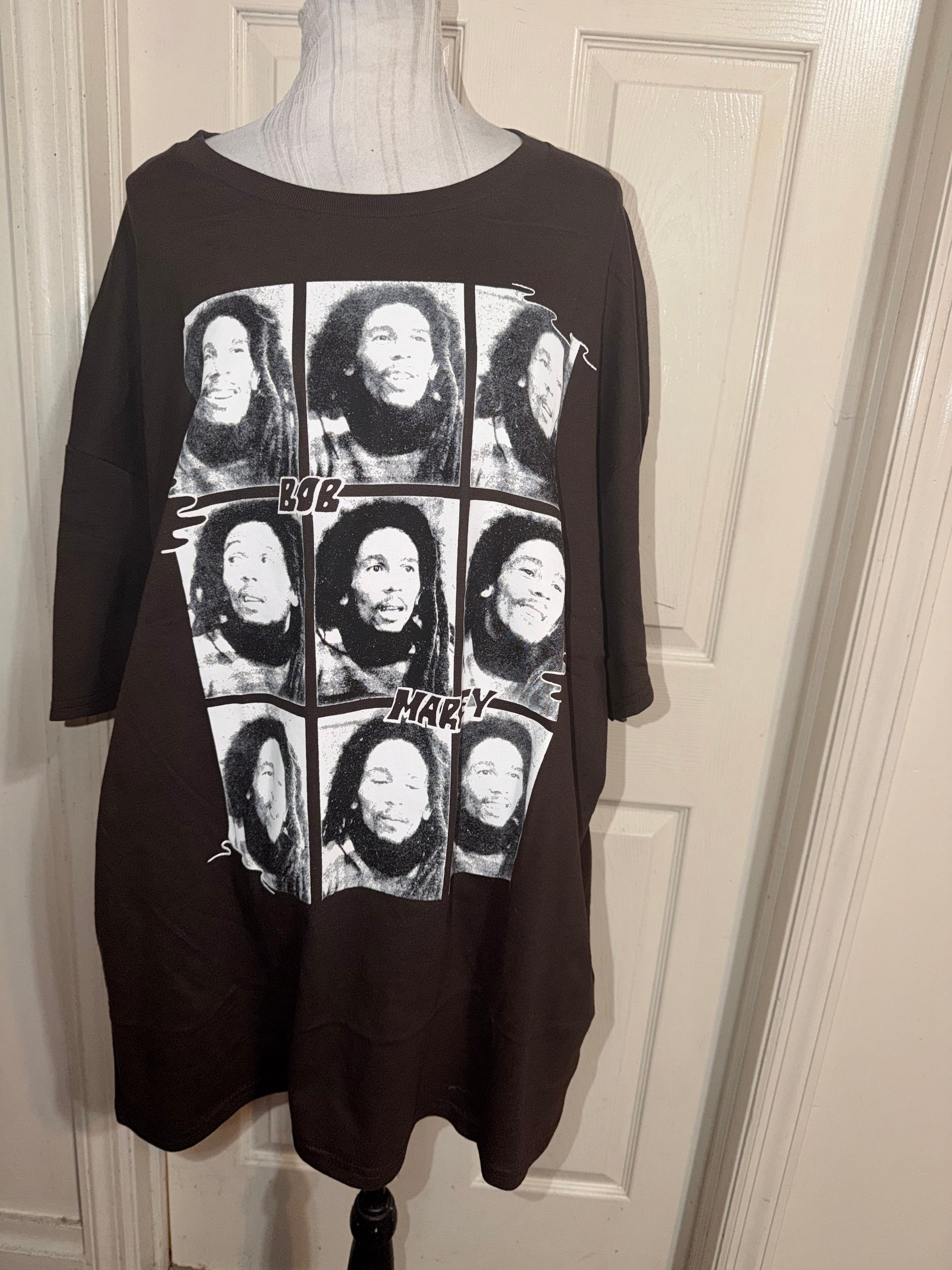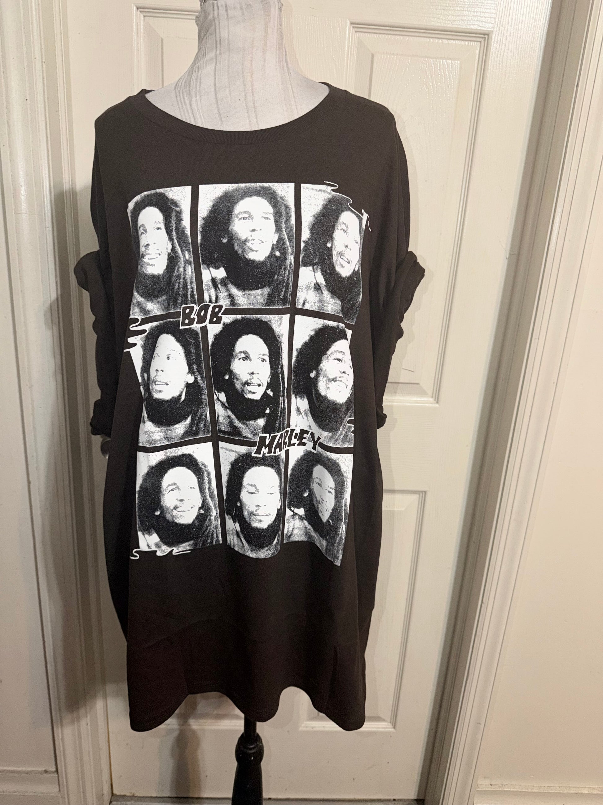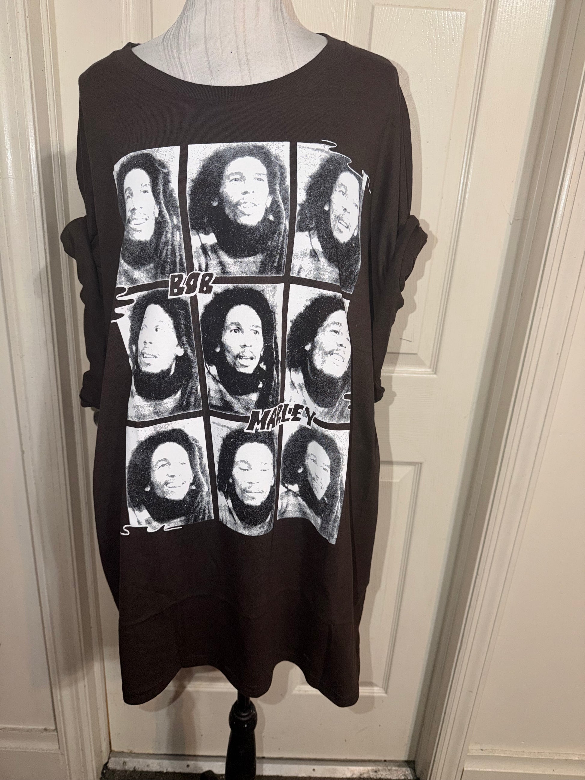 A chocolate brown Bob Marley tee with different portraits. Oversized.