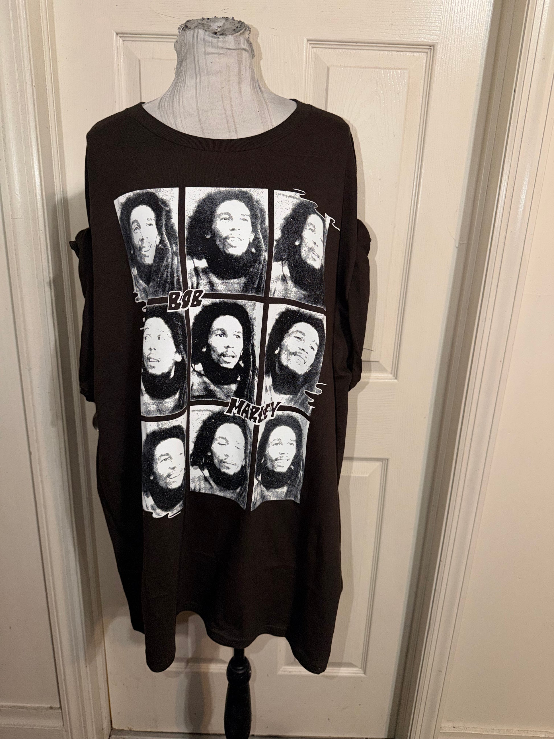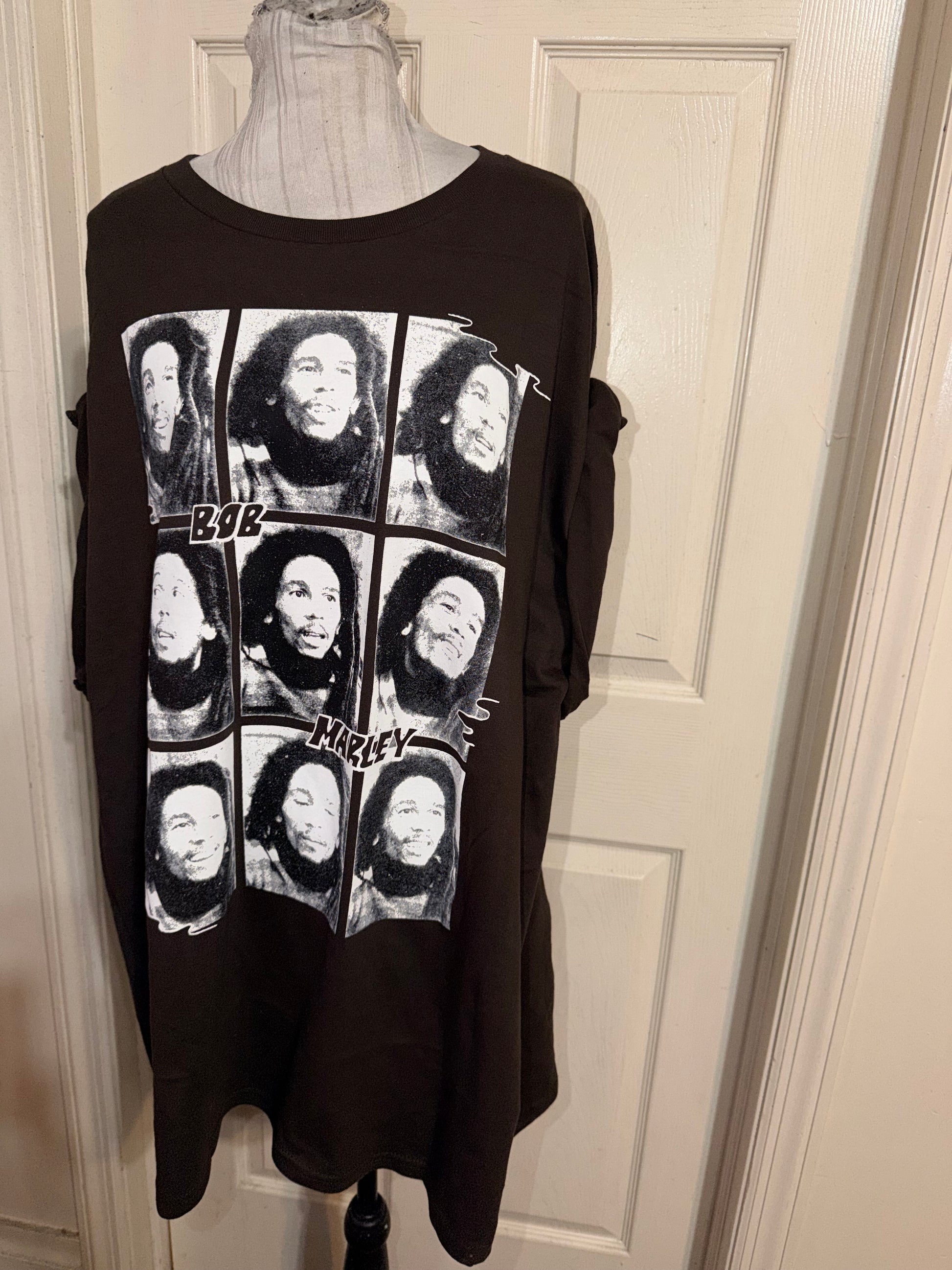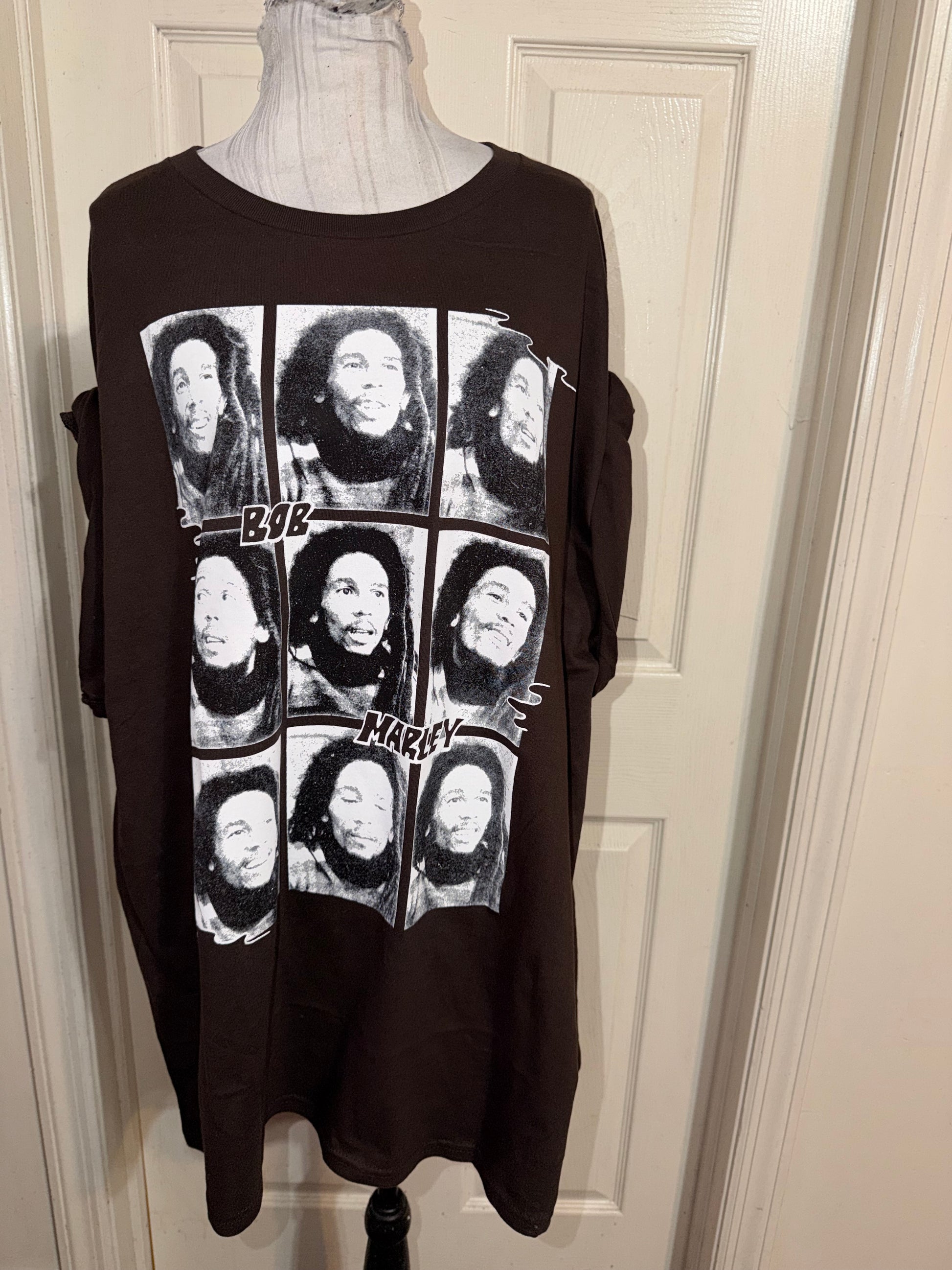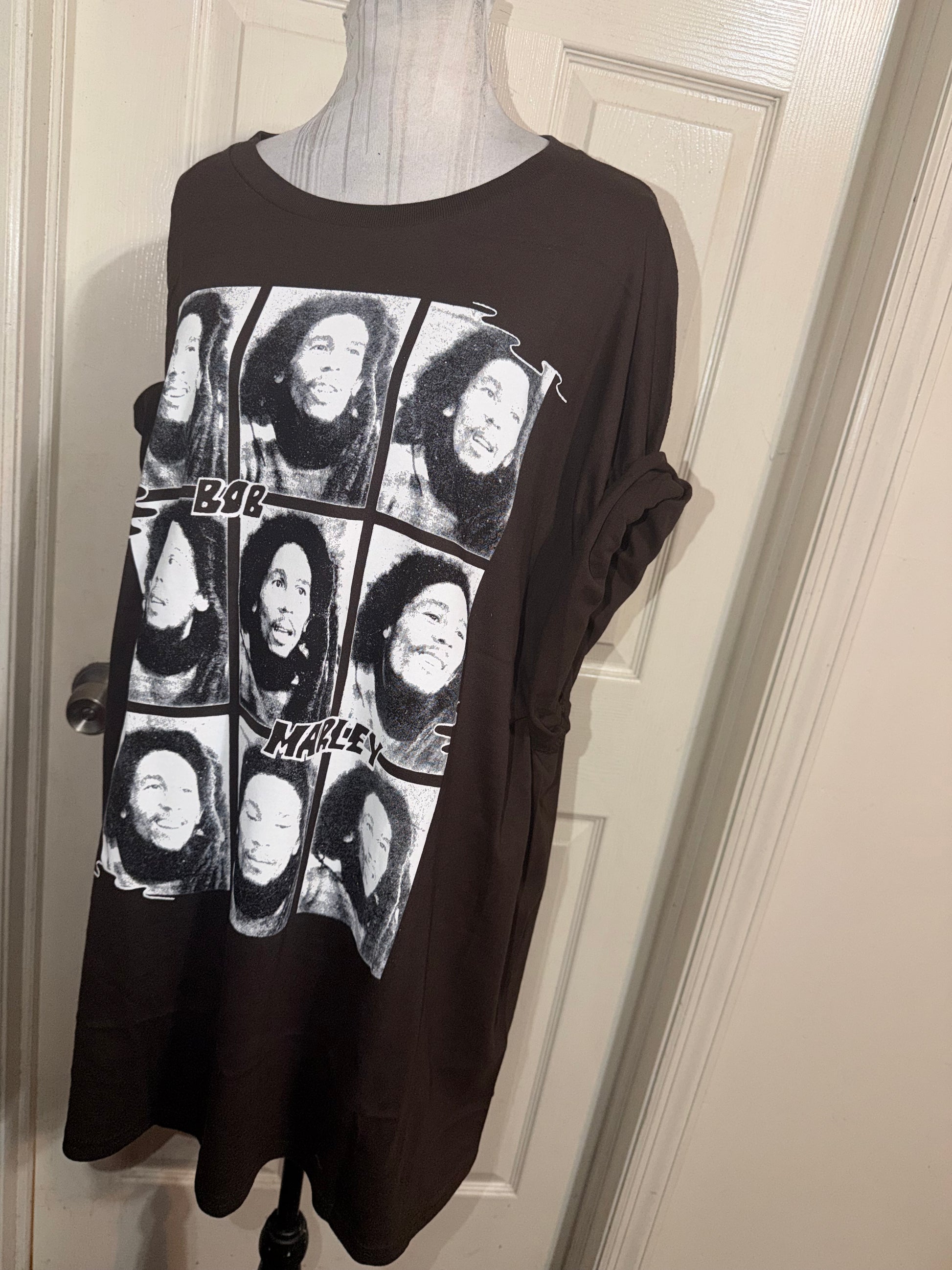 A chocolate brown Bob Marley tee with different portraits. Oversized.