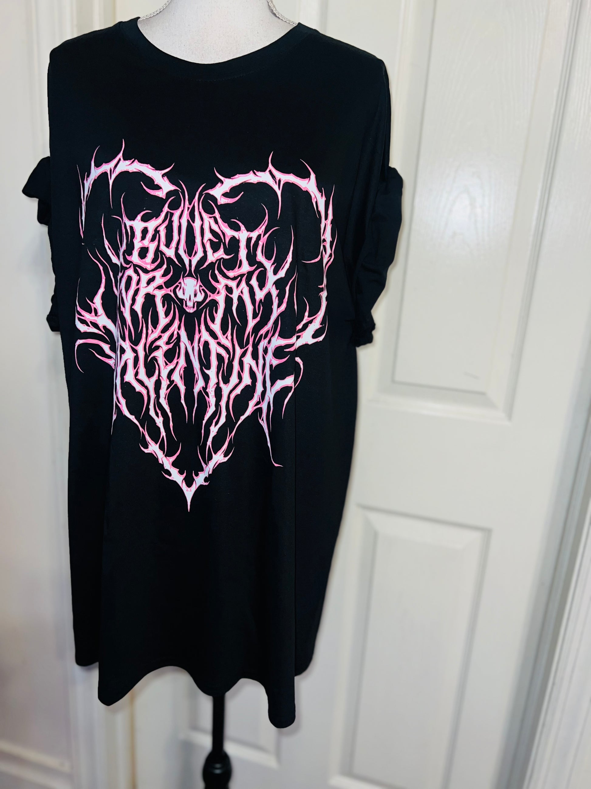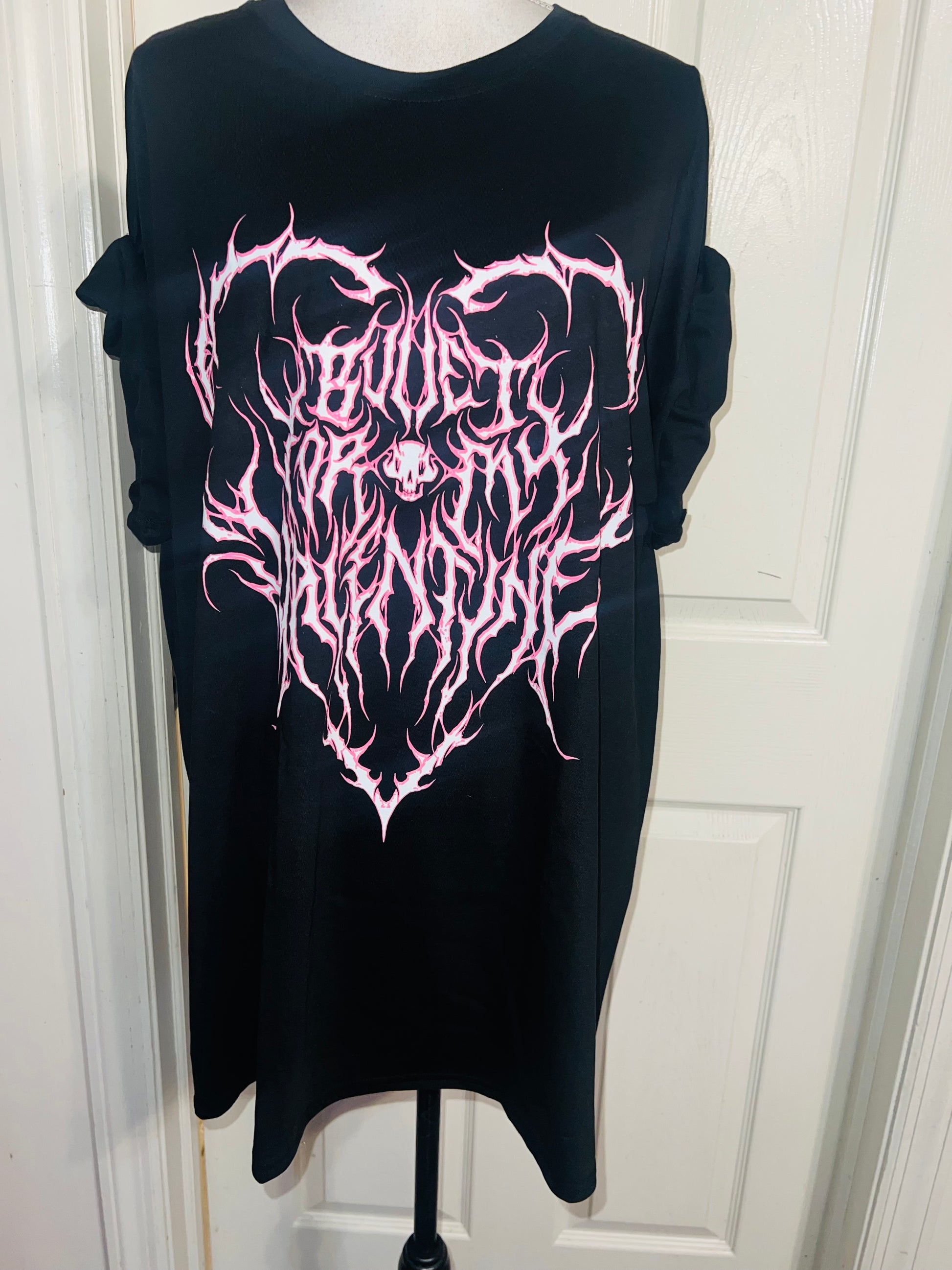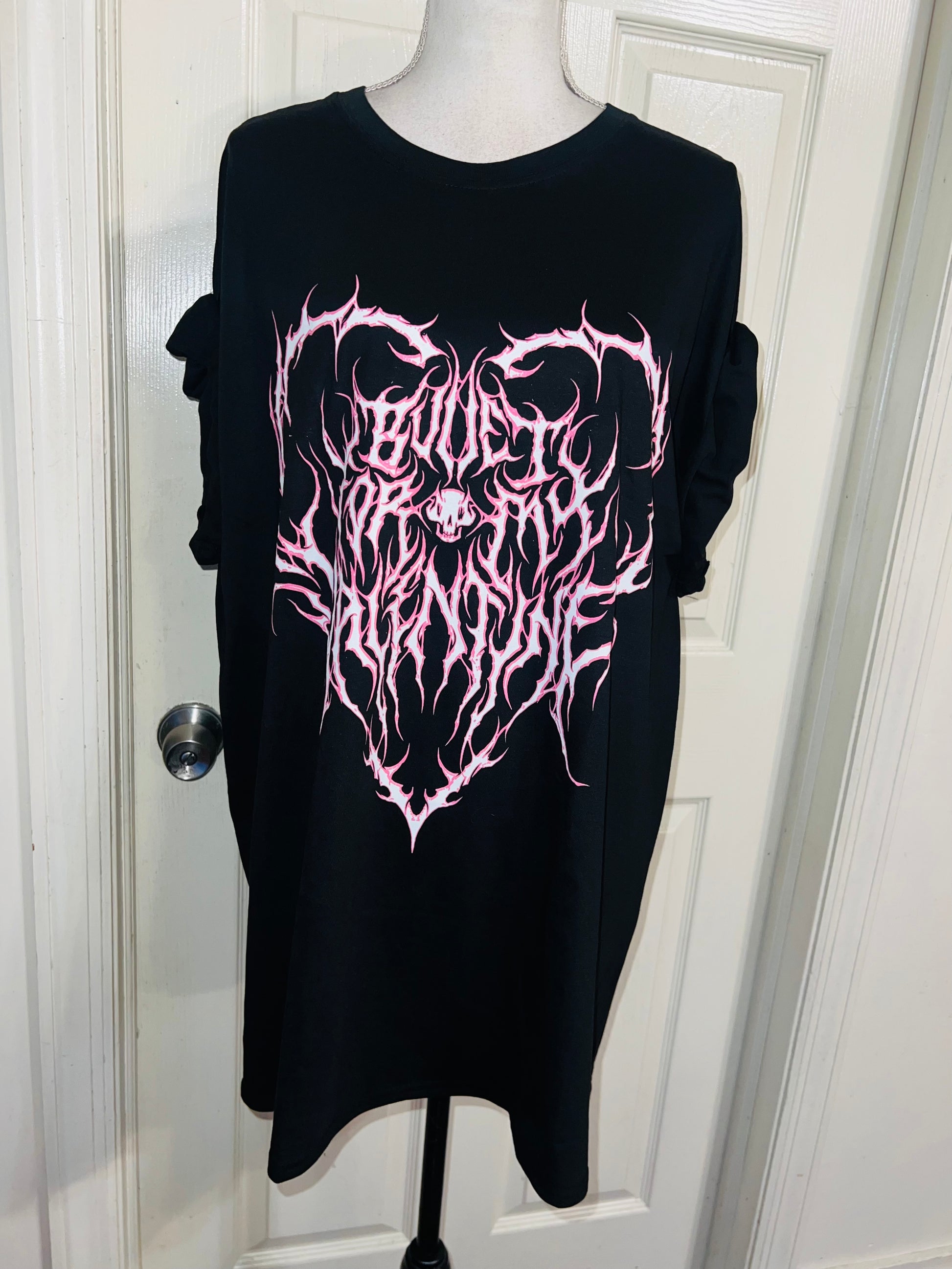 This is now a preorder. Please allow extra processing time. A black Bullet for my Valentine tee with a neon pink heart graphic. Size XXL, oversized.