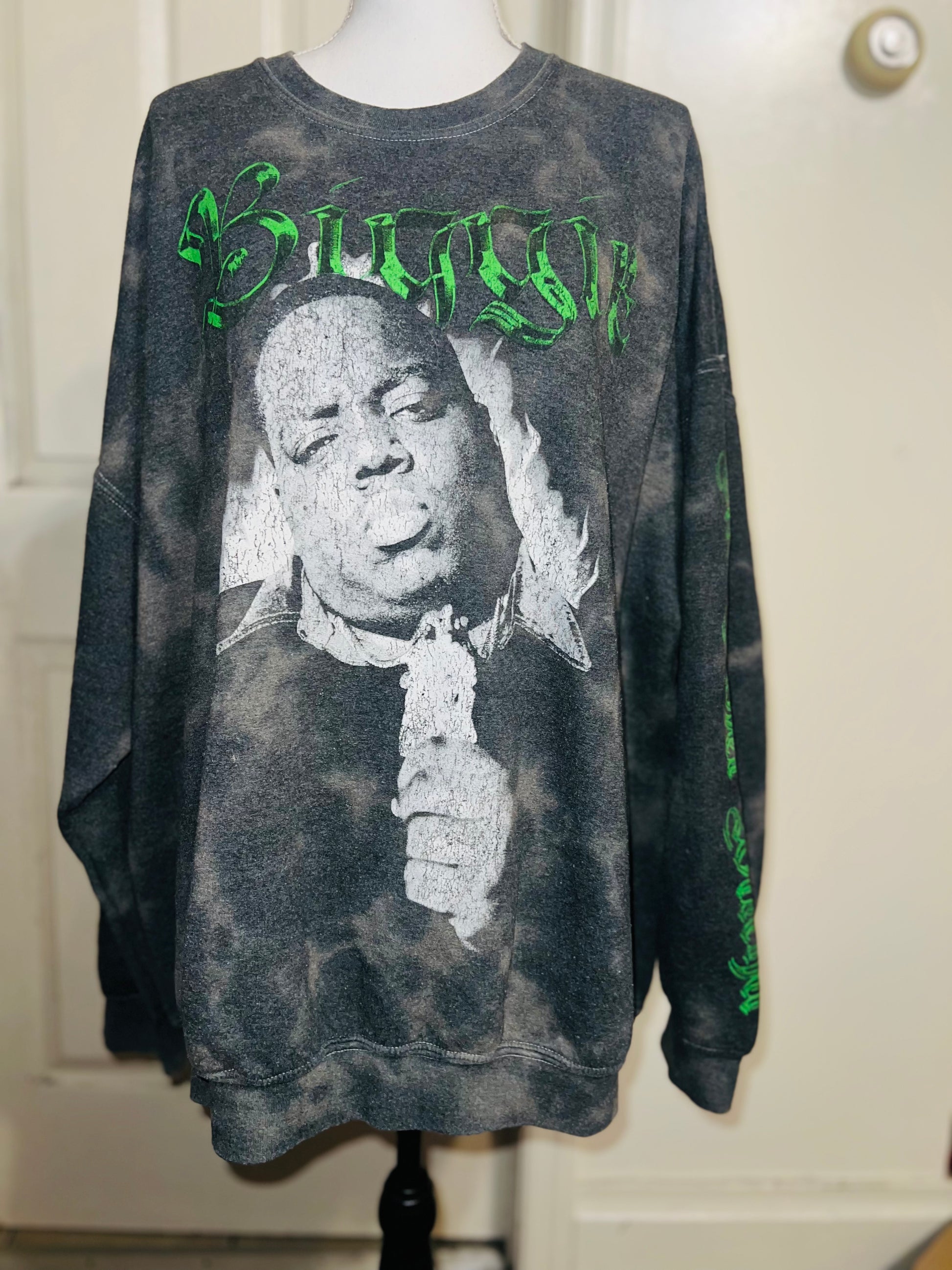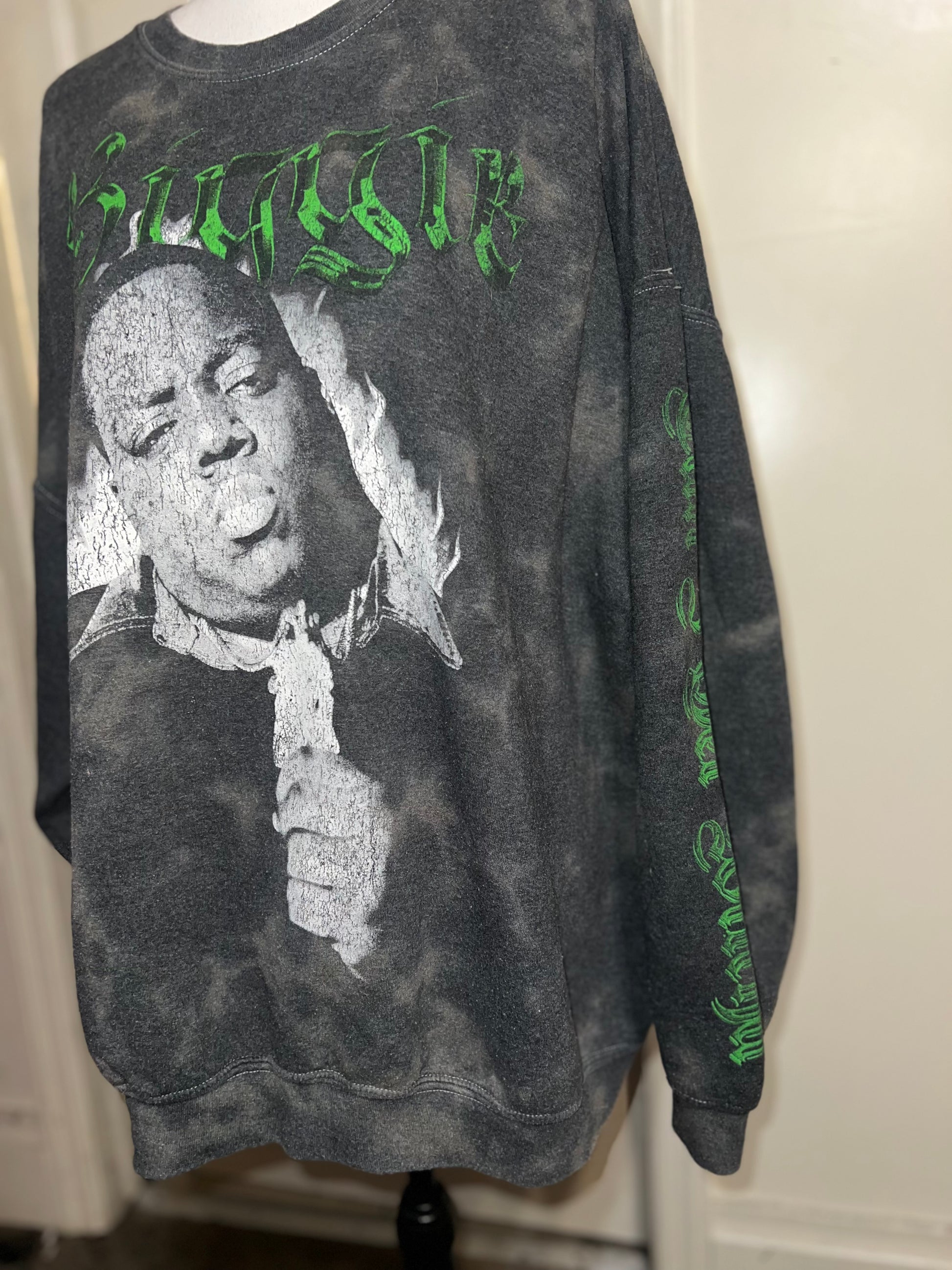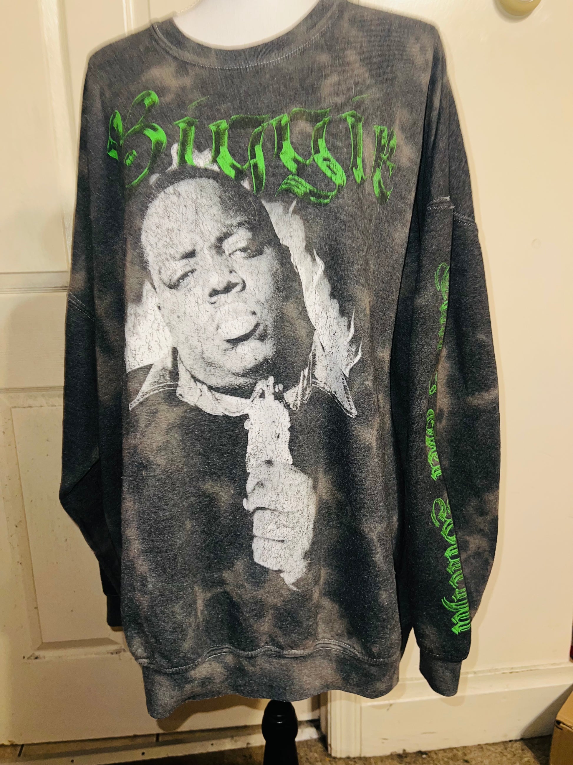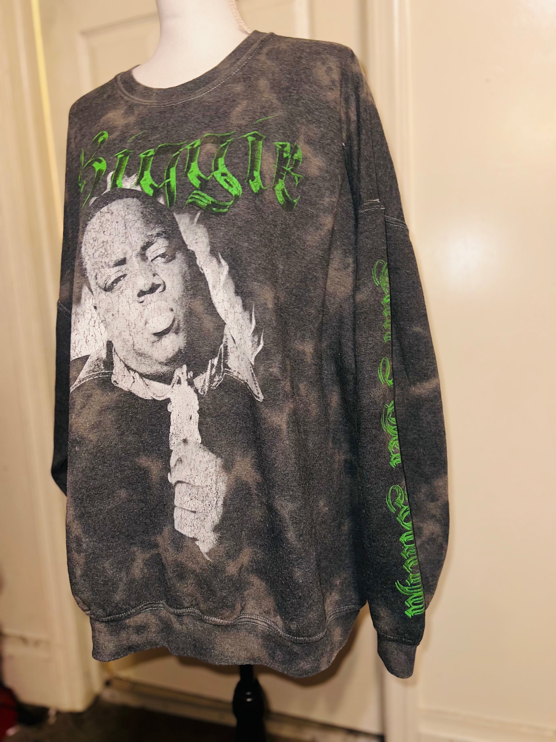 A grey washed sweatshirt with Biggie Smalls on the front with green writing and down the side says “can I get witcha?”