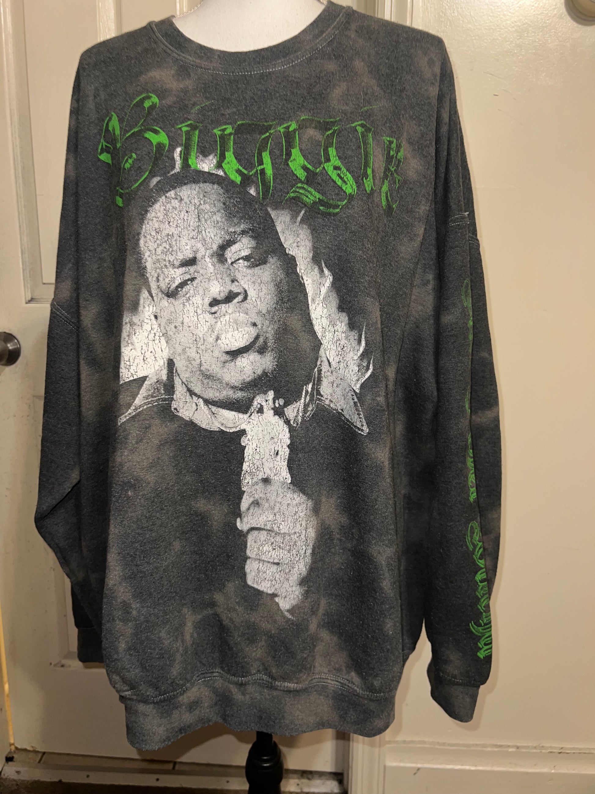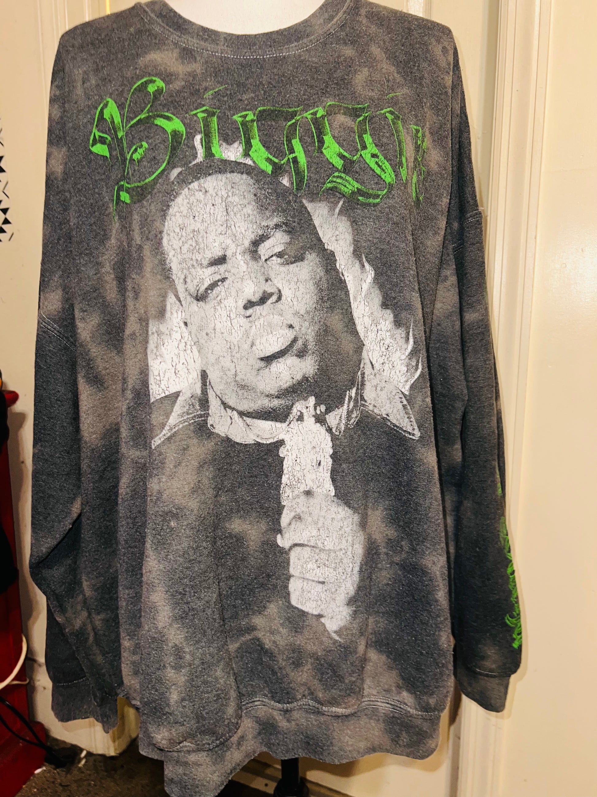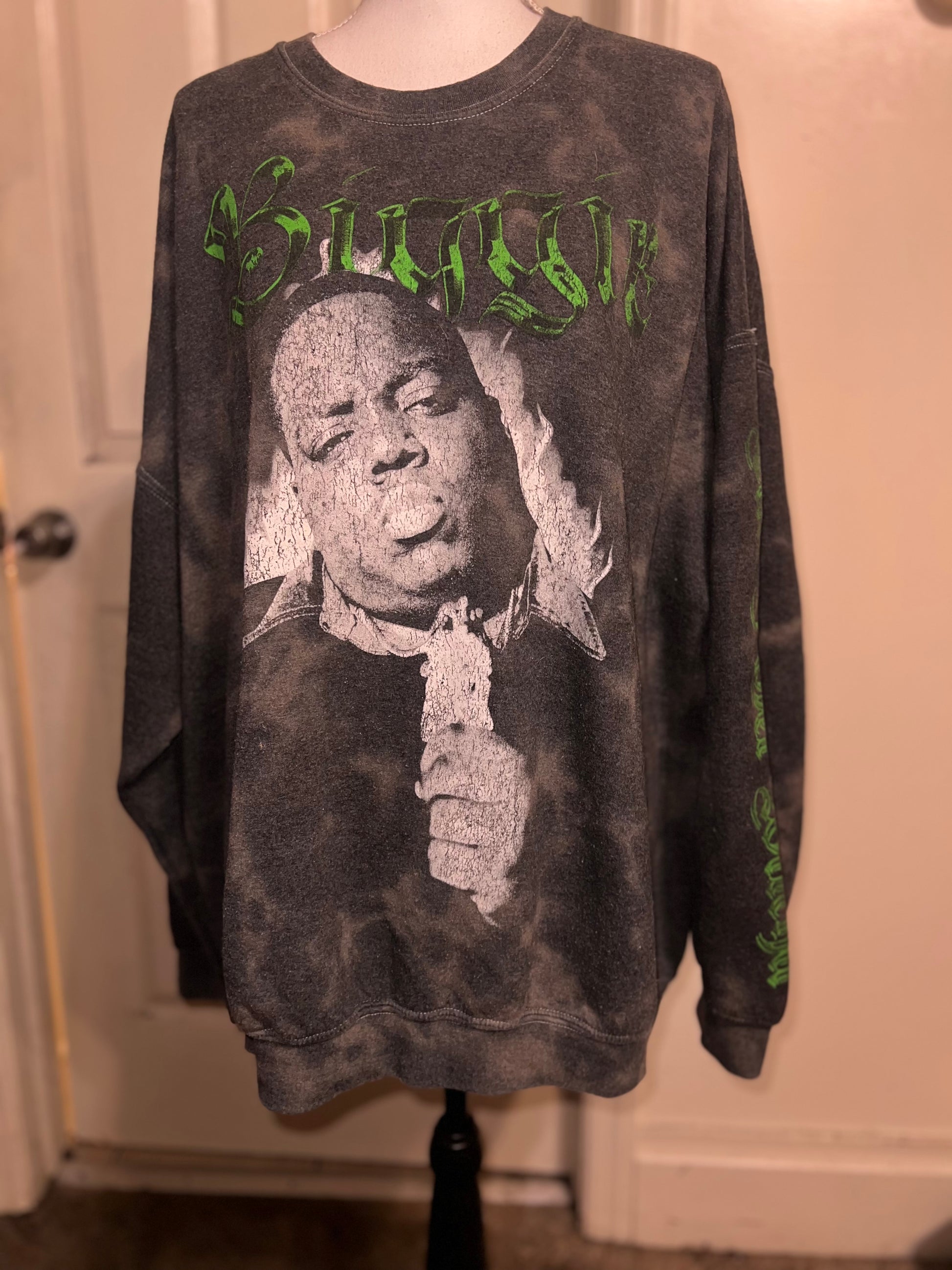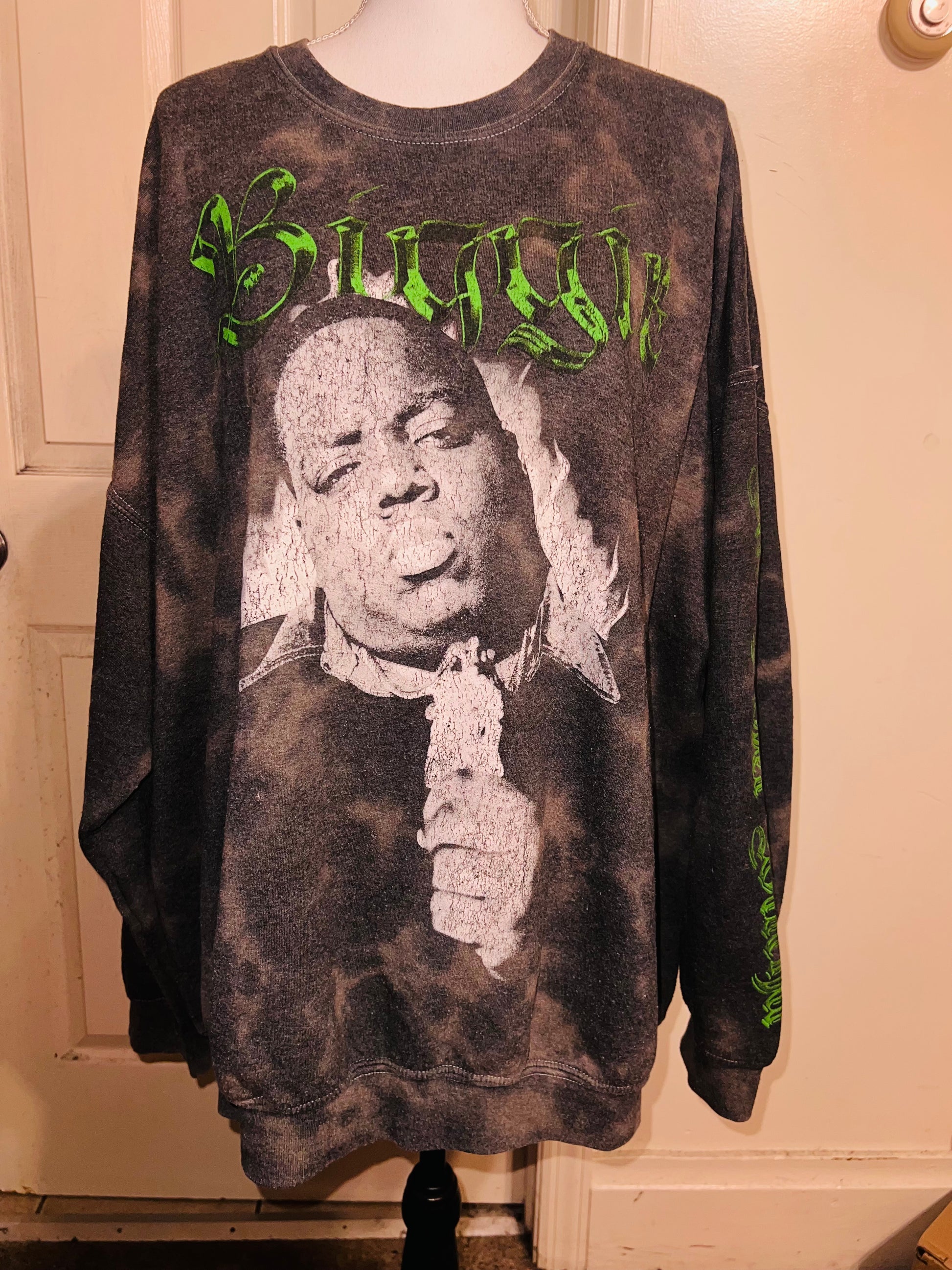 A grey washed sweatshirt with Biggie Smalls on the front with green writing and down the side says “can I get witcha?”