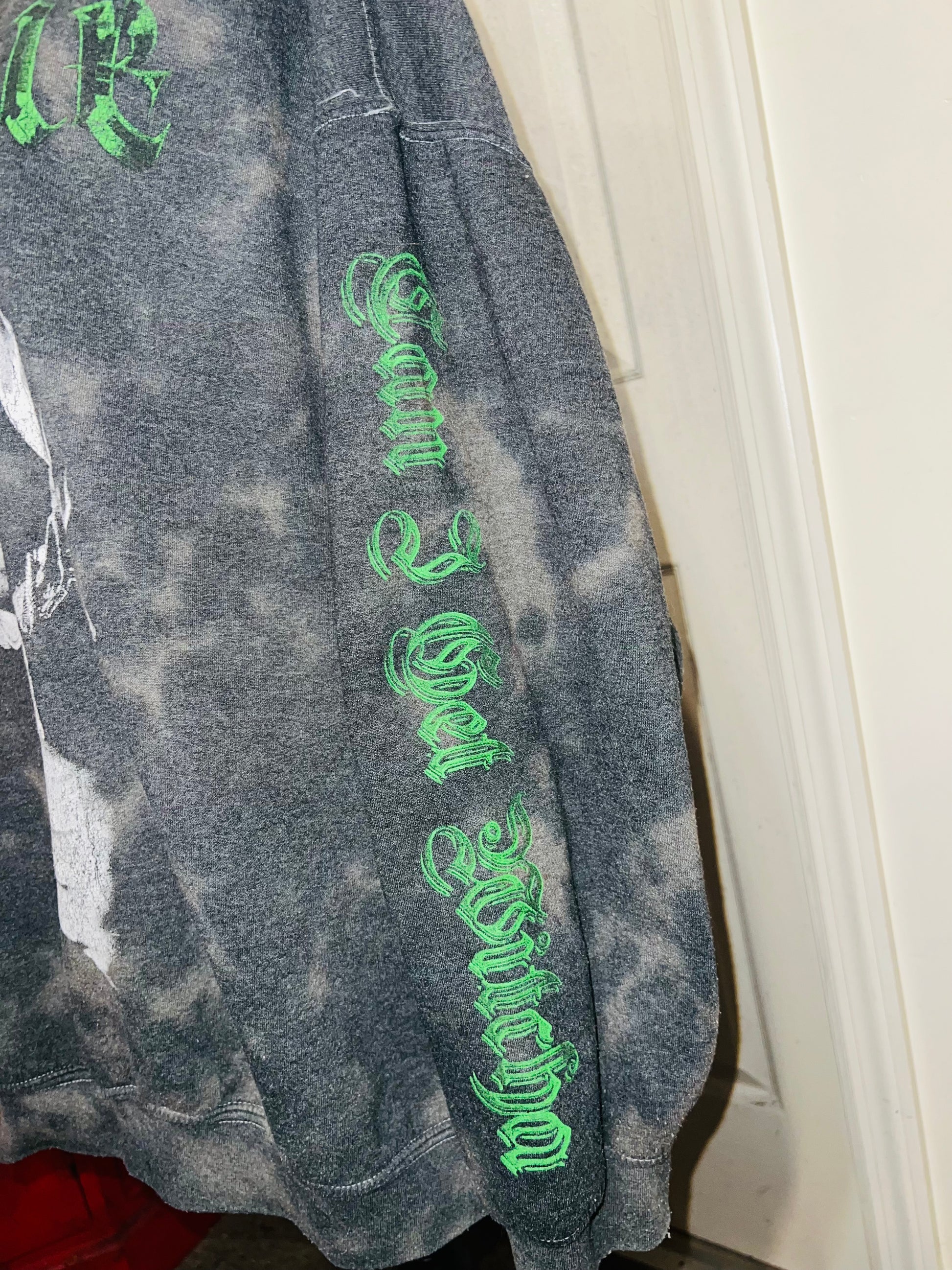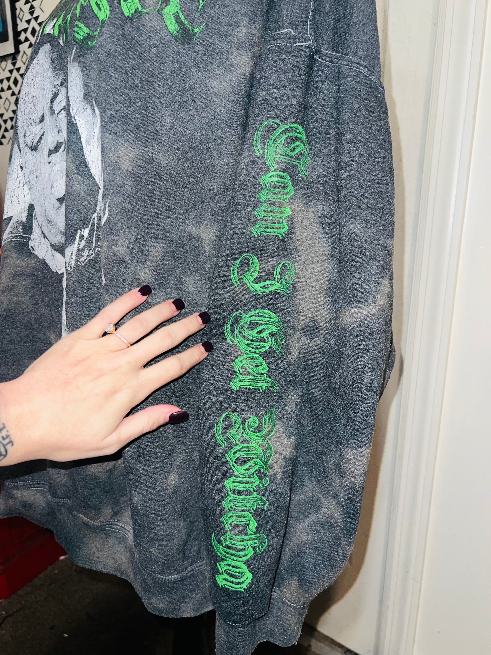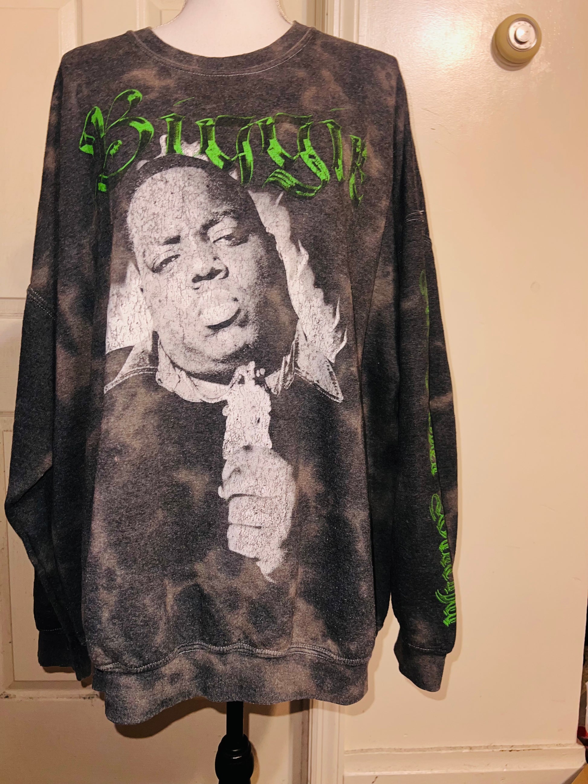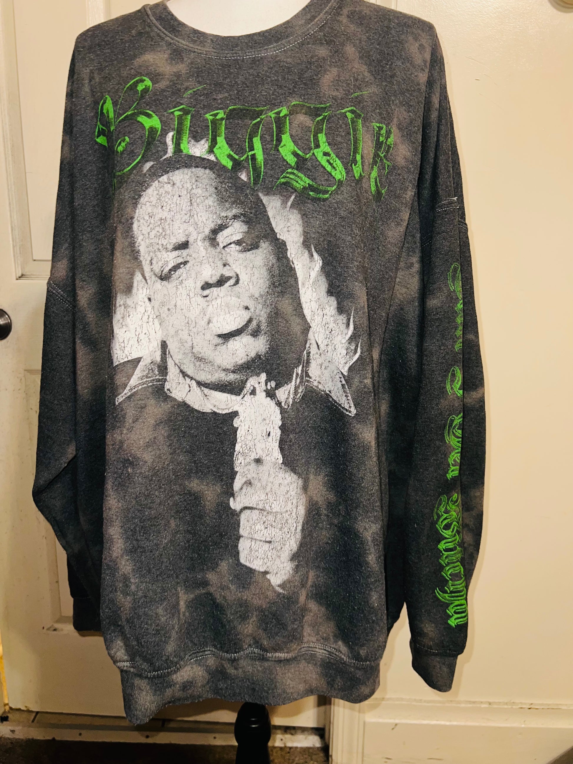 A grey washed sweatshirt with Biggie Smalls on the front with green writing and down the side says “can I get witcha?”