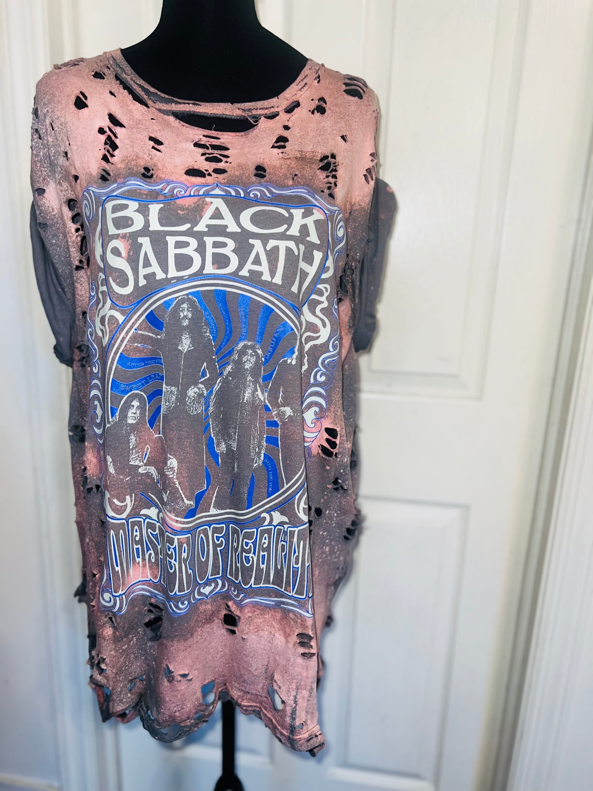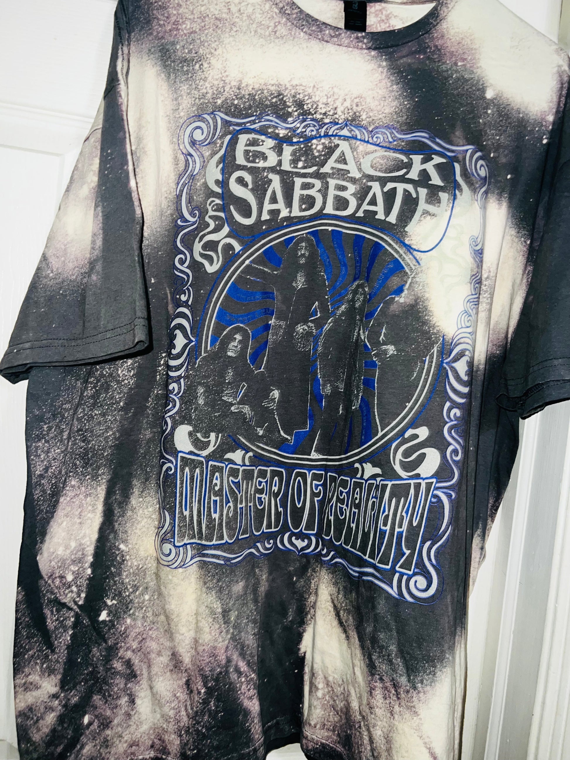 This is a preorder. Please allow extra processing times this can also be not bleached. This grey Black Sabbath tee (I love grey bleached, it’s so pretty!) has the members and “Master of Reality” in a groovy/trippy font. It’s a very oversized XL!