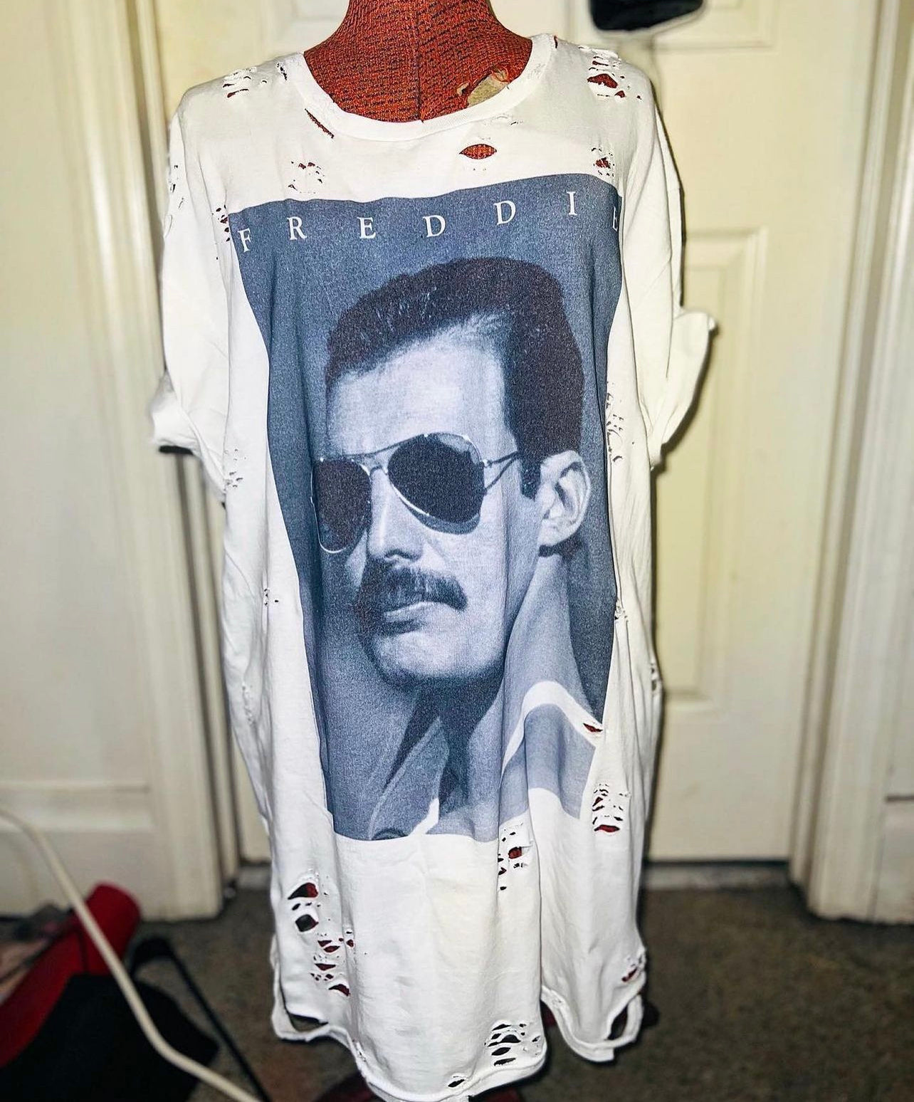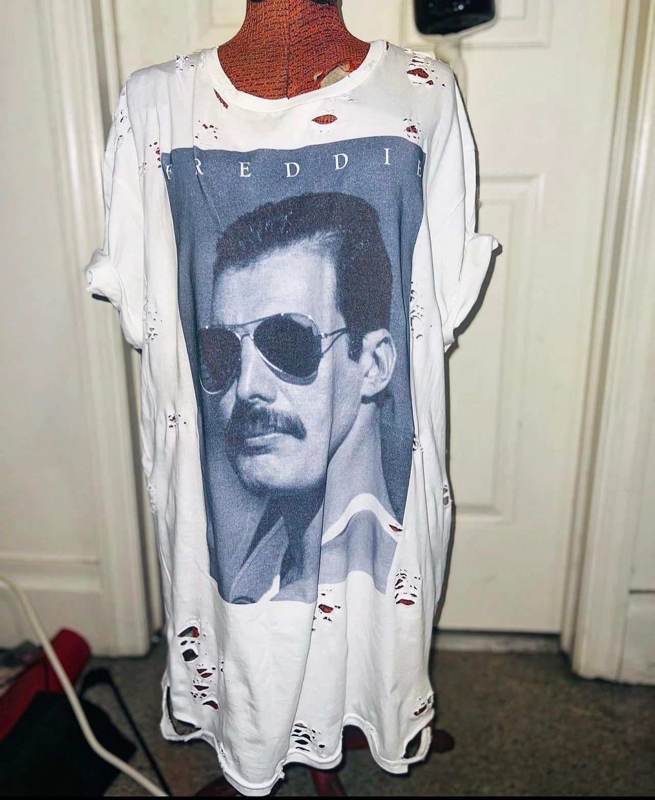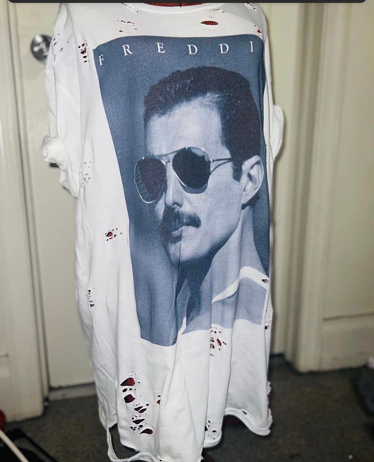 The legendary Freddie Mercury is front and center on this tee. Every time I get one, it sells so quick! So snag it quick! It’s not distressed yet and is an oversized XL, very comfortable.