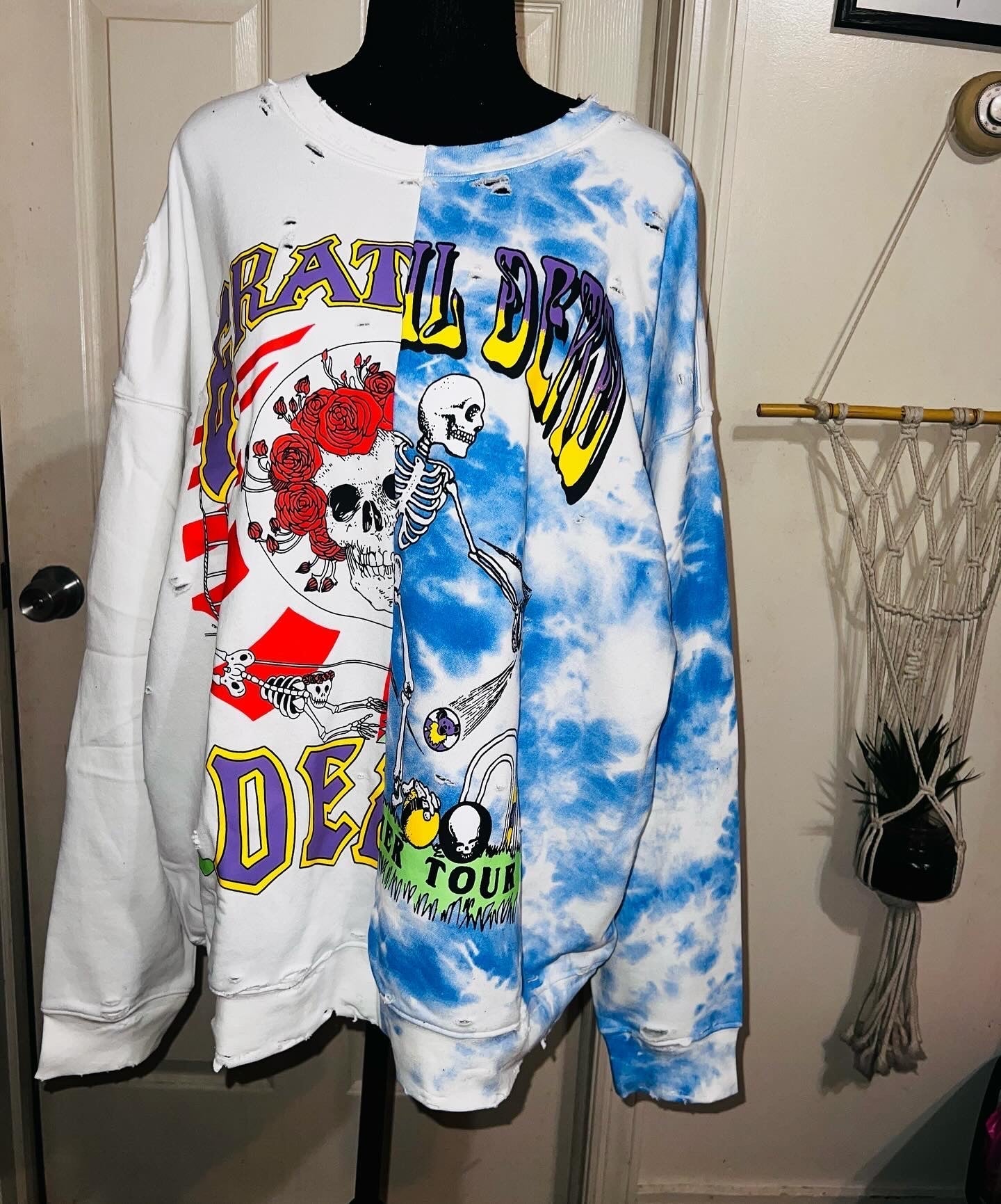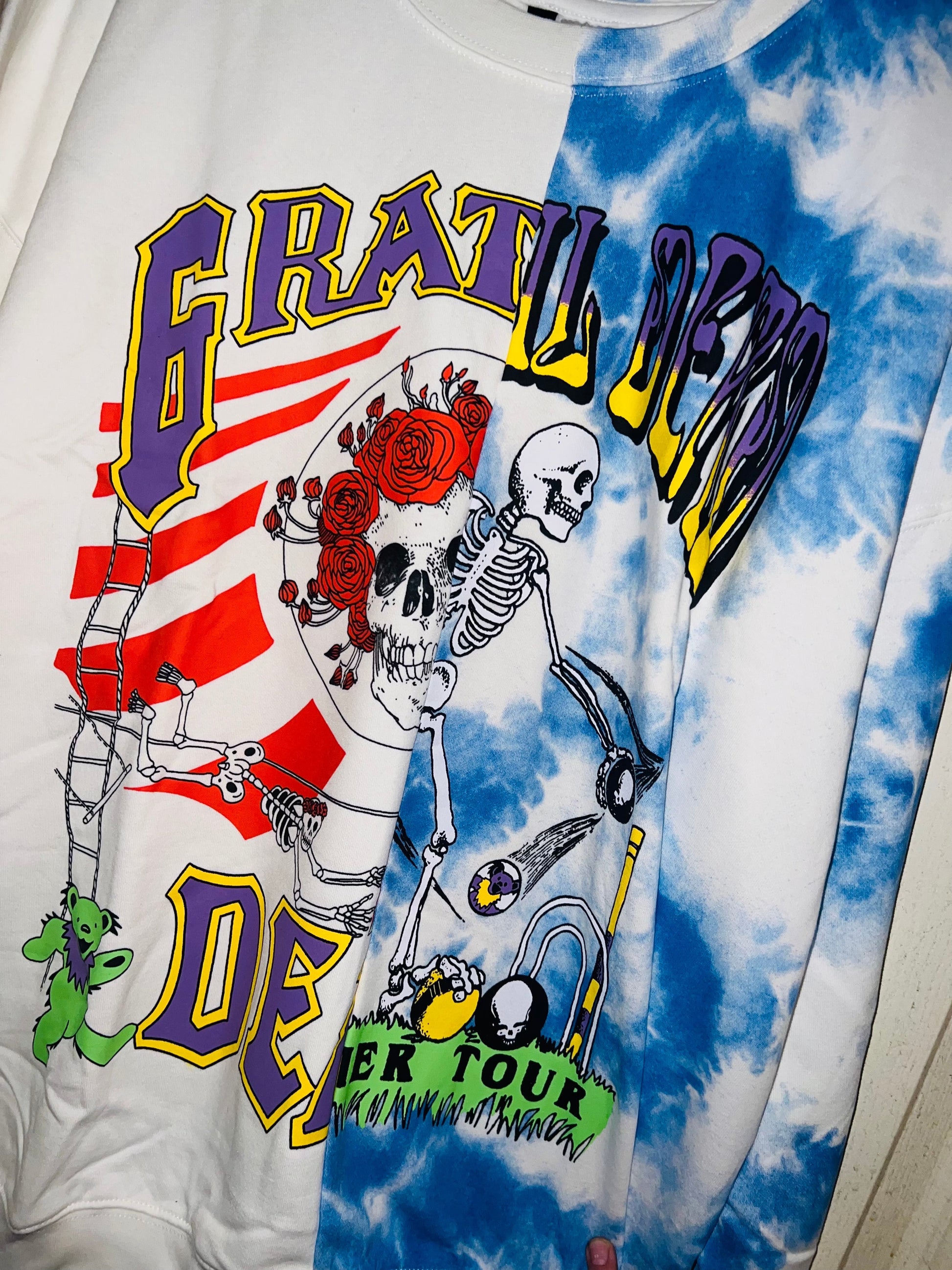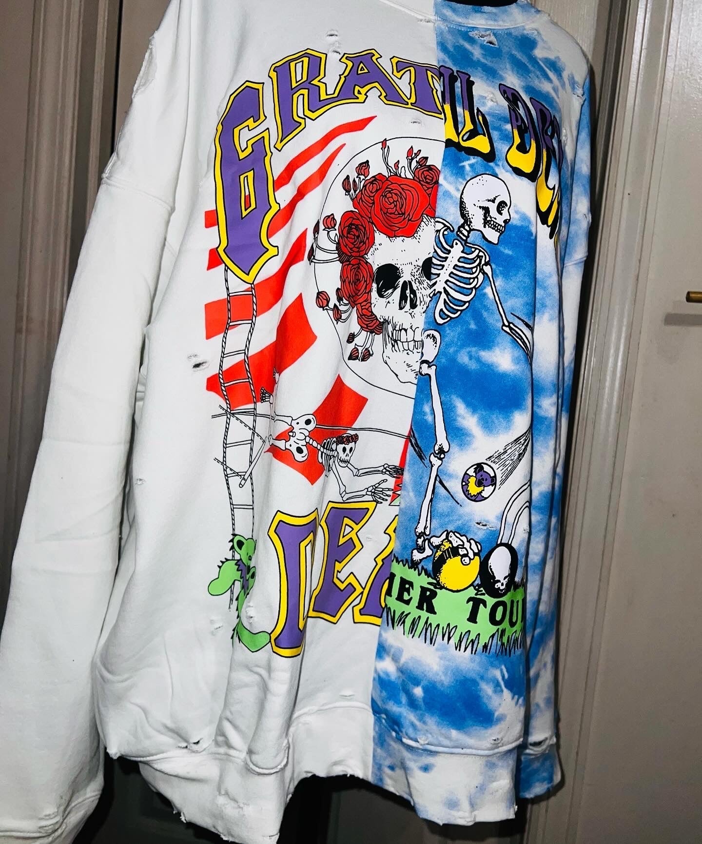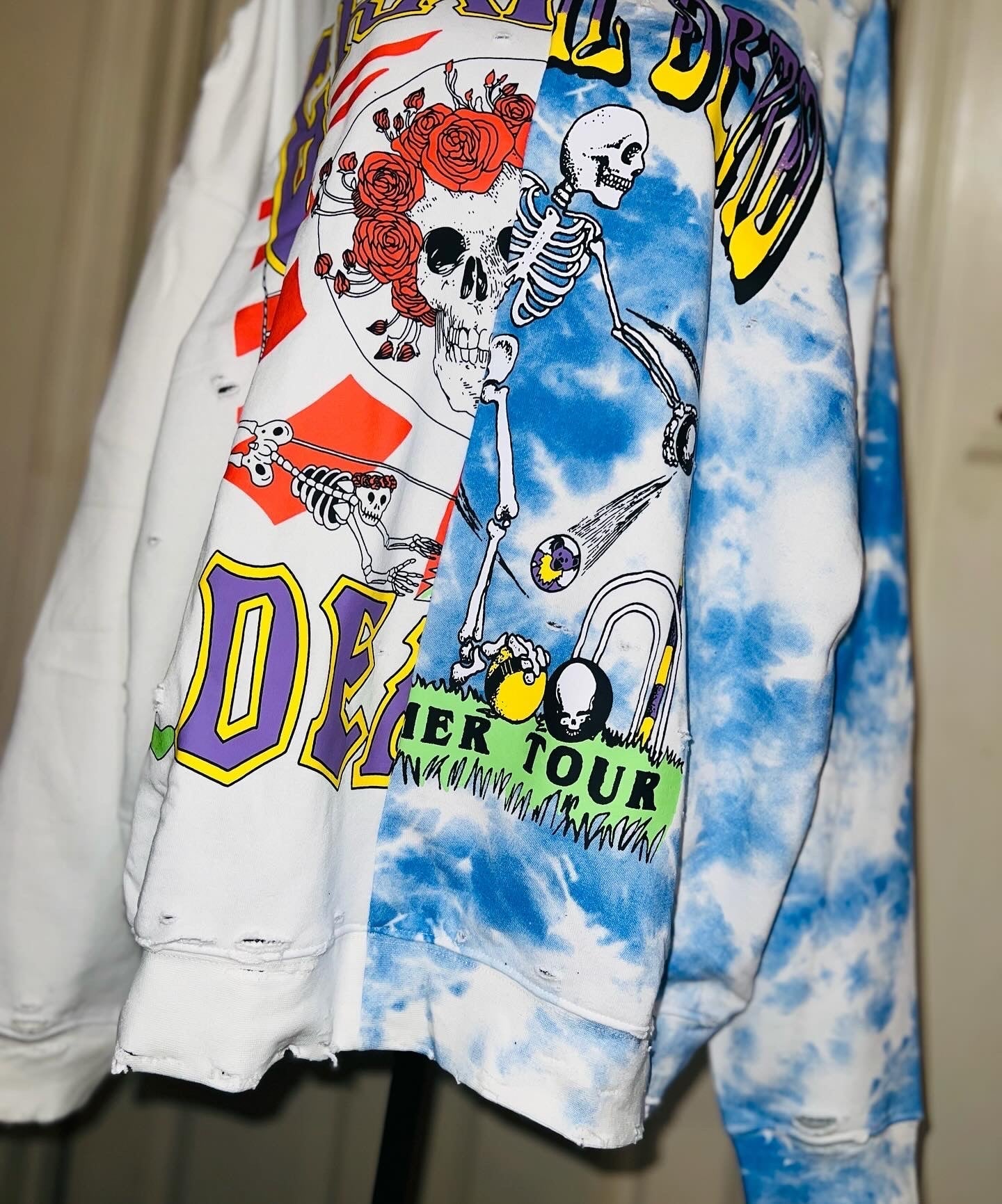 This is a preorder. Please allow extra processing time for shipping. I’m obsessed with this. A split Grateful Dead sweatshirt with basically all their iconic symbols in one. The roses skeleton, bears, bocce ball everything! Oversized. I have two available, some of the last around! L/XL. So comfy and pretty.
