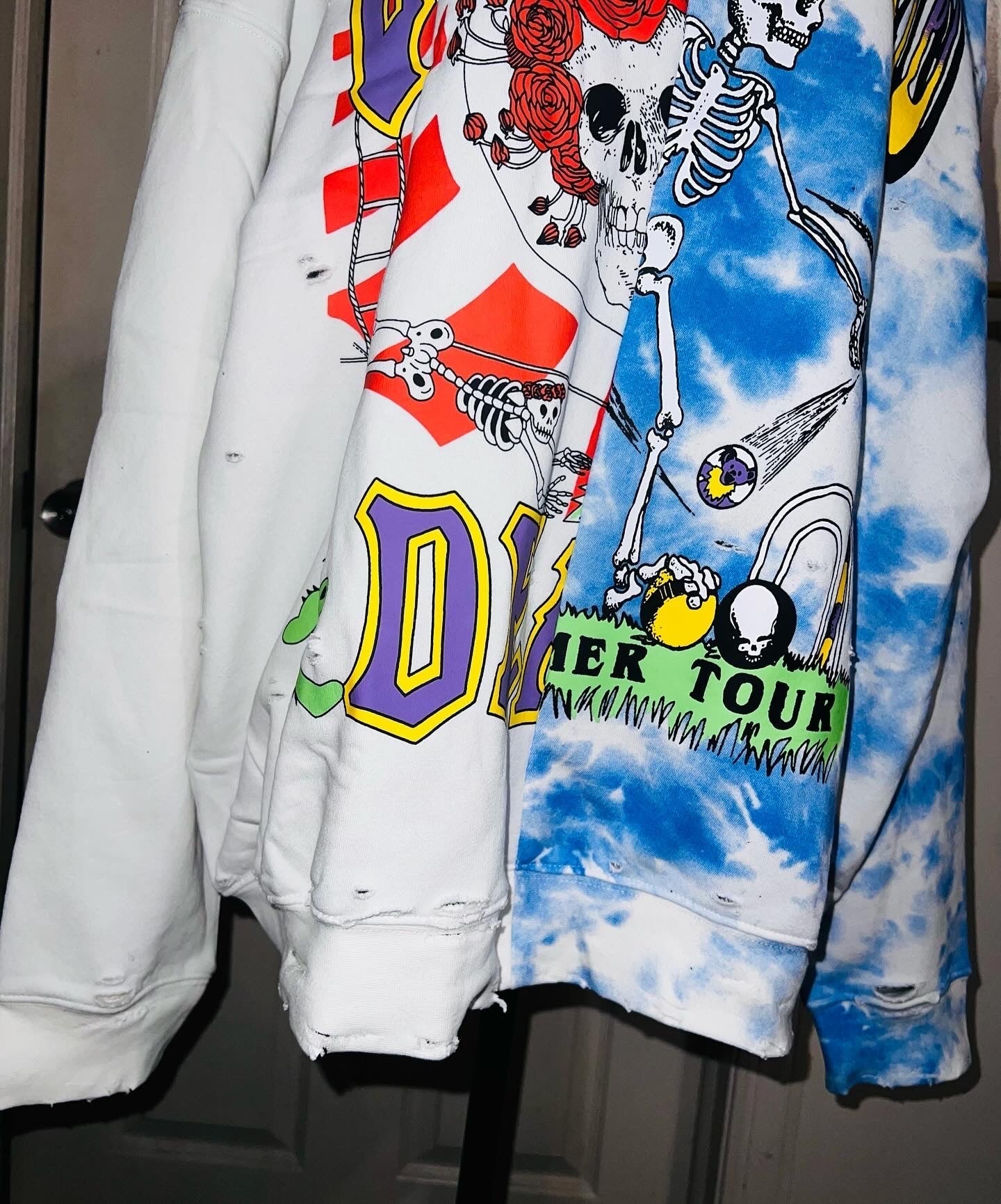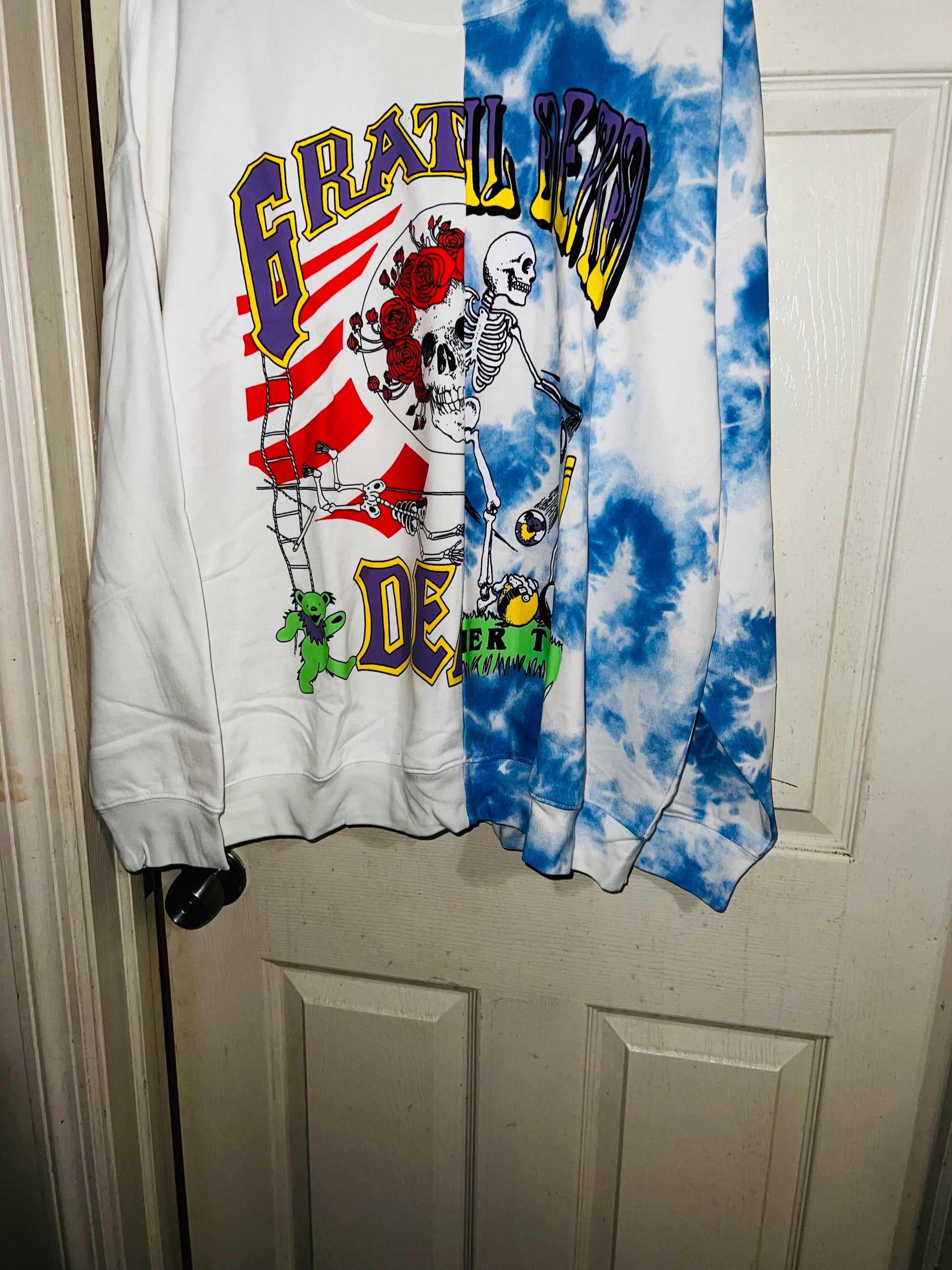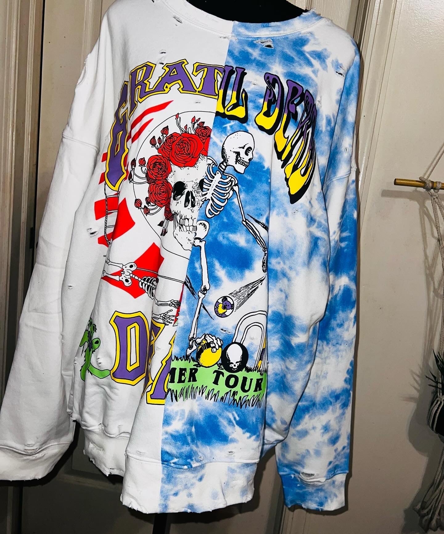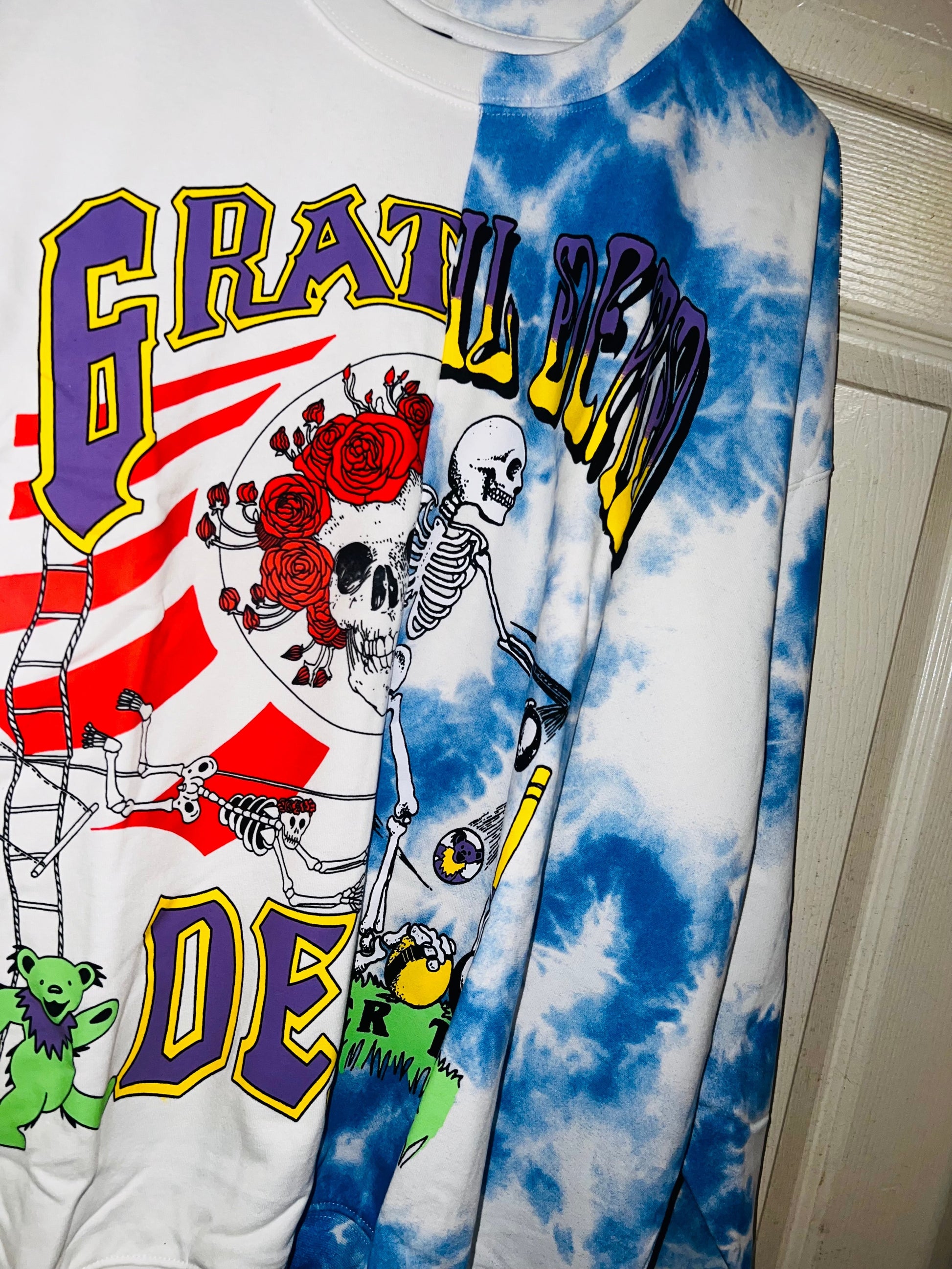 This is a preorder. Please allow extra processing time for shipping. I’m obsessed with this. A split Grateful Dead sweatshirt with basically all their iconic symbols in one. The roses skeleton, bears, bocce ball everything! Oversized. I have two available, some of the last around! L/XL. So comfy and pretty.
