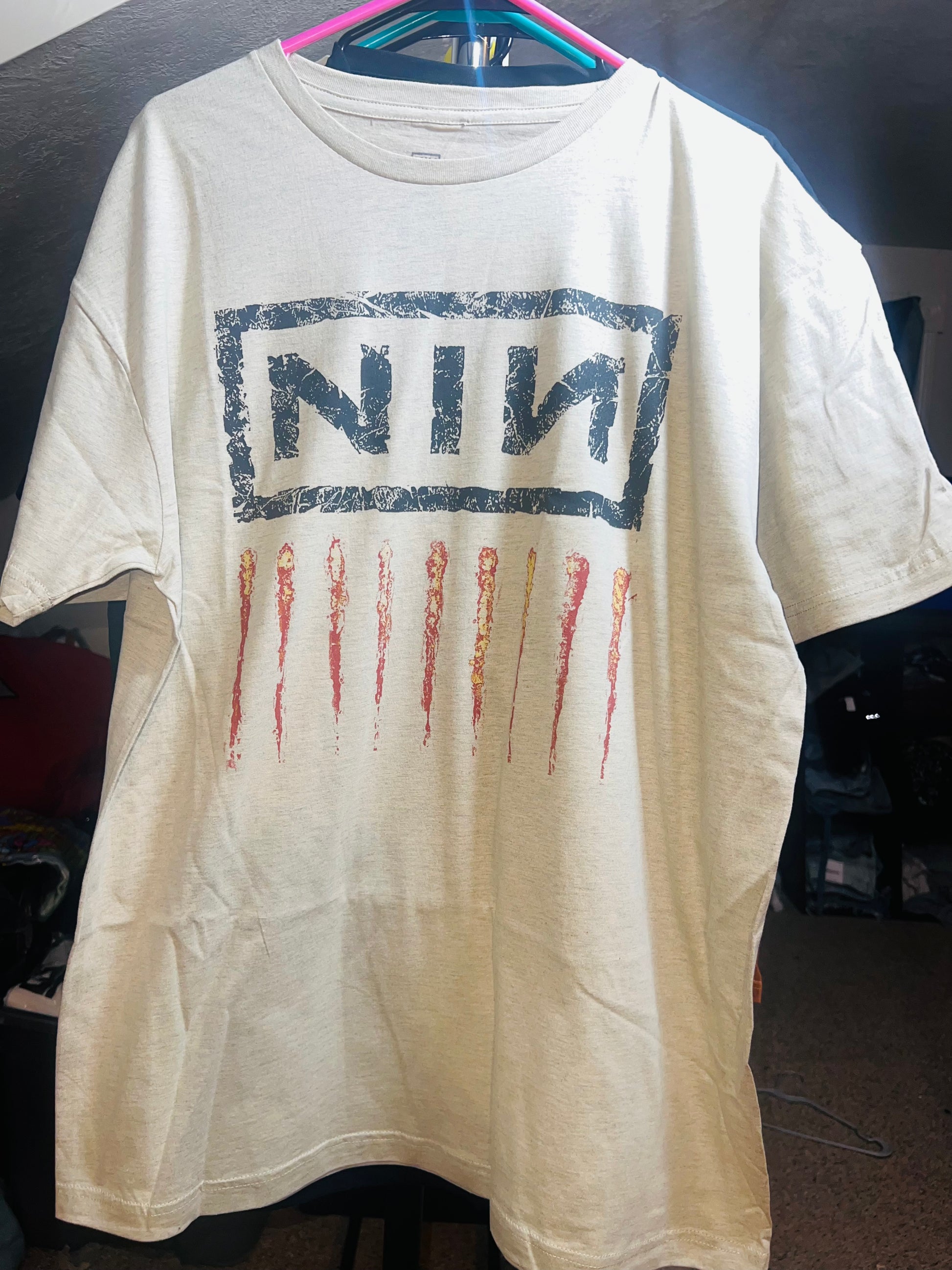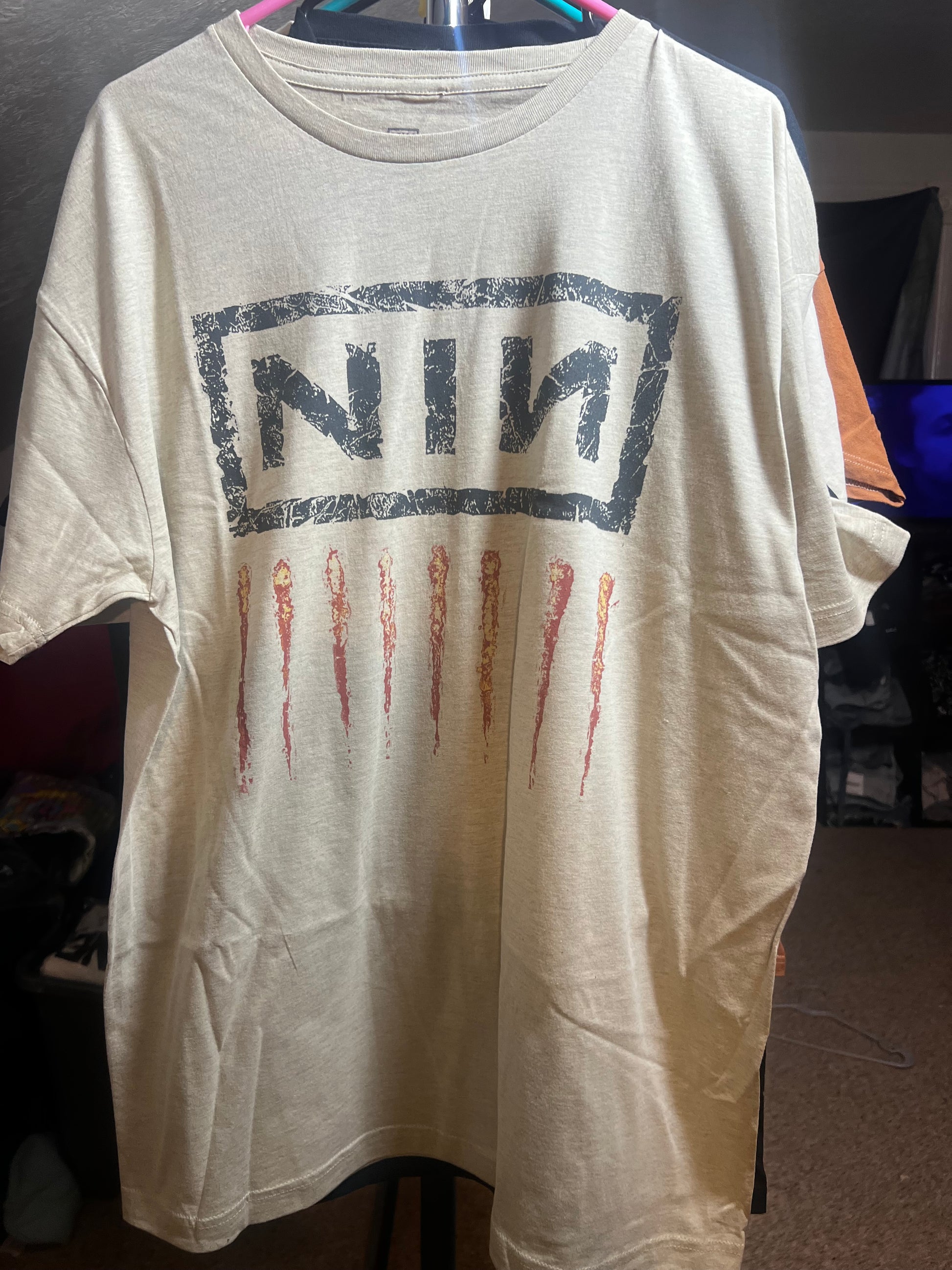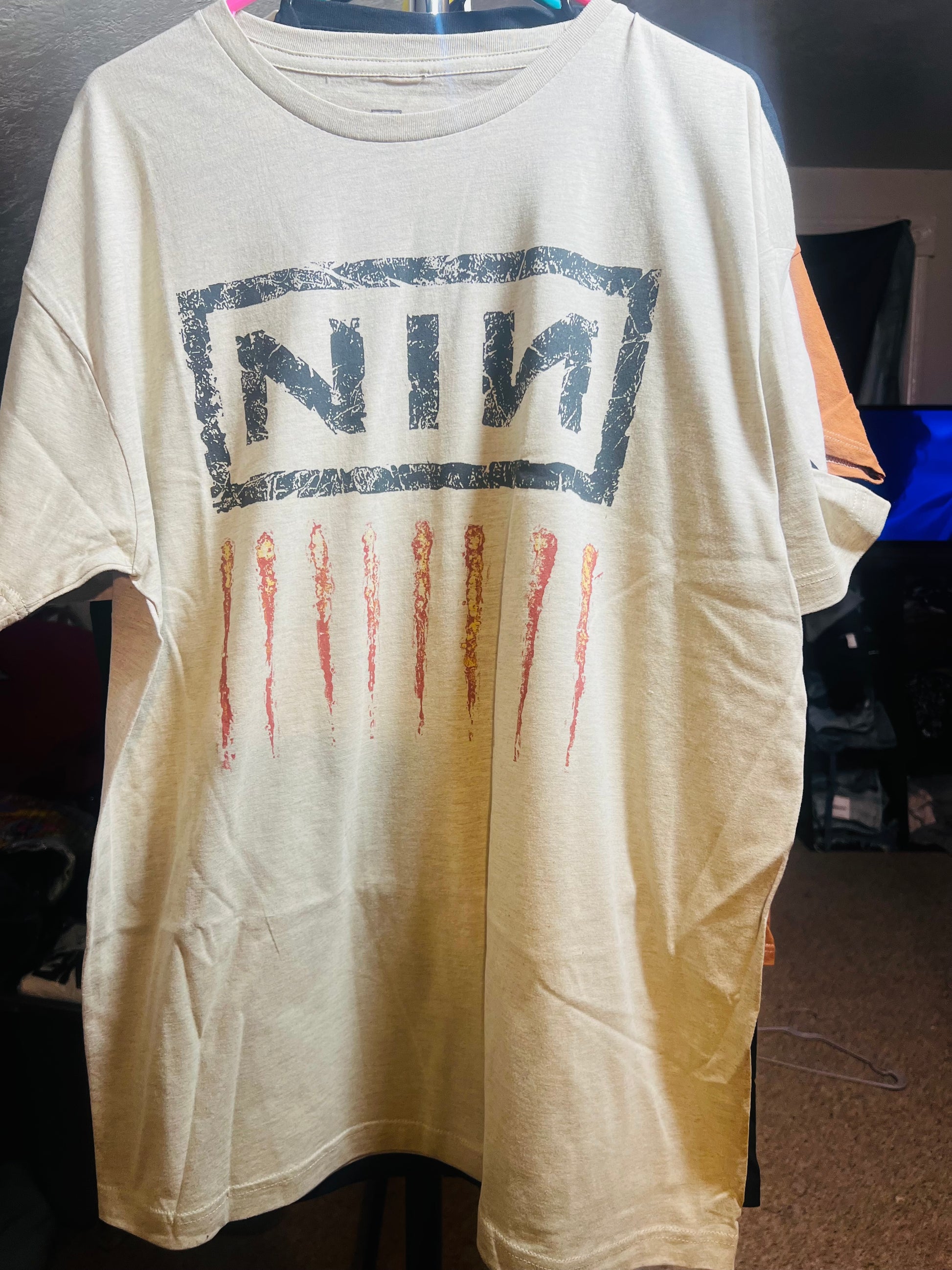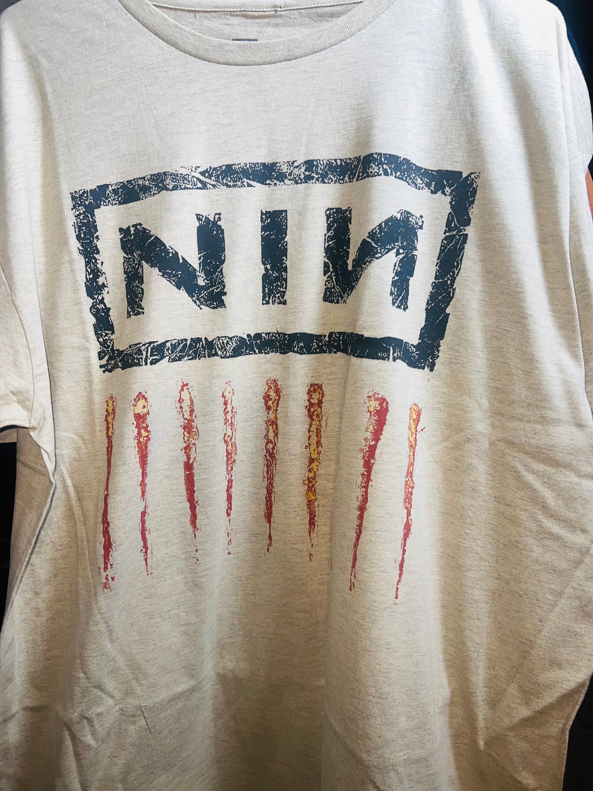 Add a lighter version of your fave Nine Inch Nails tee with this oatmeal style. It has the NIN acronym and nine scratch marks below Oversized and soft! NIN goes fast. Size Xl, oversized.