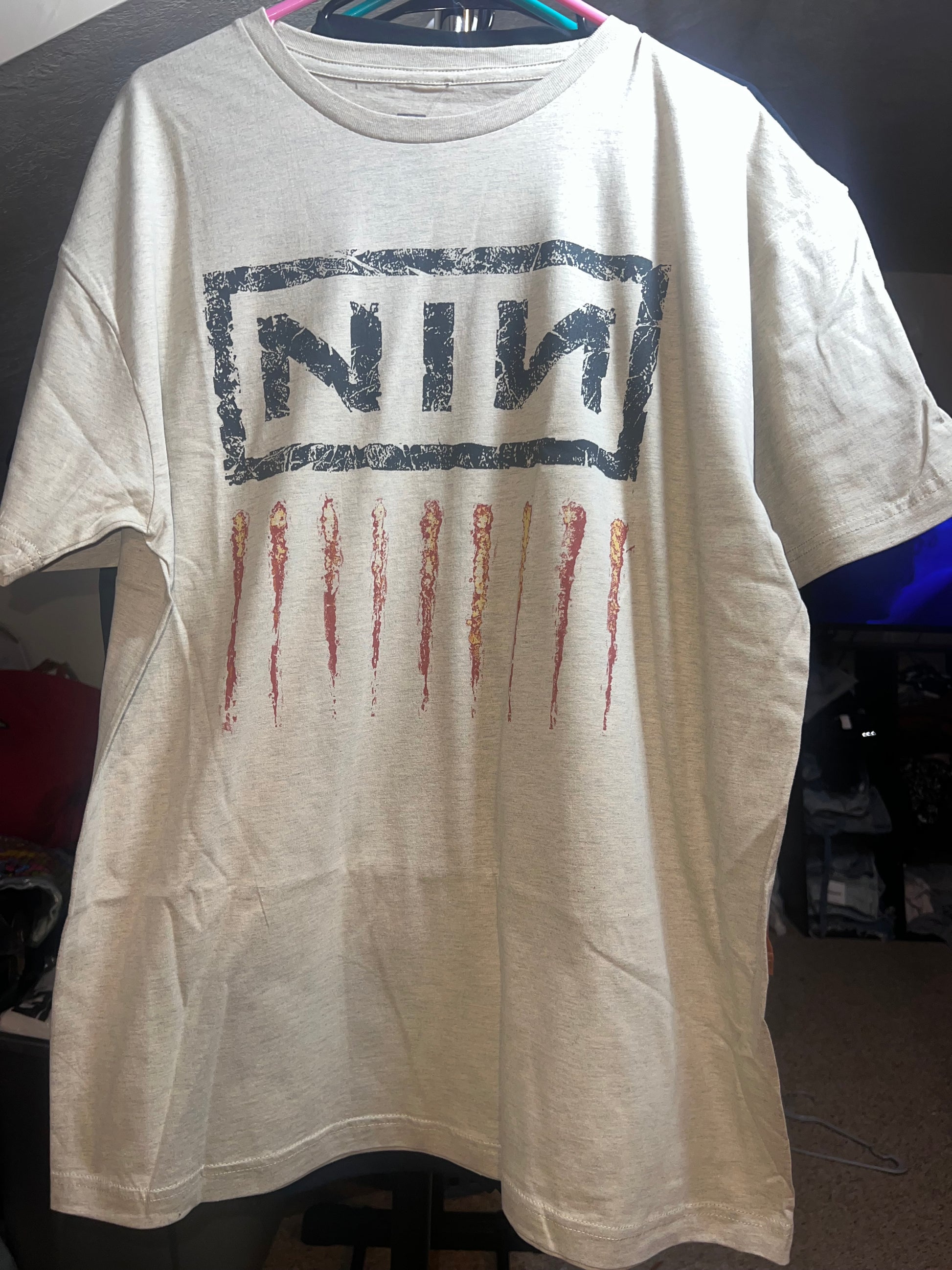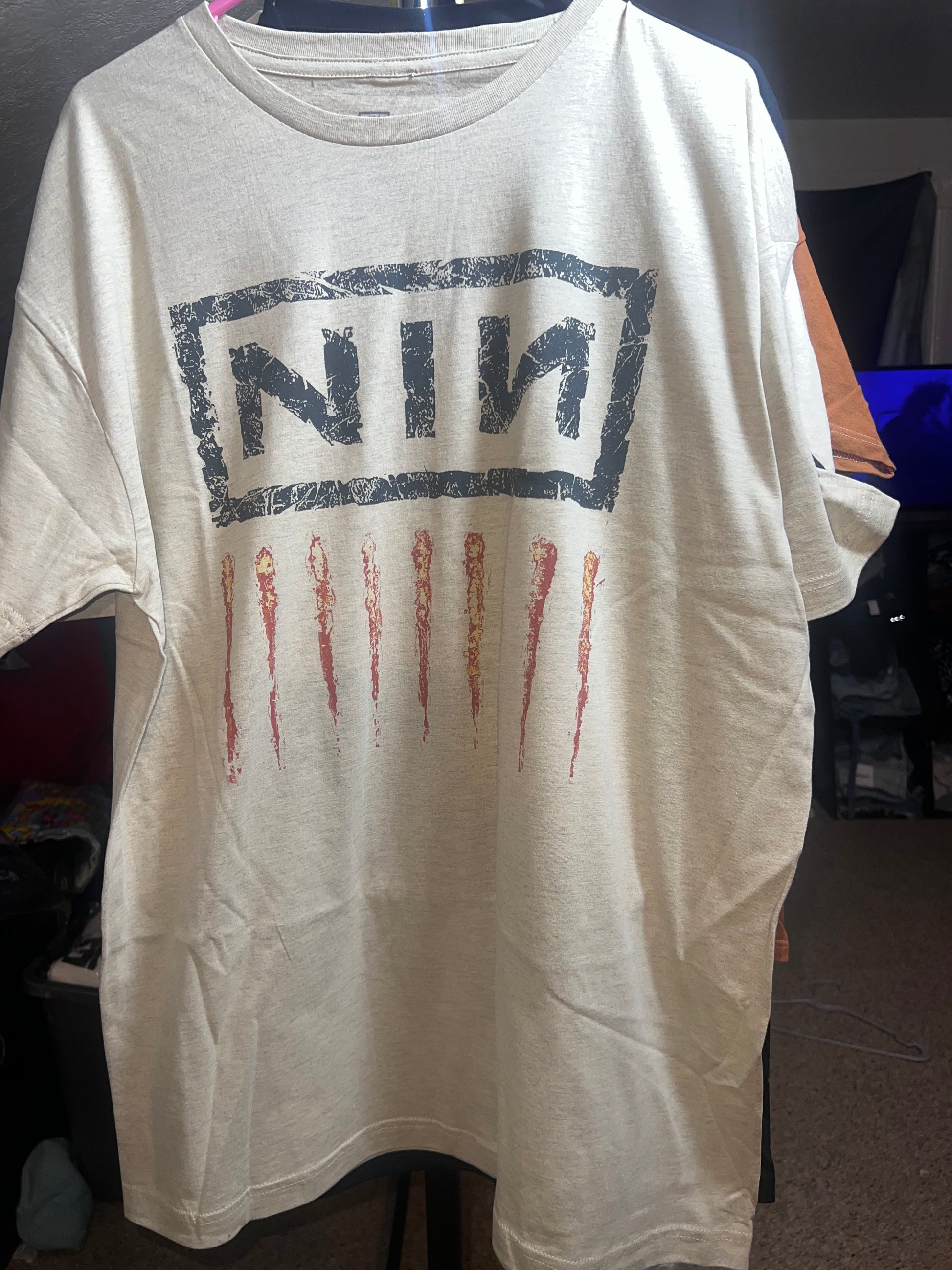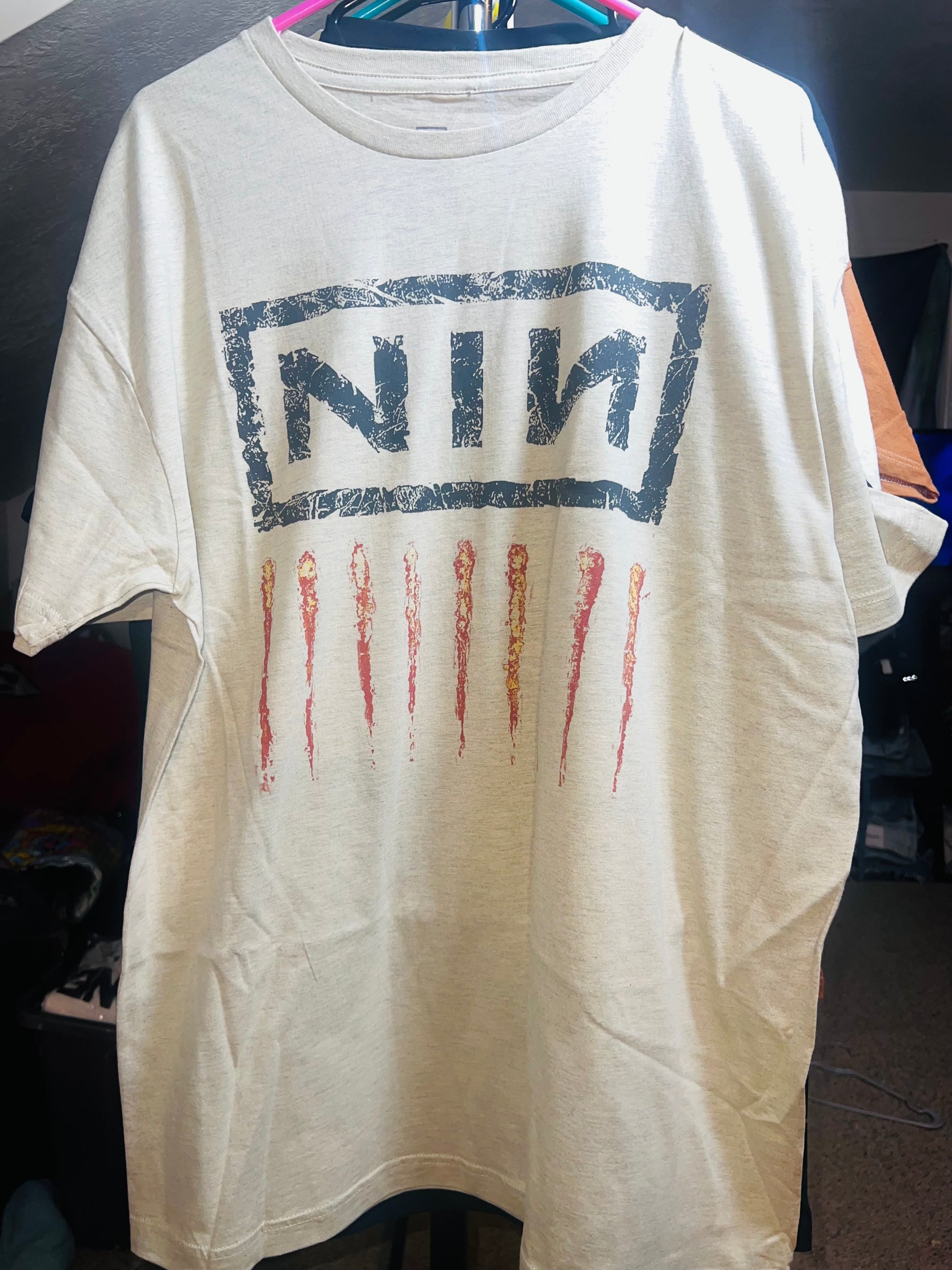 Add a lighter version of your fave Nine Inch Nails tee with this oatmeal style. It has the NIN acronym and nine scratch marks below Oversized and soft! NIN goes fast. Size Xl, oversized.