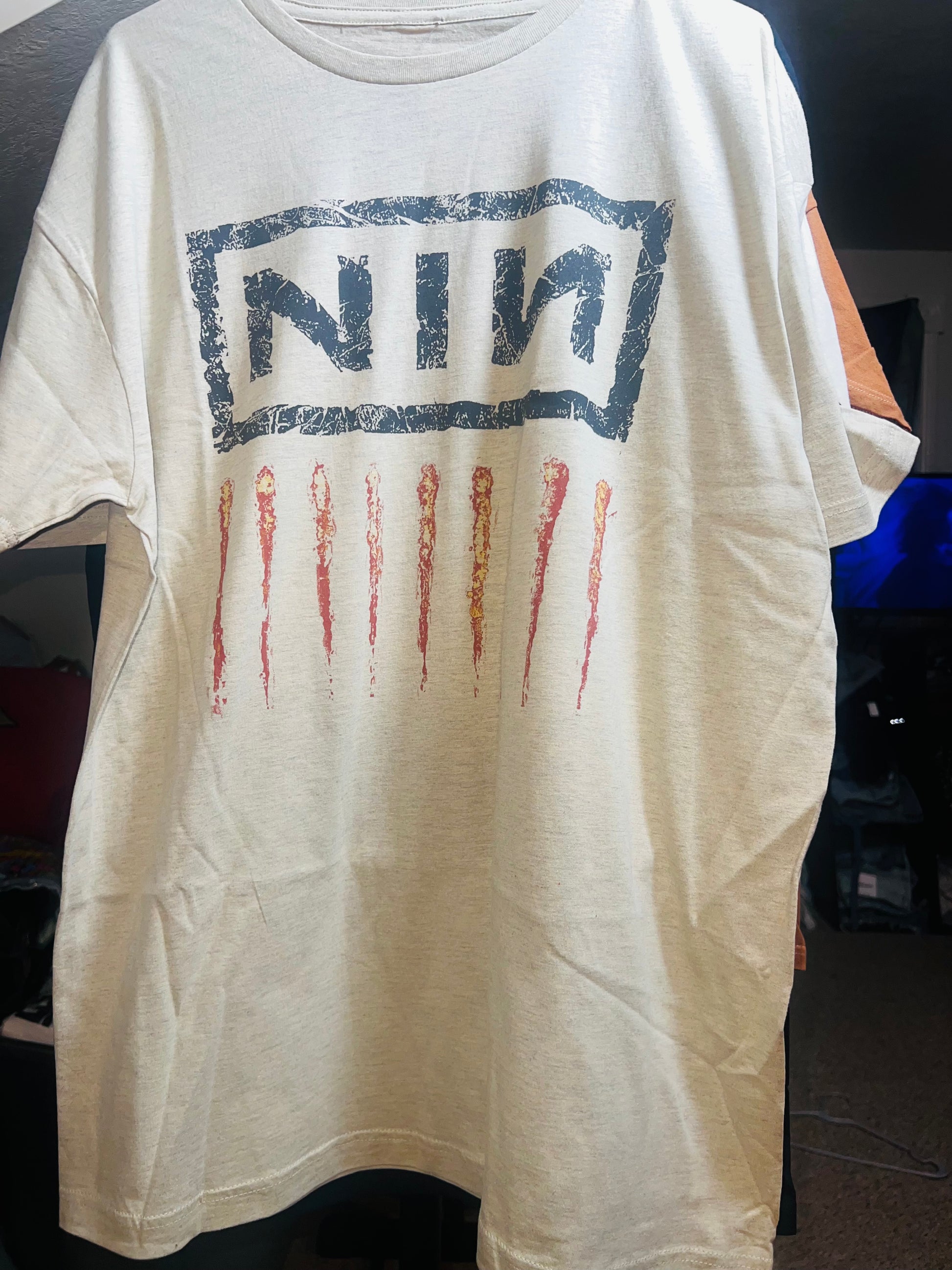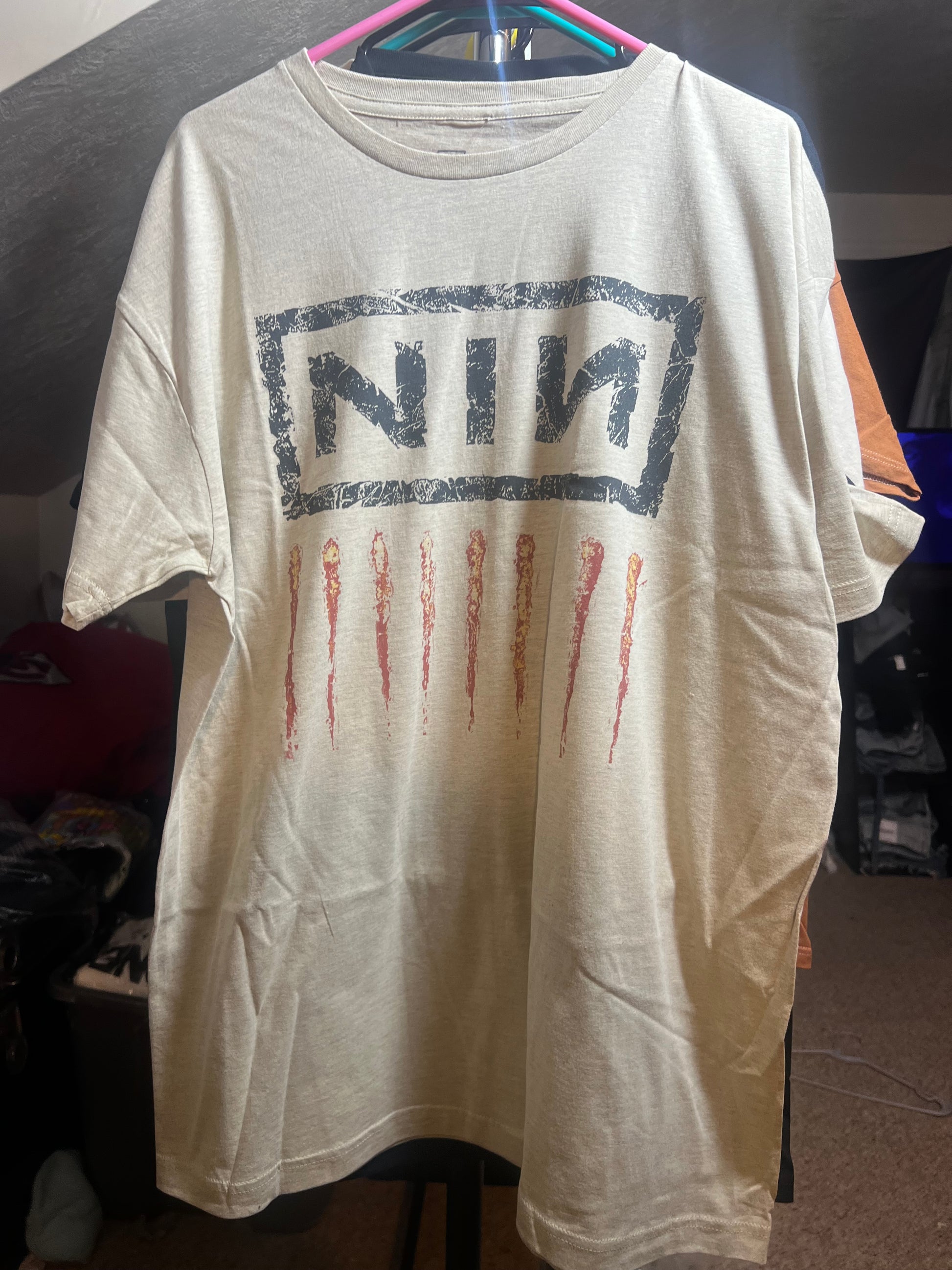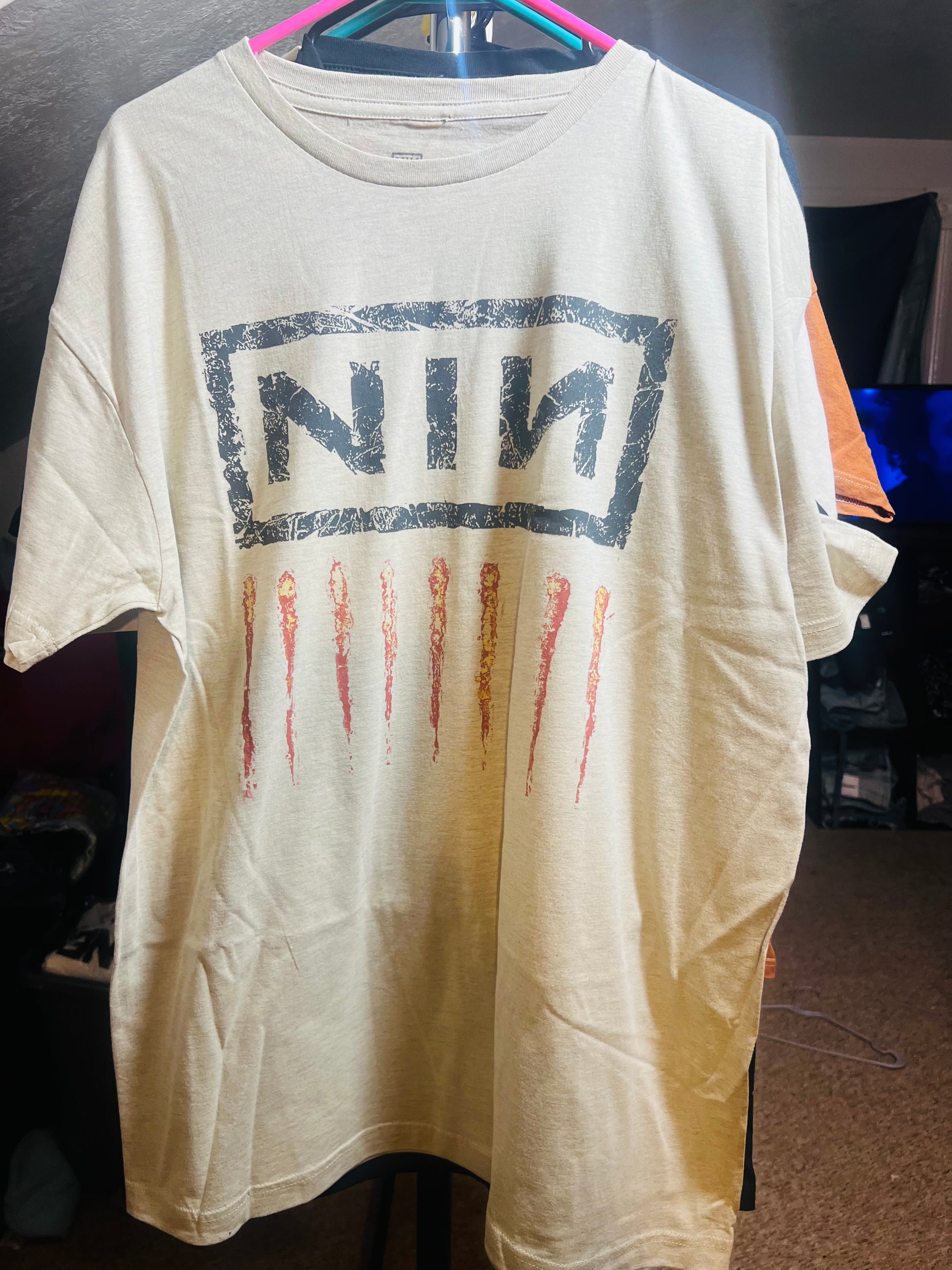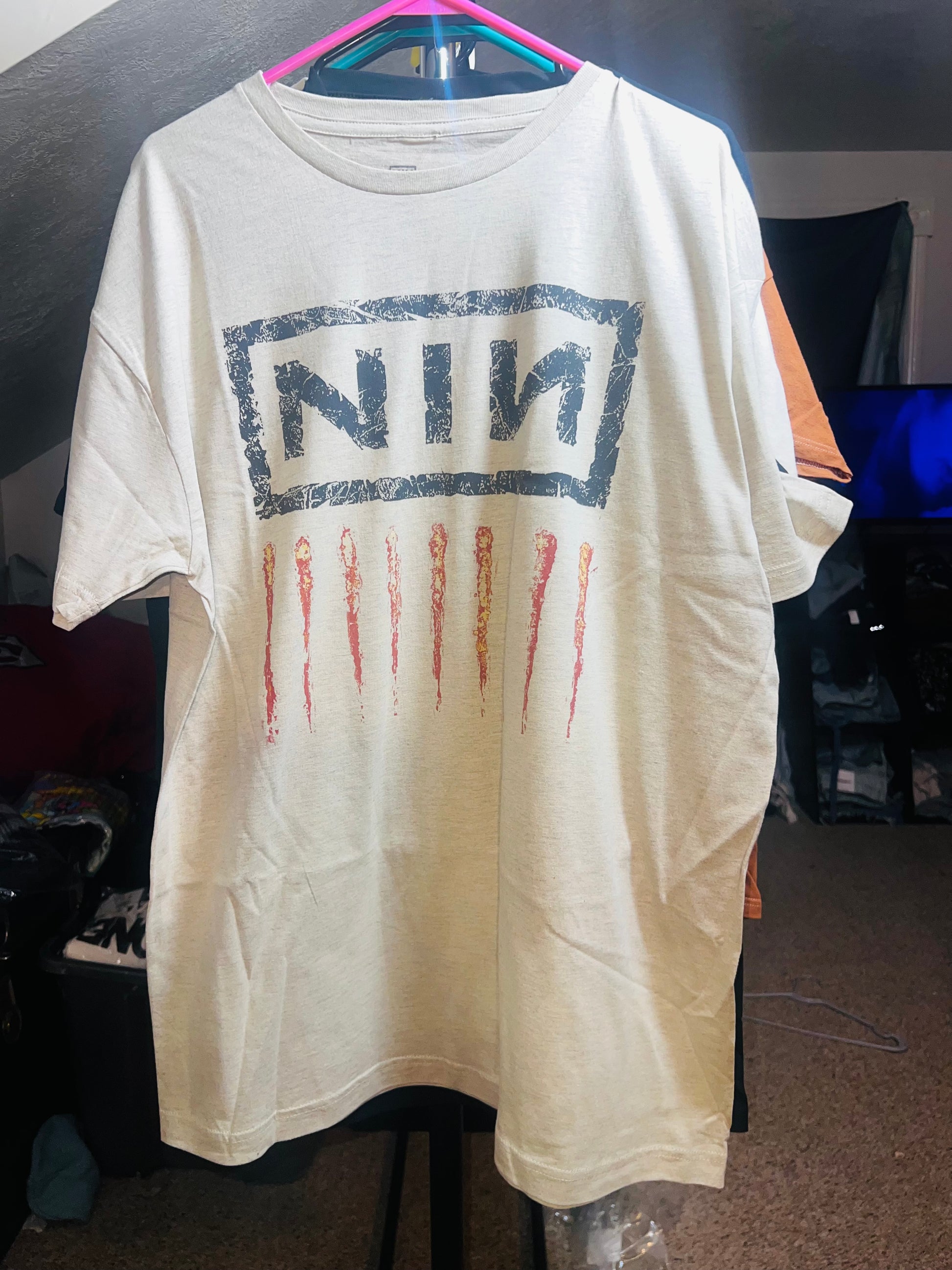 Add a lighter version of your fave Nine Inch Nails tee with this oatmeal style. It has the NIN acronym and nine scratch marks below Oversized and soft! NIN goes fast. Size Xl, oversized.