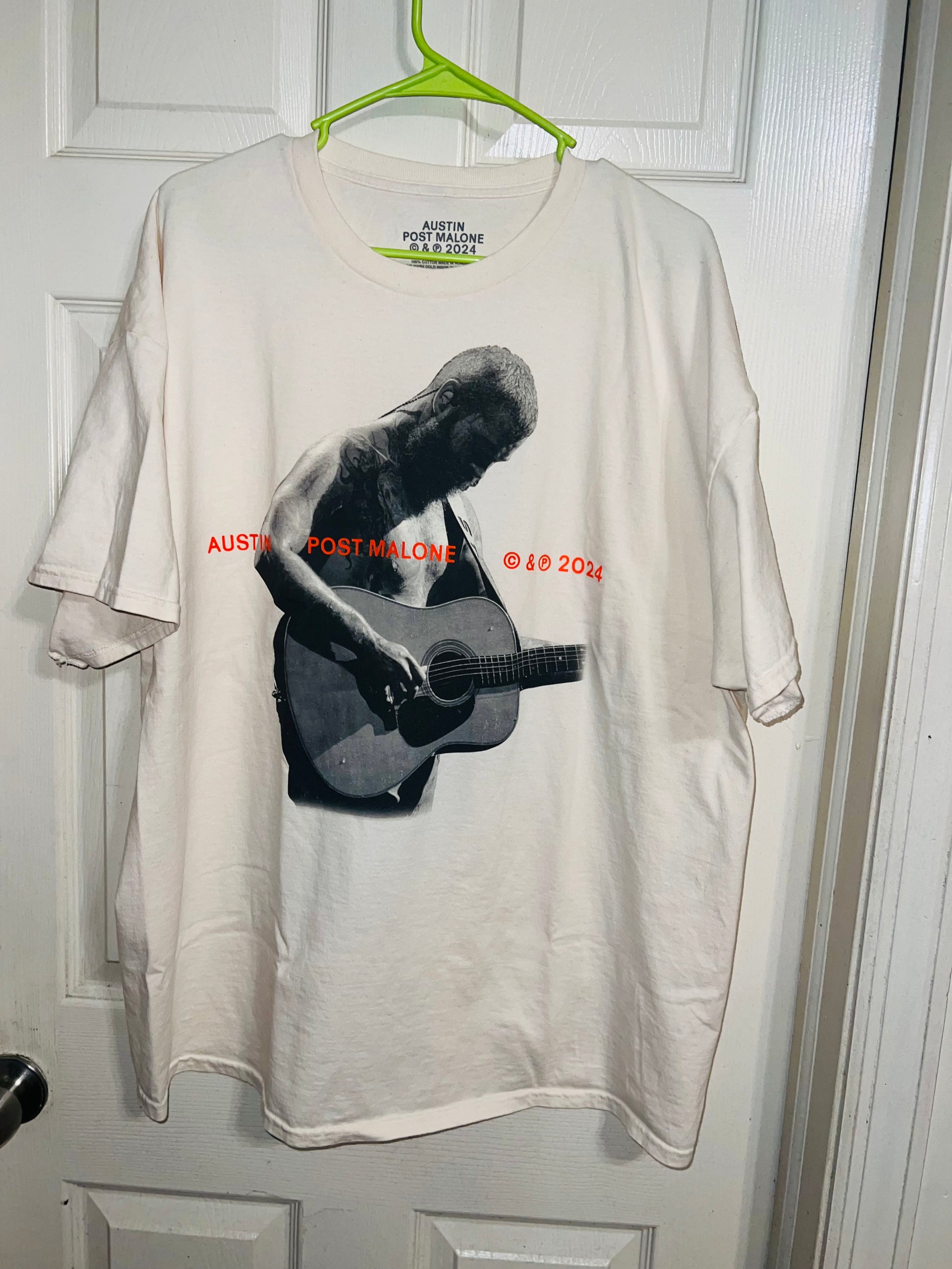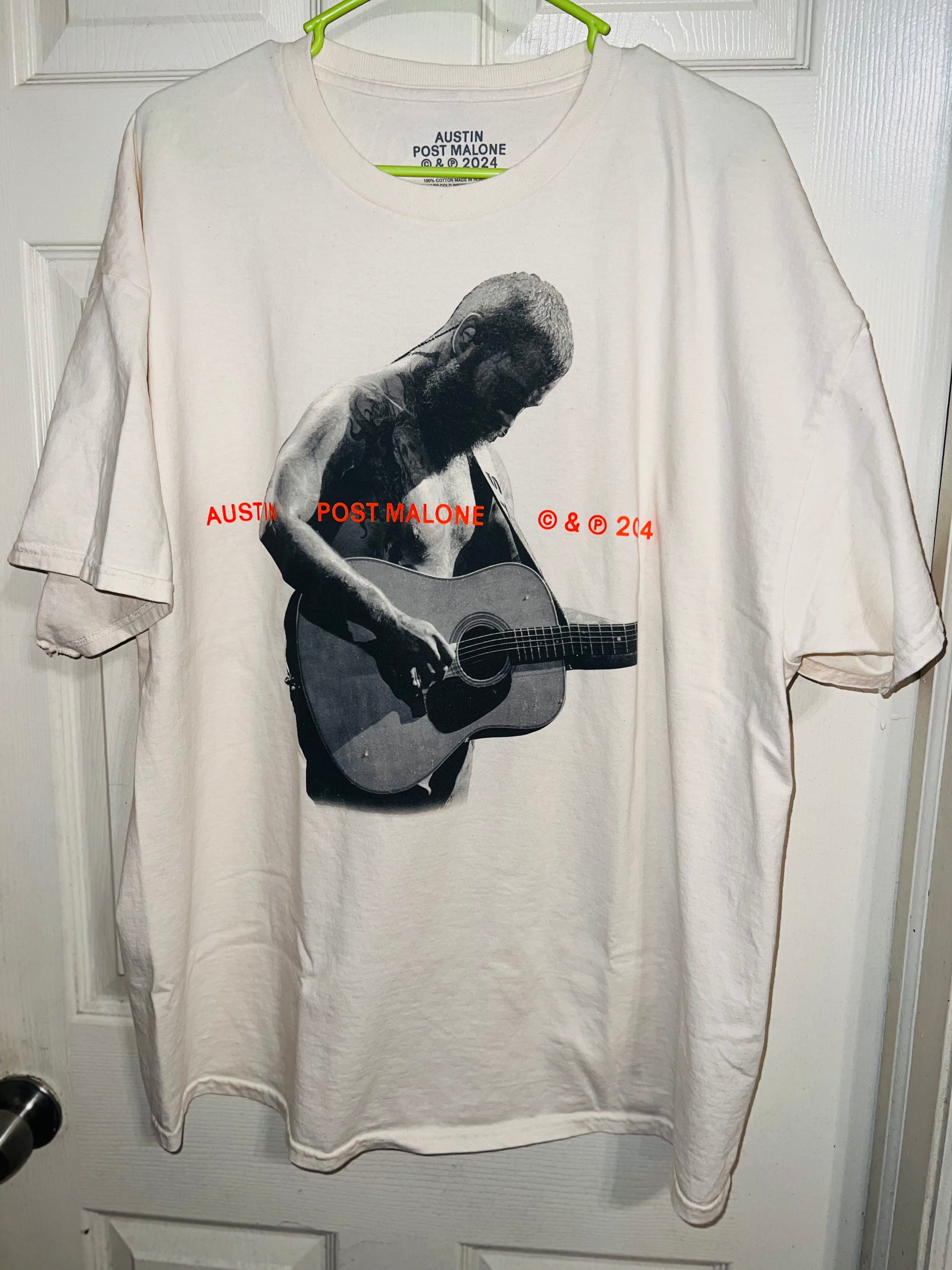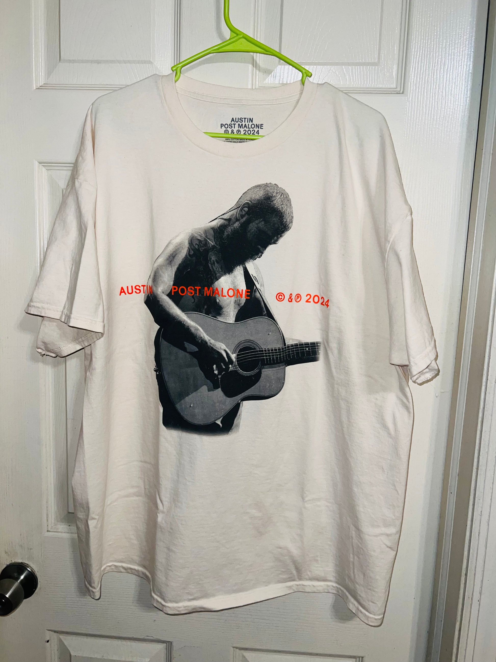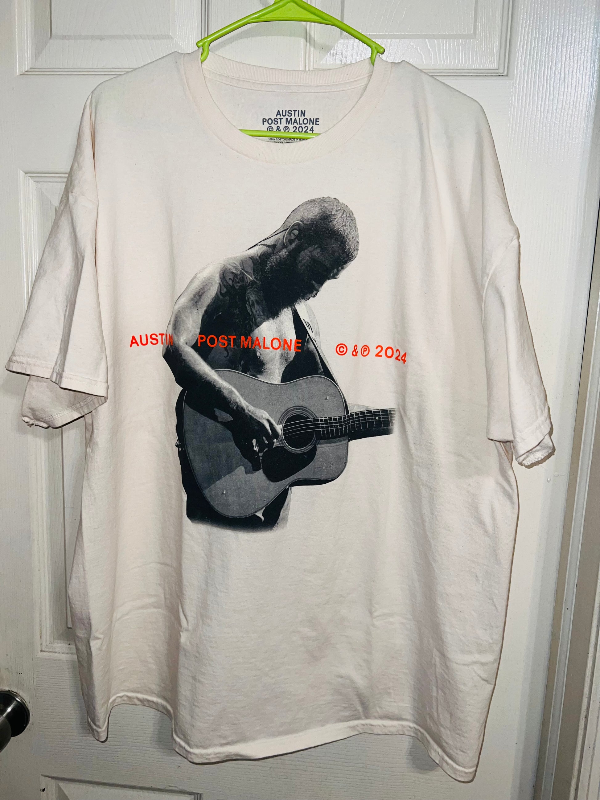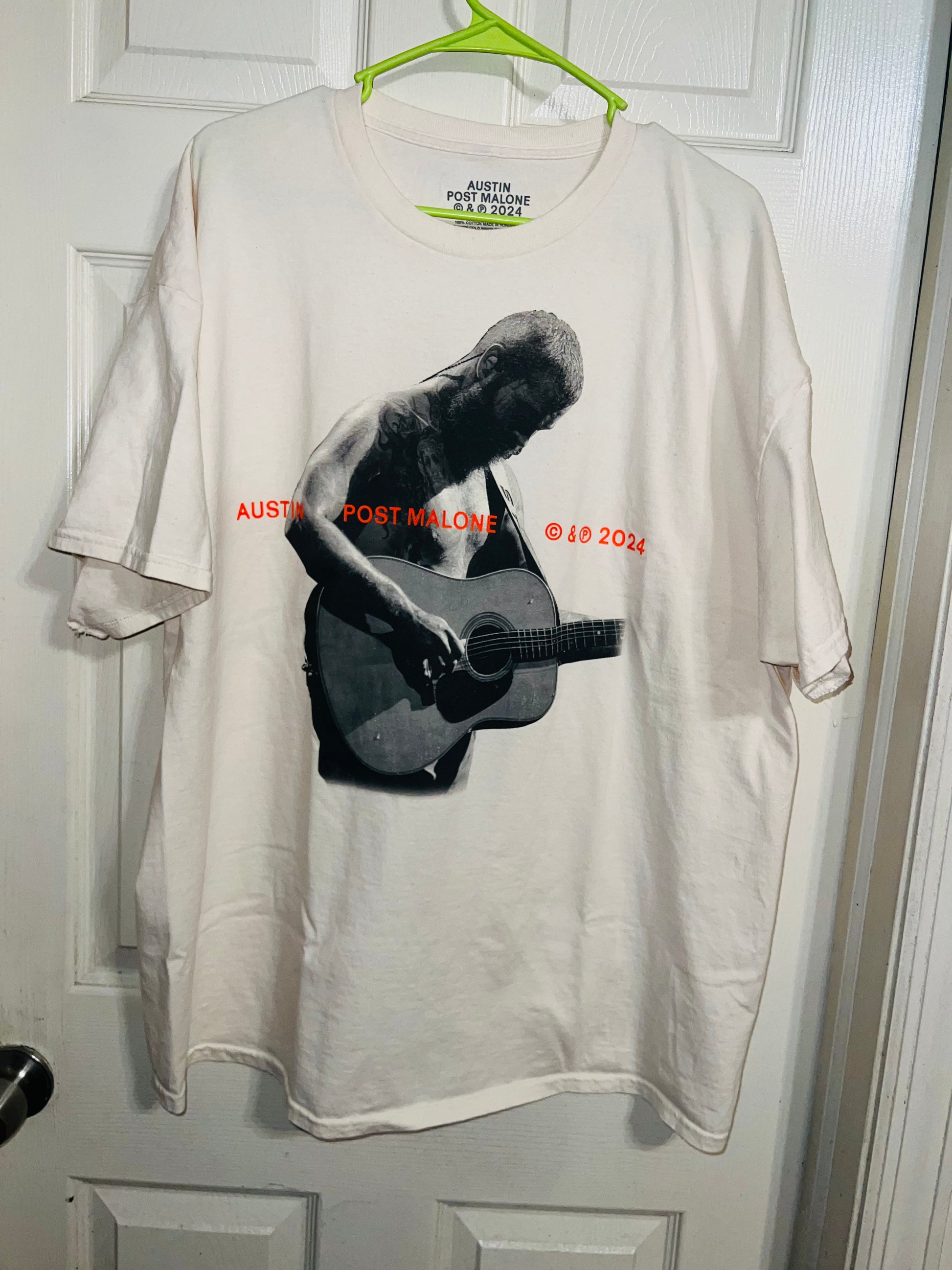 This is a preorder. Please allow extra processing time. An off white “natural” Post Malone tee with a photo of him playing the guitar on the front. Austin, 2024. One for this year! Size XL, oversized.