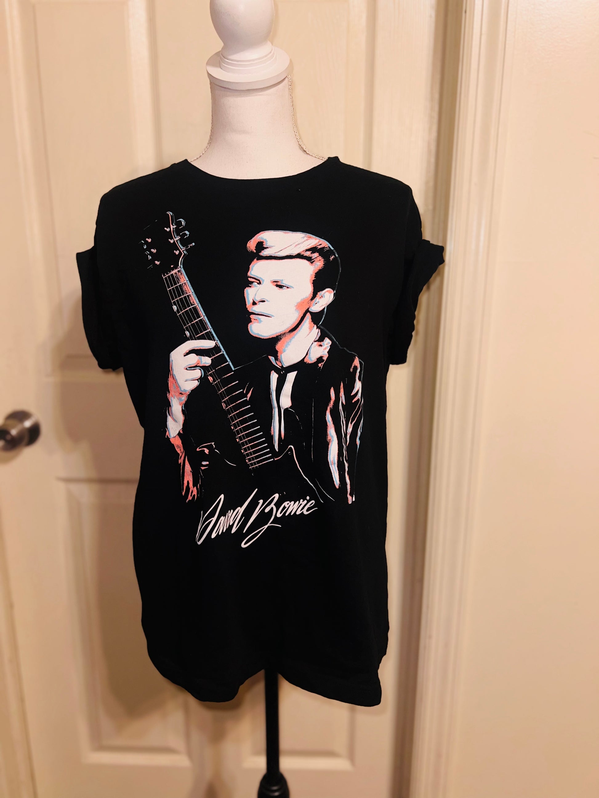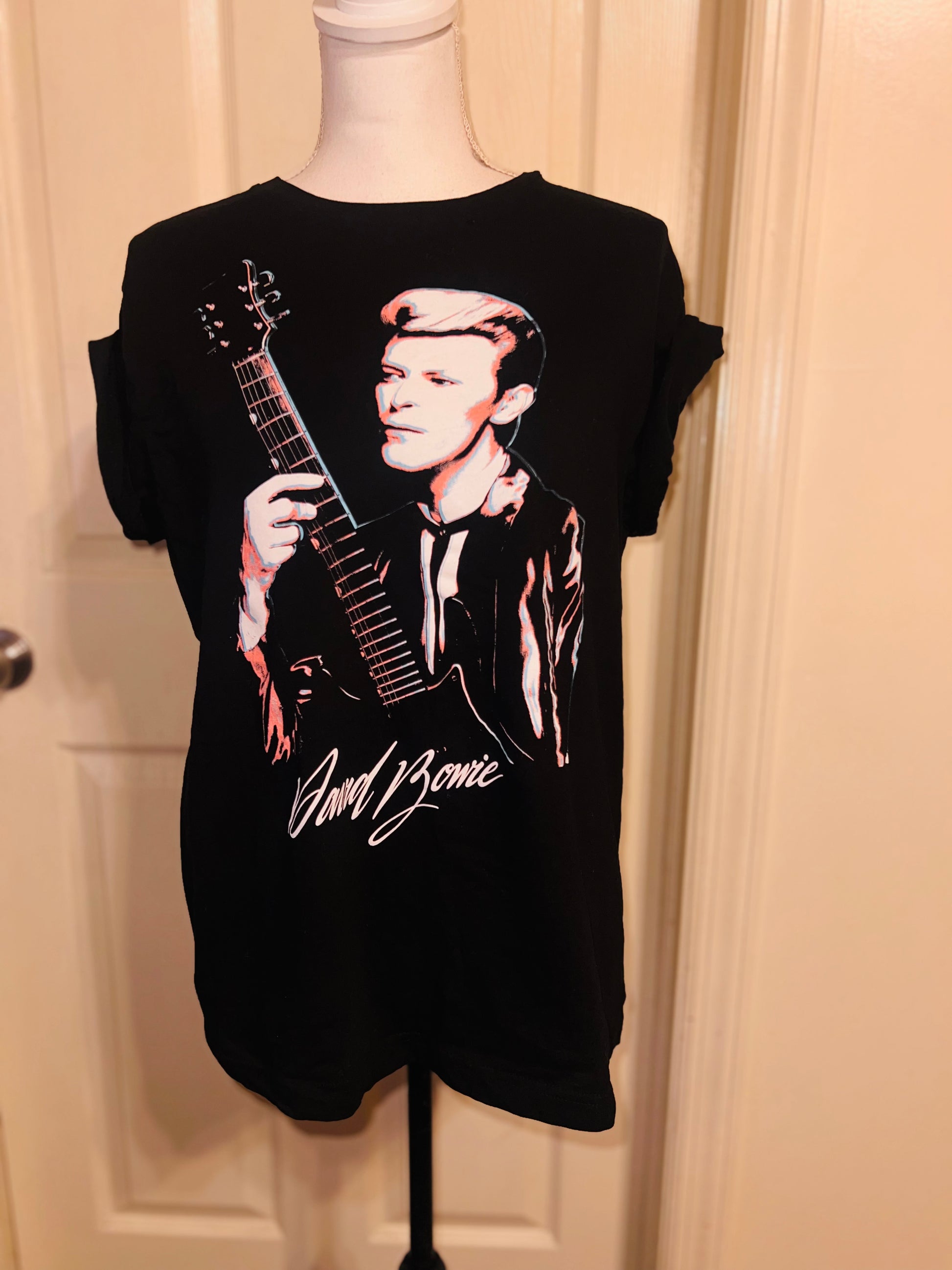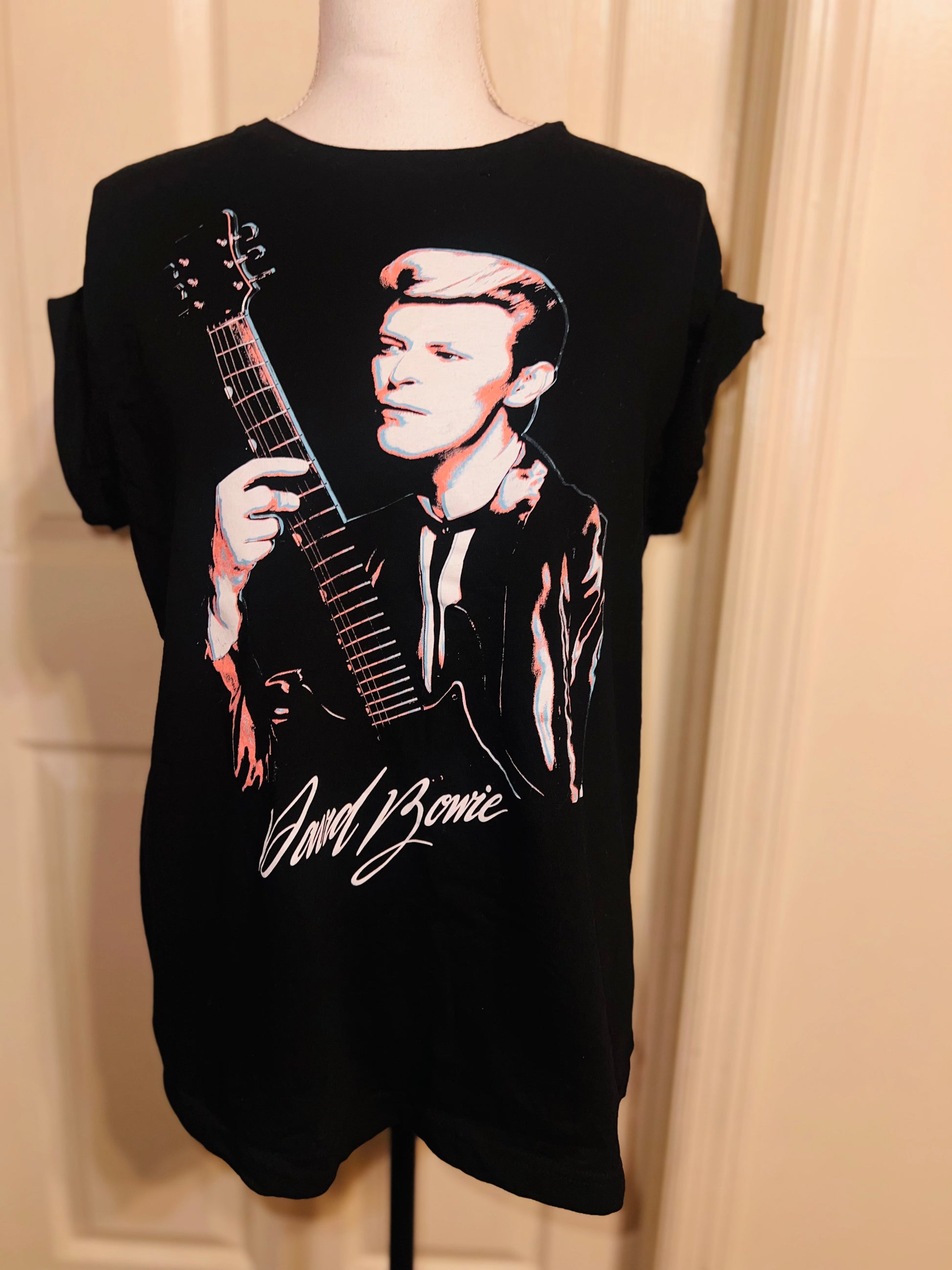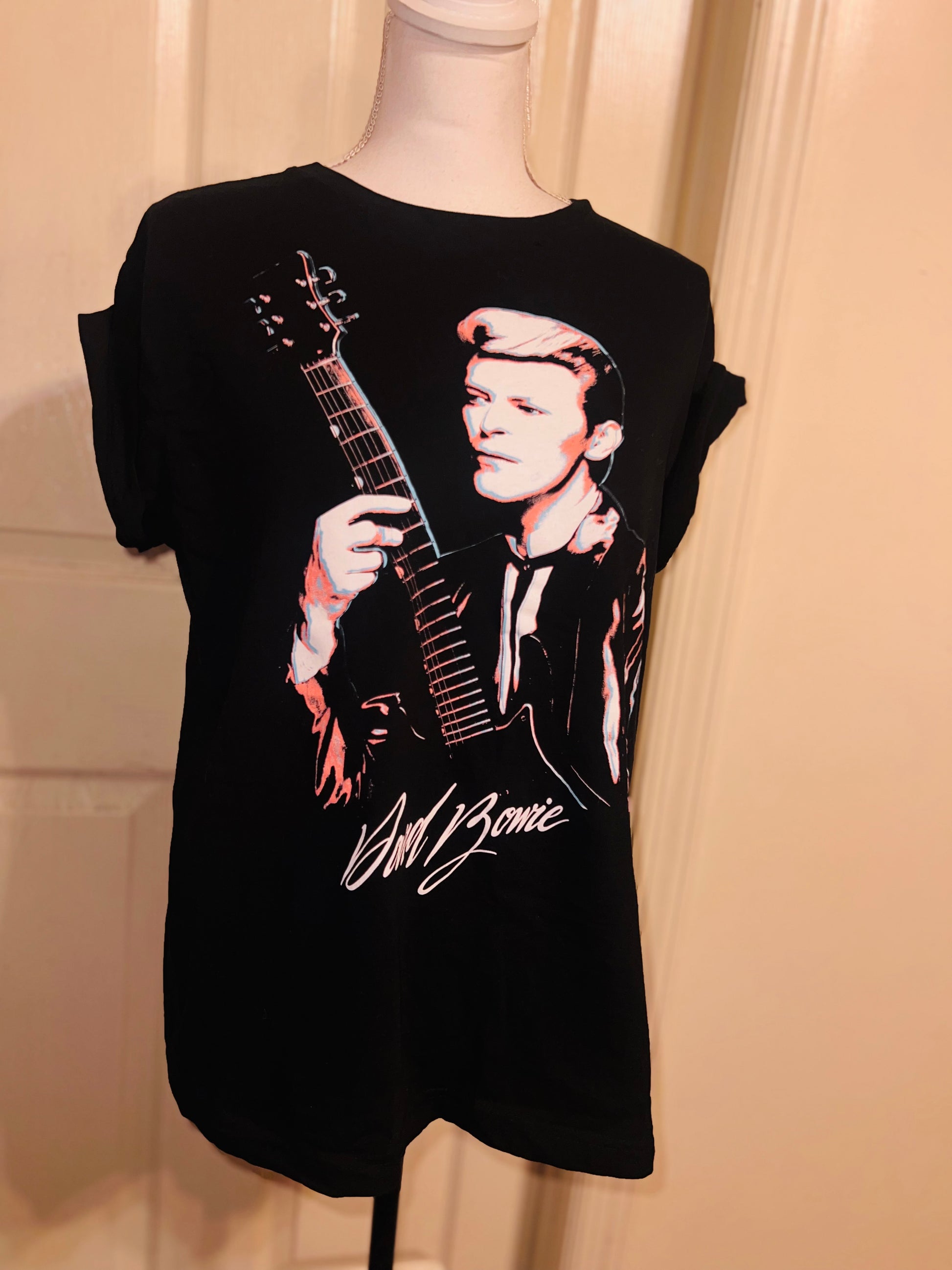 A black David Bowie tee, marked medium- fits a bit shorter and more like a small.