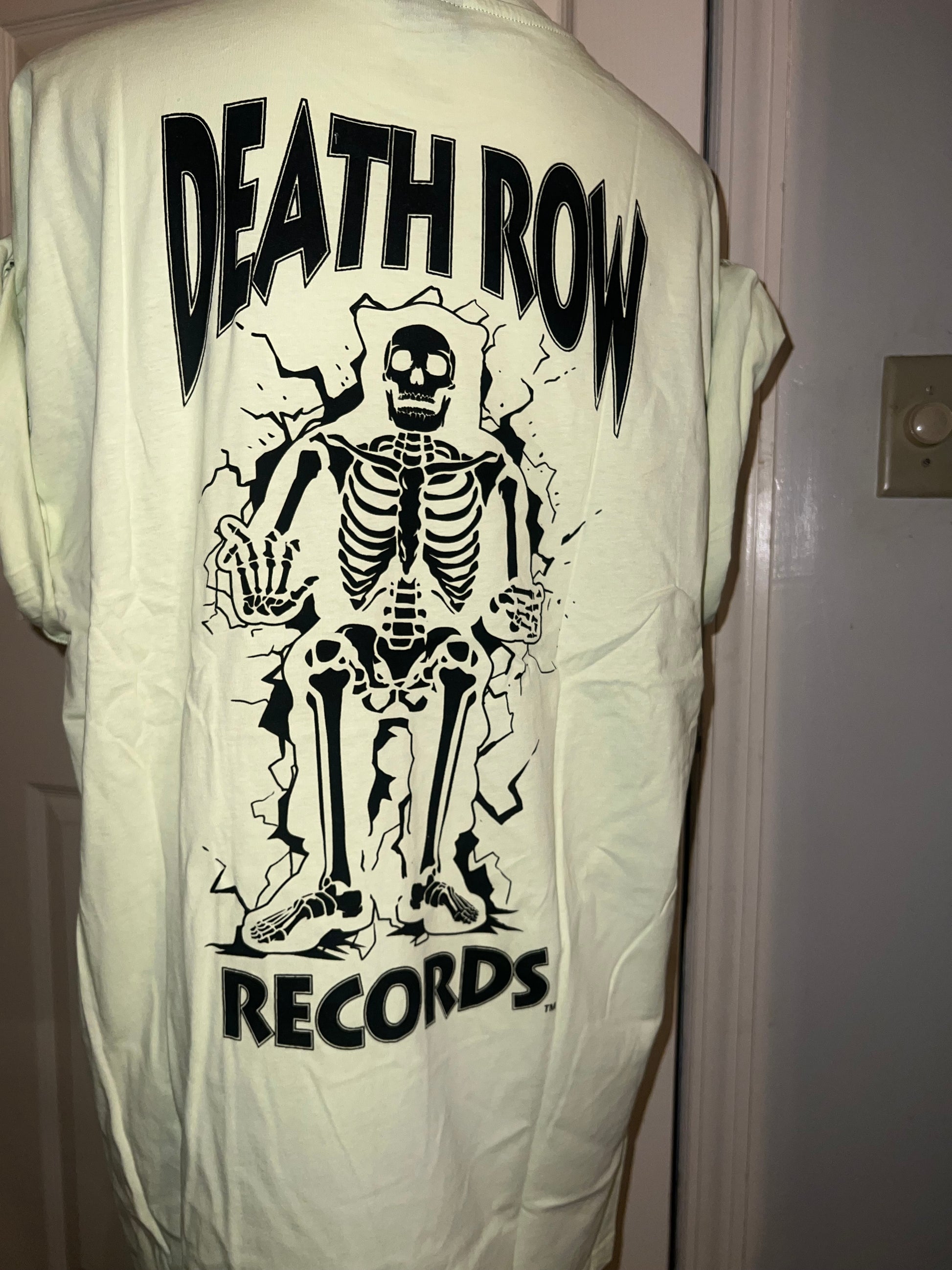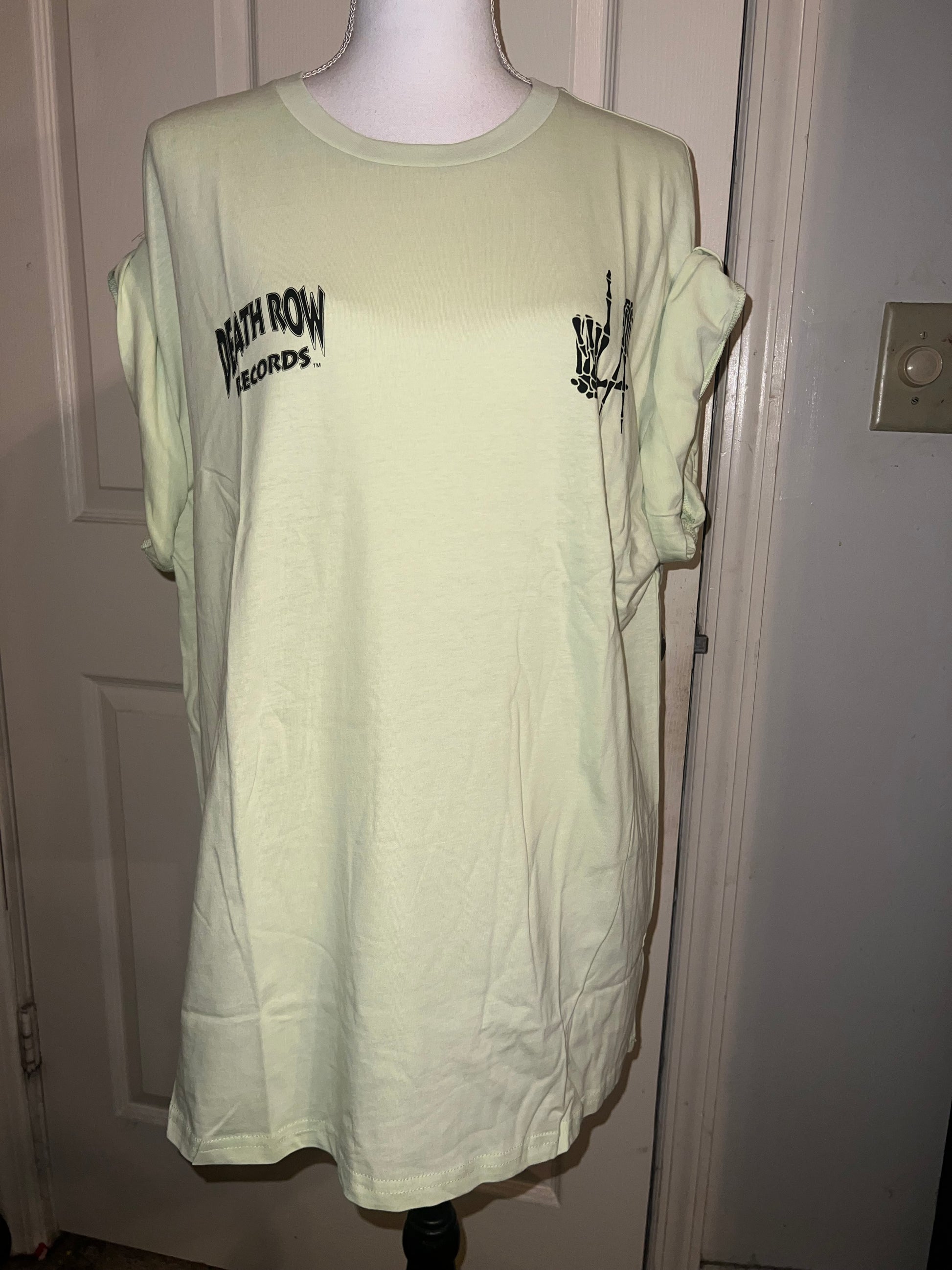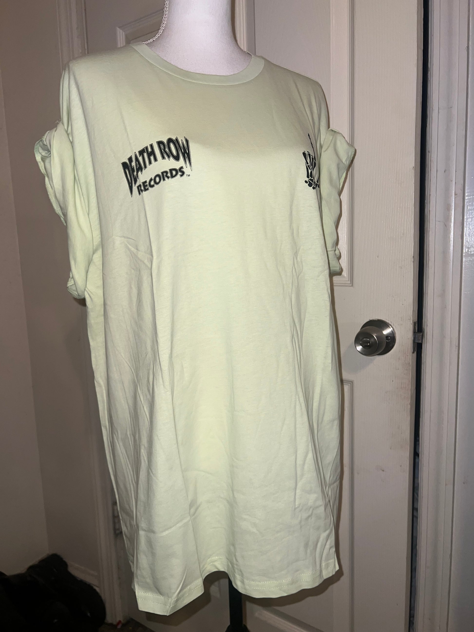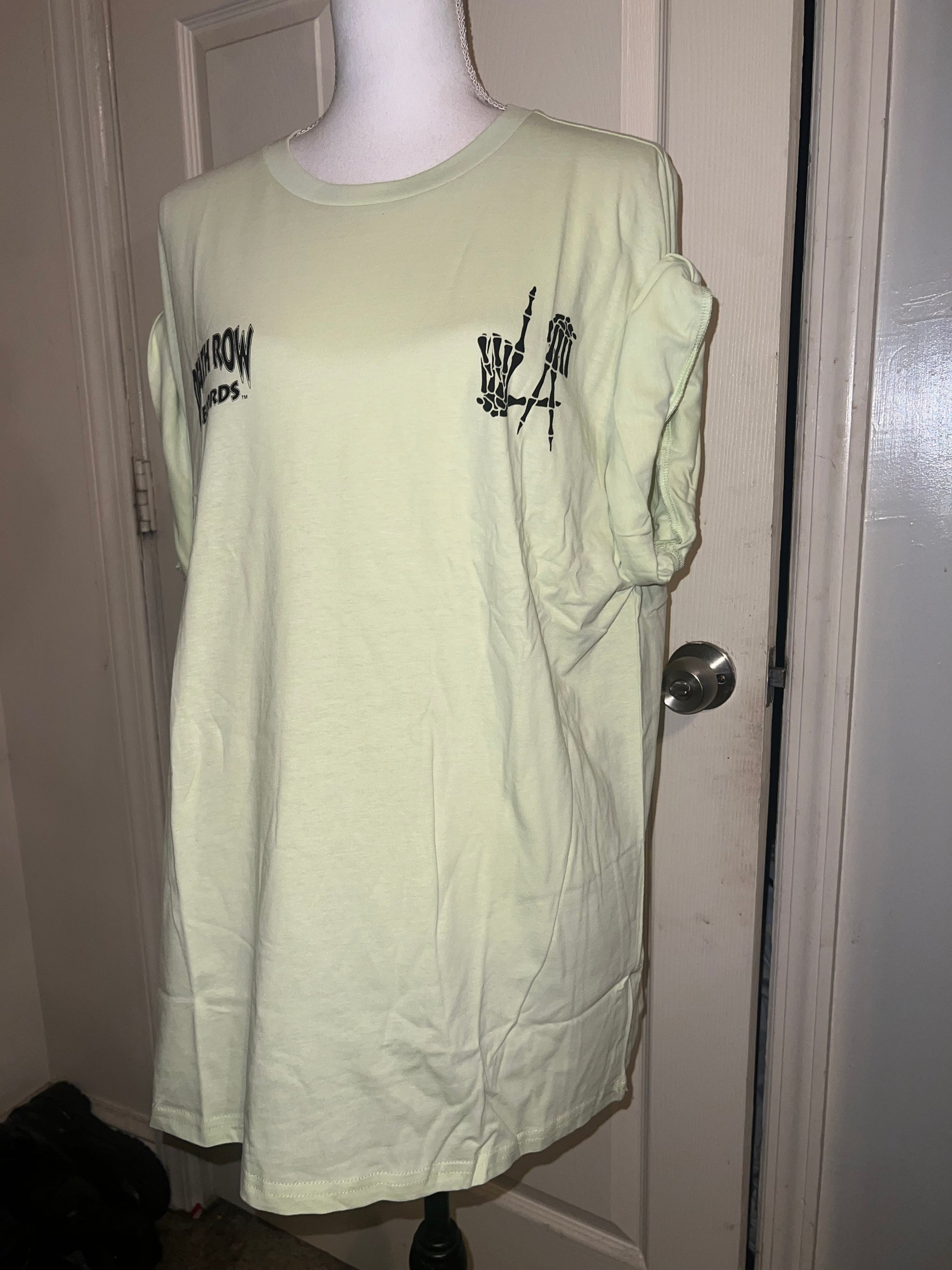 This sold super quick, it is now a pre-order. Please allow extra time for processing. A pretty pale green (it’s brighter in person) double sided Death Roe Records tee. Size L oversized.