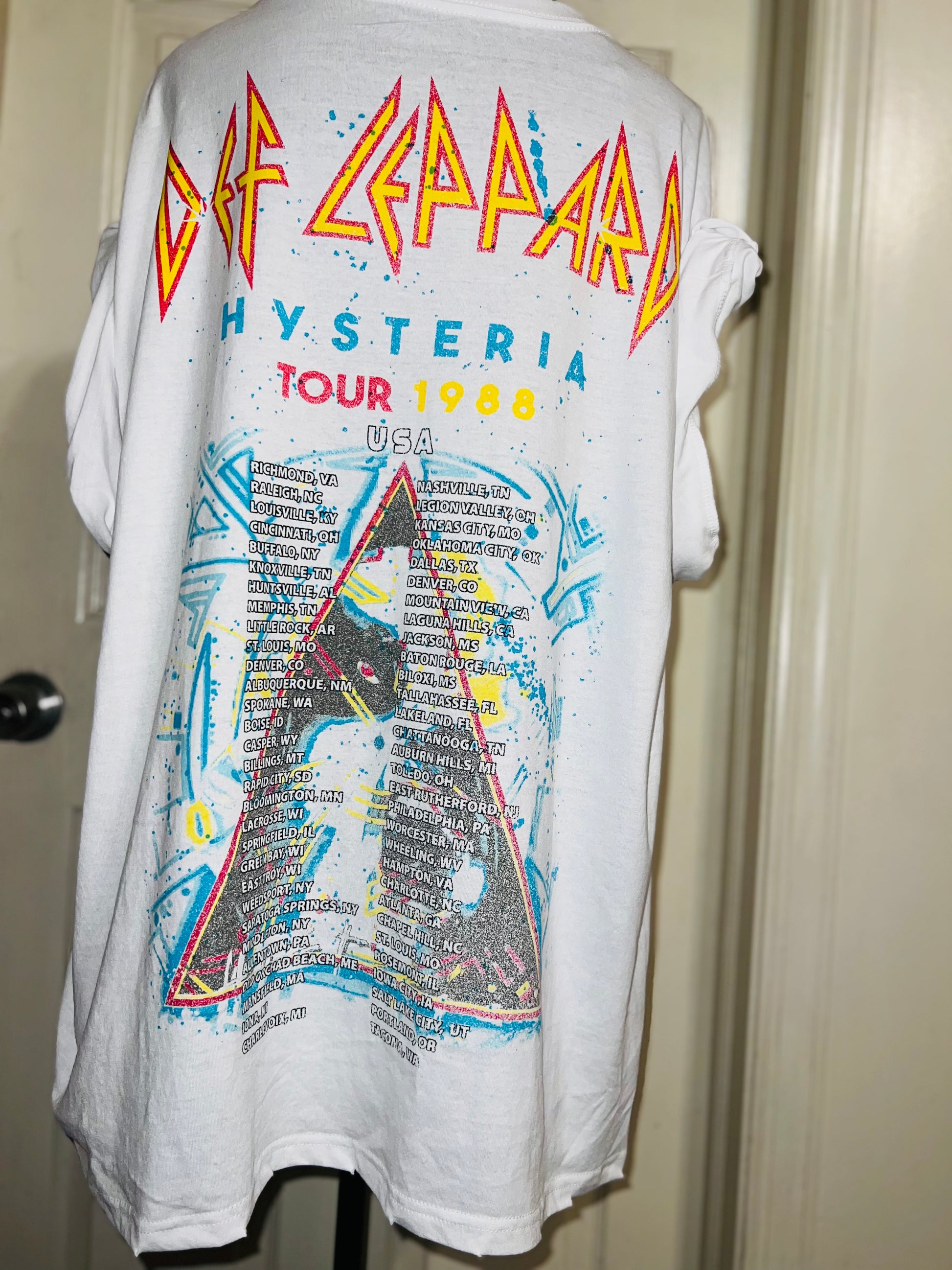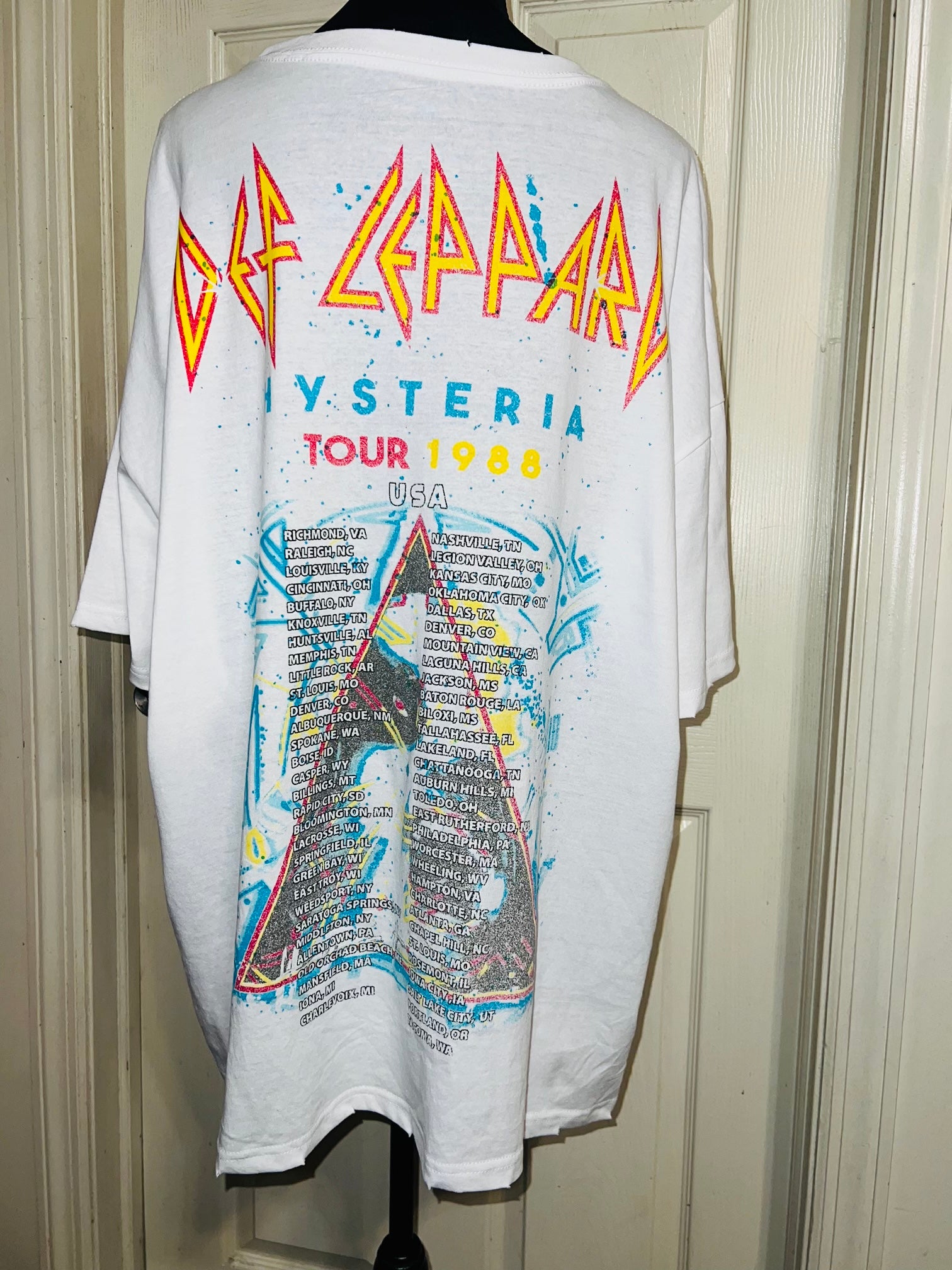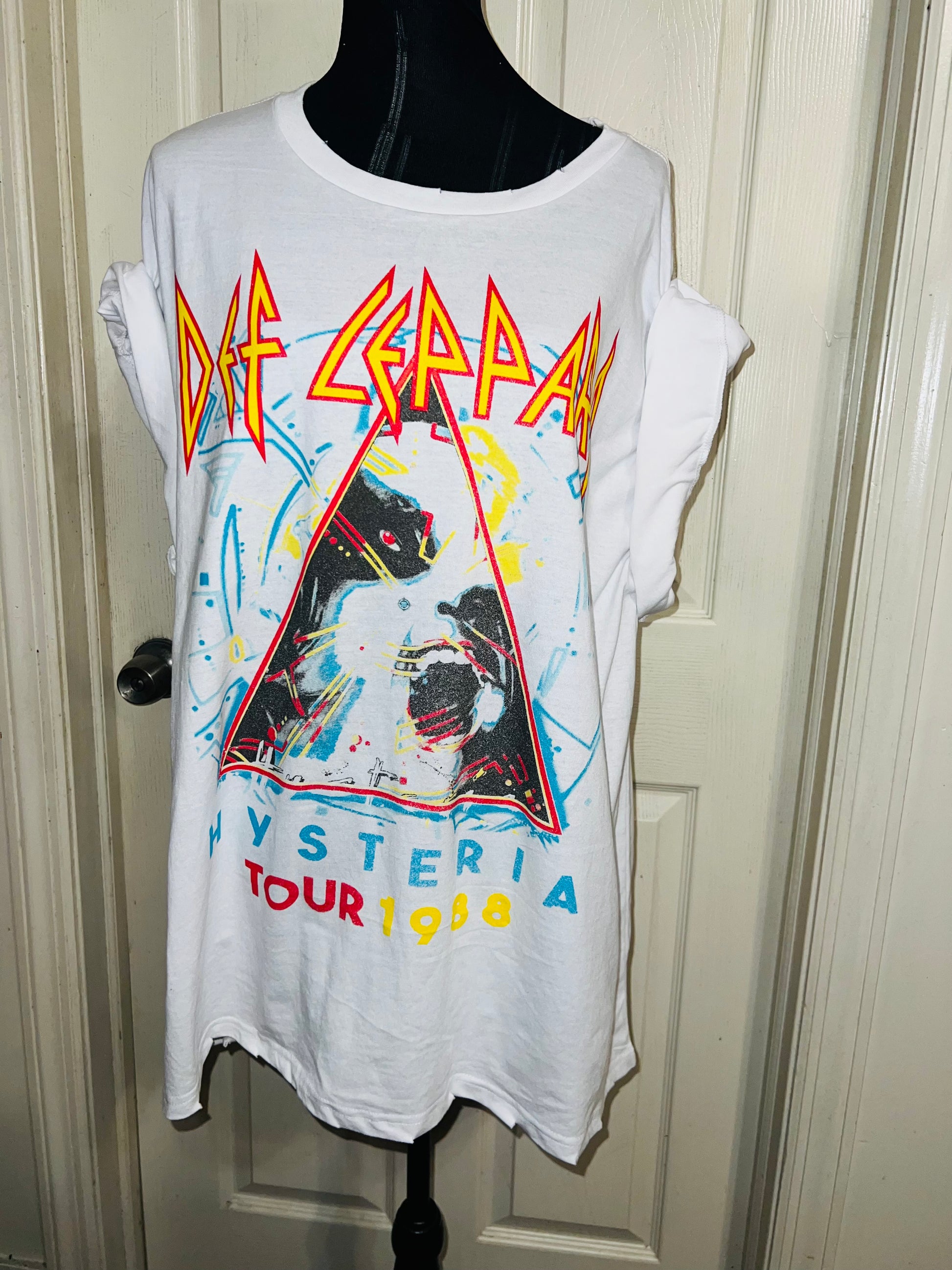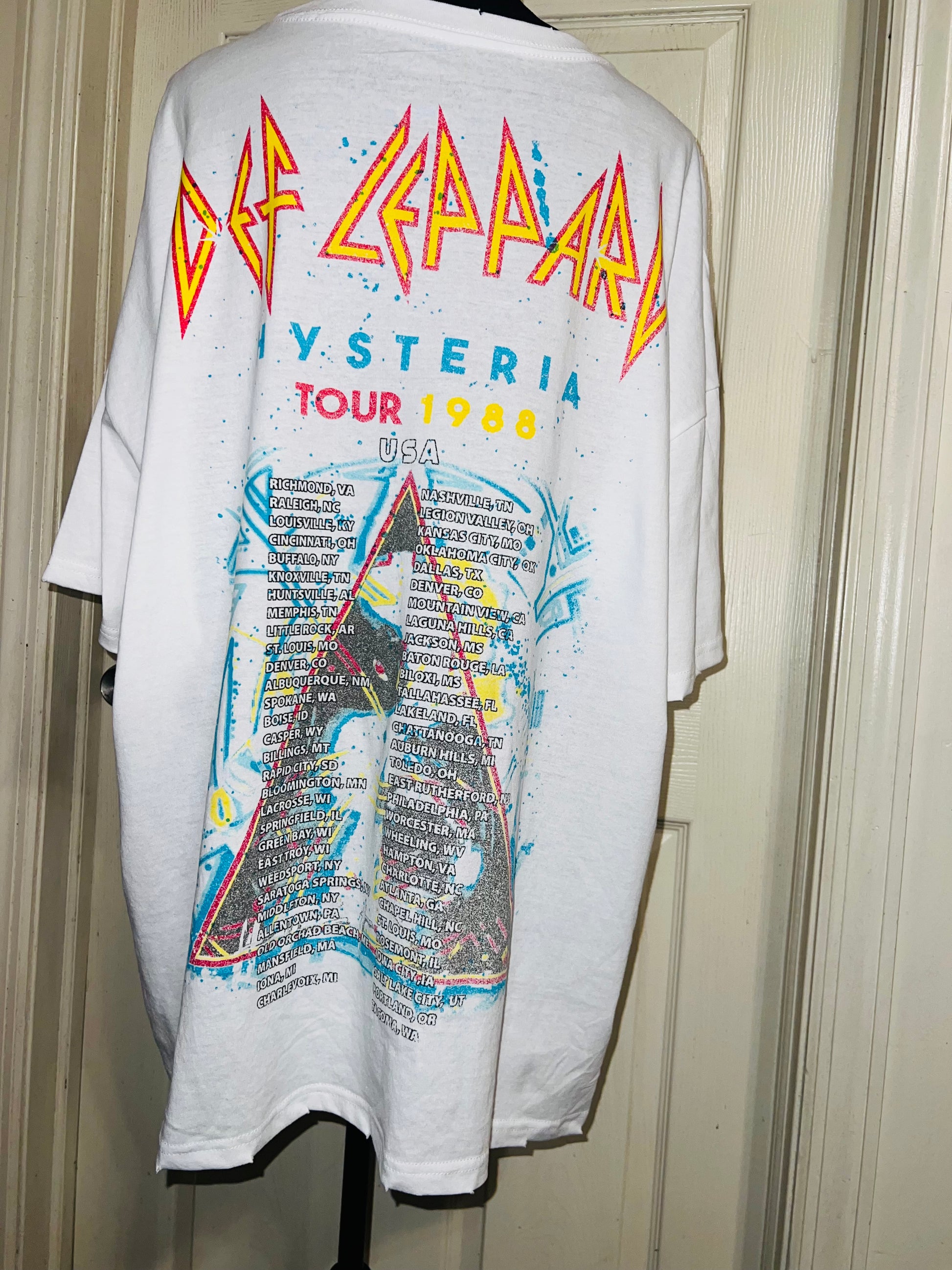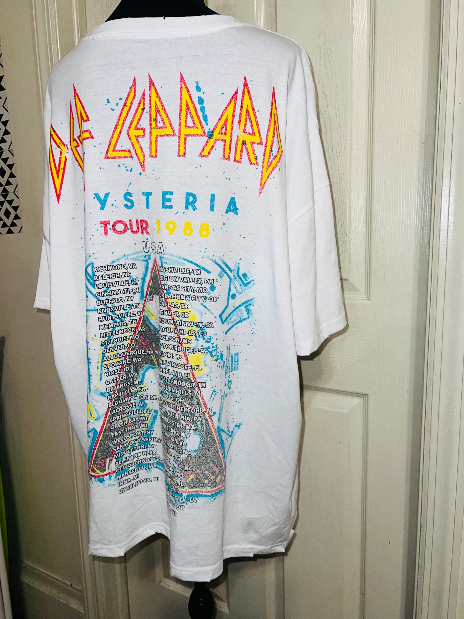This is a preorder. Please allow extra processing time. A white double sided Def Leppard 1988 Hysteria Tour with the tour dates and cities on the back. Drop shoulders and super pretty colors and graphic. Size XL, oversized.
