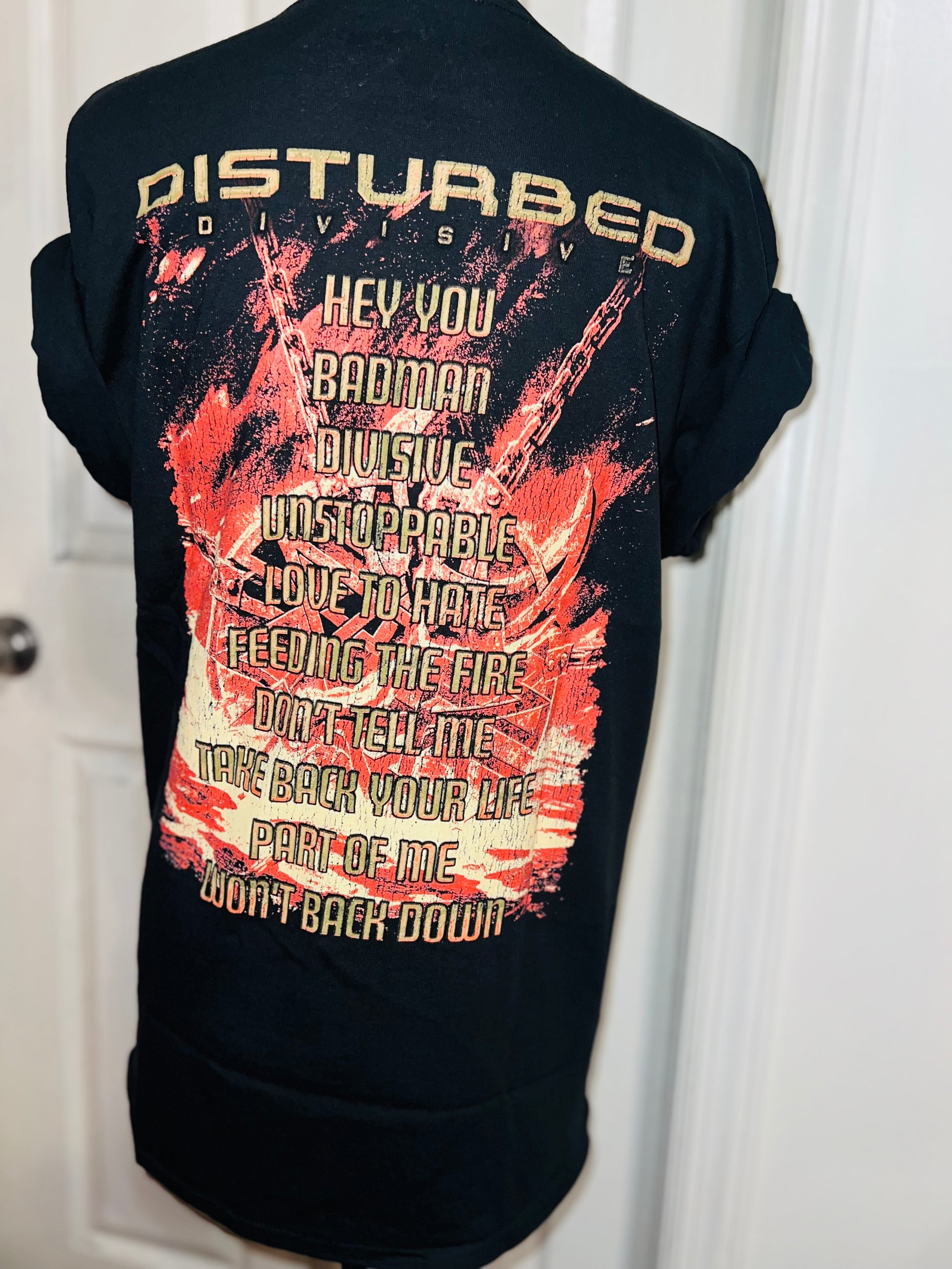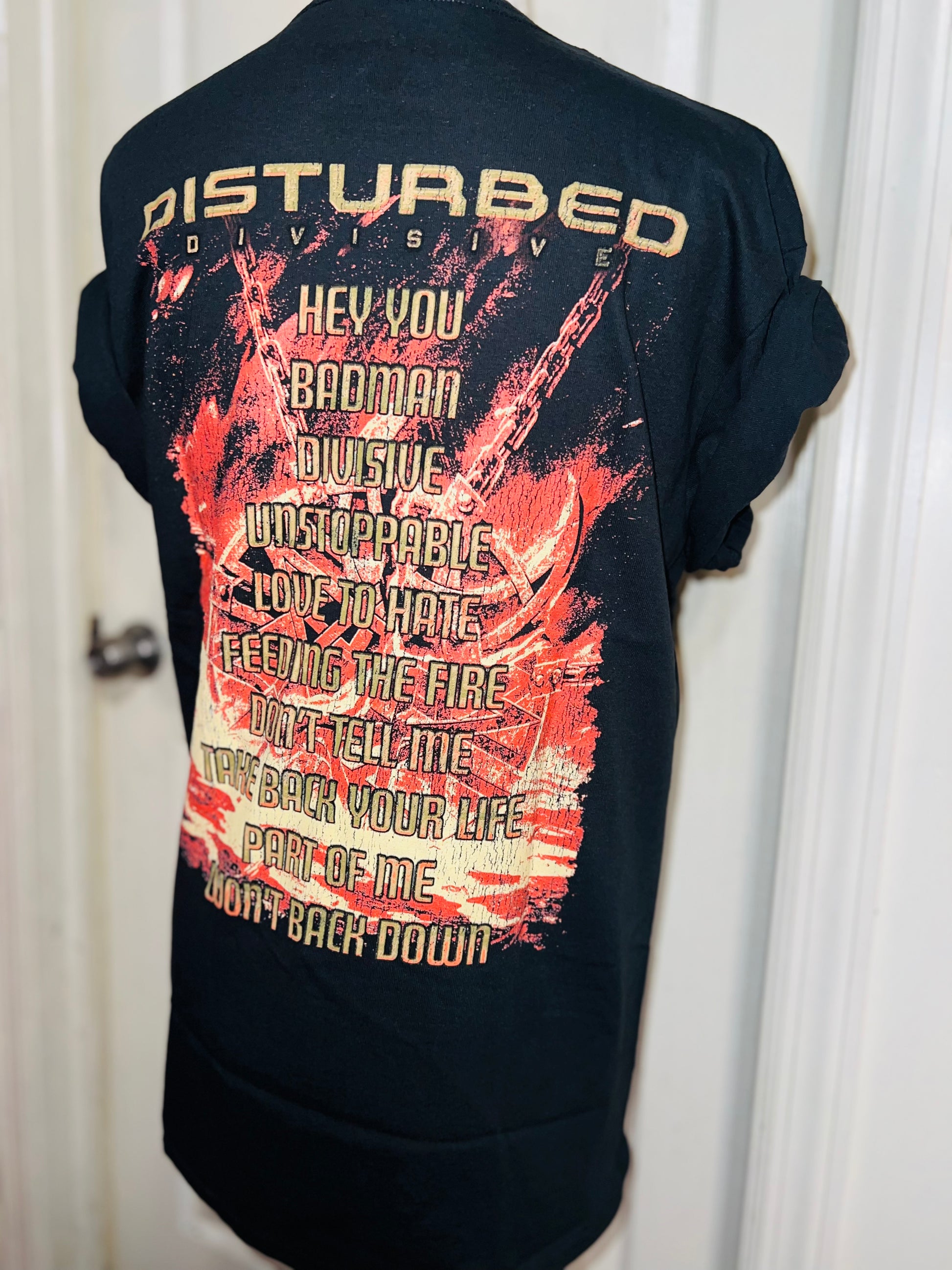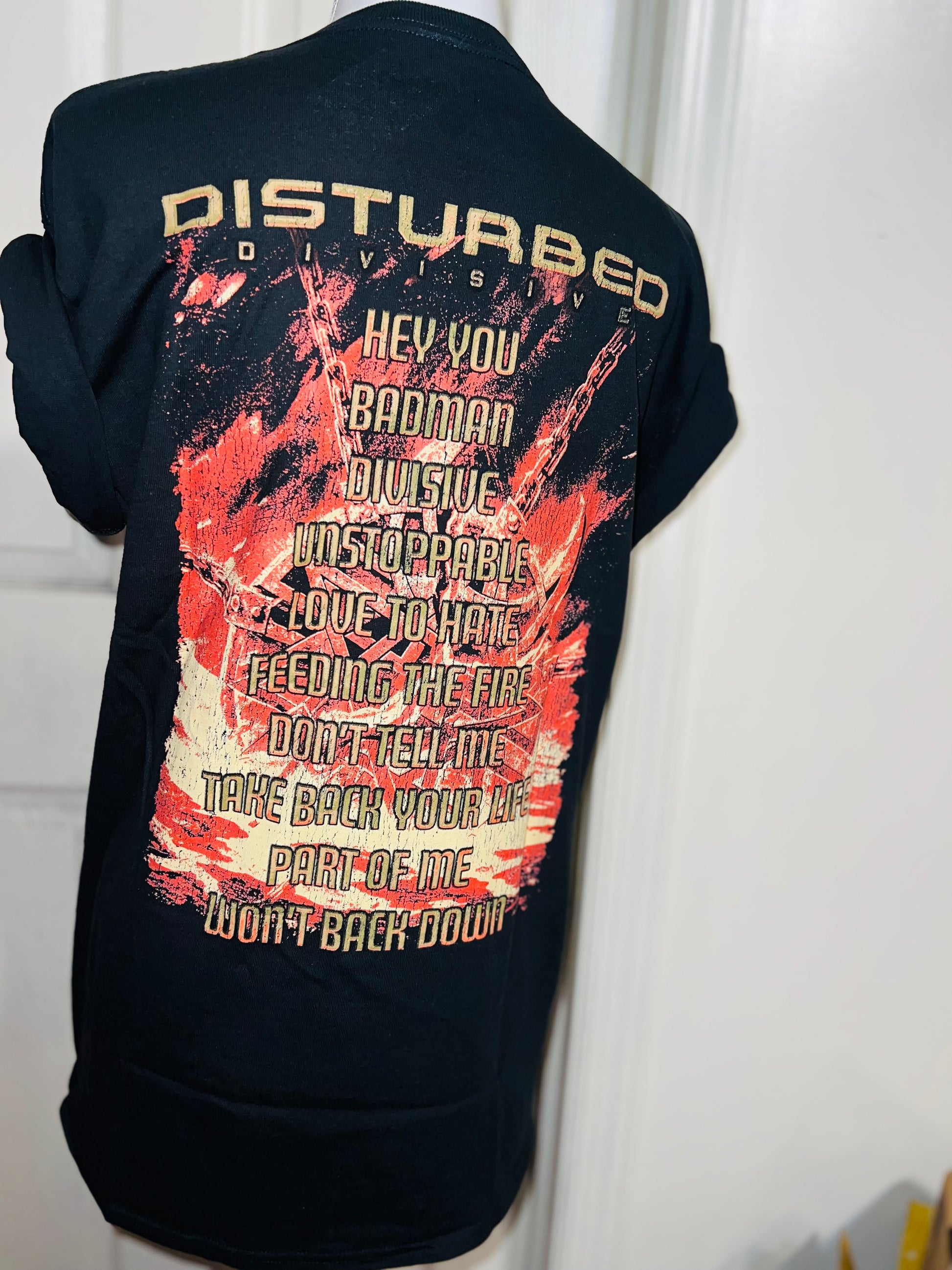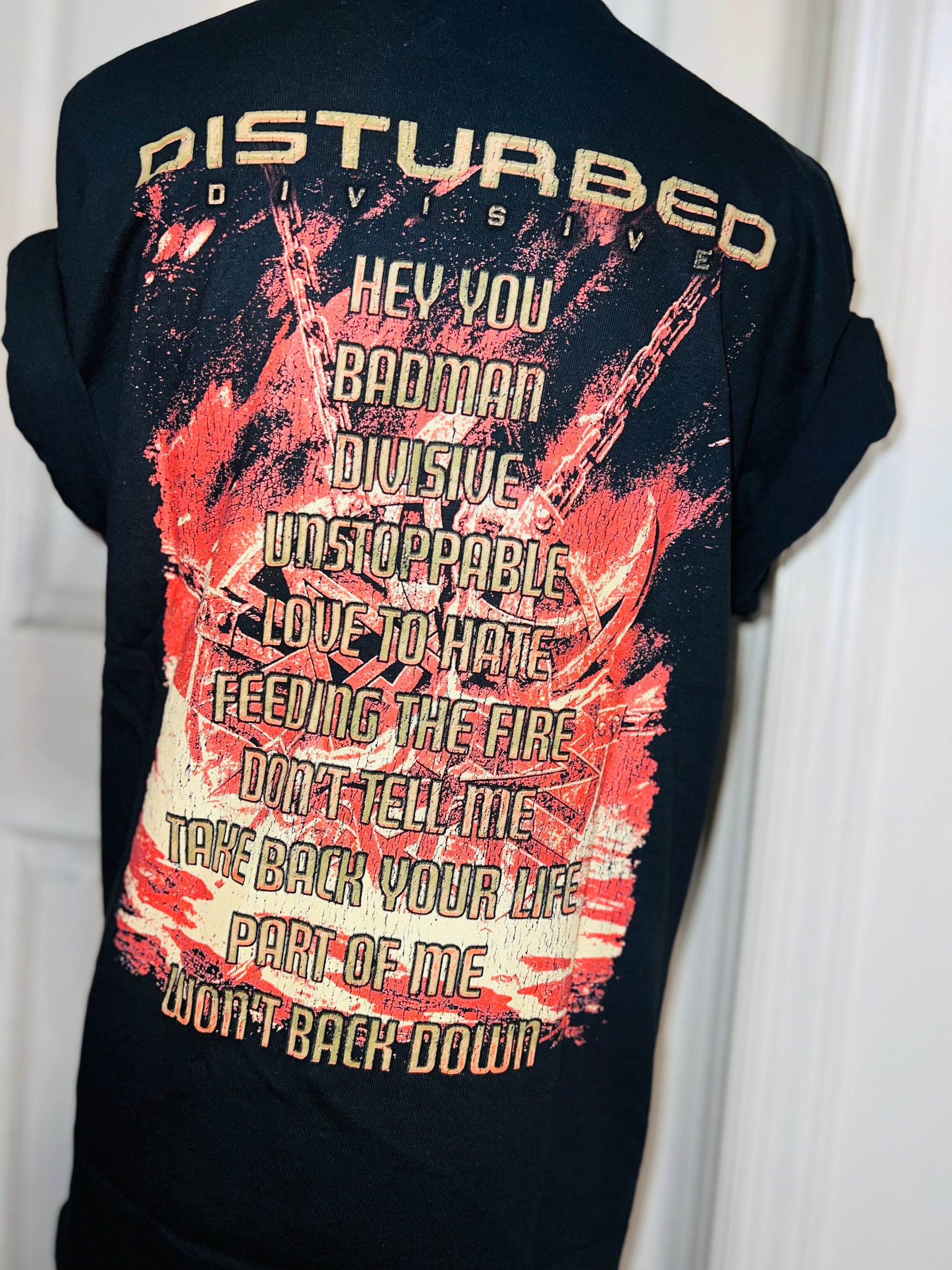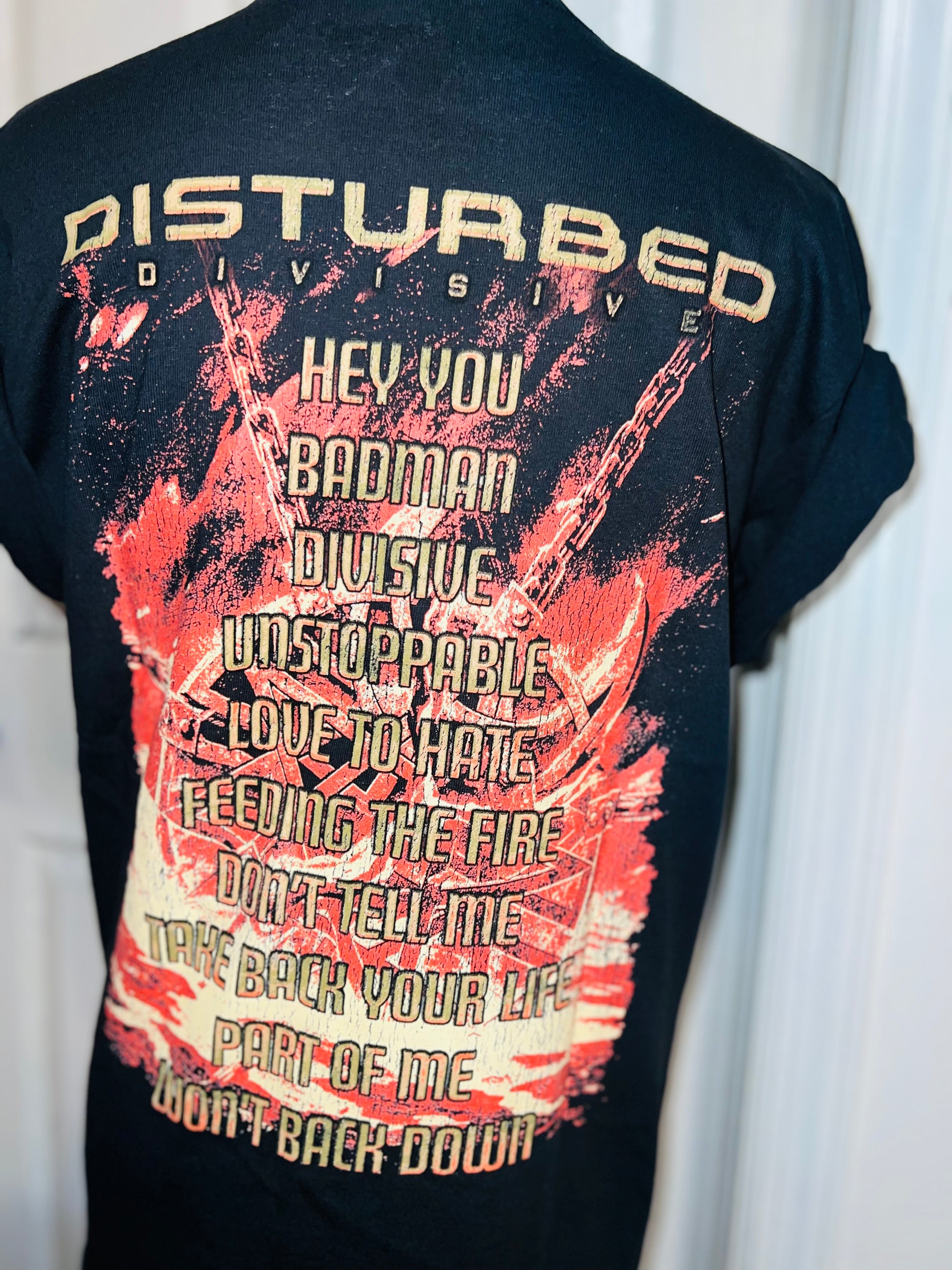 A black Disturbed Division double sided tee with the track list on the back. Size M/L, oversized.