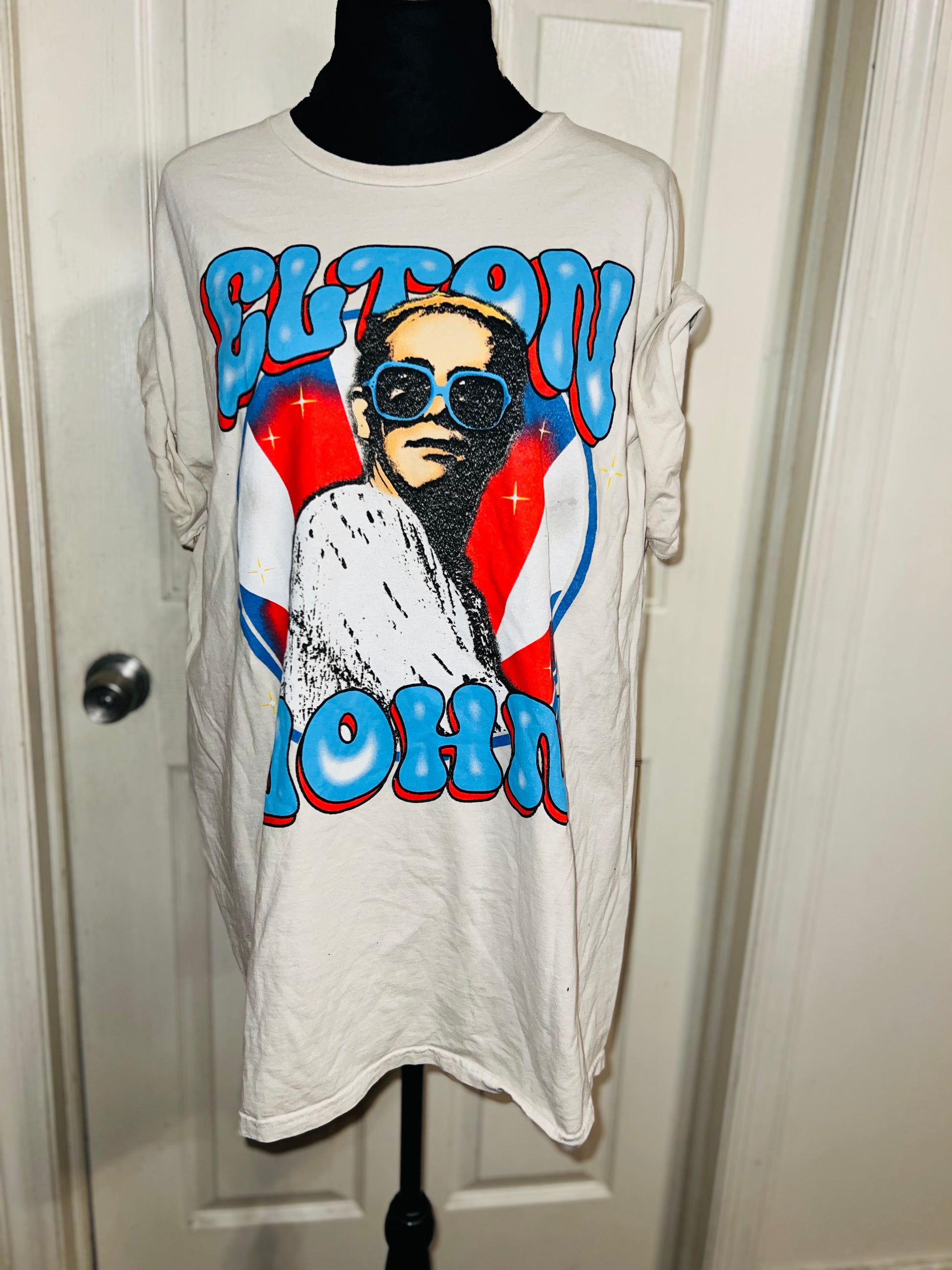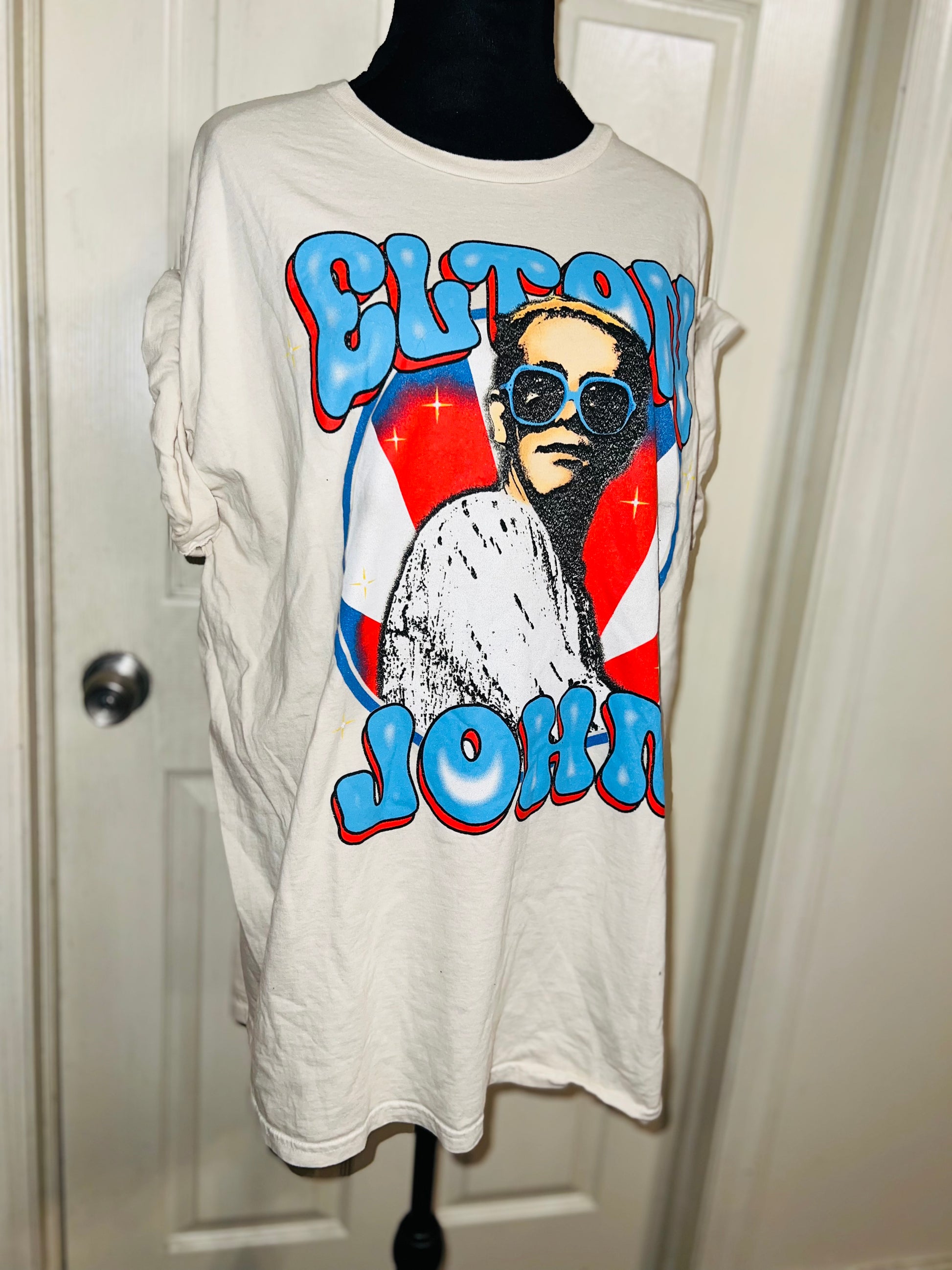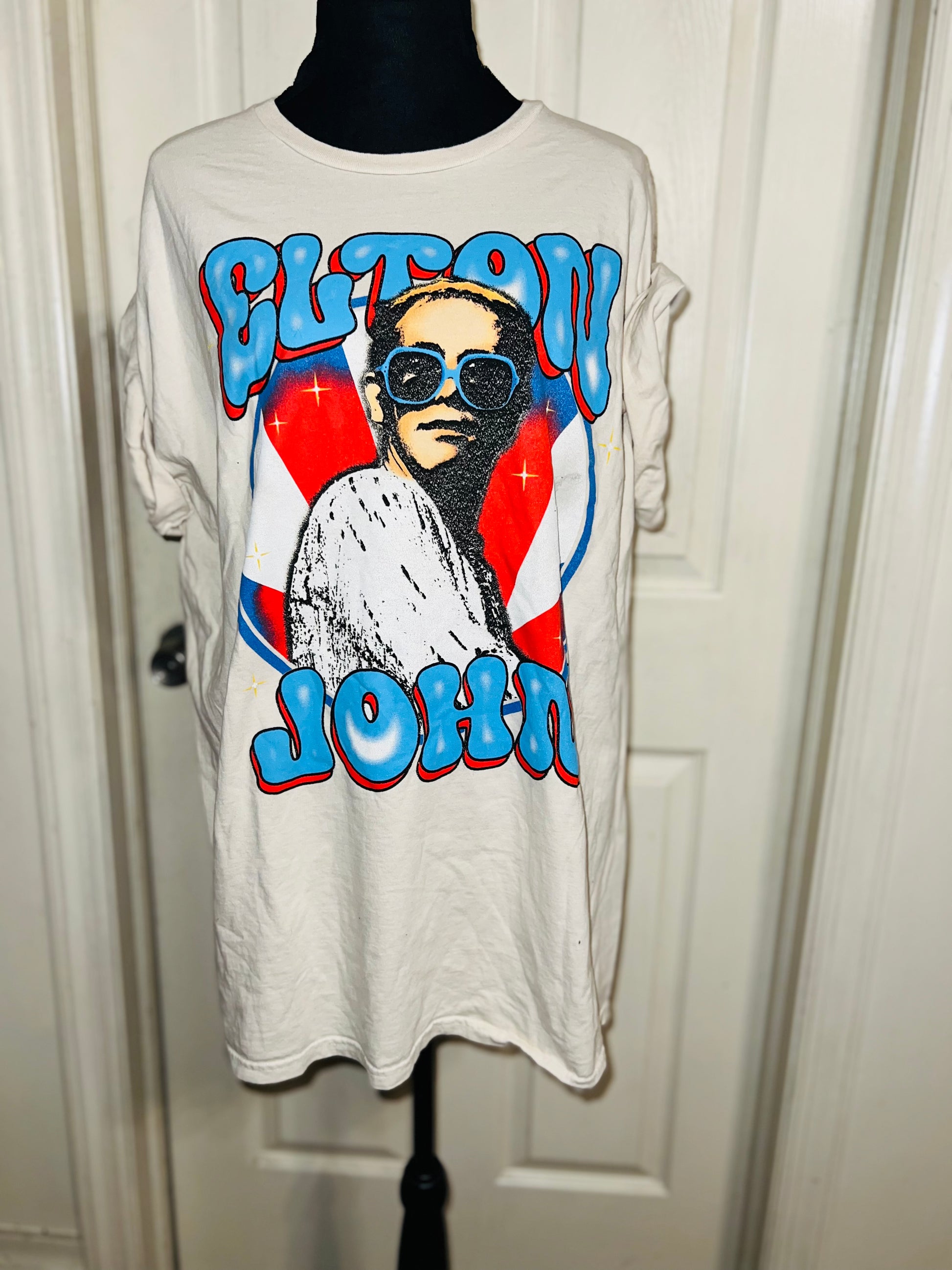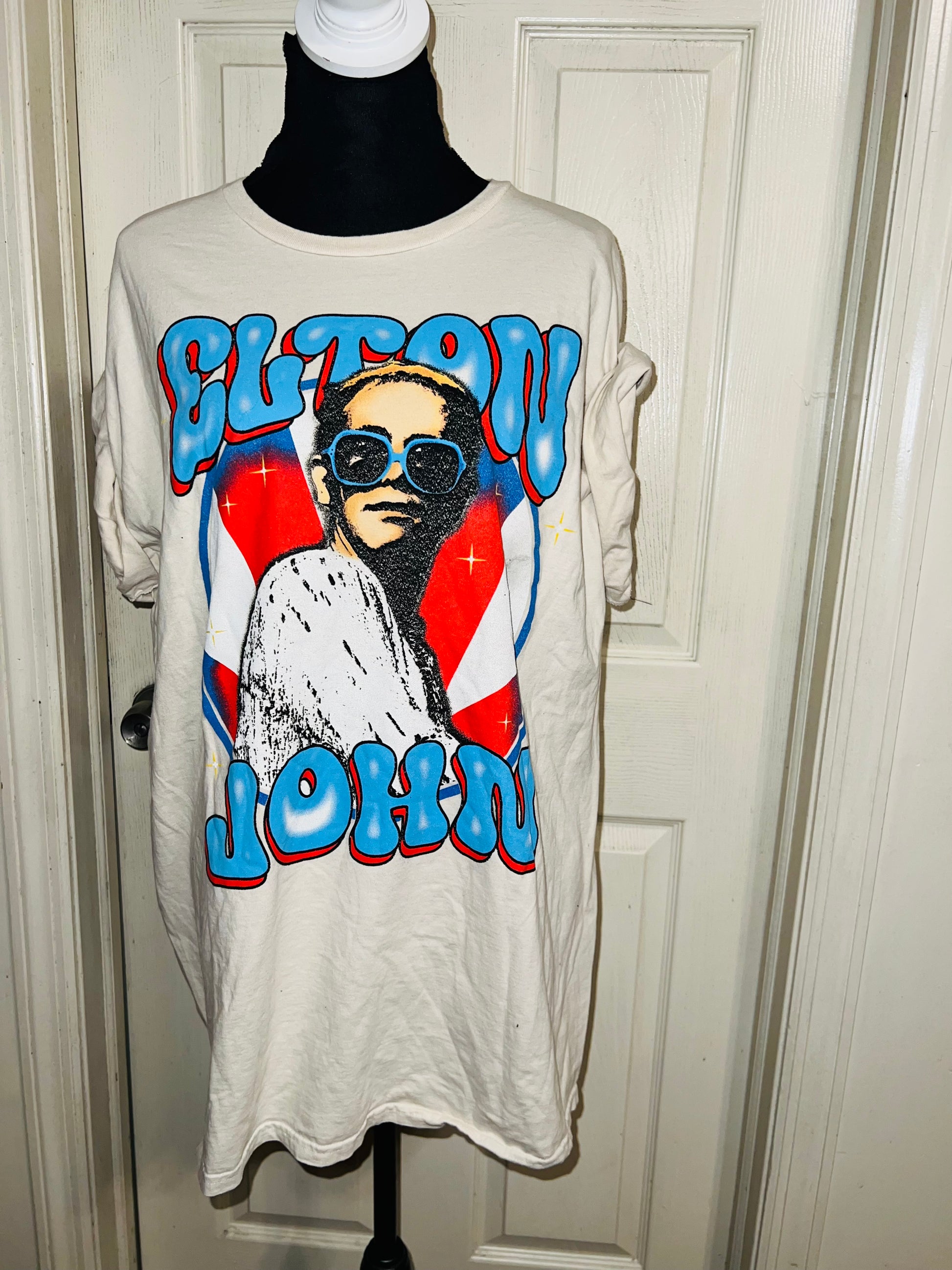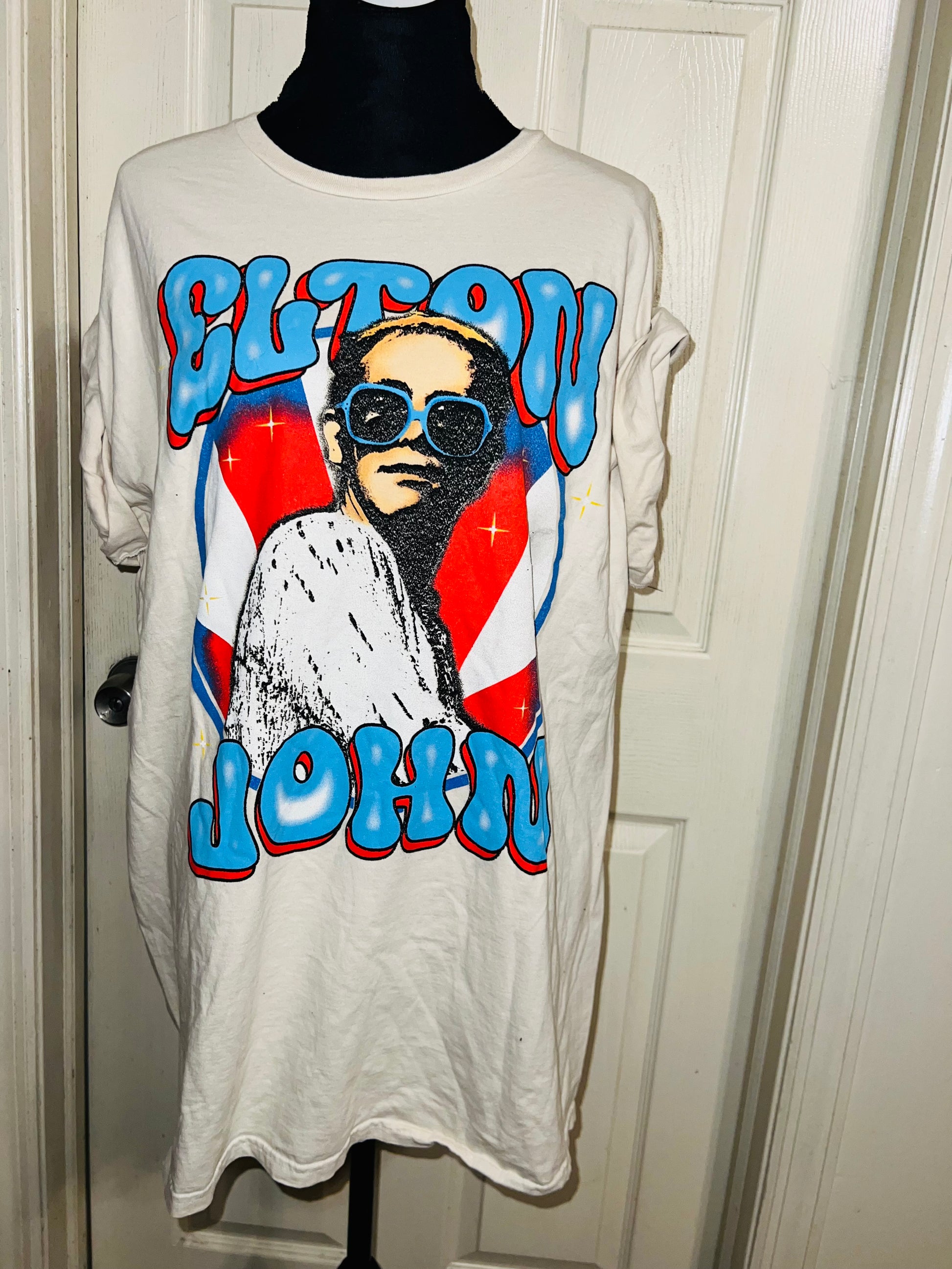 A cream colored Elton John tee with a British flag in the background and a picture of him! Oversized, men’s large- fits like an XL.