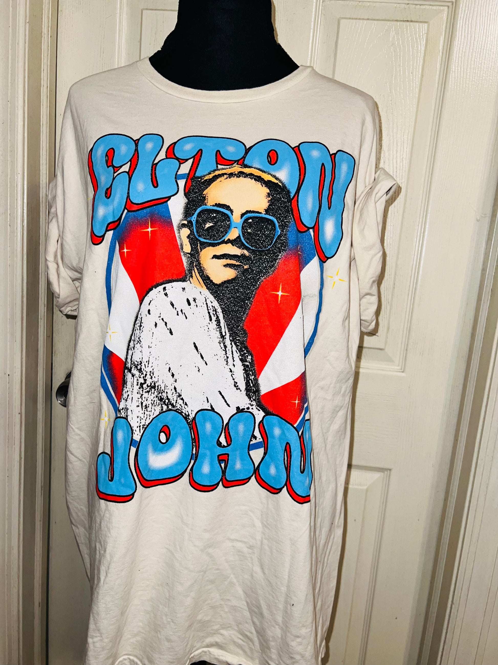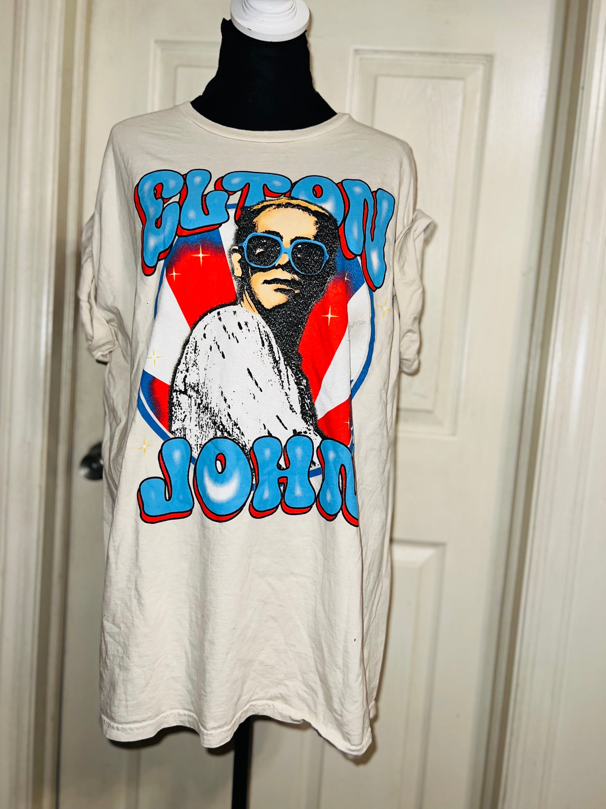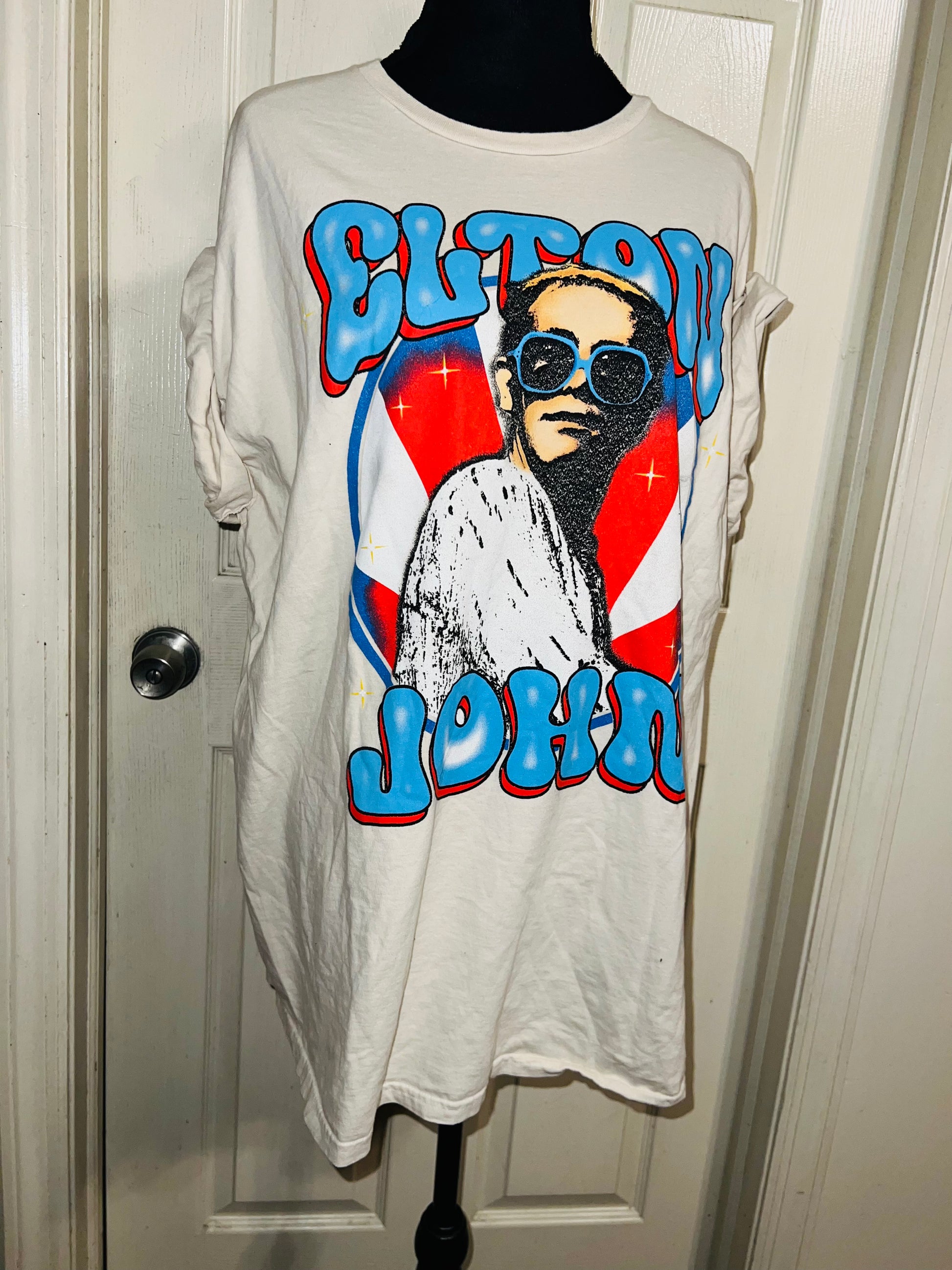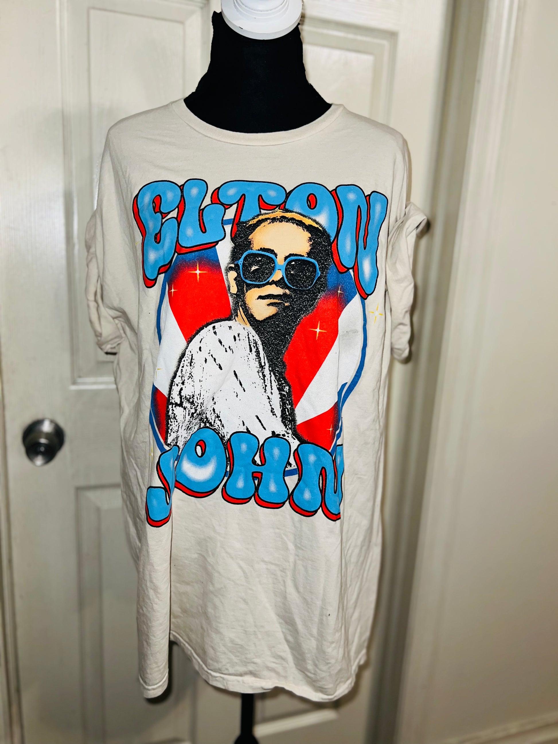 A cream colored Elton John tee with a British flag in the background and a picture of him! Oversized, men’s large- fits like an XL.