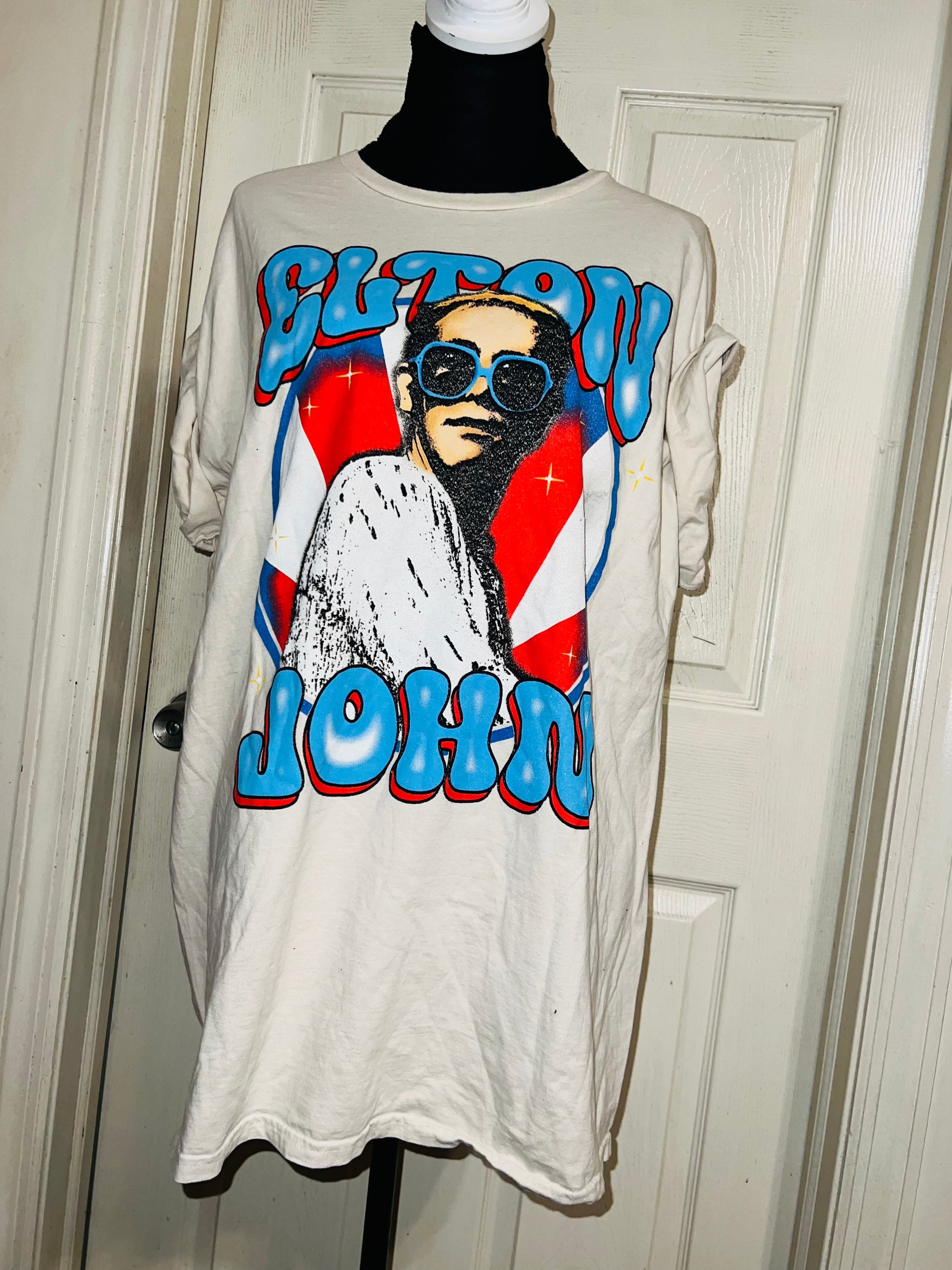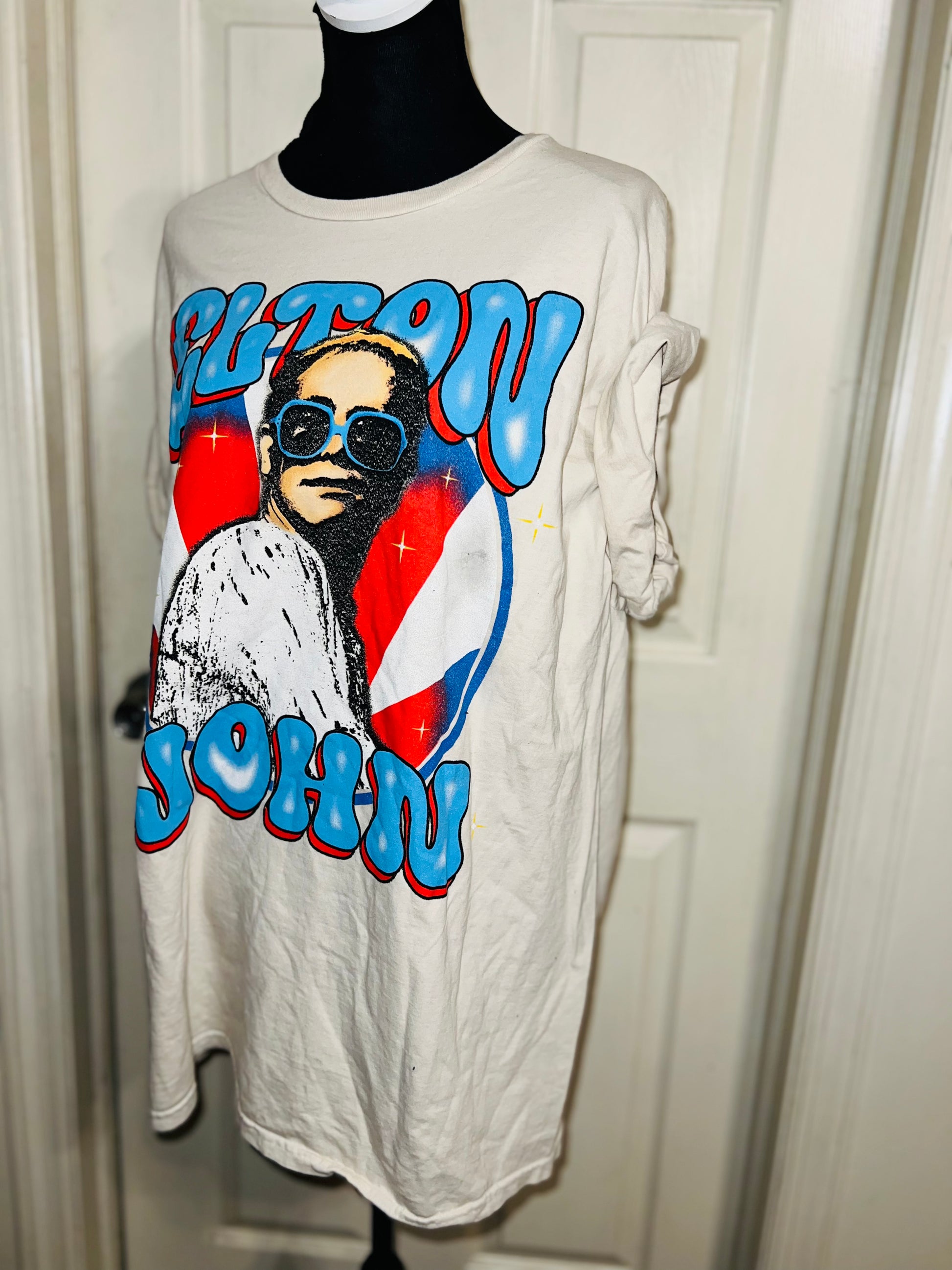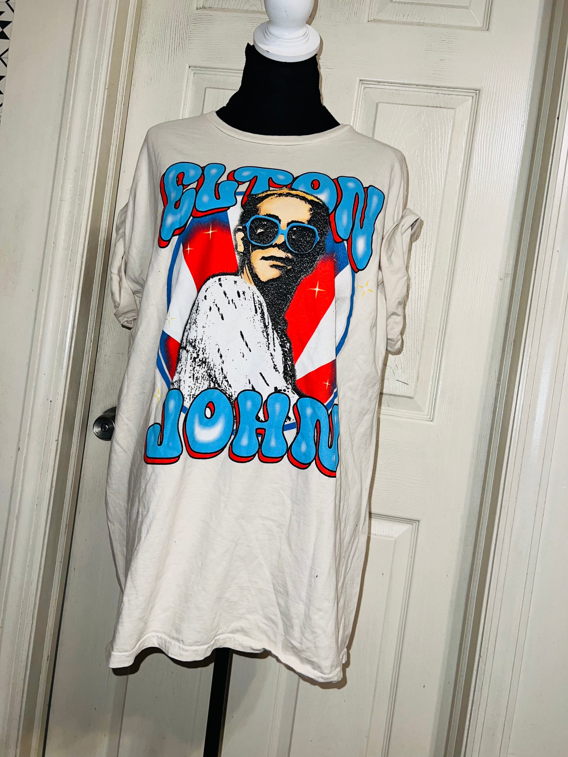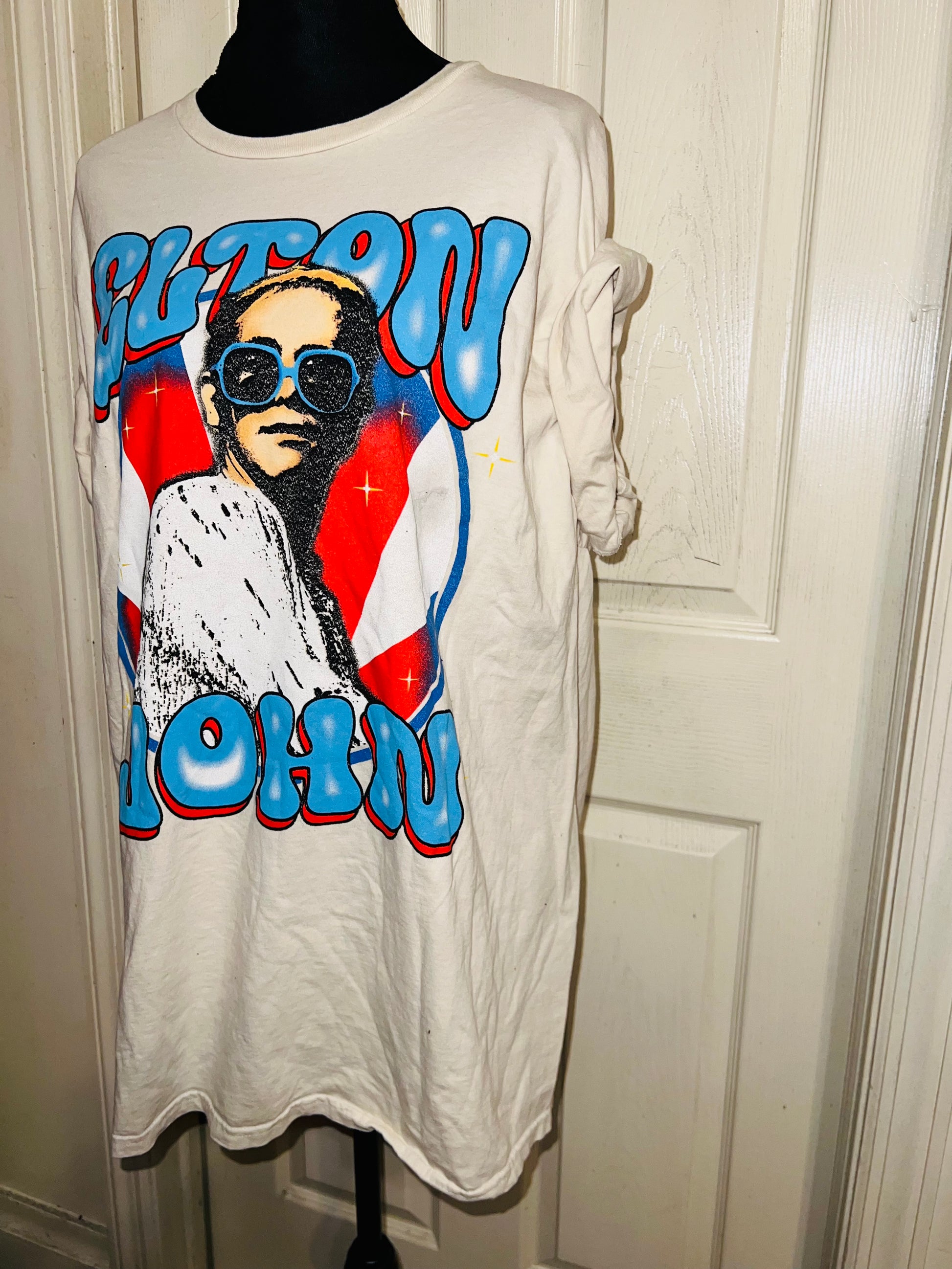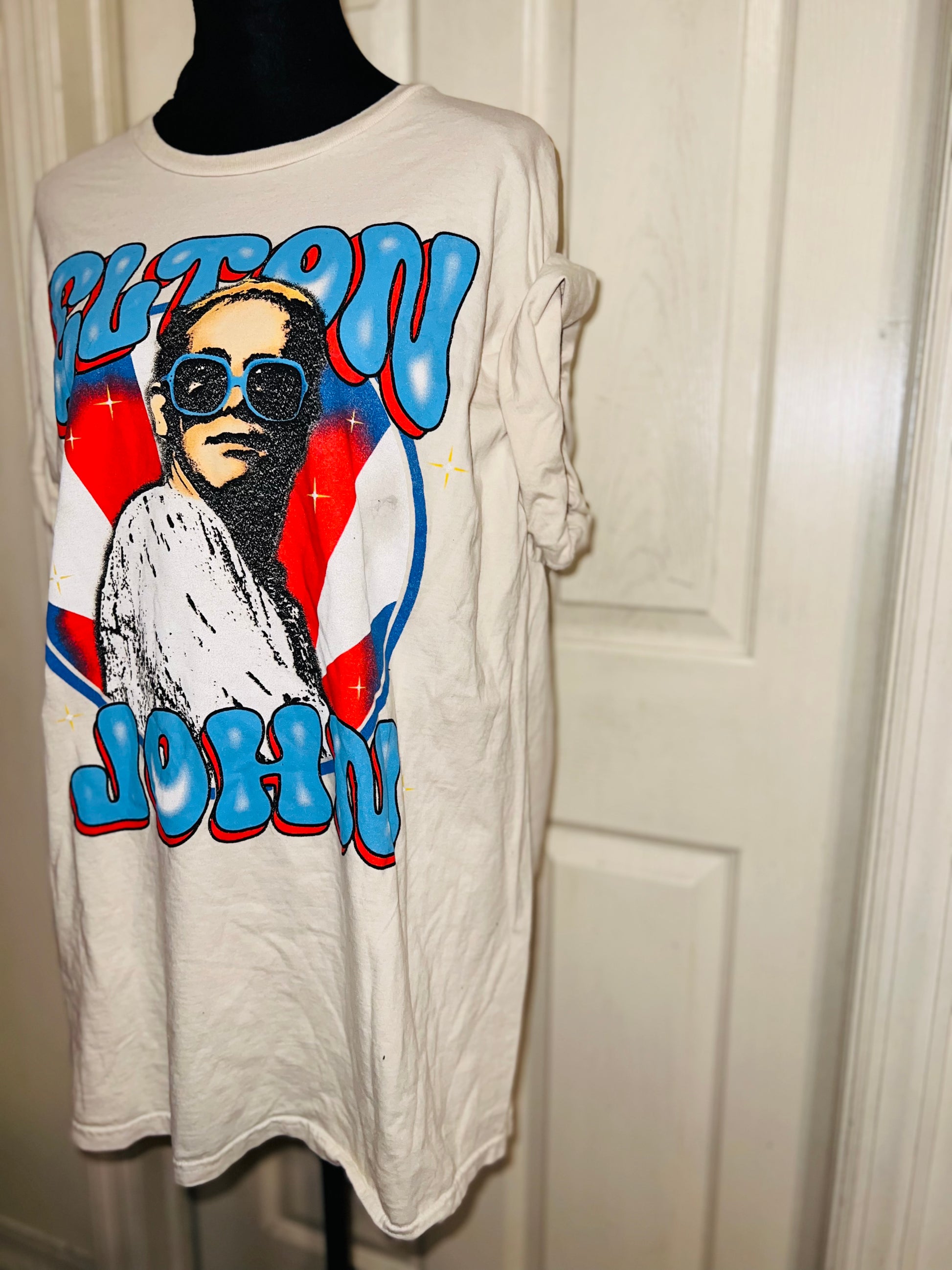 A cream colored Elton John tee with a British flag in the background and a picture of him! Oversized, men’s large- fits like an XL.