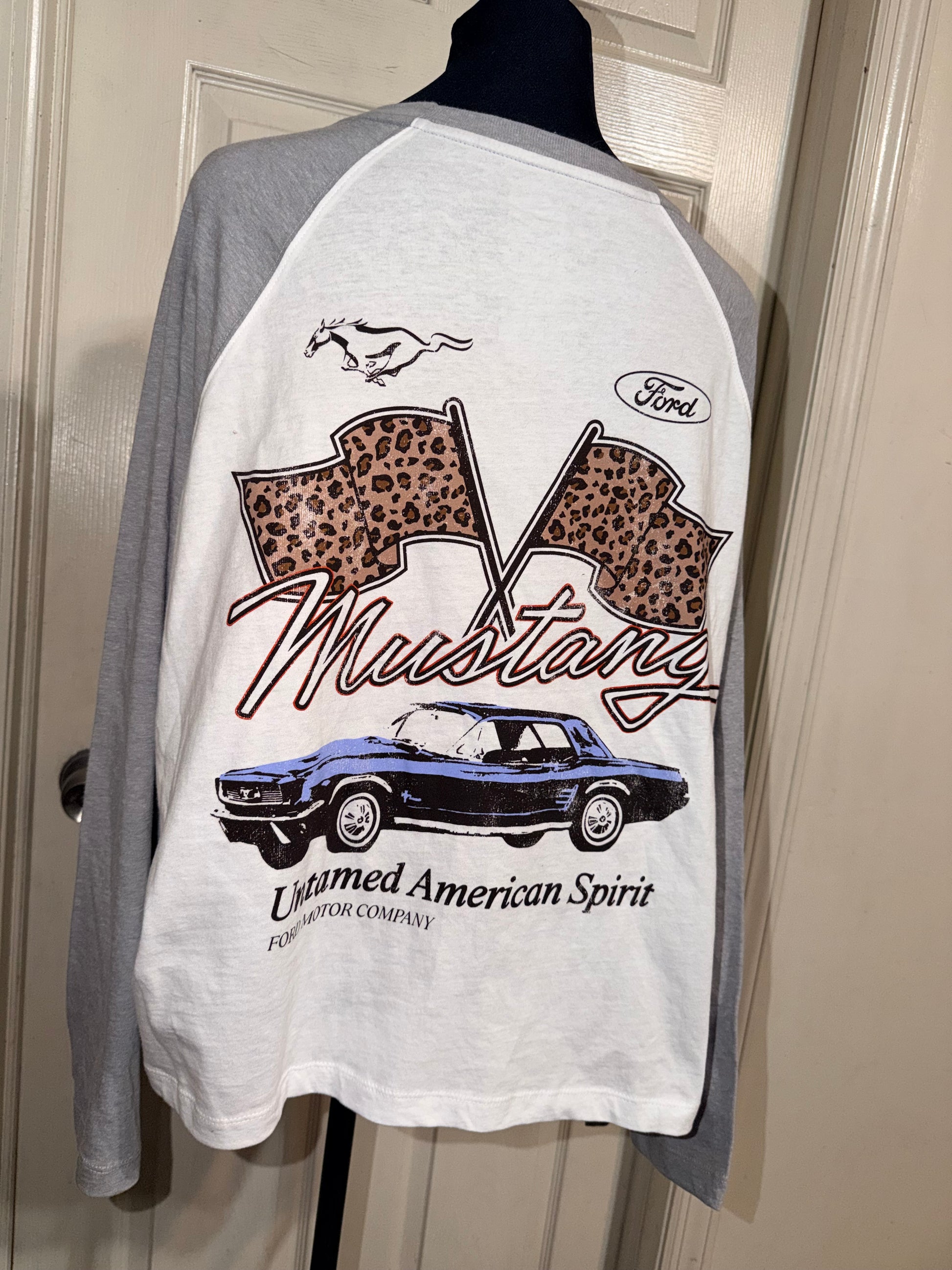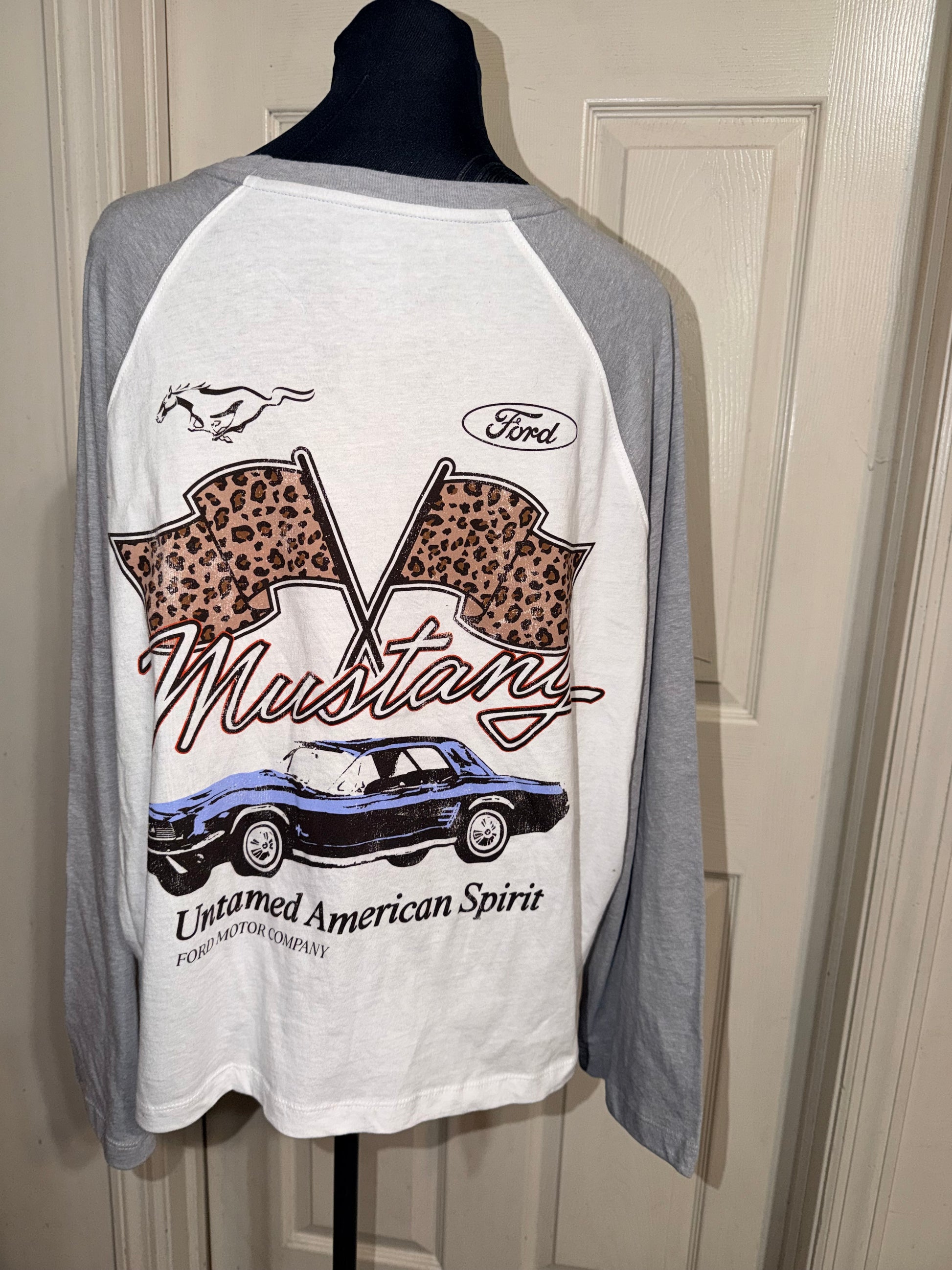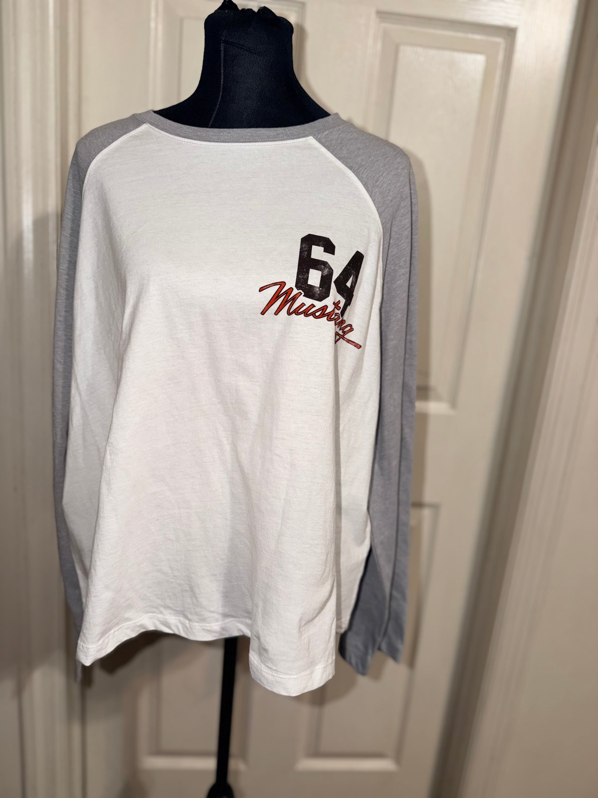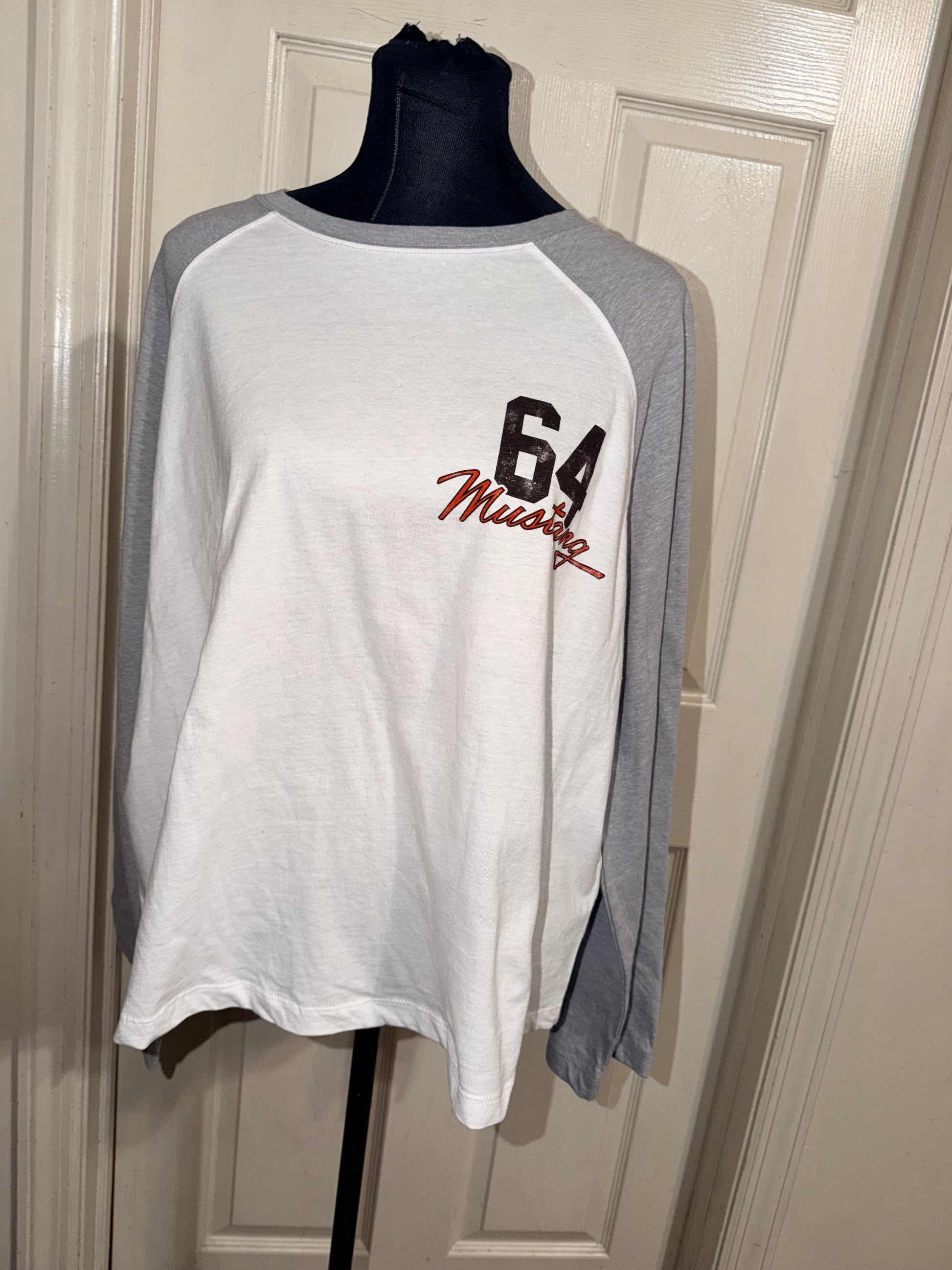 A white Ford Mustang double sided raglan 3/4 tee. Oversized, but this could still fit an XL without being huge.