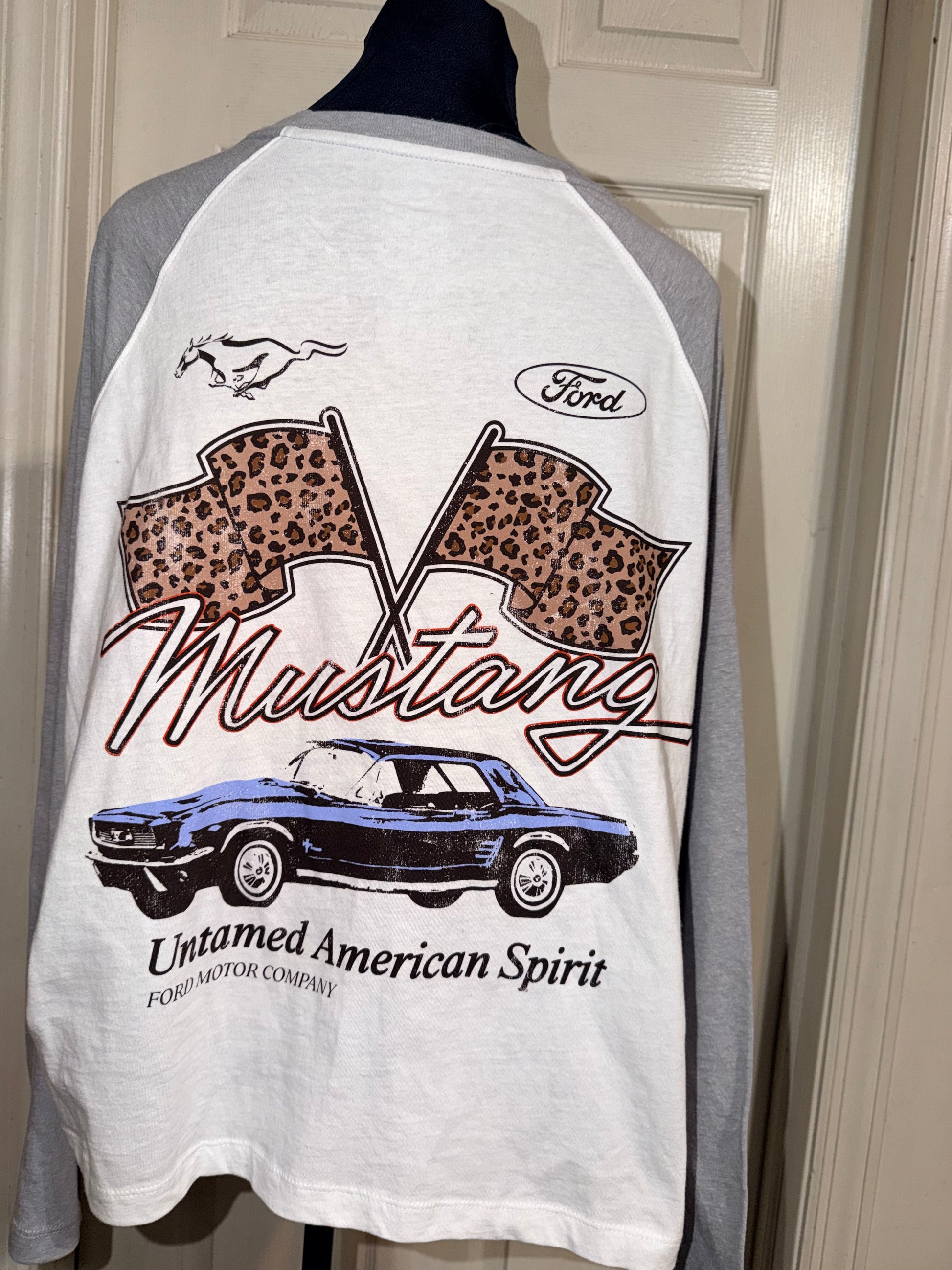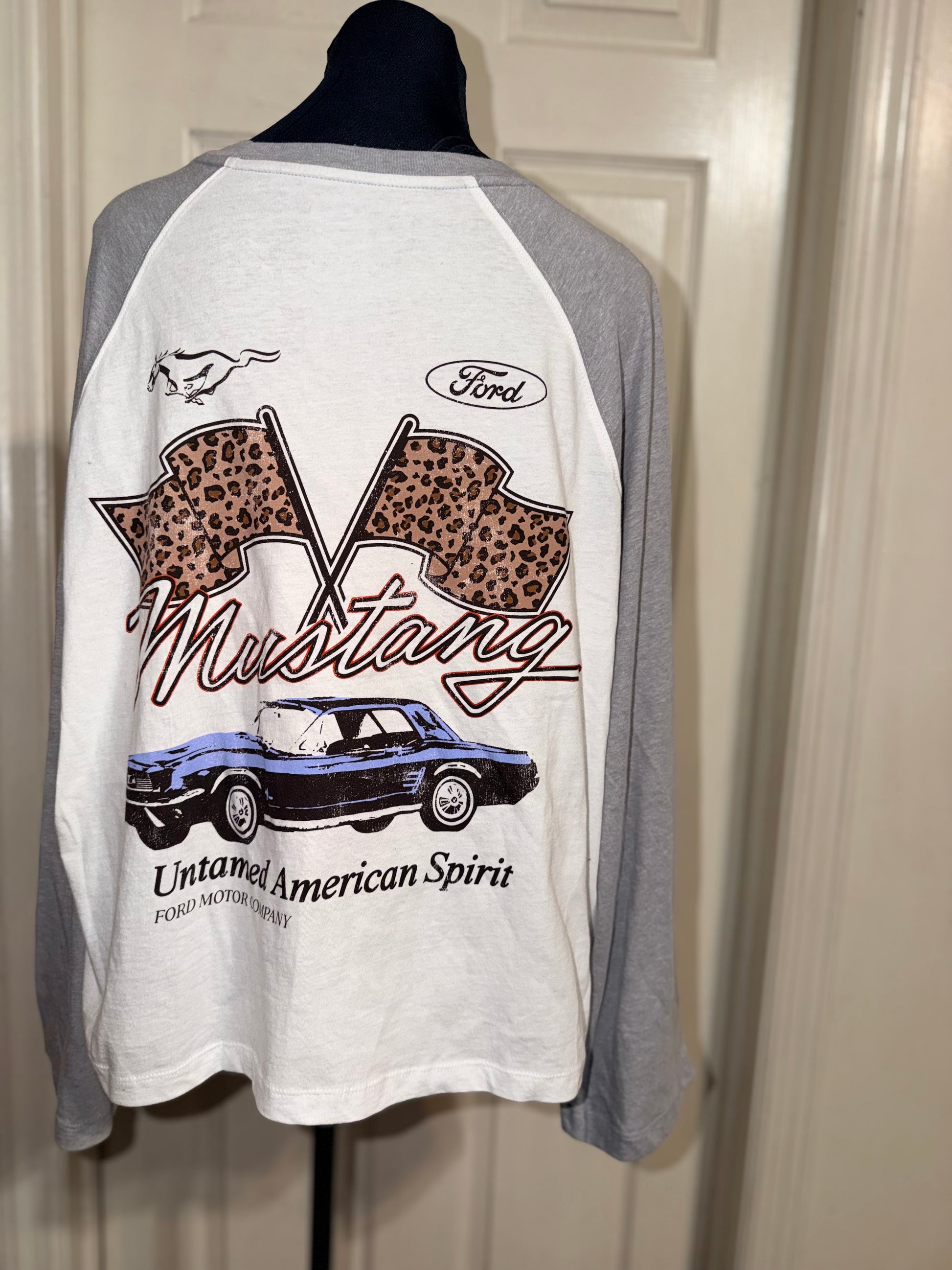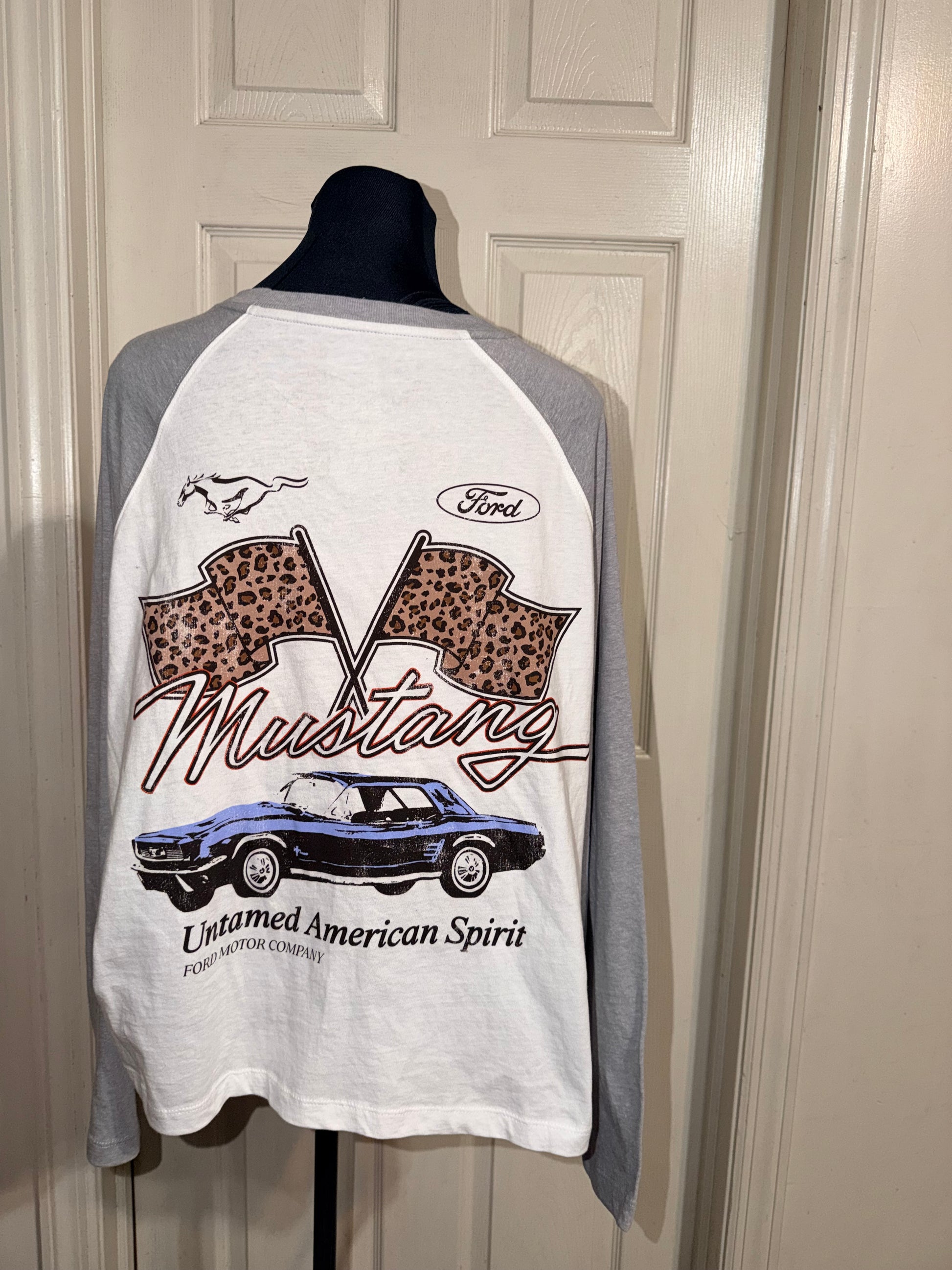 A white Ford Mustang double sided raglan 3/4 tee. Oversized, but this could still fit an XL without being huge.